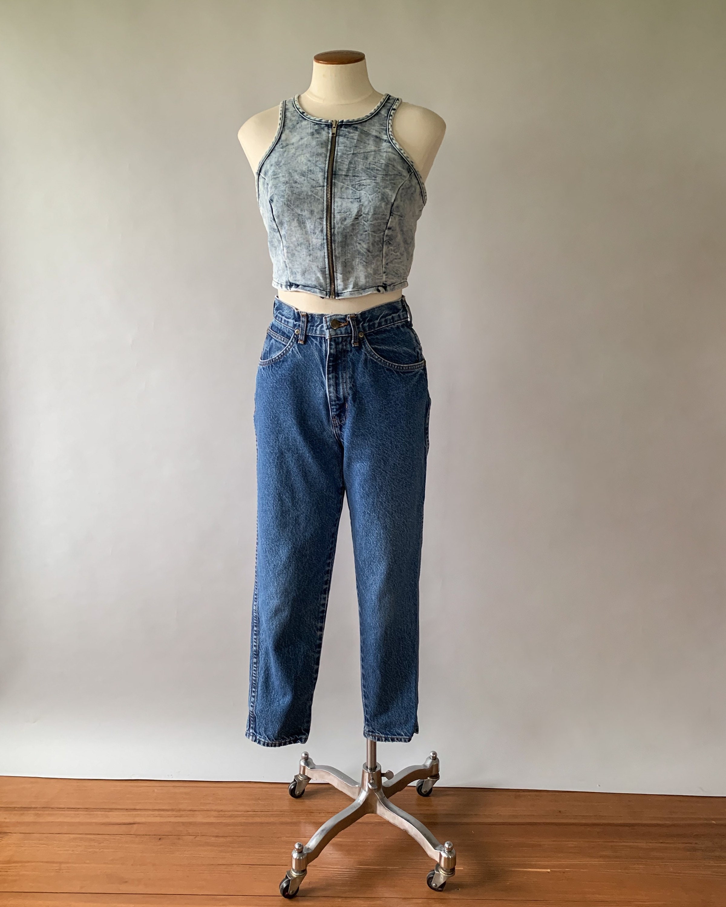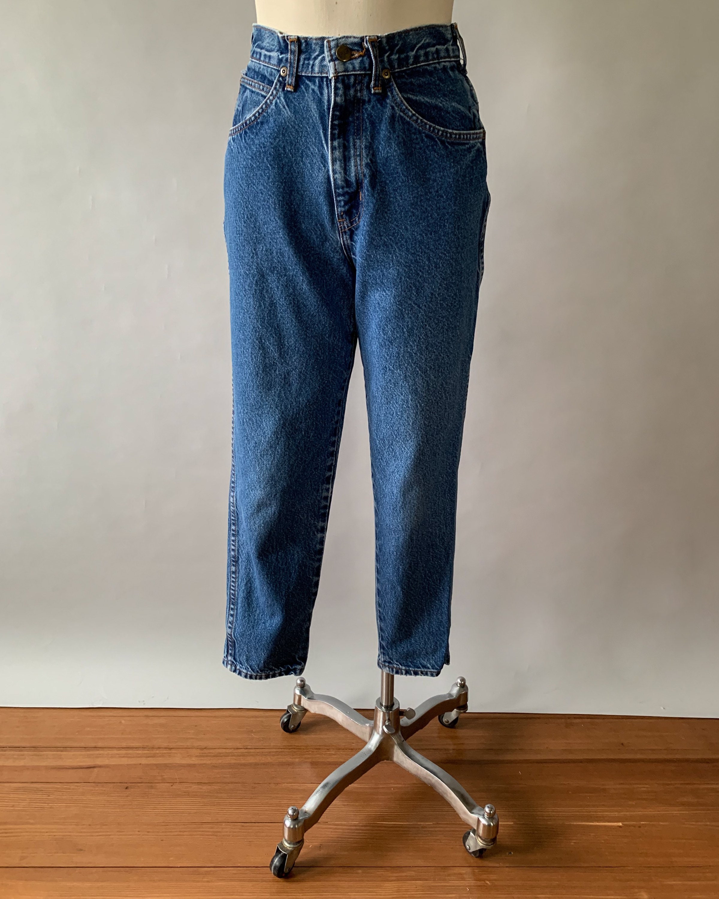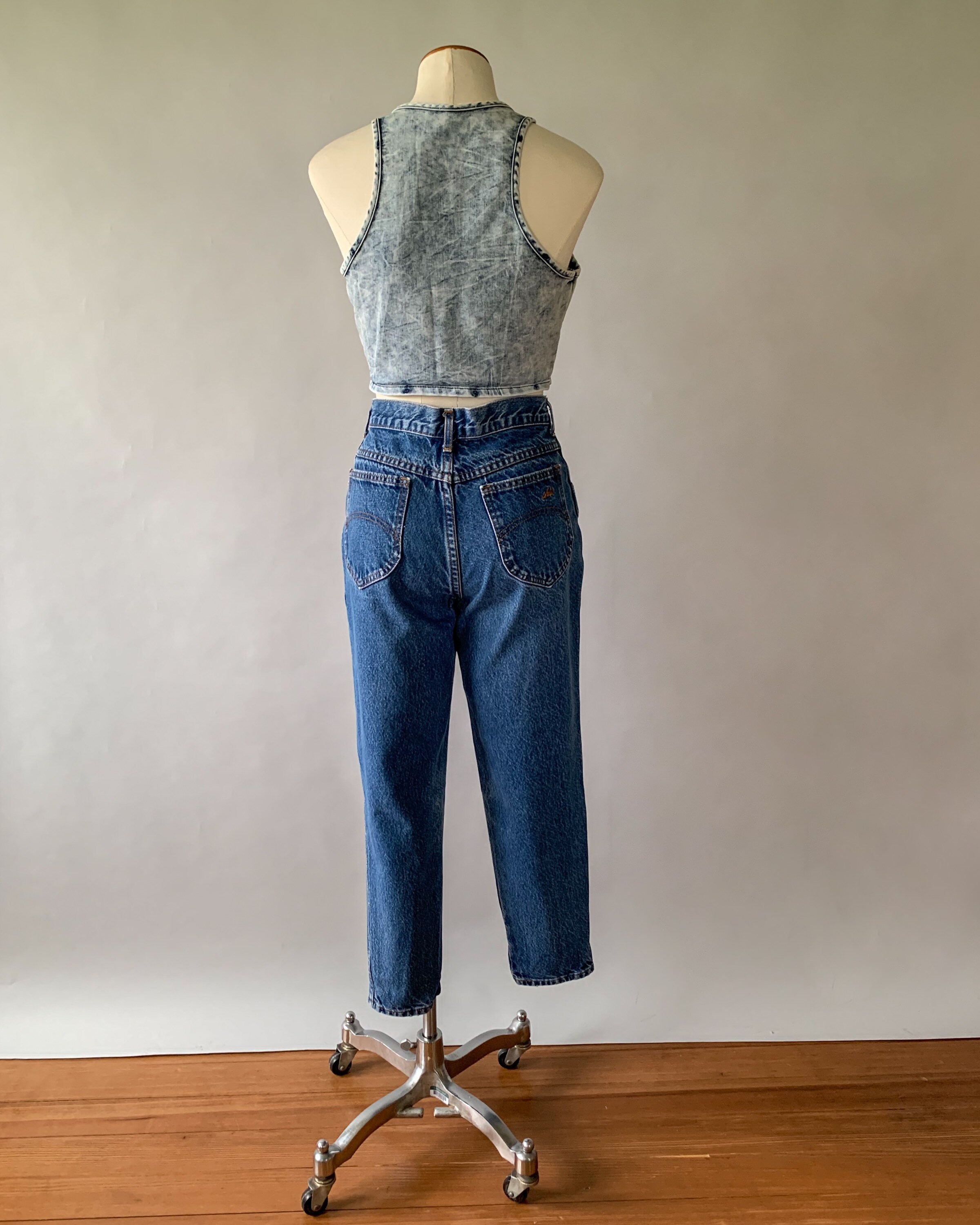 A great pair of 1980s faded medium wash mom jeans. These high rise jeans have a relaxed fit with tapered legs. Perfect to pair with crop tops this summer!