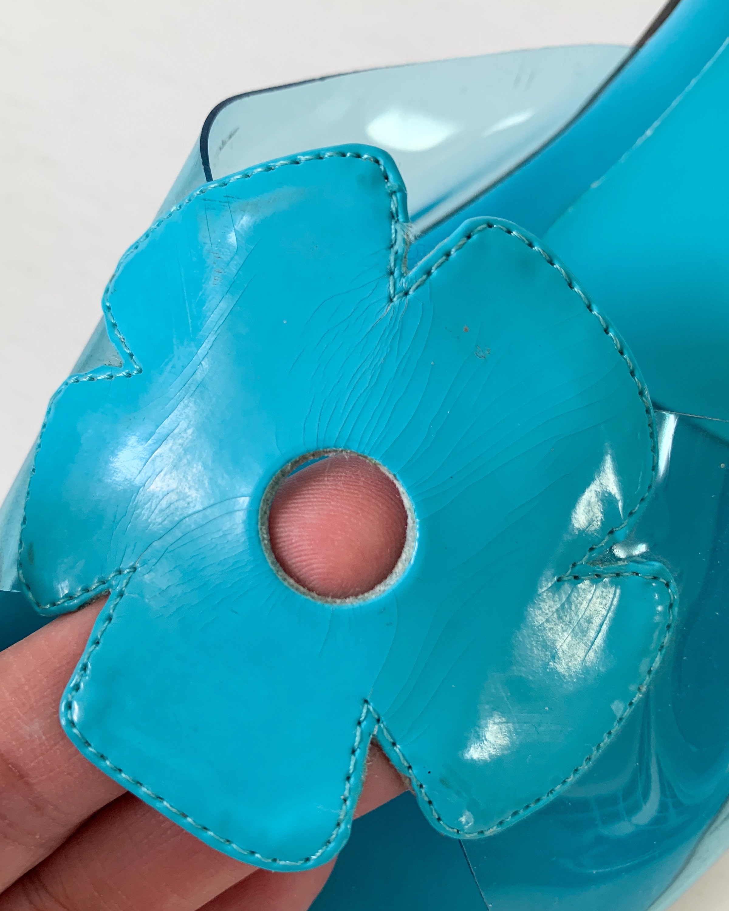 Adorable 1990s/Y2K aqua blue slides / slip on sandals with chunky heels and clear thick straps across the toes with a large flower in the centers. New old stock with the original tag still attached!