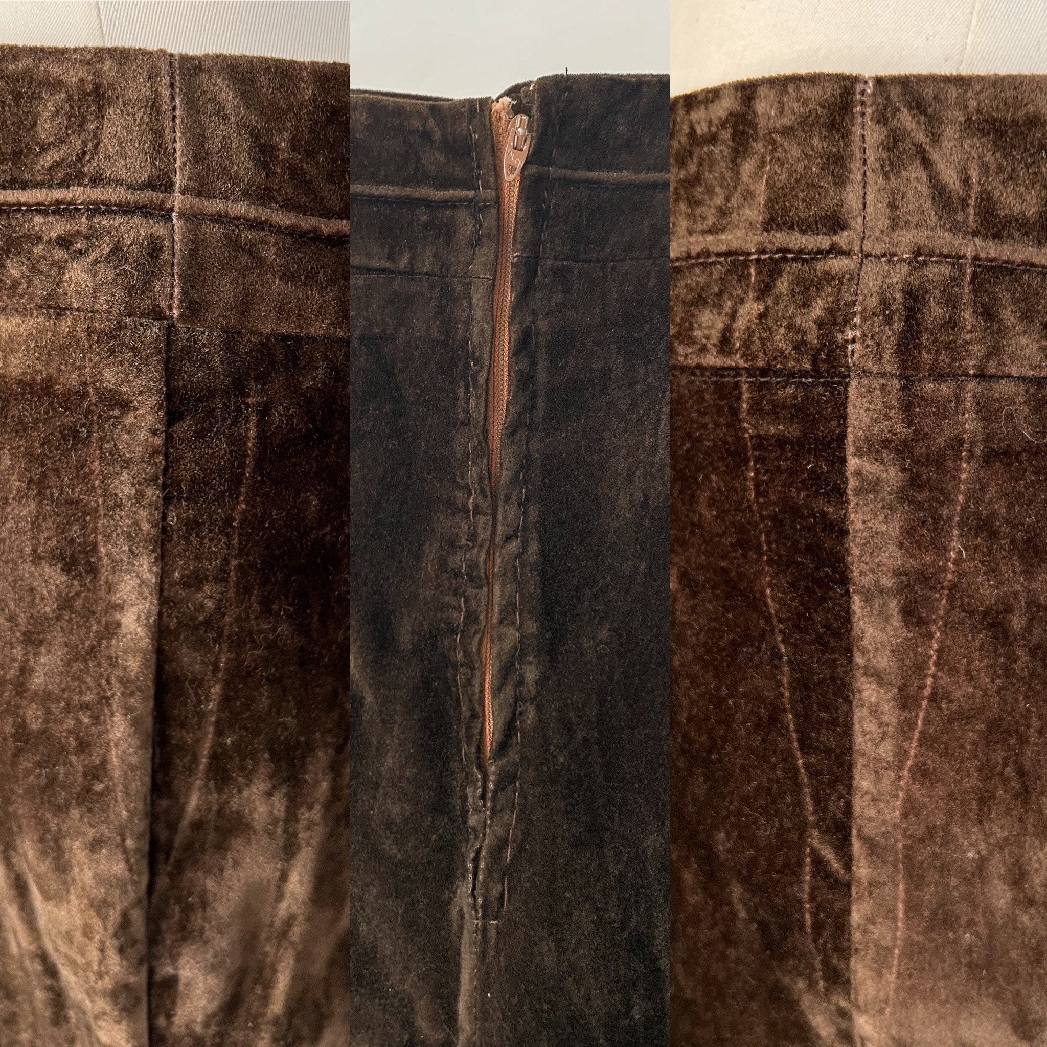 a chocolate brown rayon crushed velvet / faux suede, the suit includes a blazer with wide lapels and a single button closure, a high waisted maxi skirt with a western style raised detail at the hem and a back zipper closure, and high rise flared pleated pants, also with a back zipper closure.