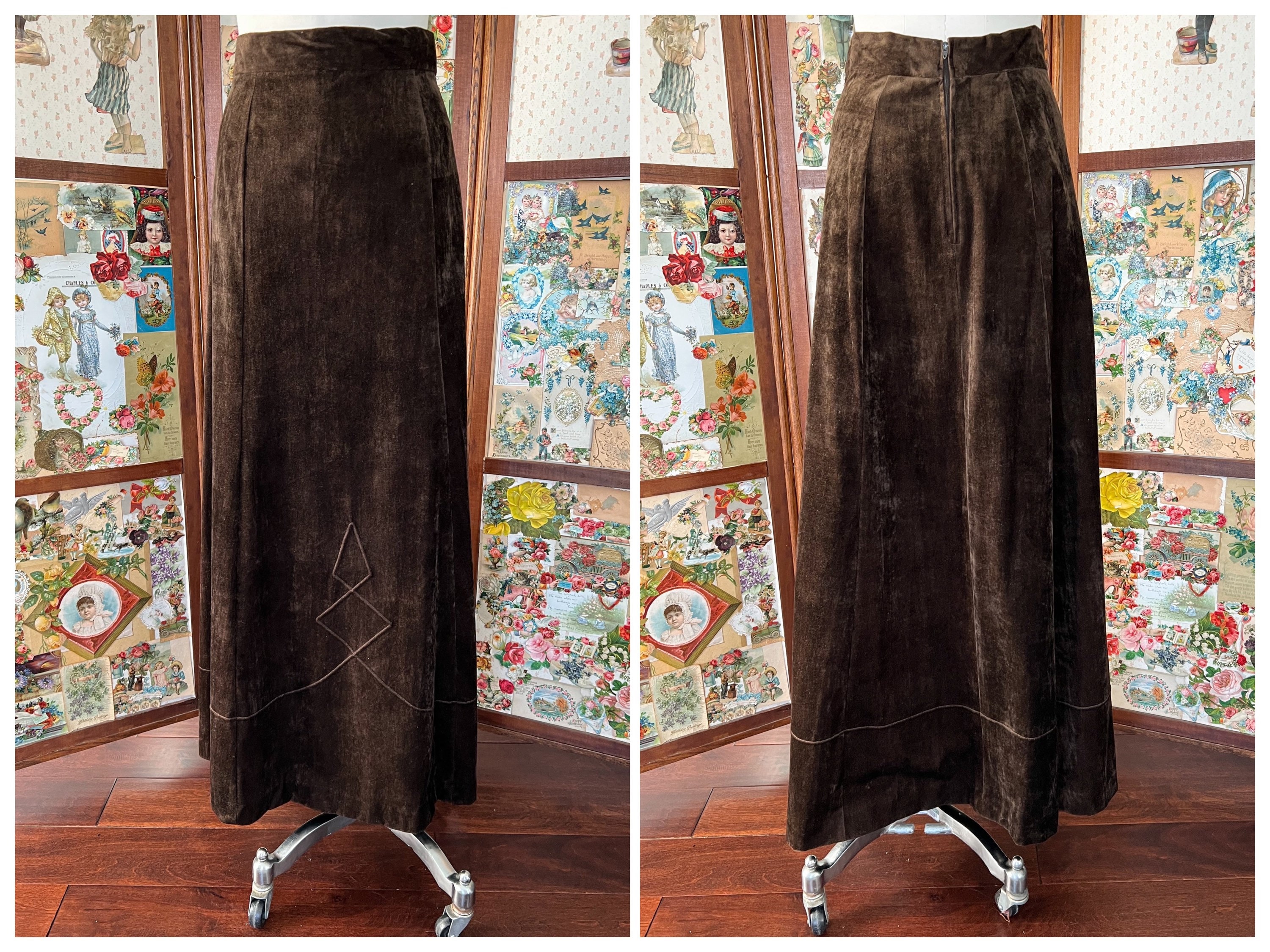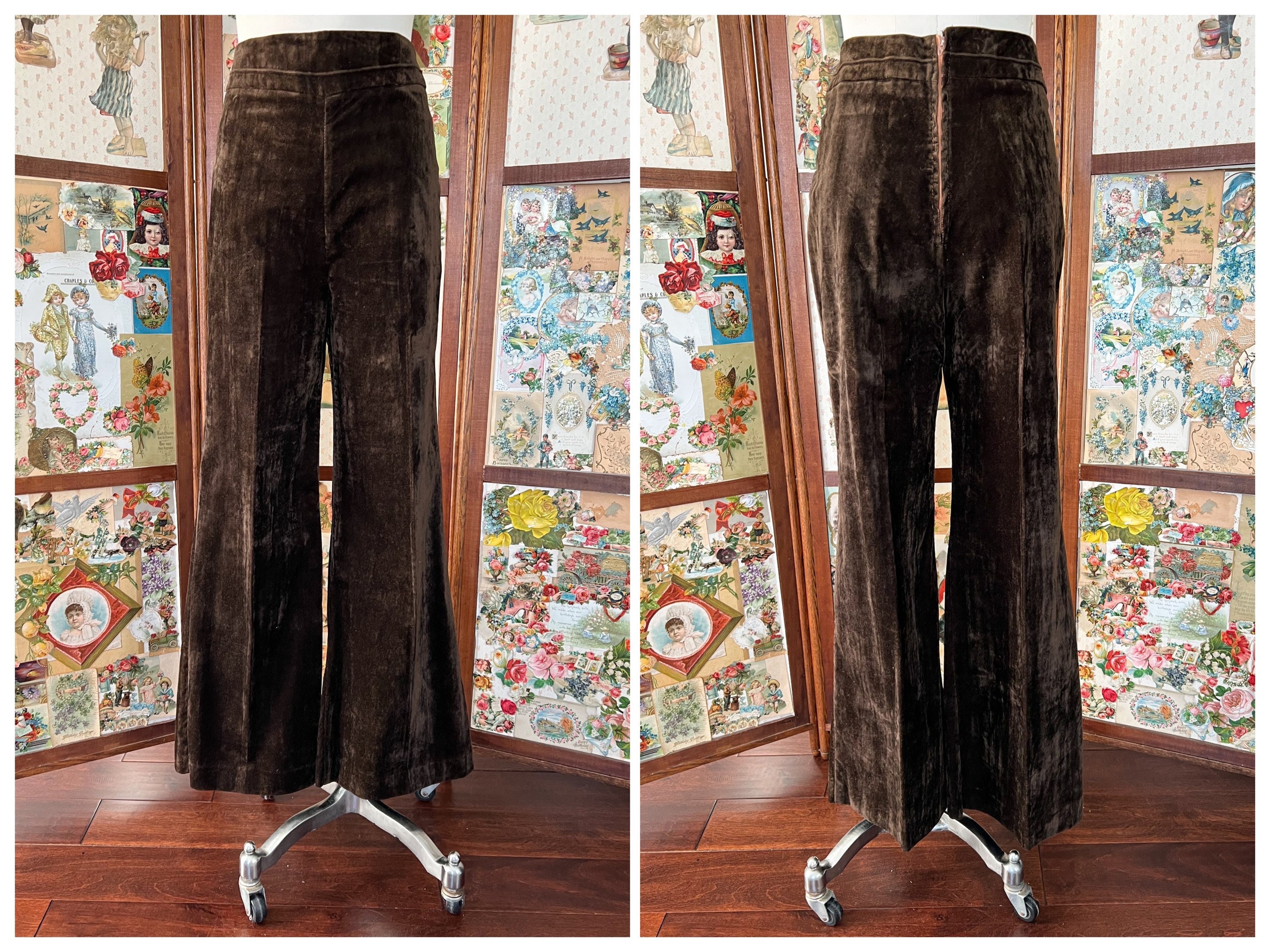 Condition: Good vintage condition! There are stitch marks down the sides of the pants where Ruth must have had them let out. The zipper is also hand-stitched in place a little messily. I also noticed some scattered little worn spots in the velvet and some faint reddish marks down the front of the skirt. However, I’m leaving dry cleaning to the discretion of the buyer once they take the pants back in / let out the skirt if they so choose.