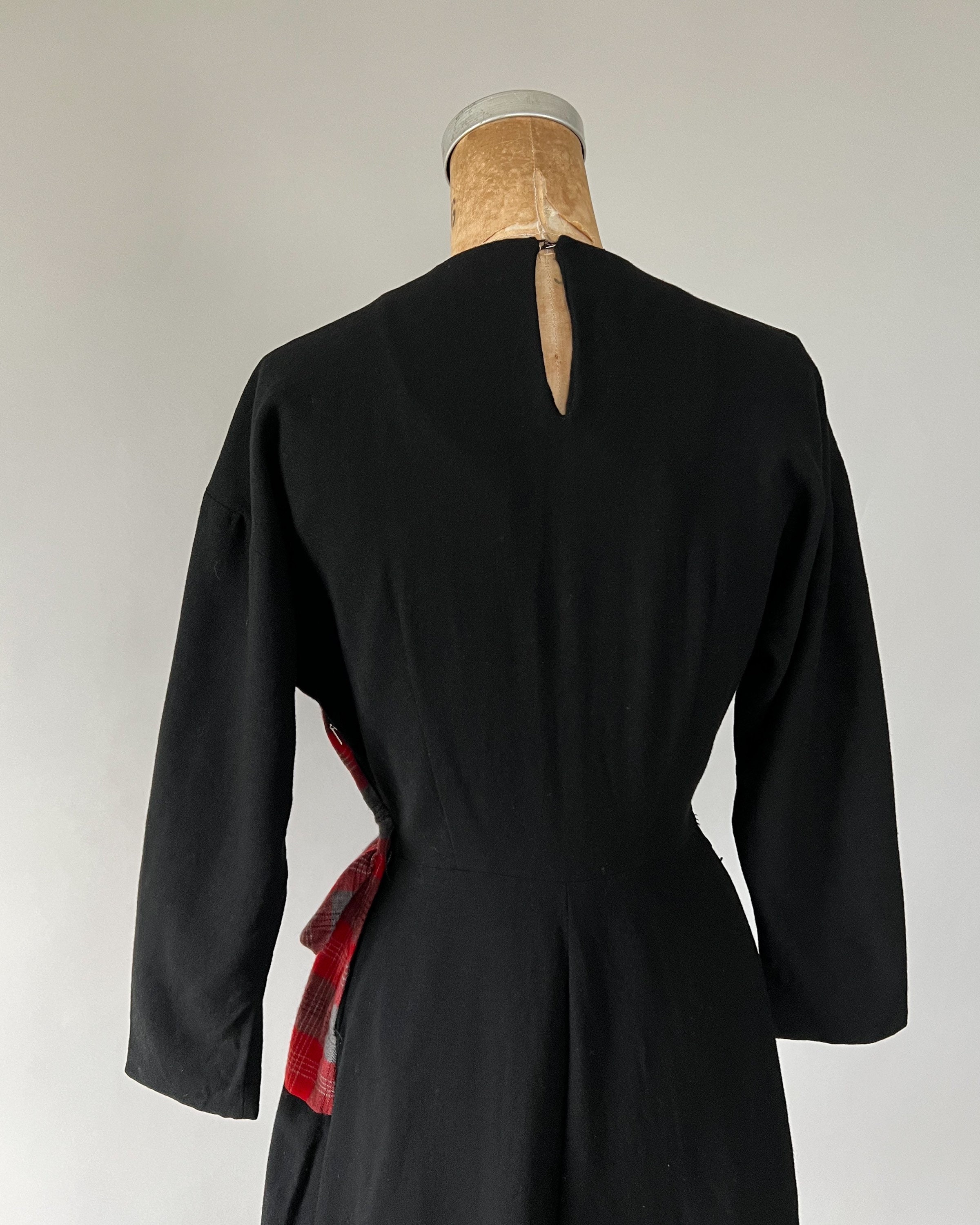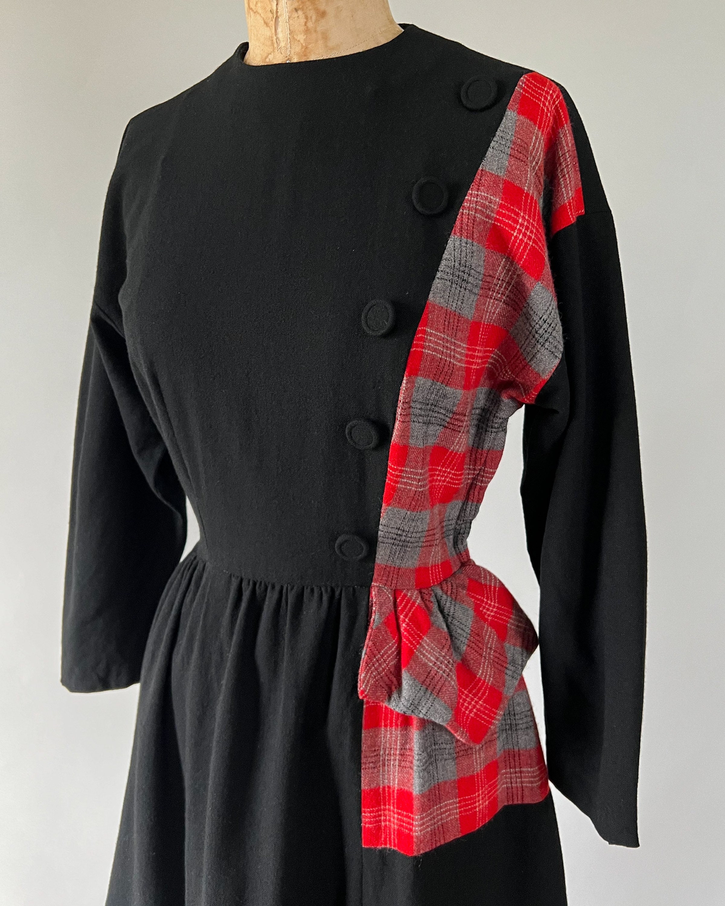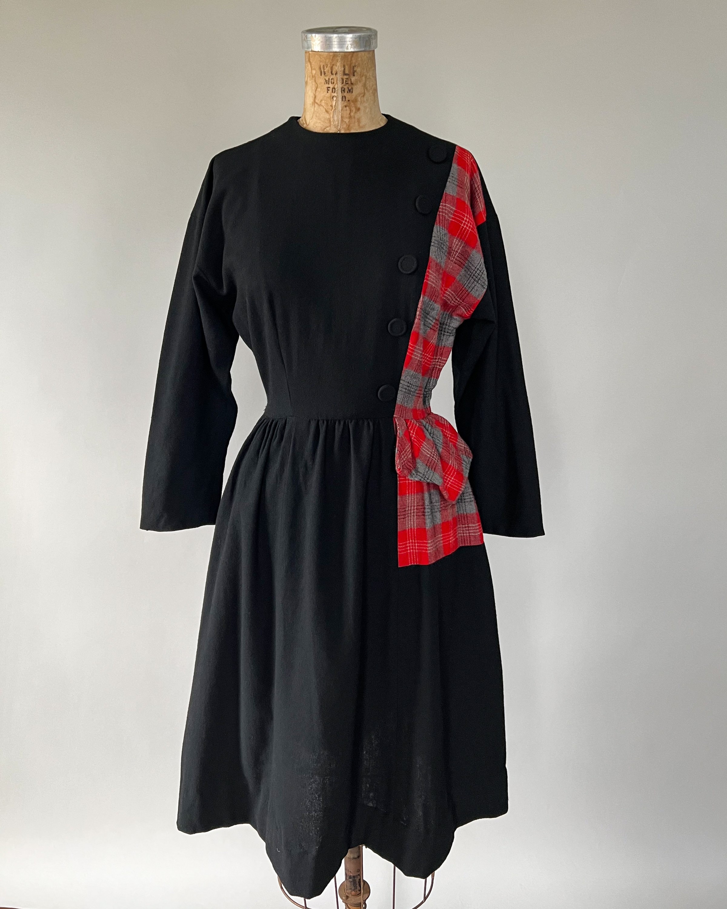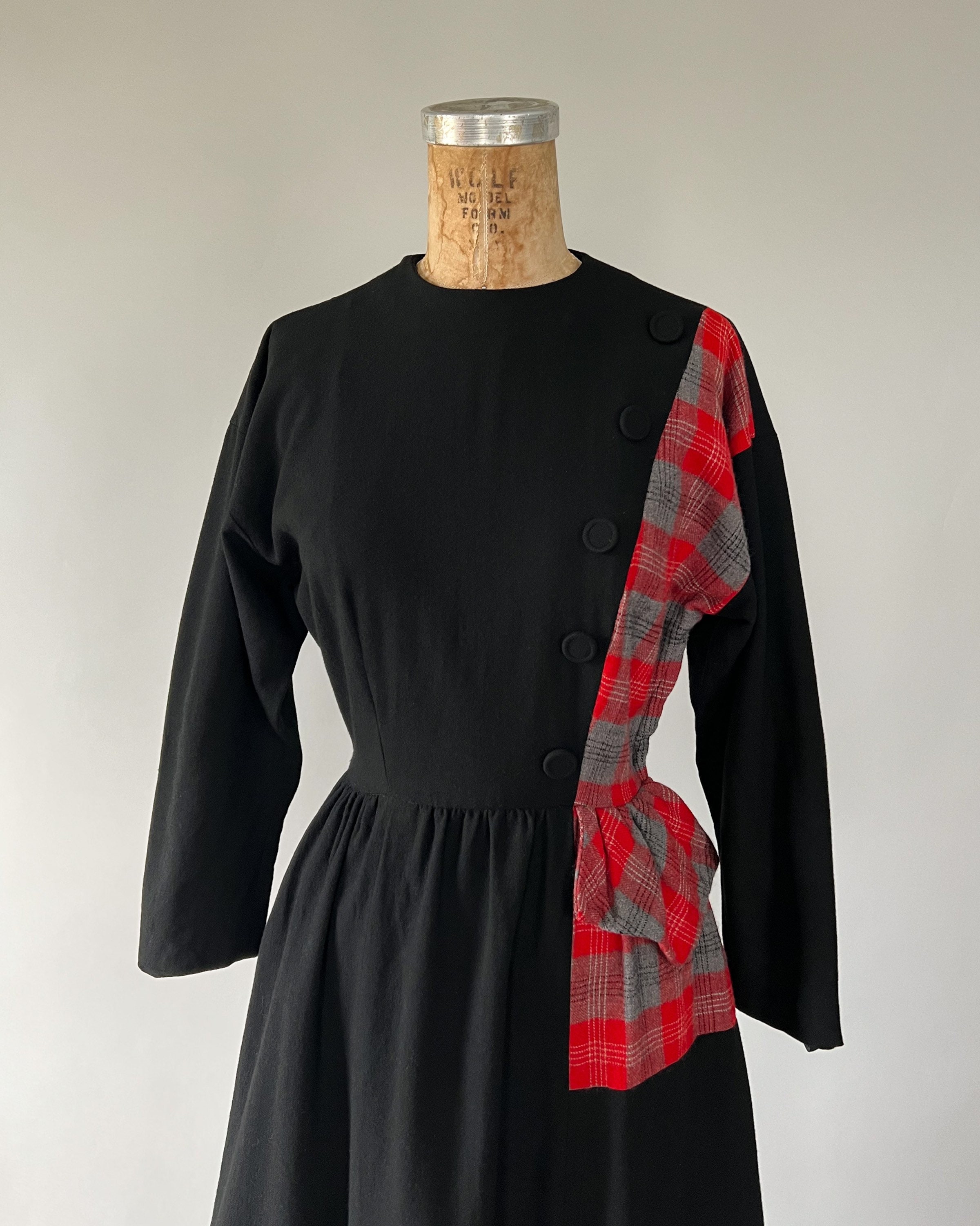 So much to love about this festive late 1940s or early 1950s holiday dress! The black wool dress has a crew neckline, long dolman sleeves, a nipped waist with a side metal zipper, and a full, gathered, midi length skirt. It features a contrasting red and gray plaid wool diagonal panel across the bodice that extends into the upper skirt with a flirty little flounce at the hip (mimicking a sash). A row of decorative covered buttons adorn the bodice along the plaid panel. Such a cute, cozy dress that would be perfect to wear for Christmas festivities!