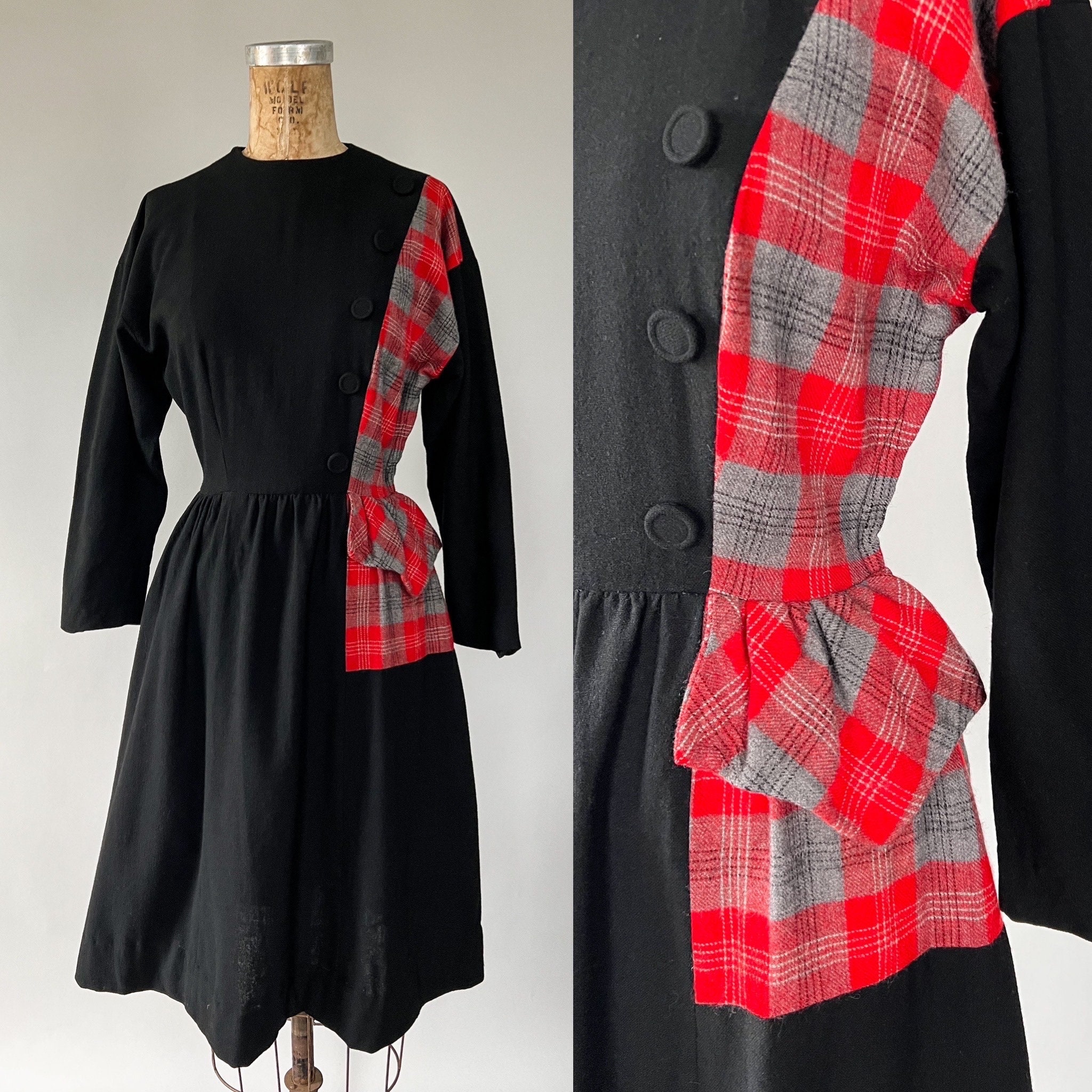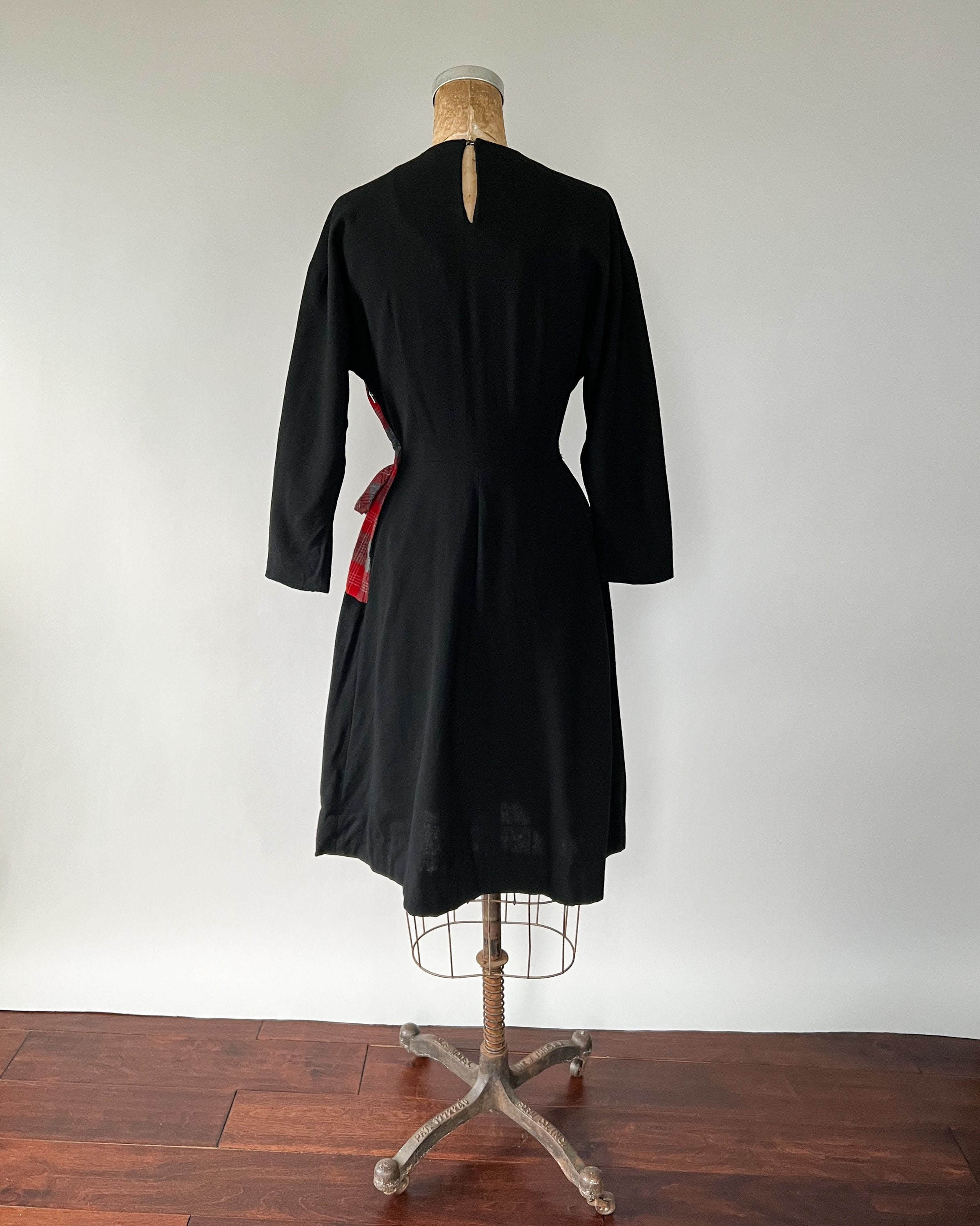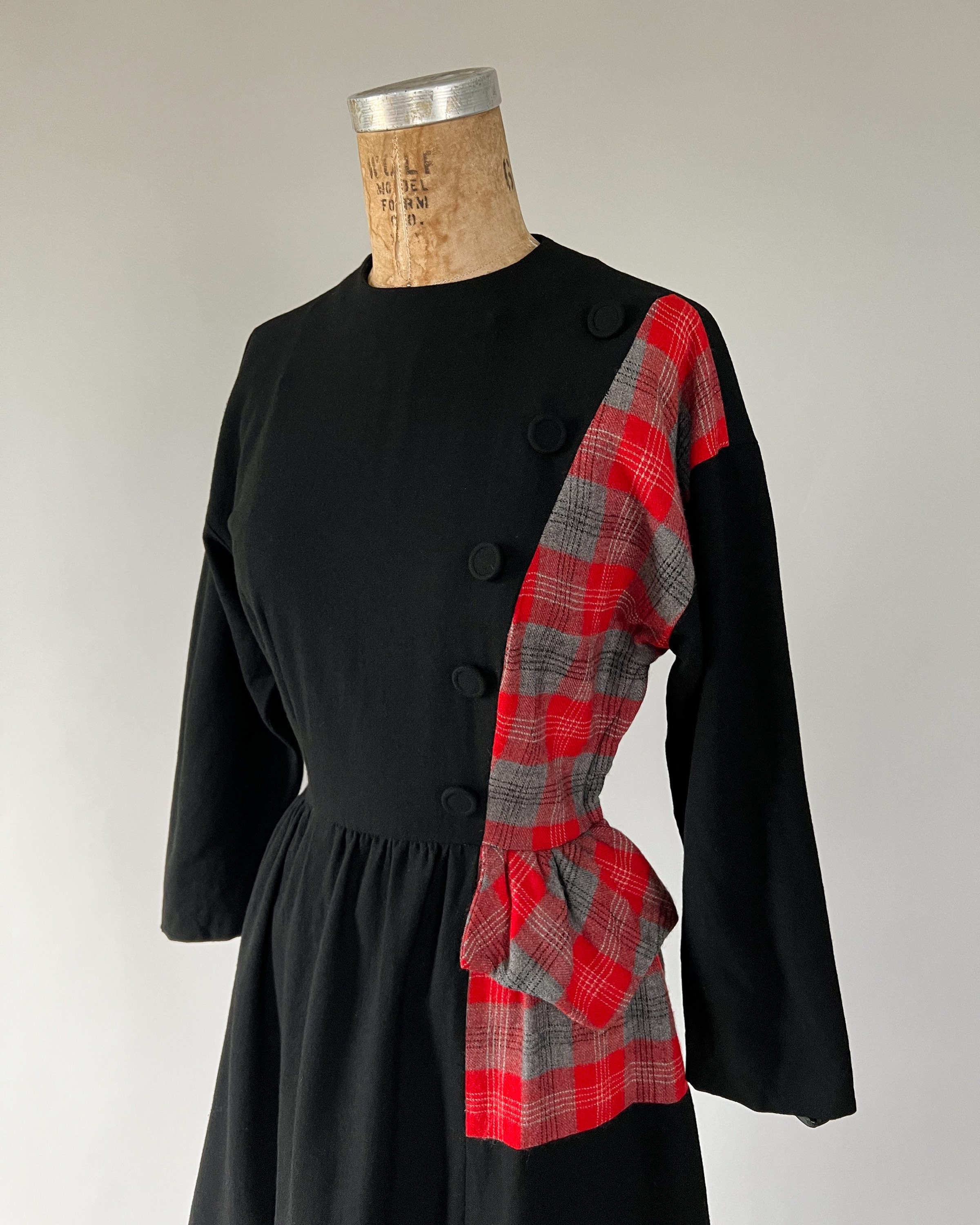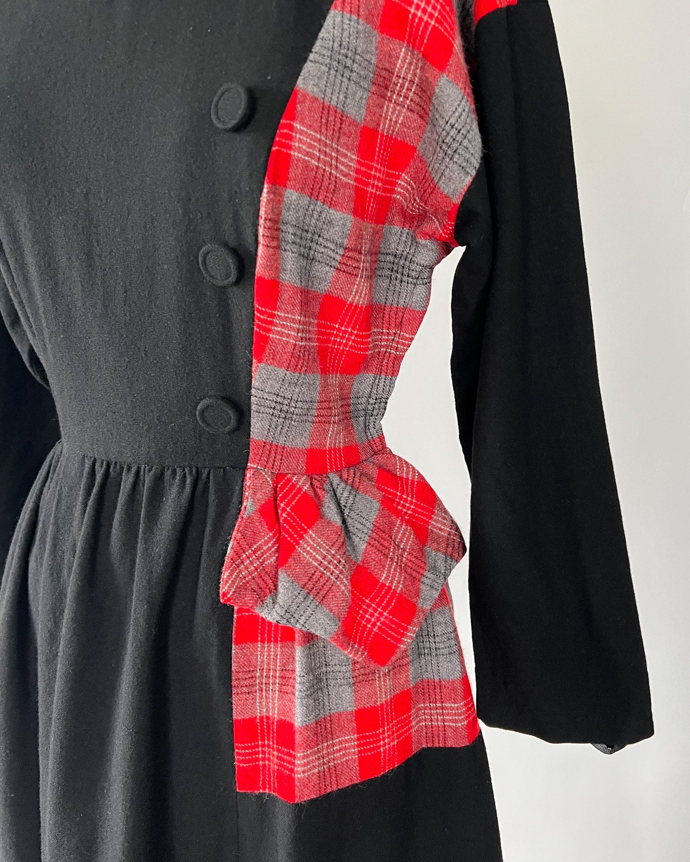 So much to love about this festive late 1940s or early 1950s holiday dress! The black wool dress has a crew neckline, long dolman sleeves, a nipped waist with a side metal zipper, and a full, gathered, midi length skirt. It features a contrasting red and gray plaid wool diagonal panel across the bodice that extends into the upper skirt with a flirty little flounce at the hip (mimicking a sash). A row of decorative covered buttons adorn the bodice along the plaid panel. Such a cute, cozy dress that would be perfect to wear for Christmas festivities!