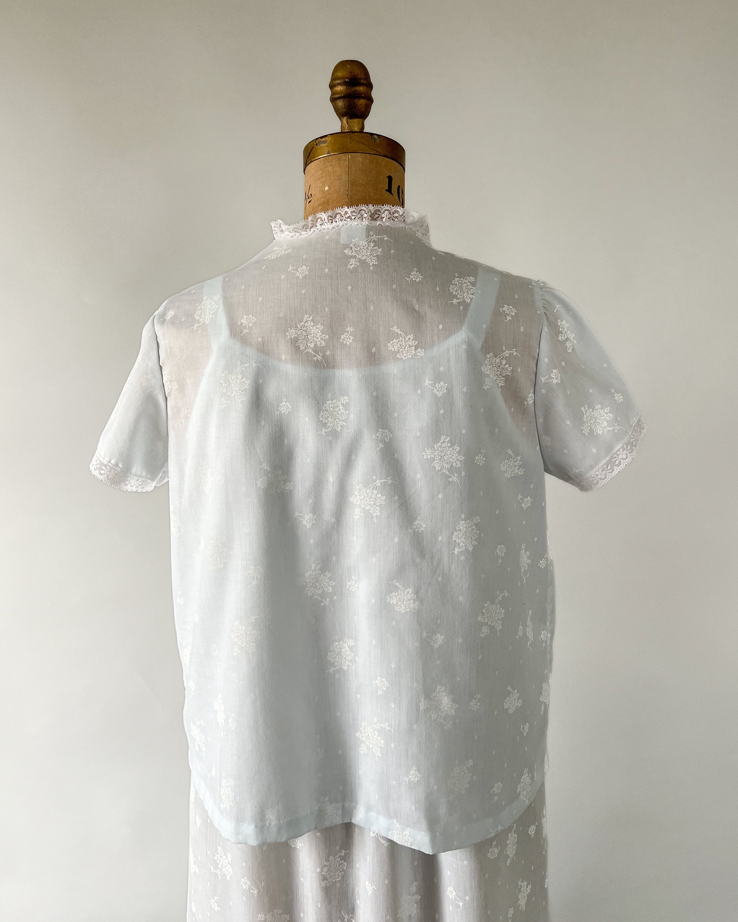 A lovely 1980s ice blue and white floral peignoir set! The set includes a long, full nightgown with a lace trimmed vee neckline with a little ribbon bow and thin straps. It has a matching short sleeved bed jacket with lace trim and front ribbon ties.