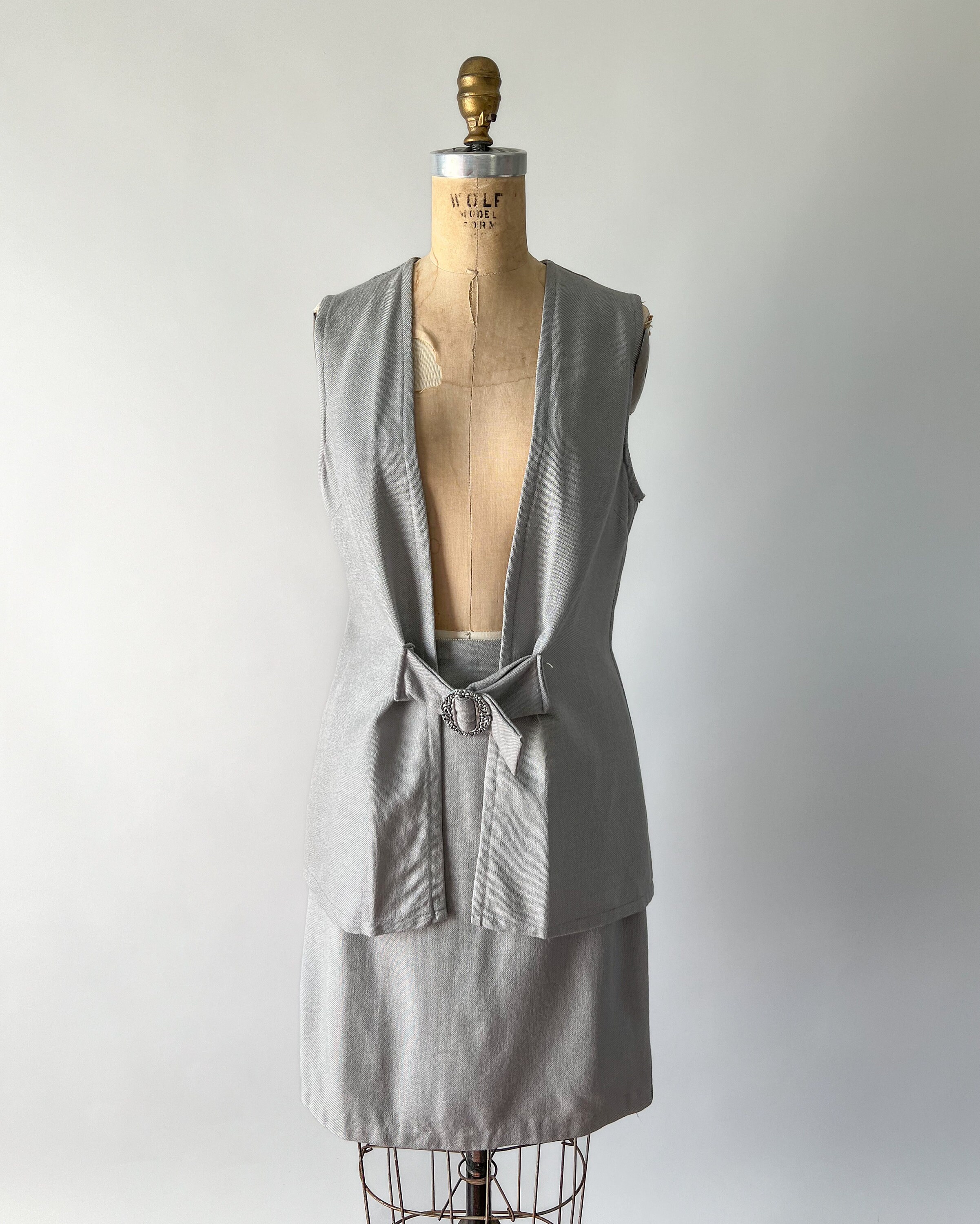 A late 60s or early 70s gray line skirt suit. The 2PC set includes a sleeveless jacket / long vest / jerkin with a front attached belt with a circular belt buckle, and a high waisted, slim, mini length pencil skirt with a back zipper. The previous owner had ironed the front sides back for a deeper front opening, but the they could be ironed back flat if desired (see photos).