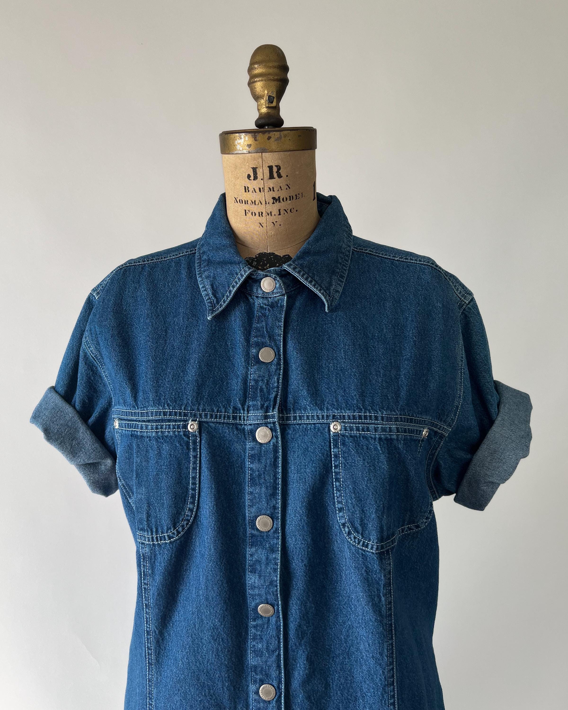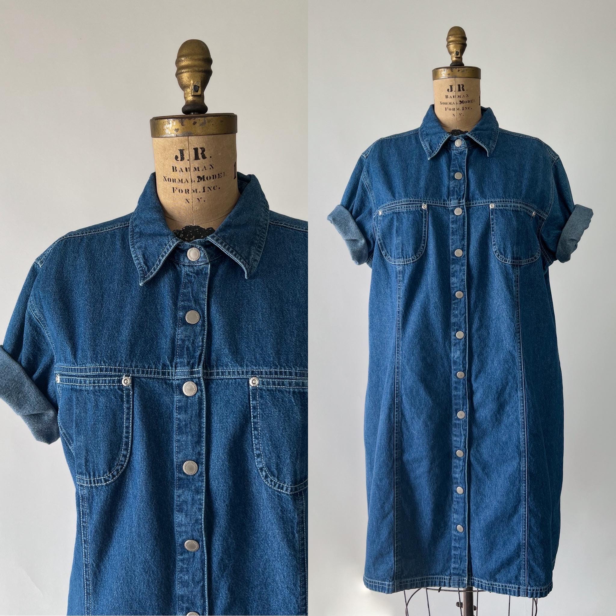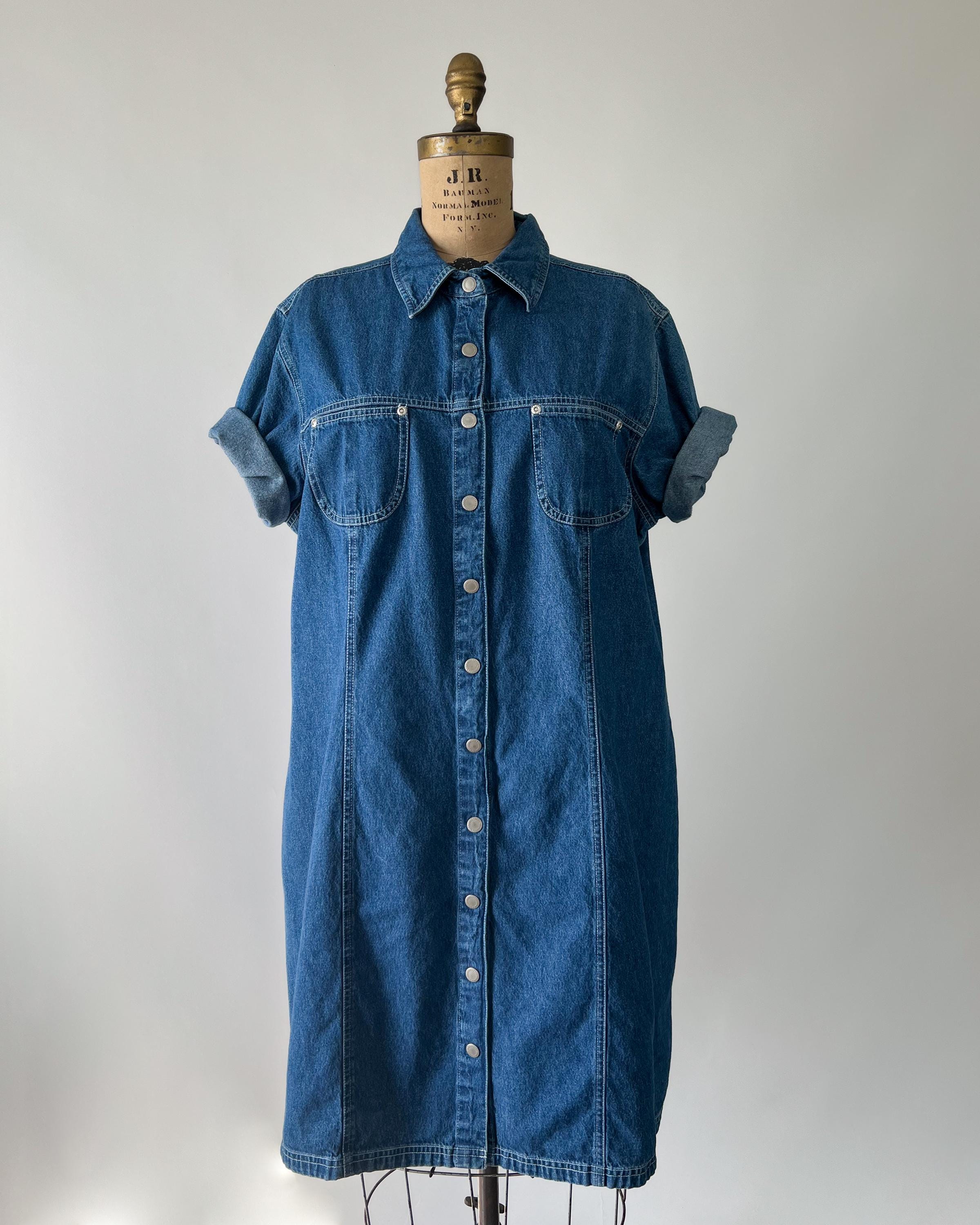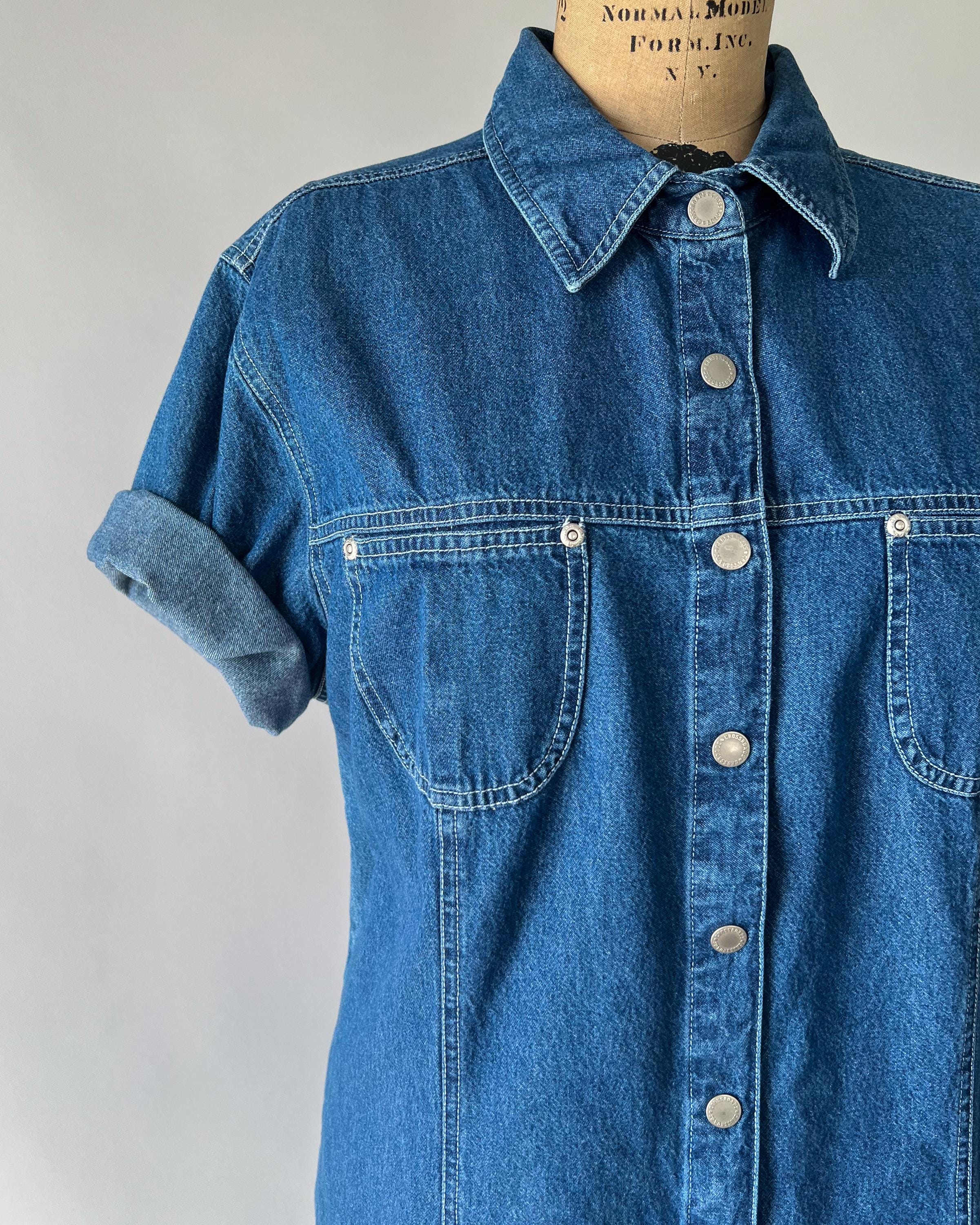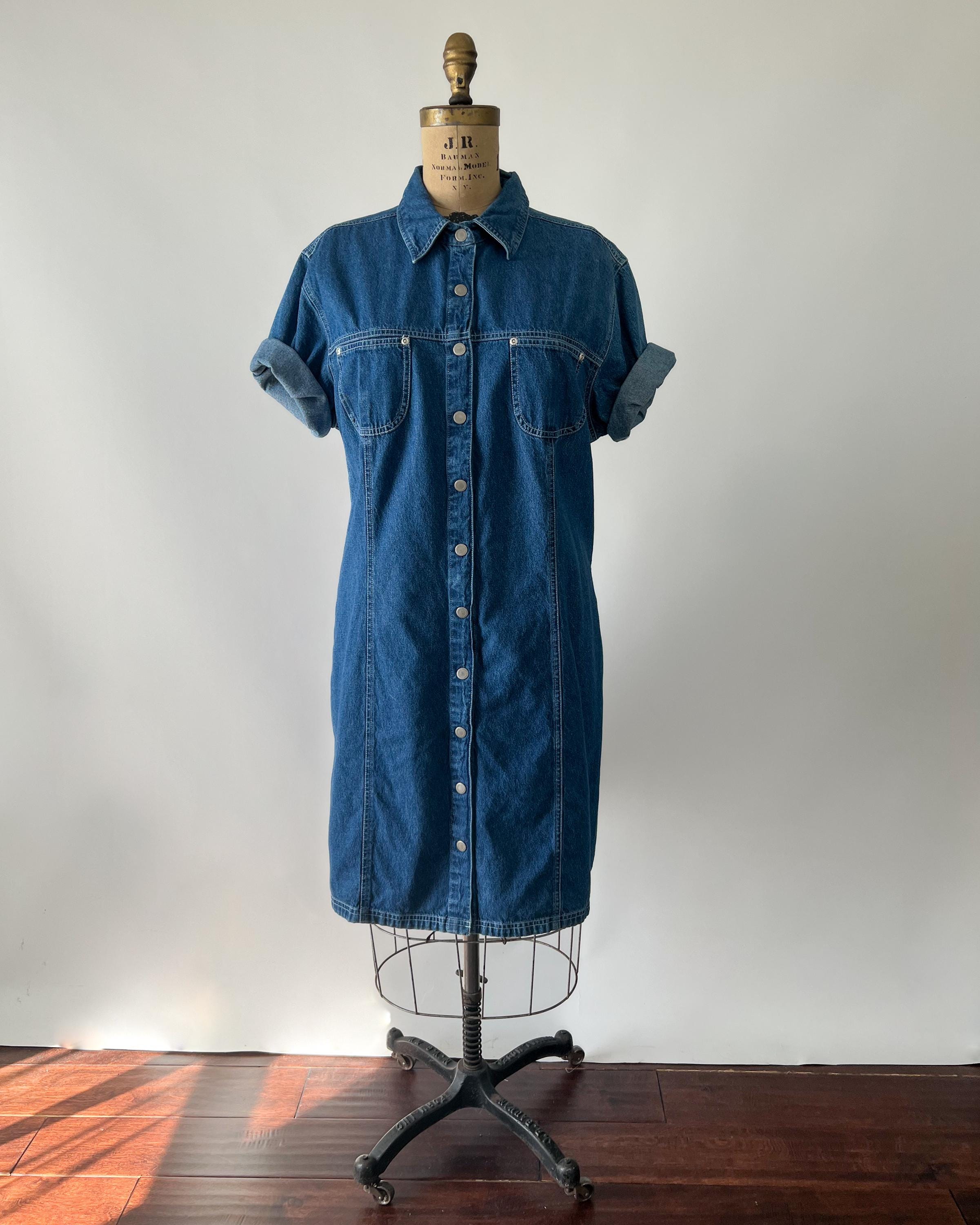 An adorable denim shirtdress from the 1990s! The collared button front jean dress has short sleeves, a darted waist, and slim, knee length skirt. It buttons from collar to hem and features front breast pockets.
