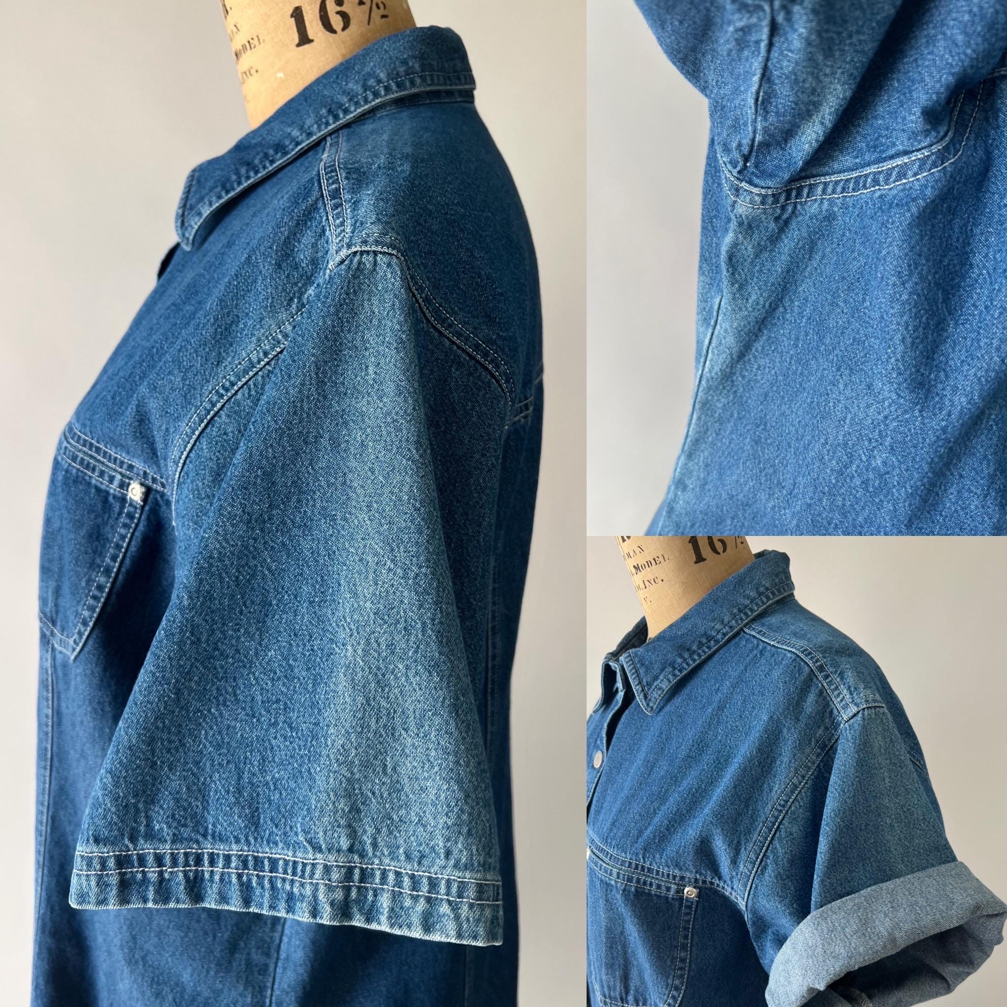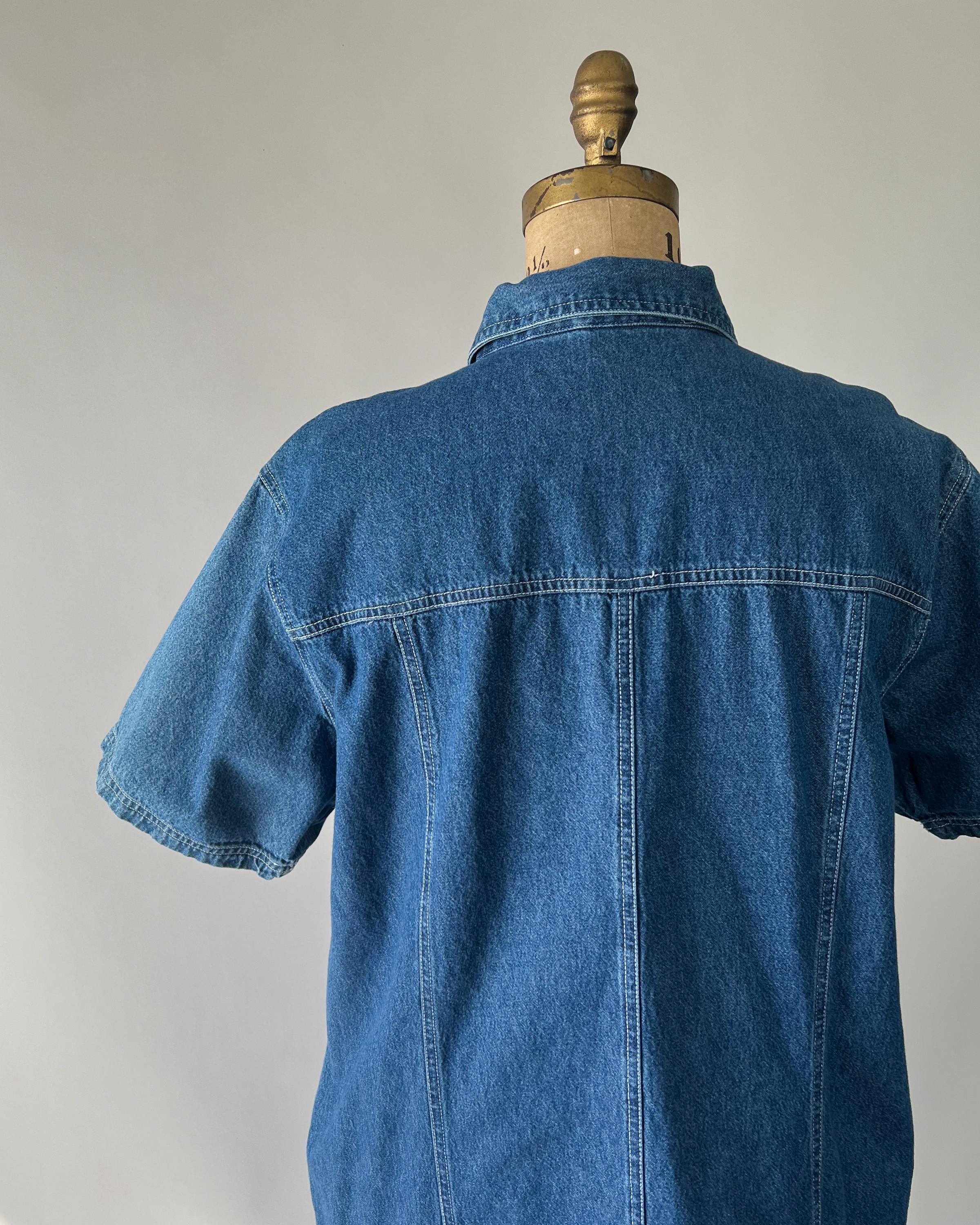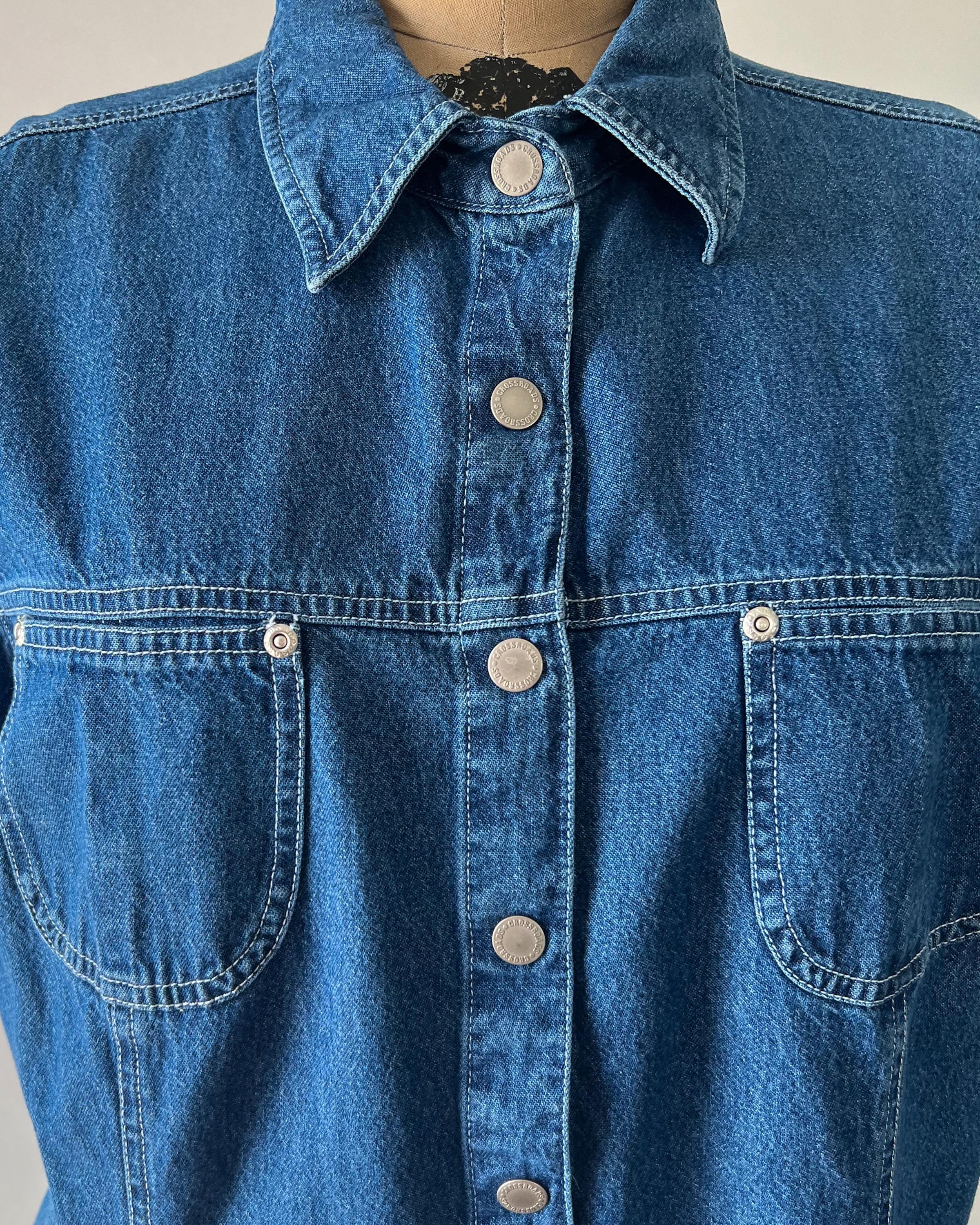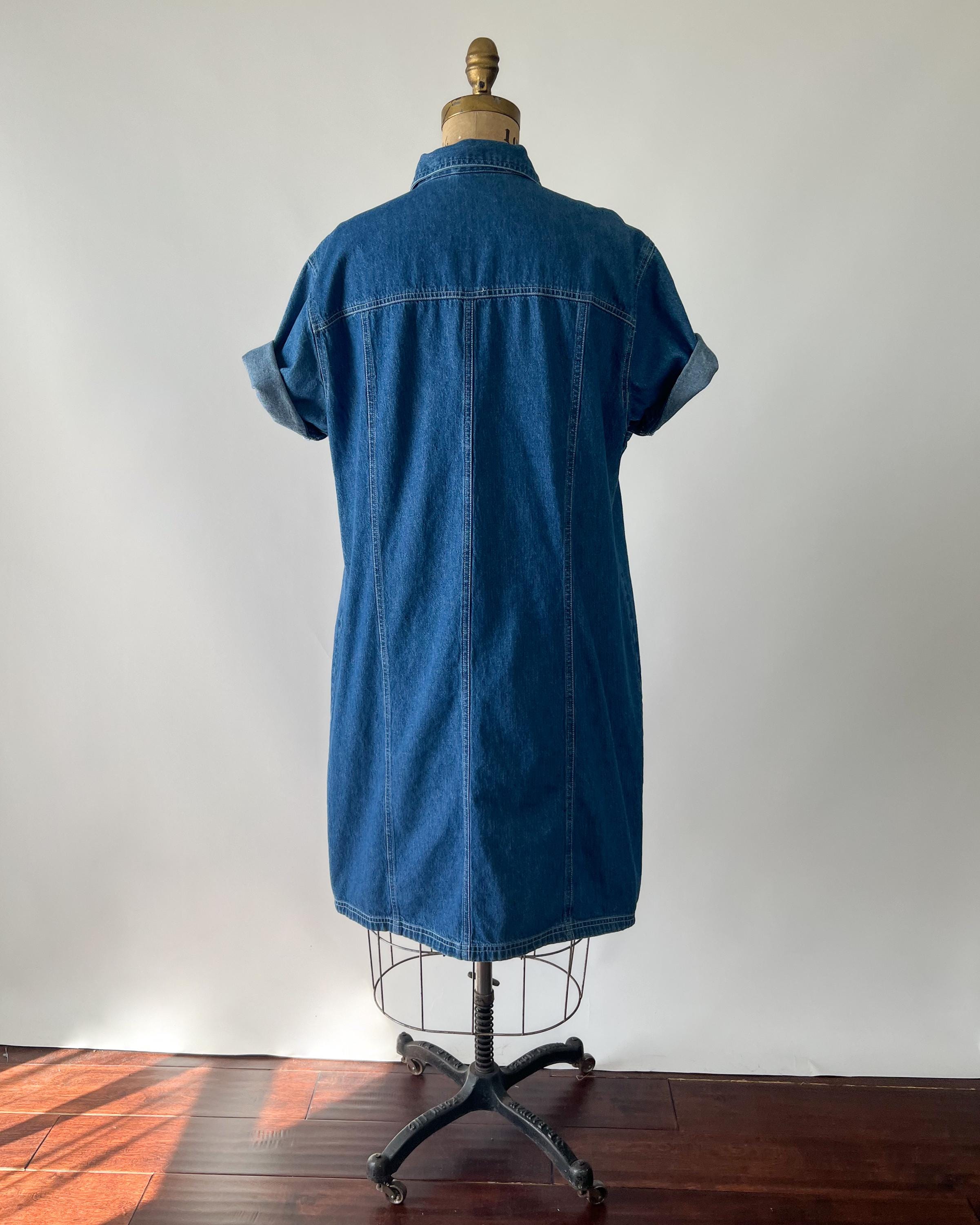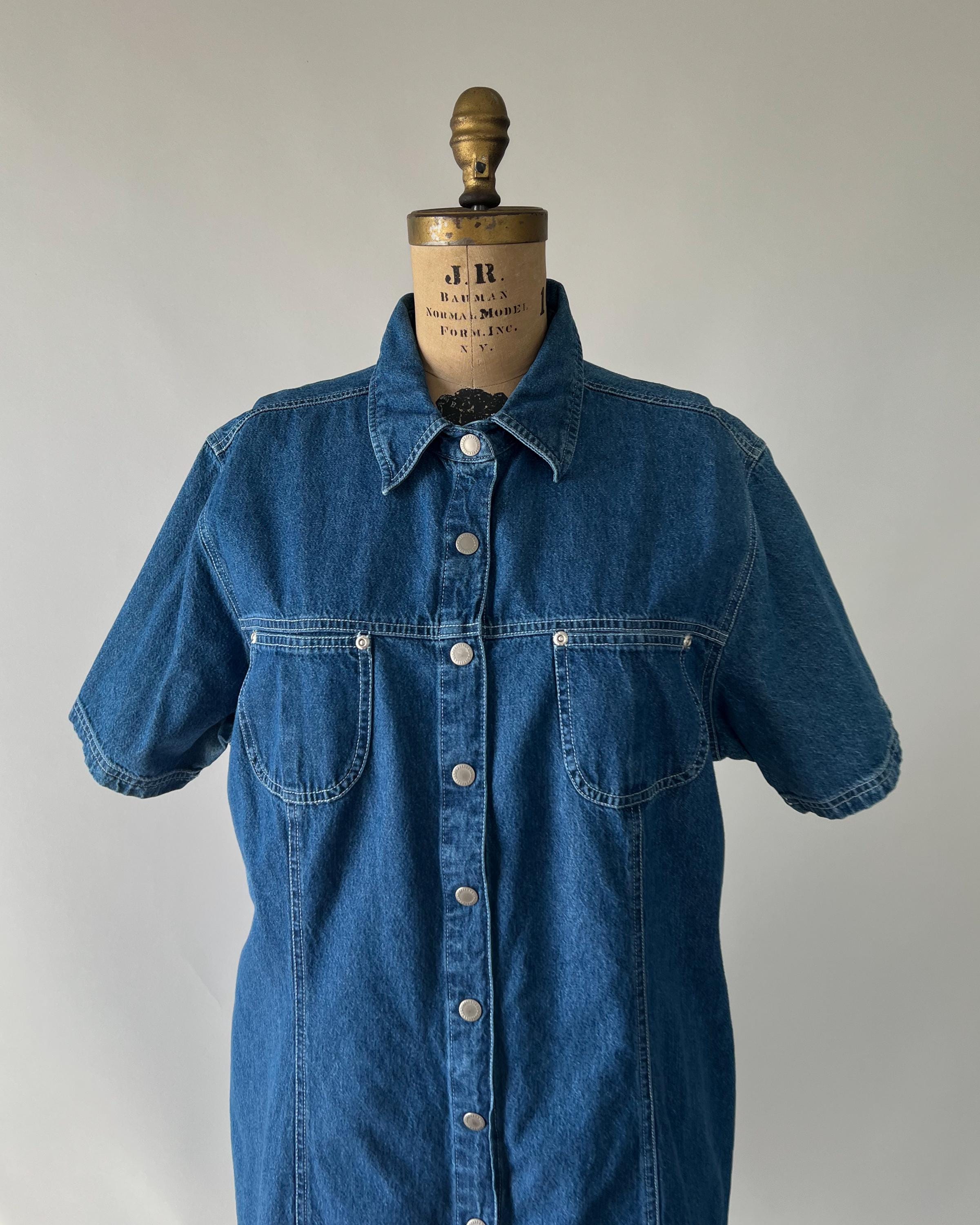 An adorable denim shirtdress from the 1990s! The collared button front jean dress has short sleeves, a darted waist, and slim, knee length skirt. It buttons from collar to hem and features front breast pockets.
