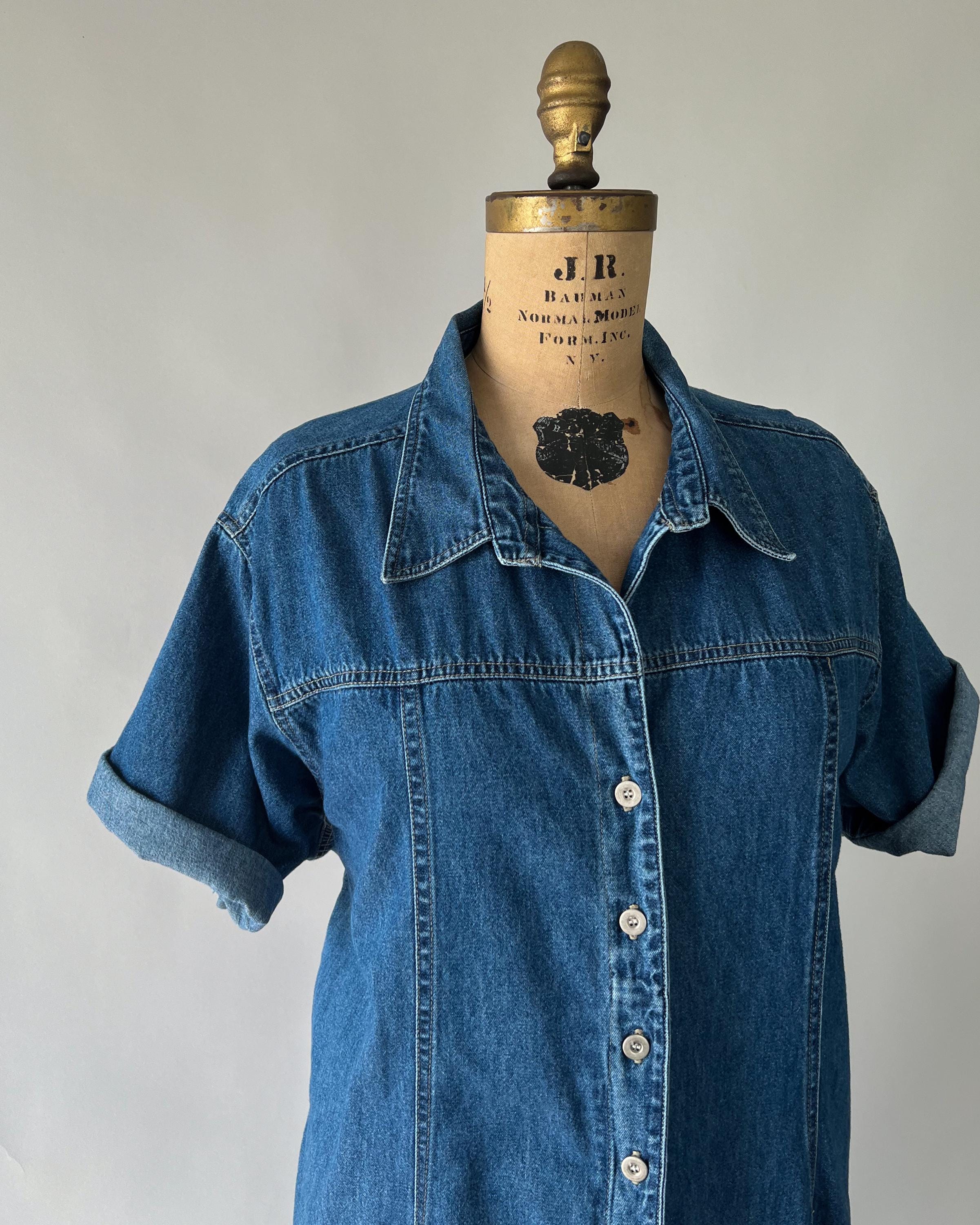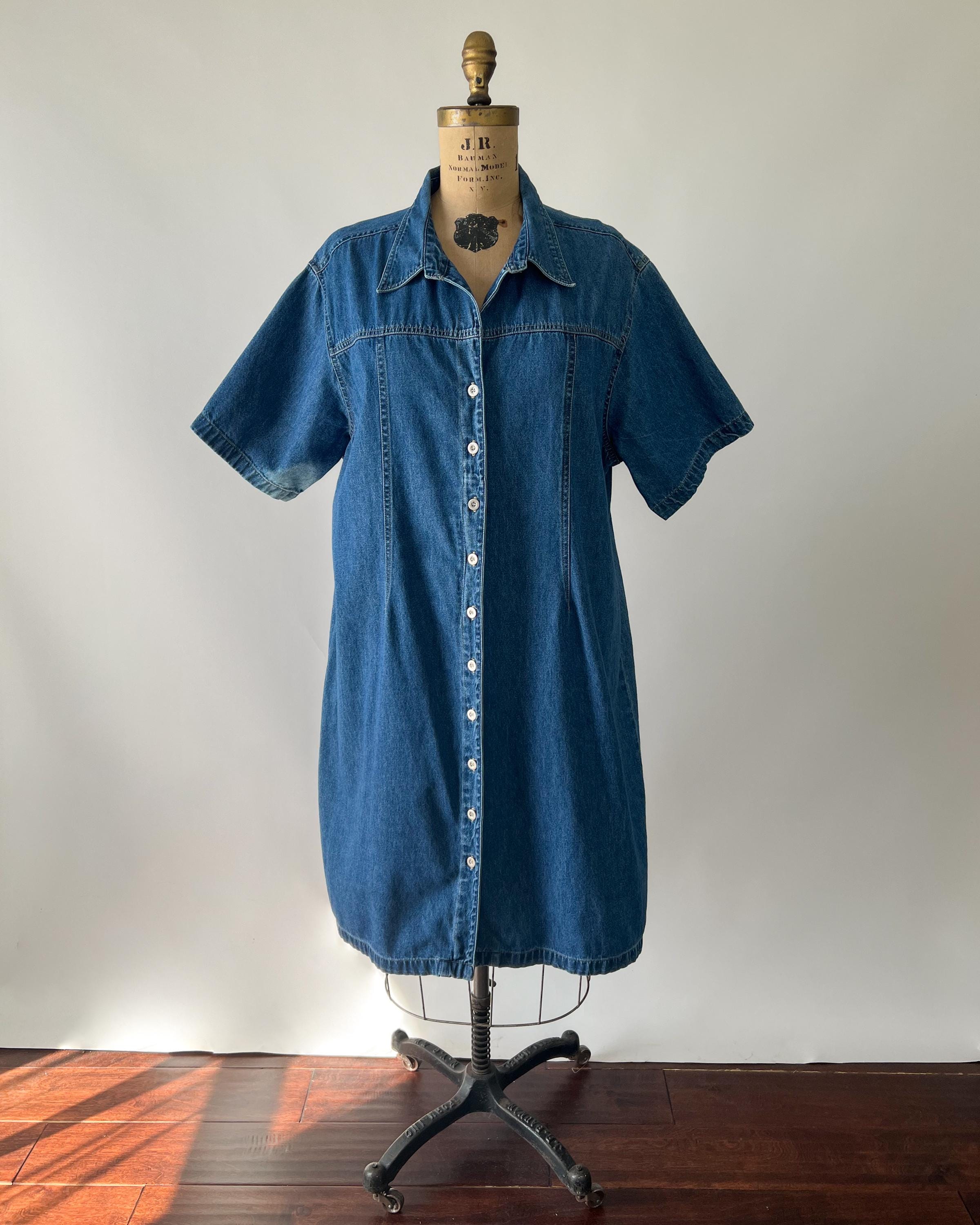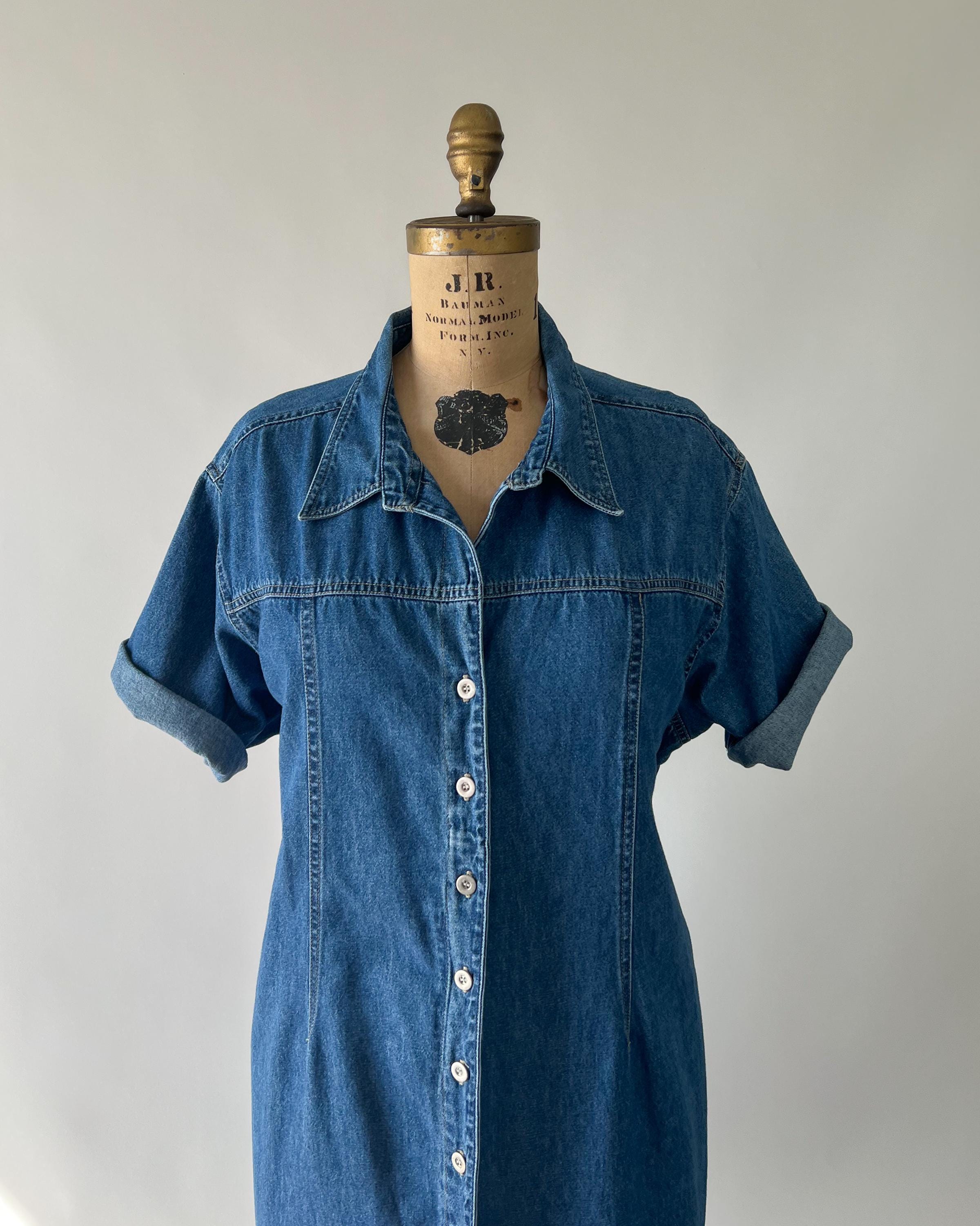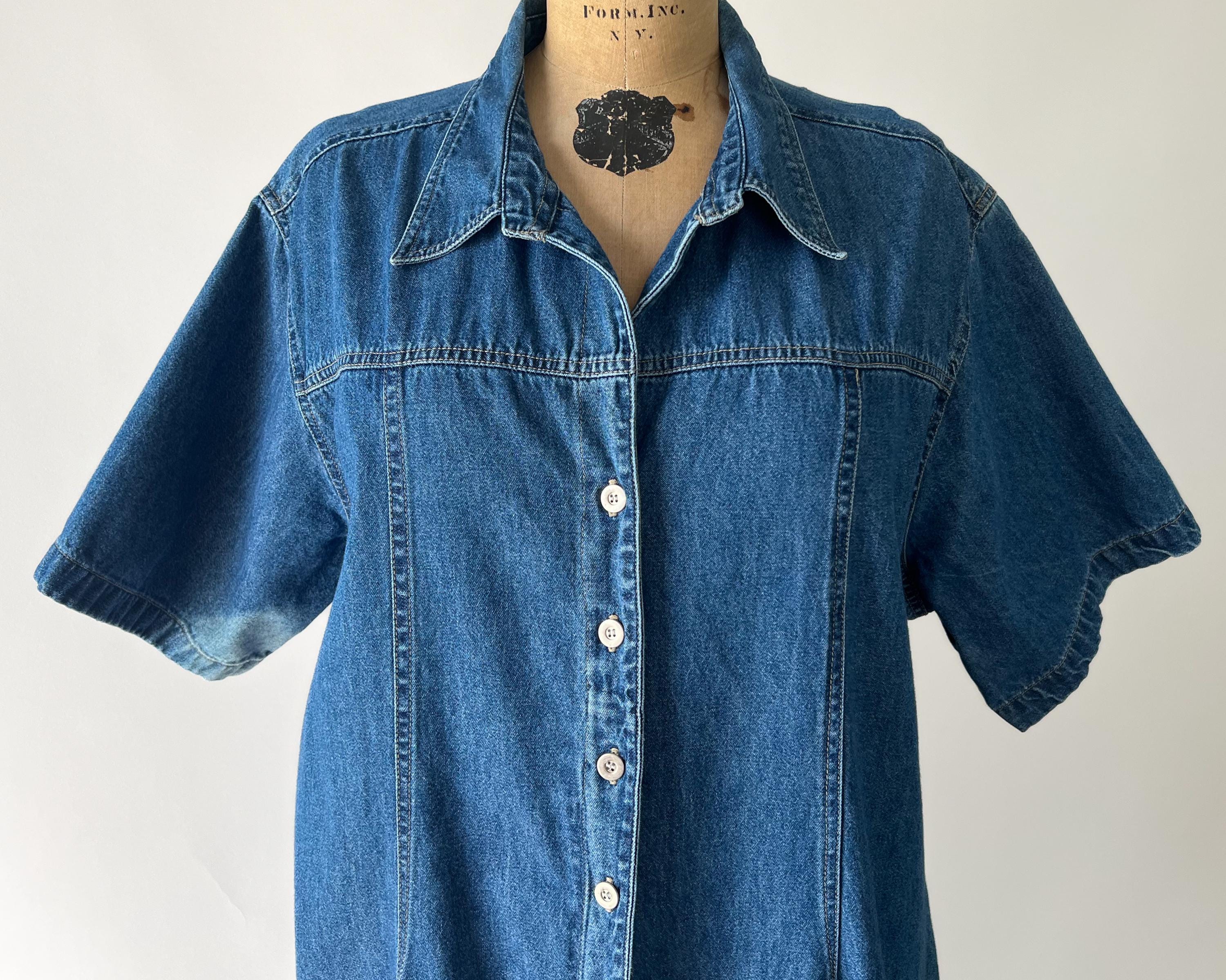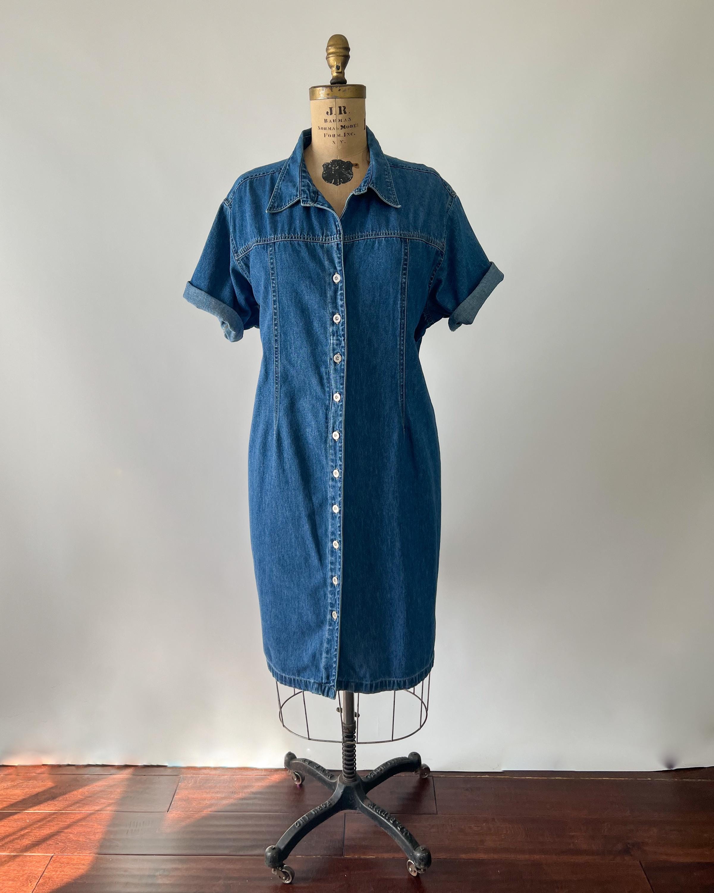 An adorable denim shirtdress from the 1990s! The collared button front jean dress has short sleeves, a darted waist, and slim, knee length skirt. It buttons from collar to hem.