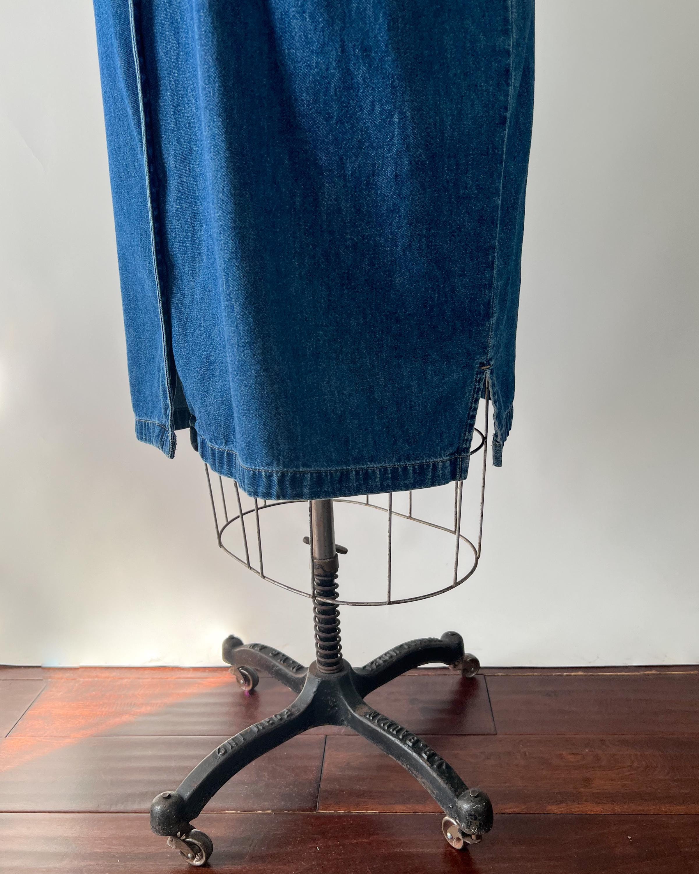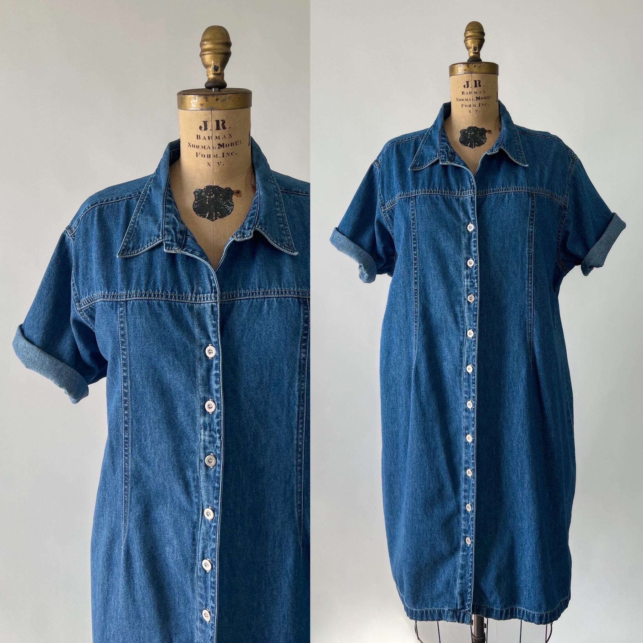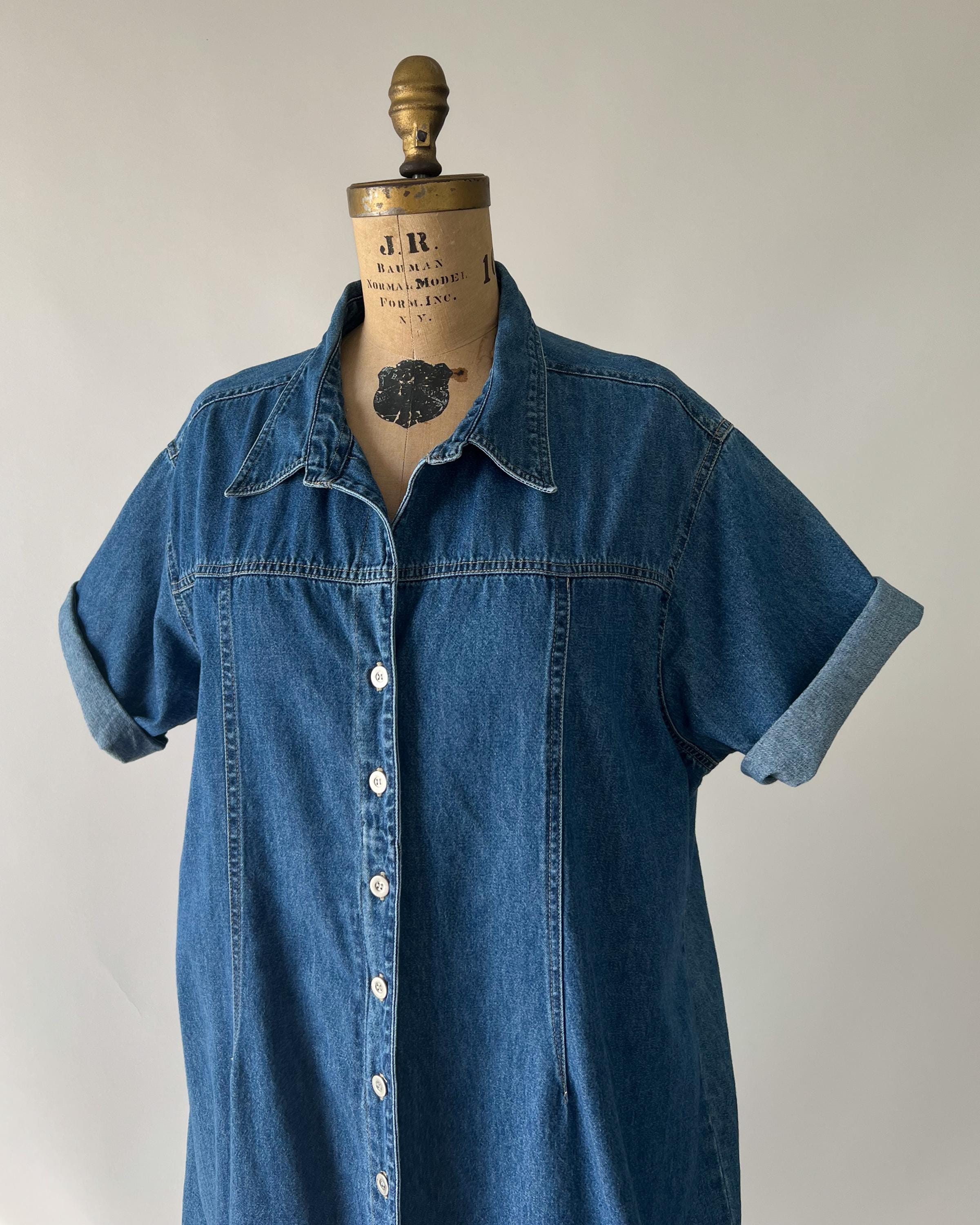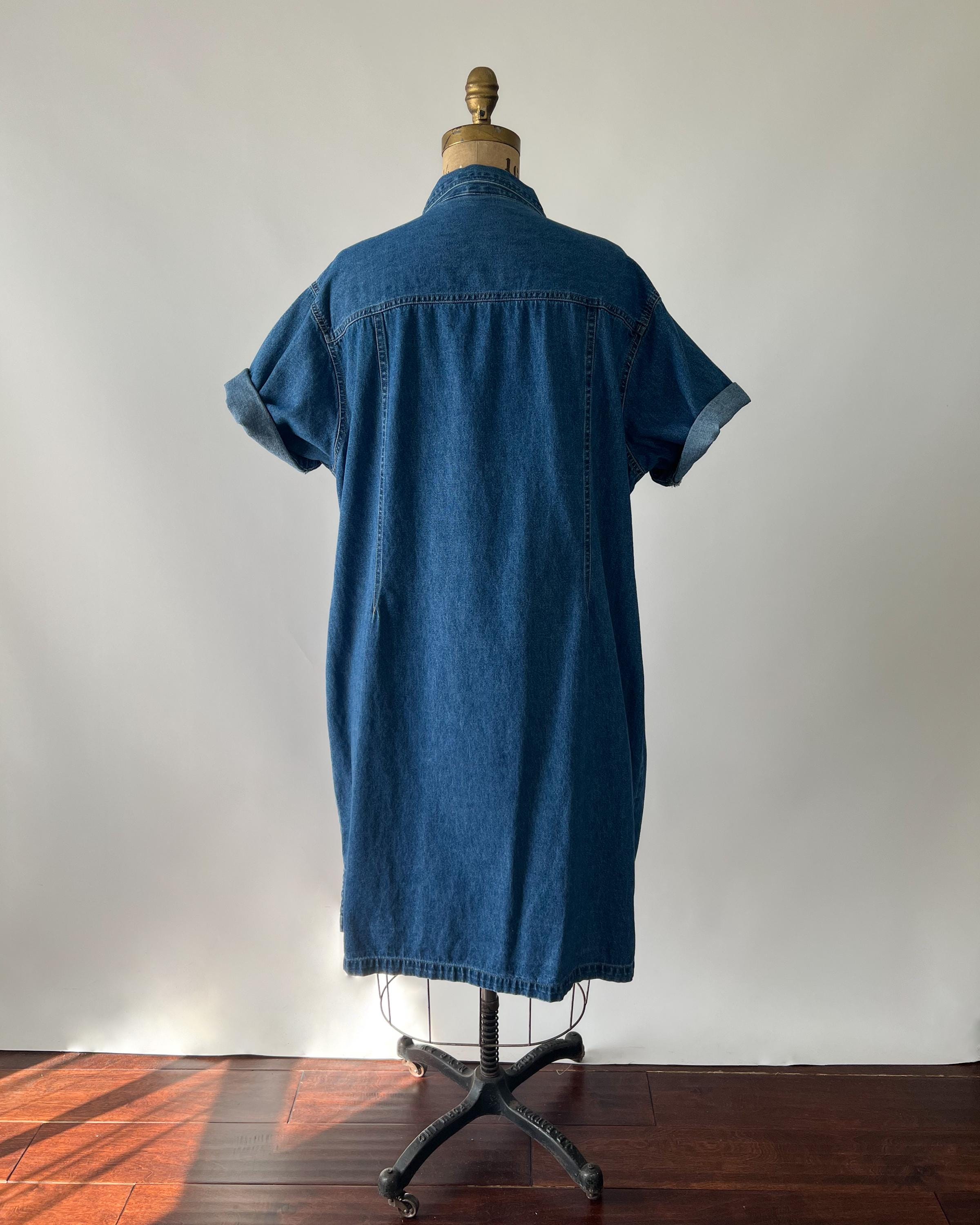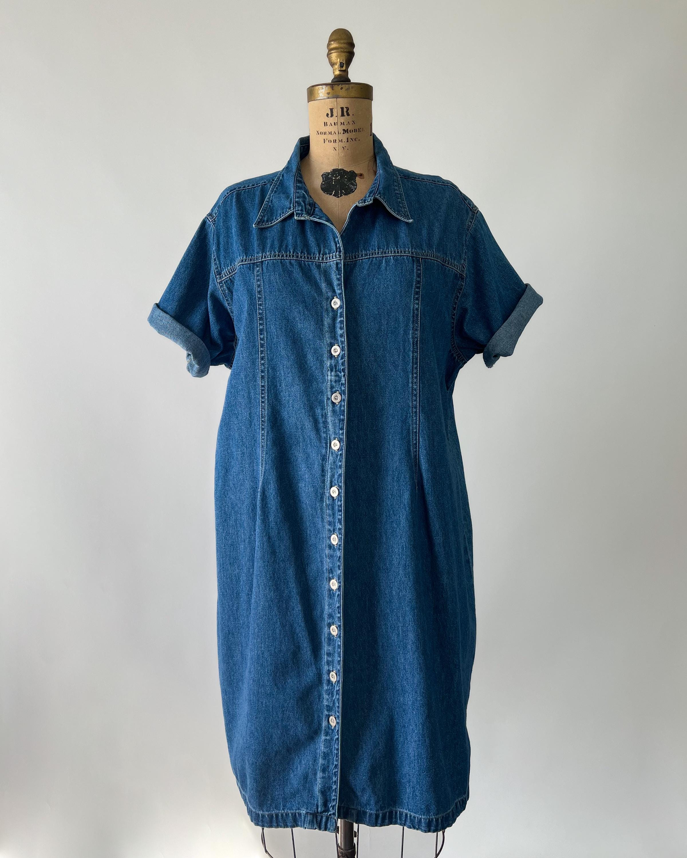 An adorable denim shirtdress from the 1990s! The collared button front jean dress has short sleeves, a darted waist, and slim, knee length skirt. It buttons from collar to hem.