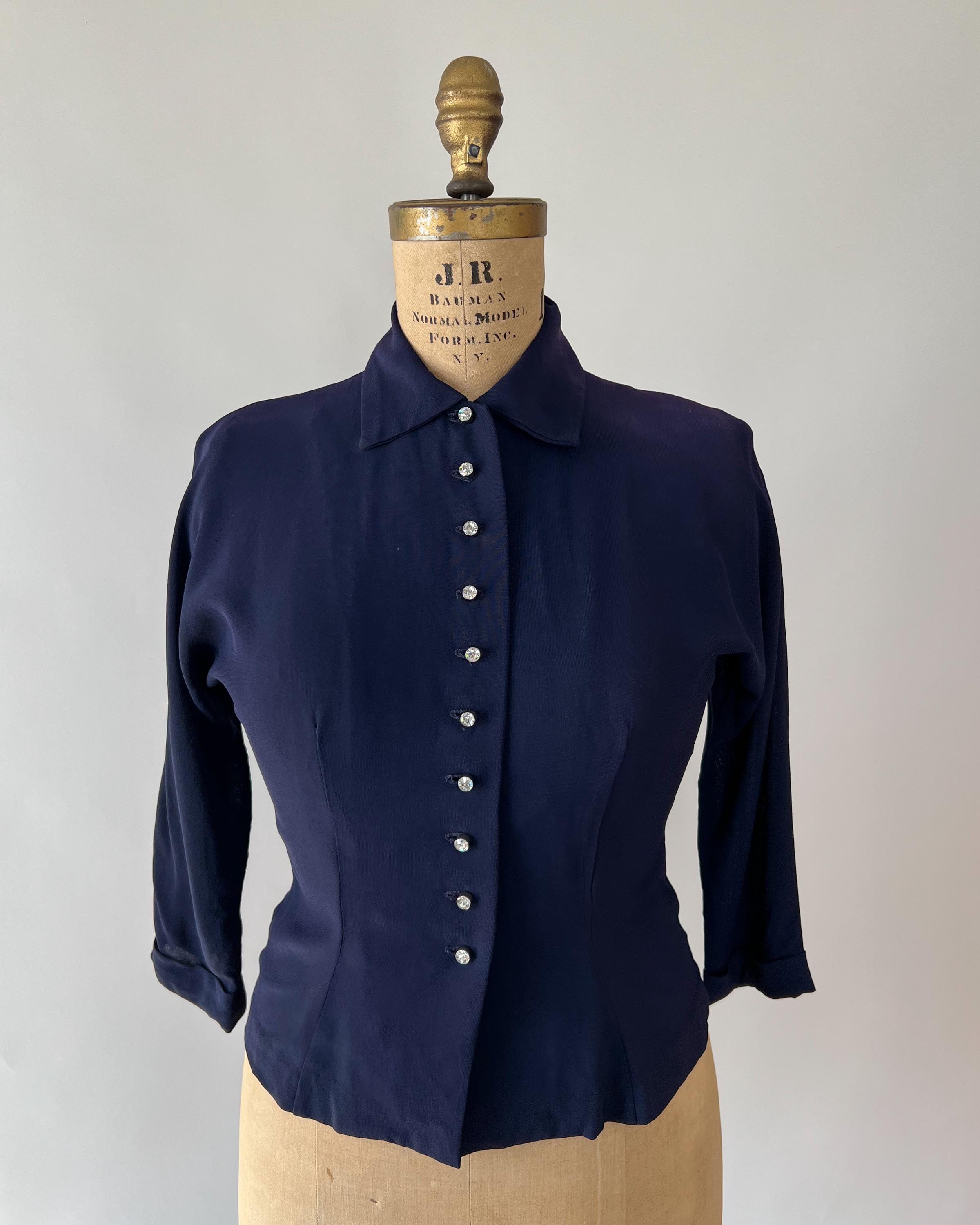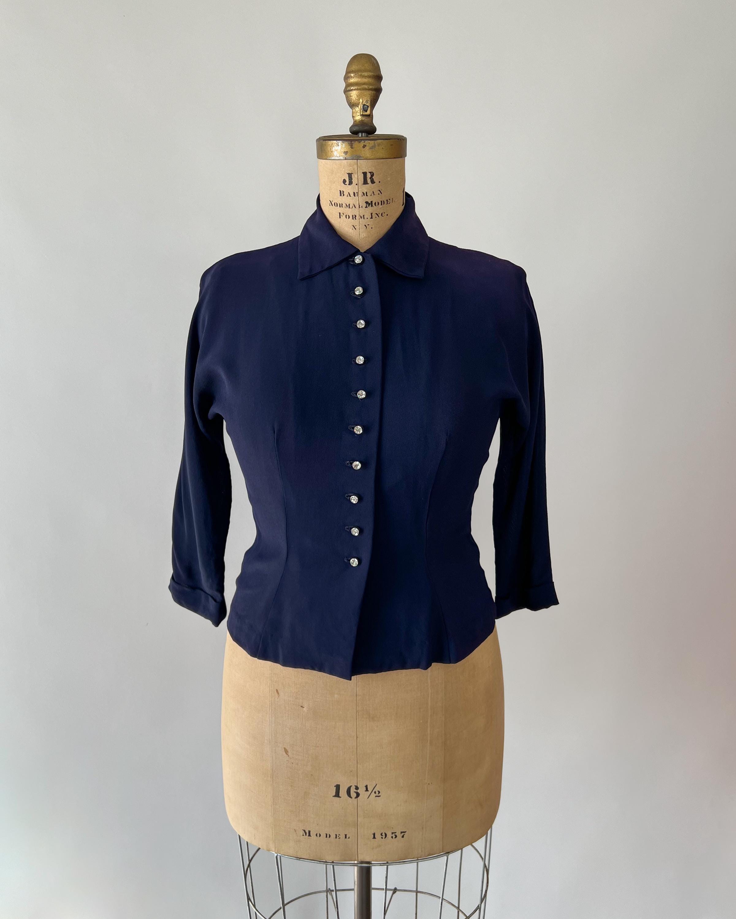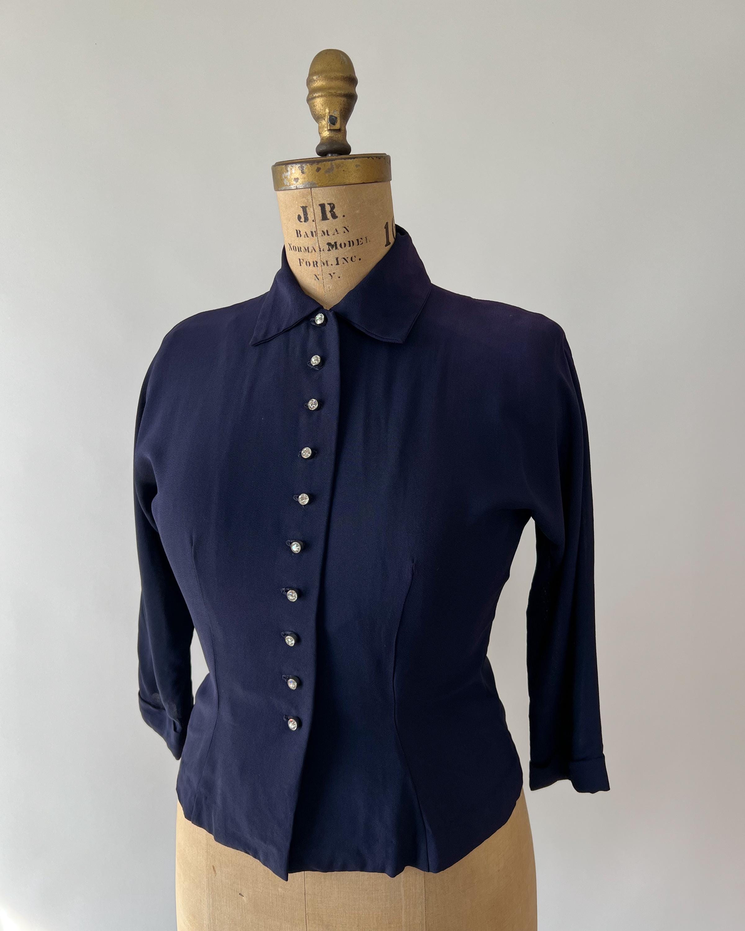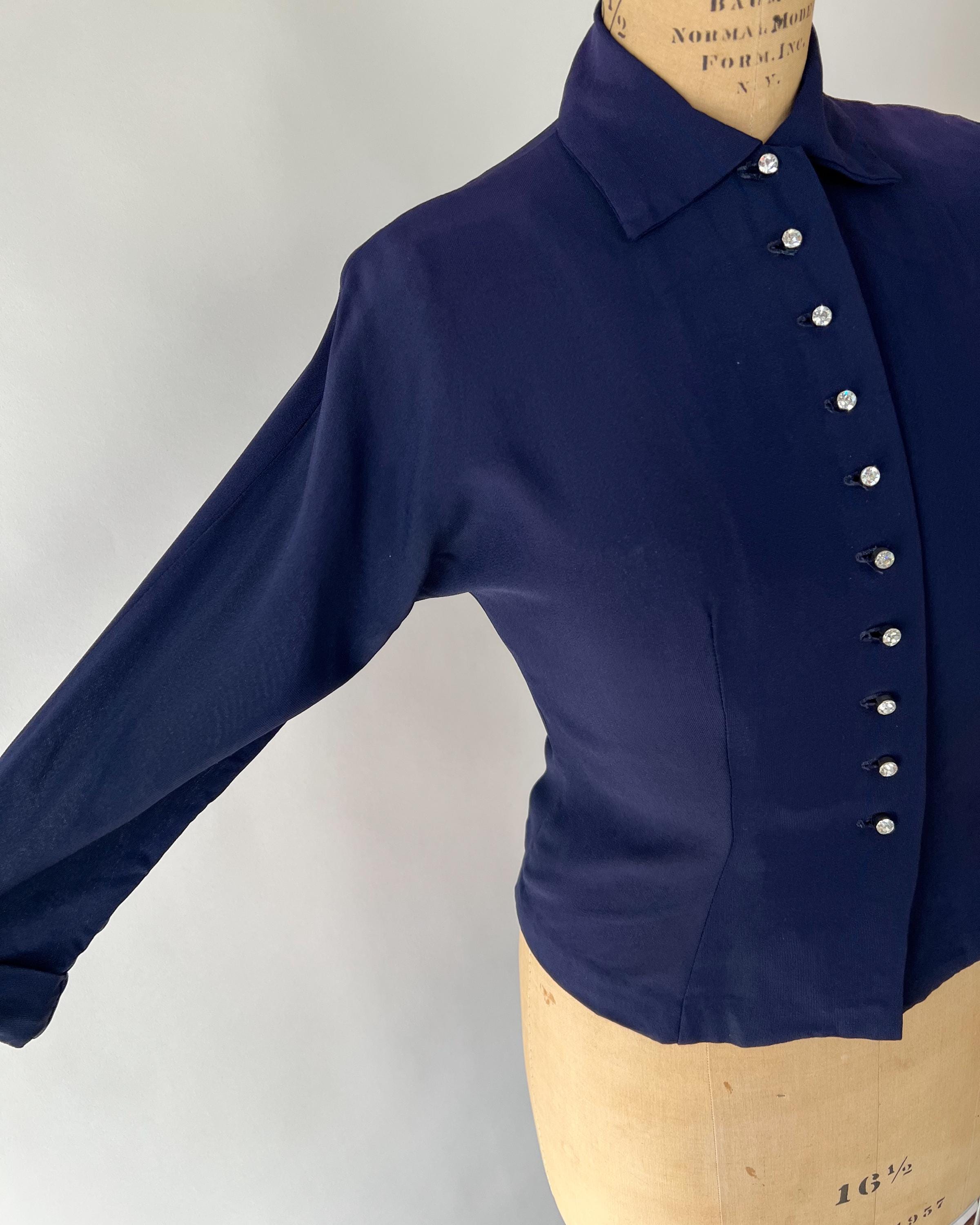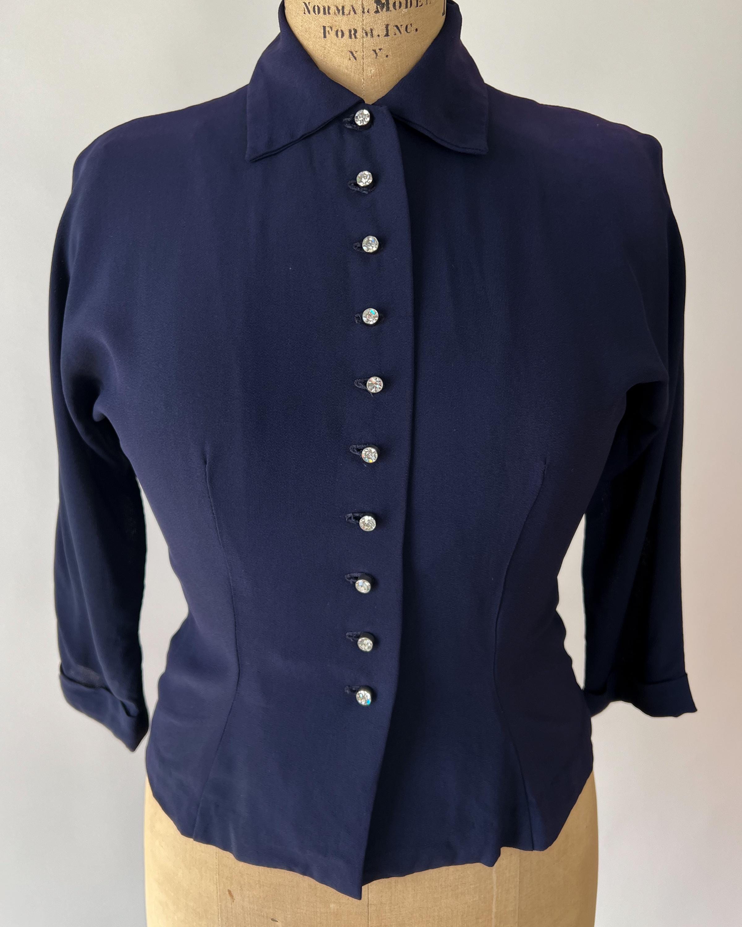 A beautiful 1950s navy rayon jacket! The tailored, fitted button up blouse/shirt has a sweet Peter Pan collar, lightly padded shoulders, 3/4 length cuffed sleeves, a flattering, darted, nipped waist. It features rhinestone buttons down the front. Unlined.