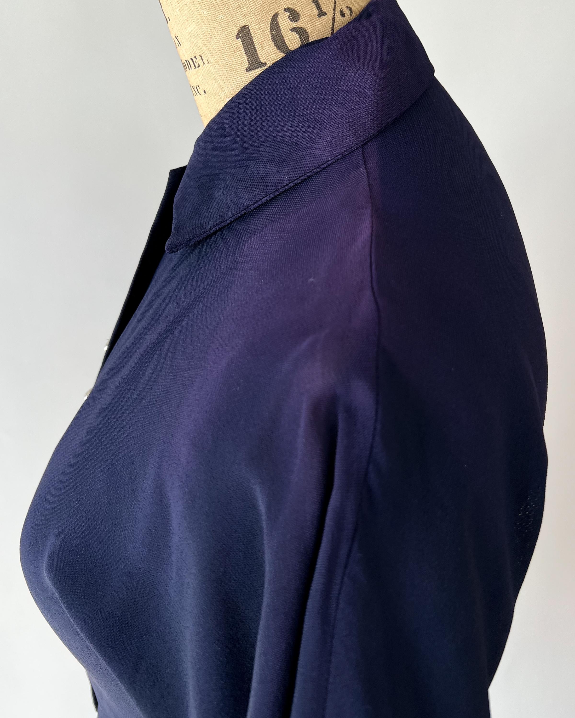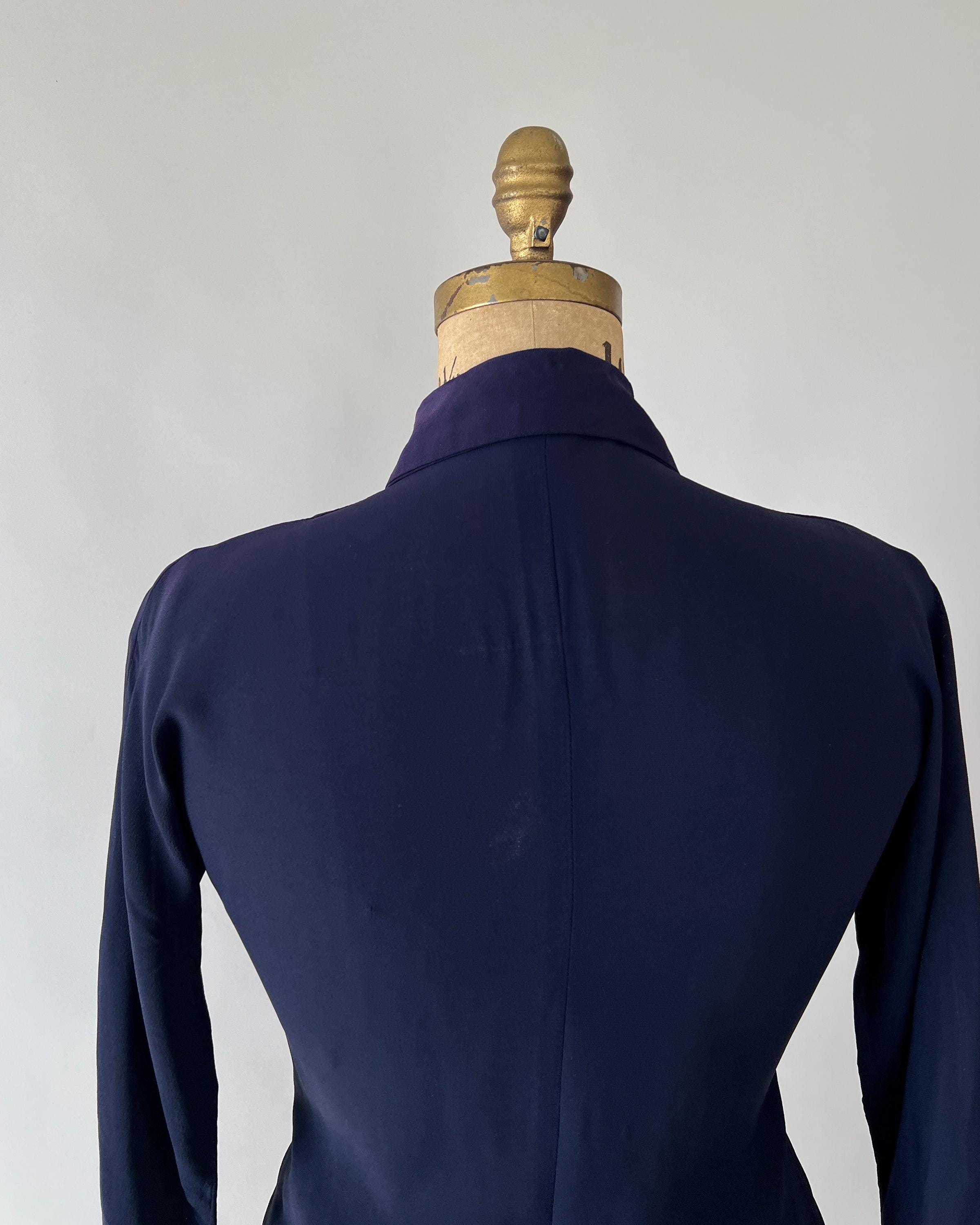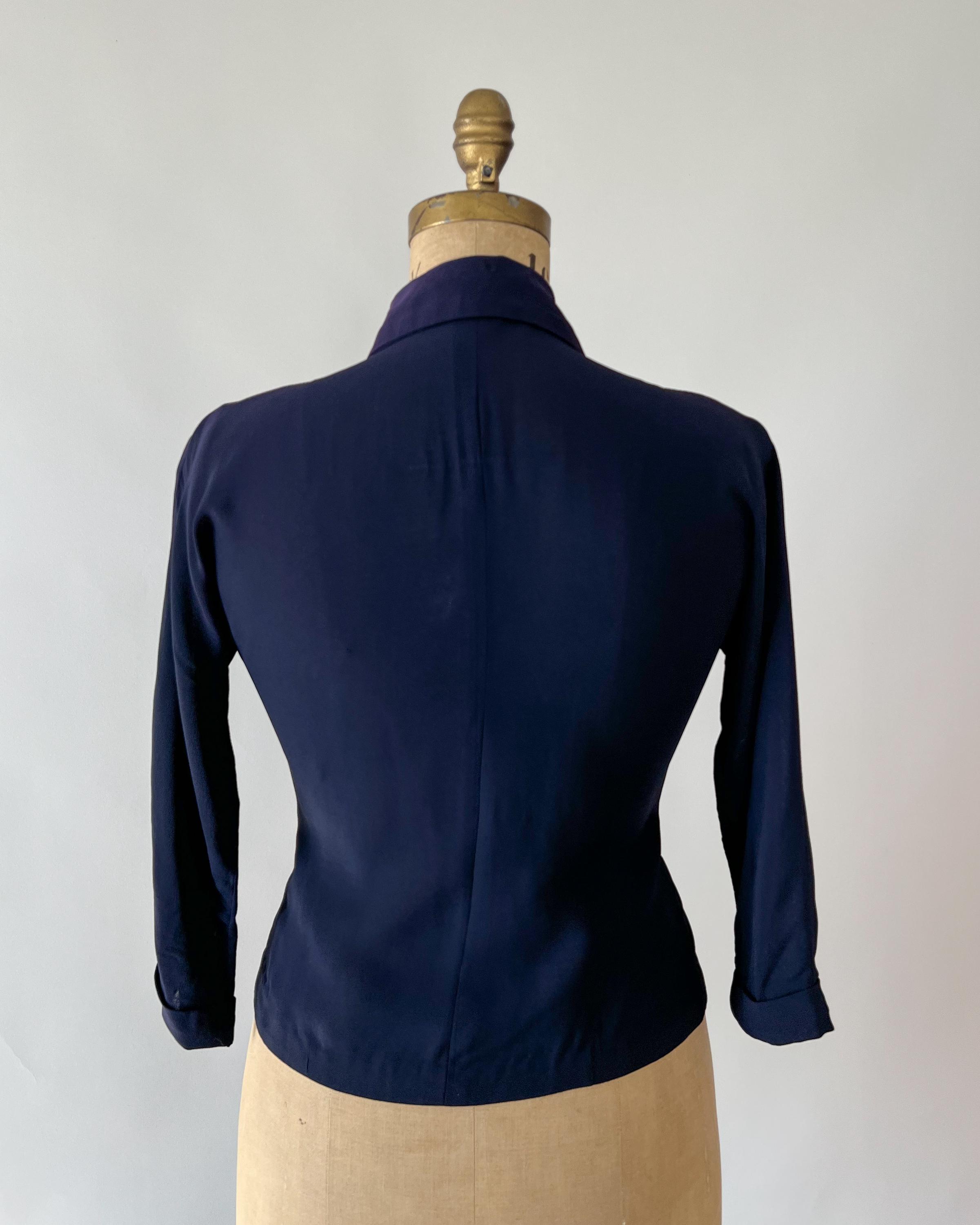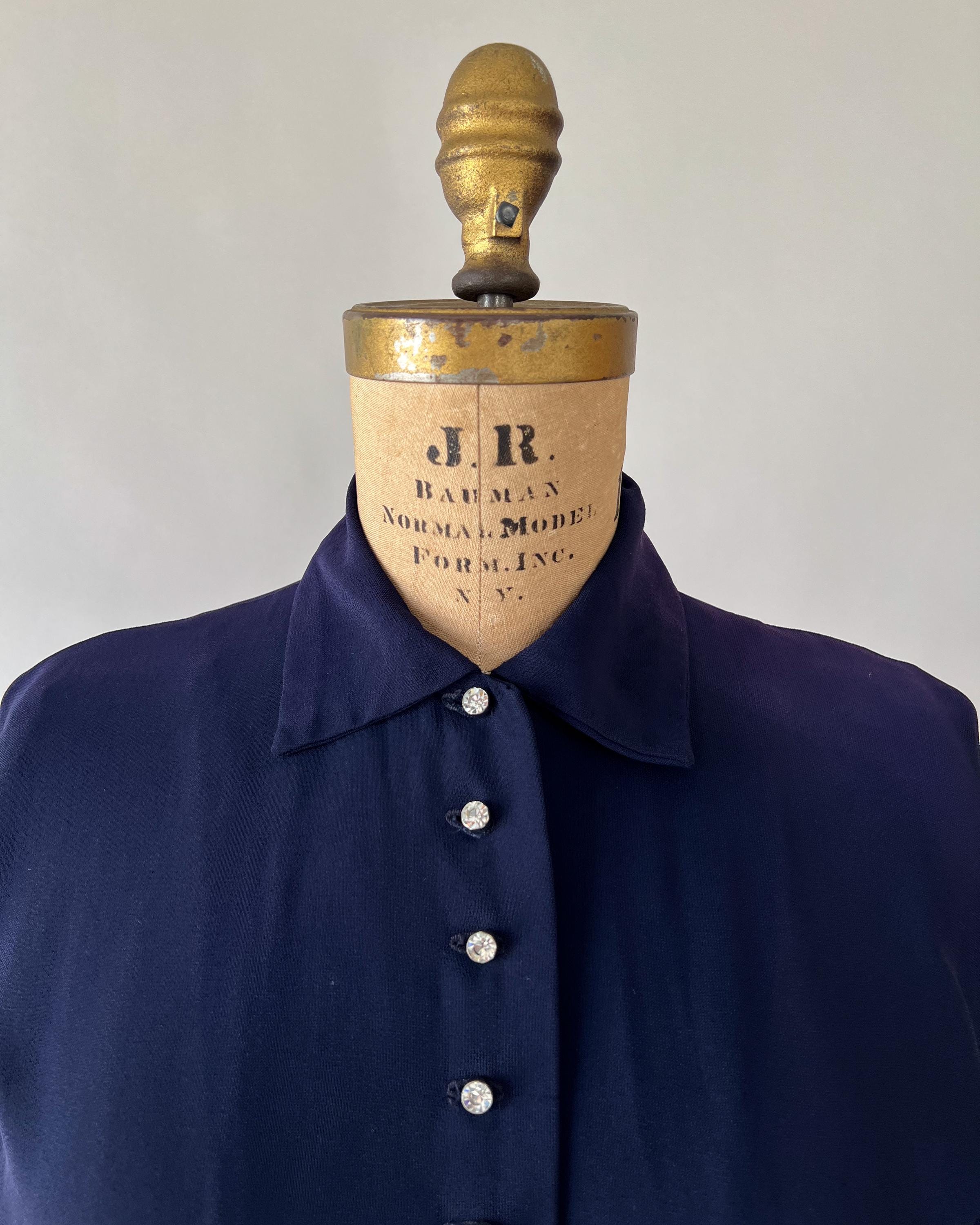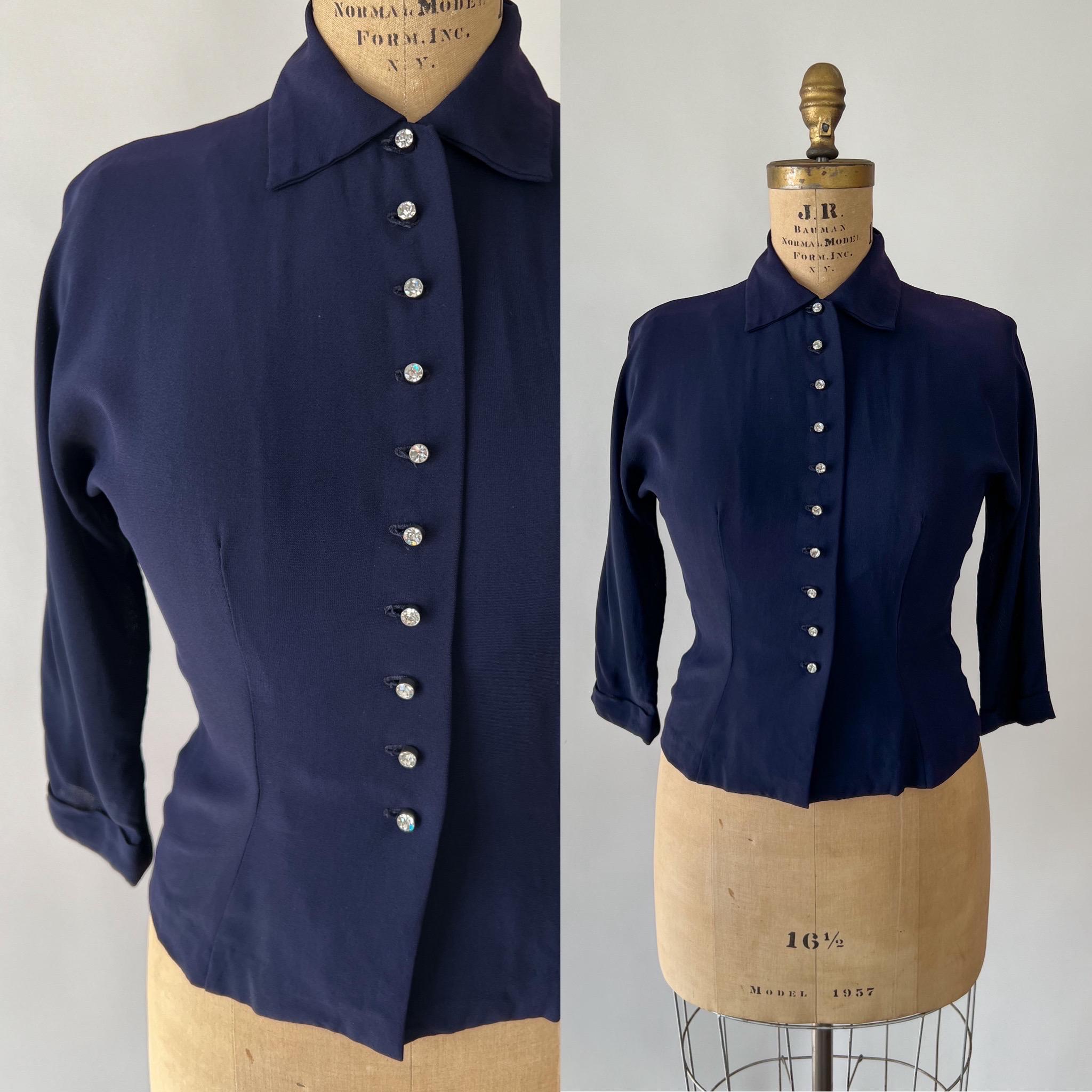 A beautiful 1950s navy rayon jacket! The tailored, fitted button up blouse/shirt has a sweet Peter Pan collar, lightly padded shoulders, 3/4 length cuffed sleeves, a flattering, darted, nipped waist. It features rhinestone buttons down the front. Unlined.