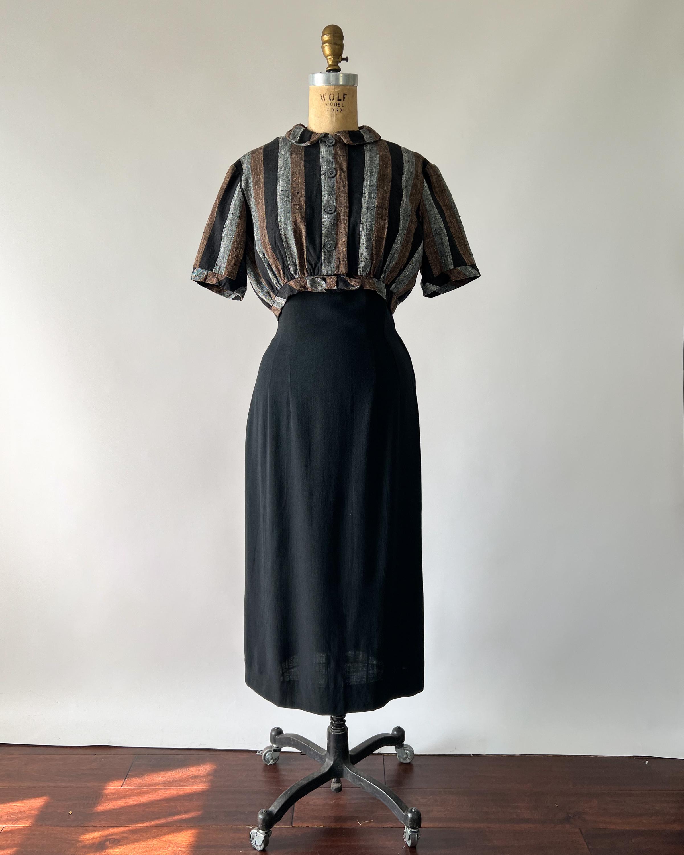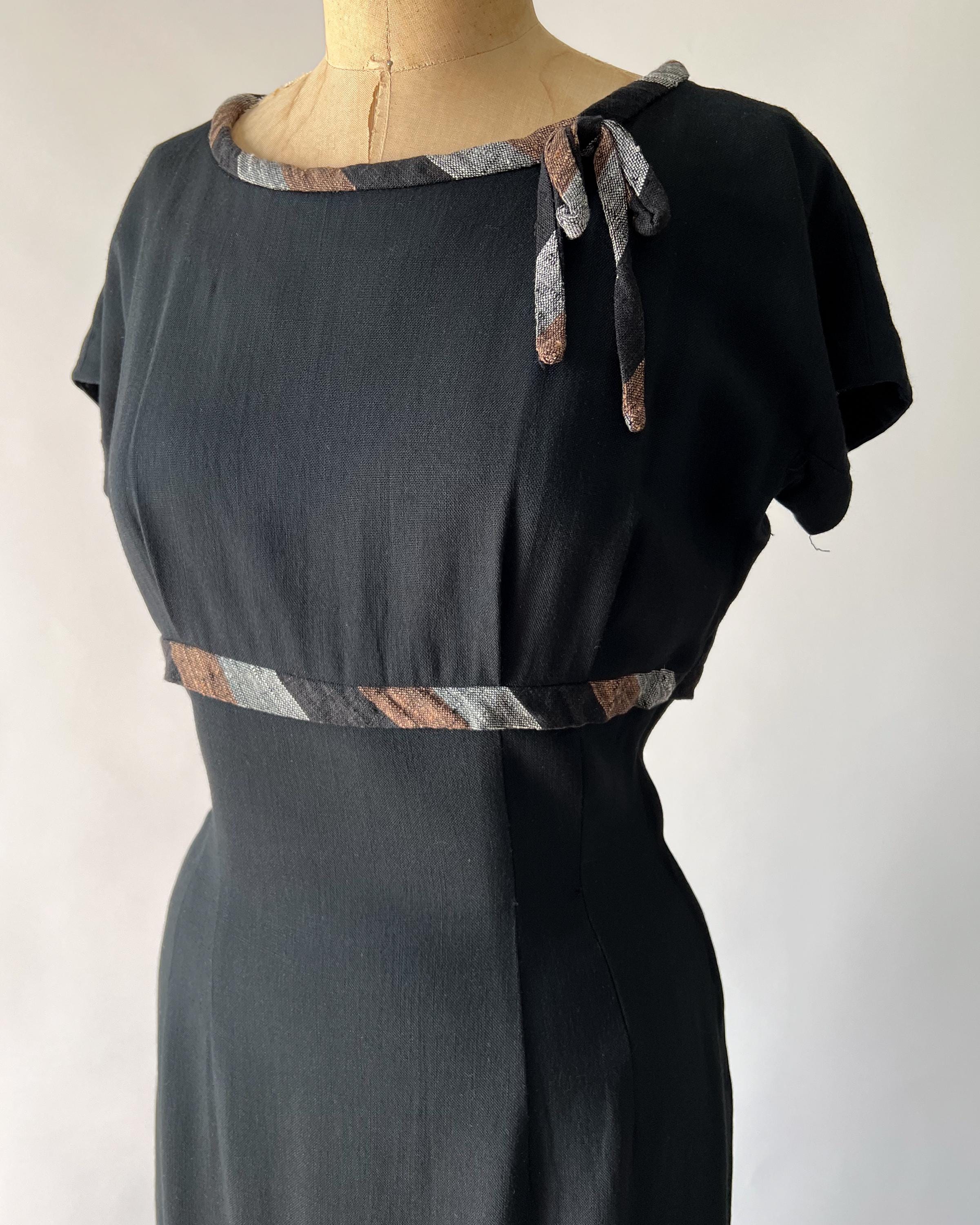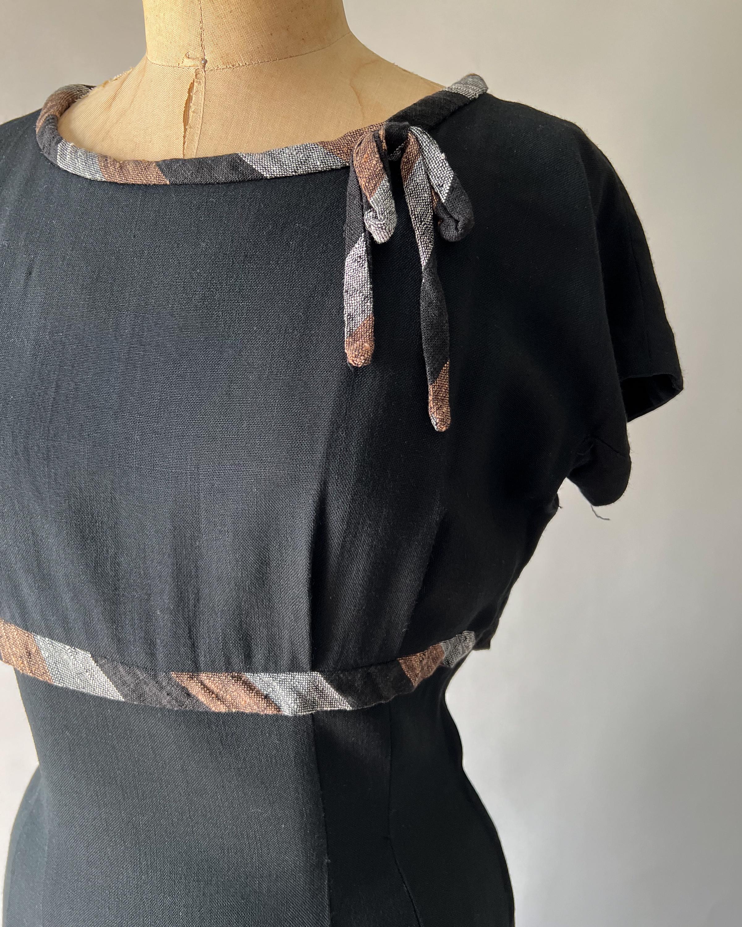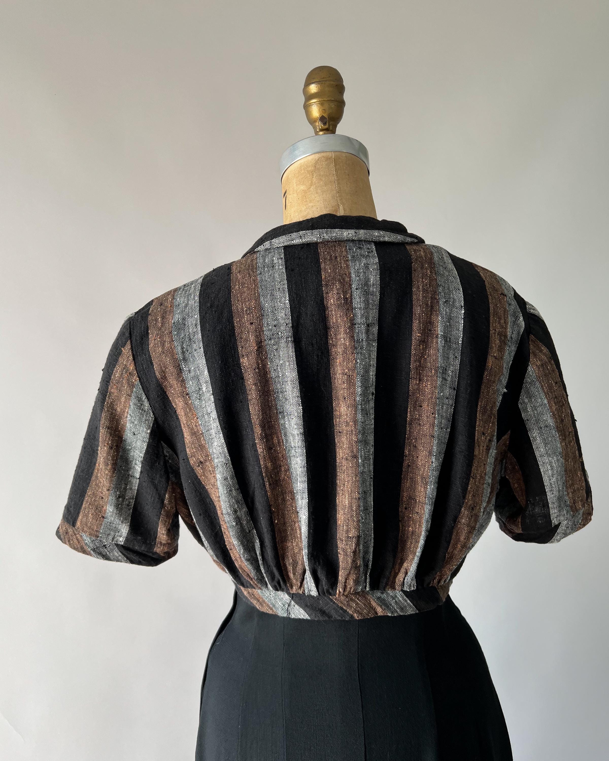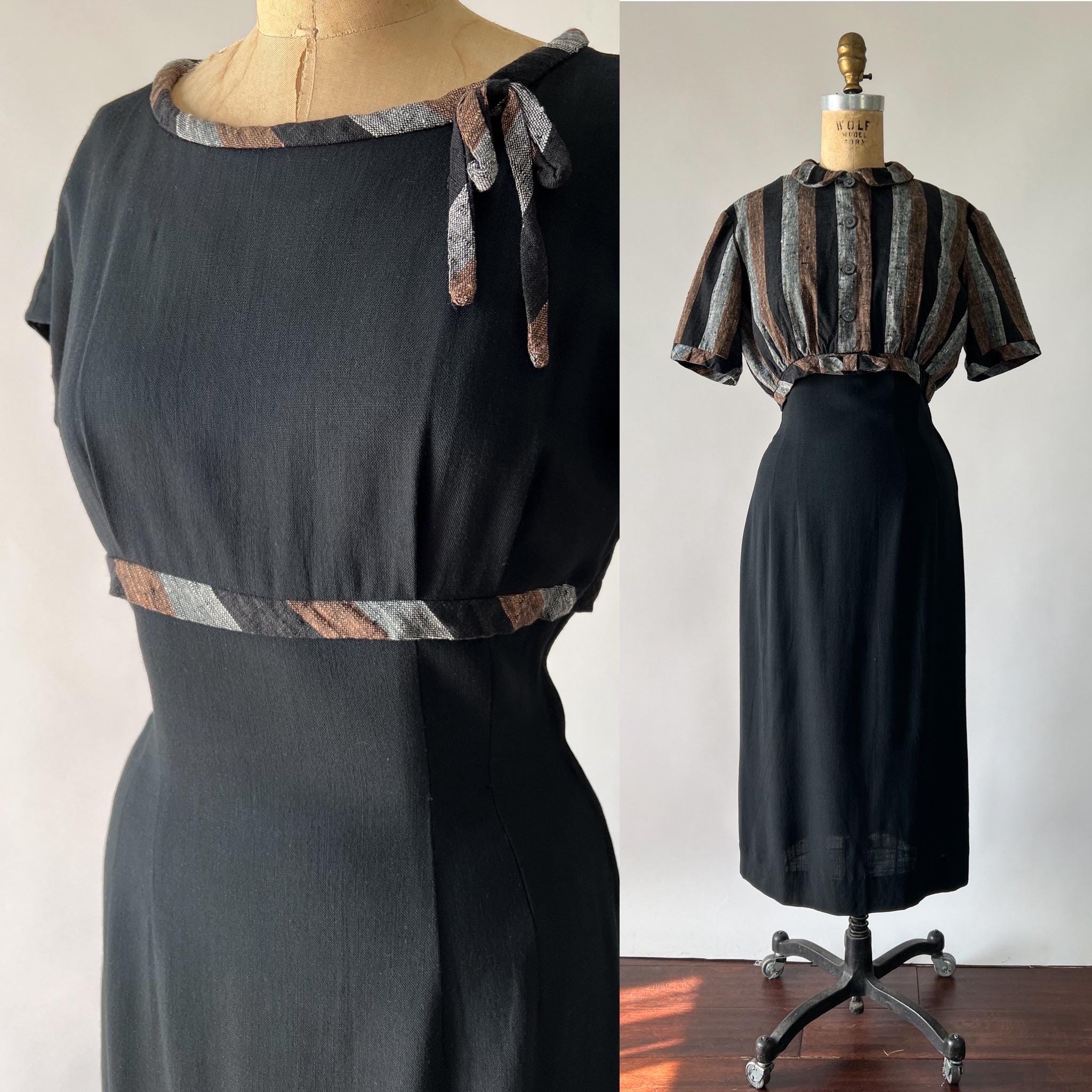 A chic 1950s dress and jacket set! This classic set includes a black linen like rayon sheath dress with flattering princess seaming, short sleeves, a scoop neckline, and a slim, midi length pencil skirt. It features contrasting black, brown, and gray striped trim defining the empire waistline and edging the neckline (and tying in a jaunty bow at one side). Side metal zipper closure. The bolero / cropped jacket is done in matching striped fabric and features a cute peter pan collar, front buttons, and a front bow at the front waistline.