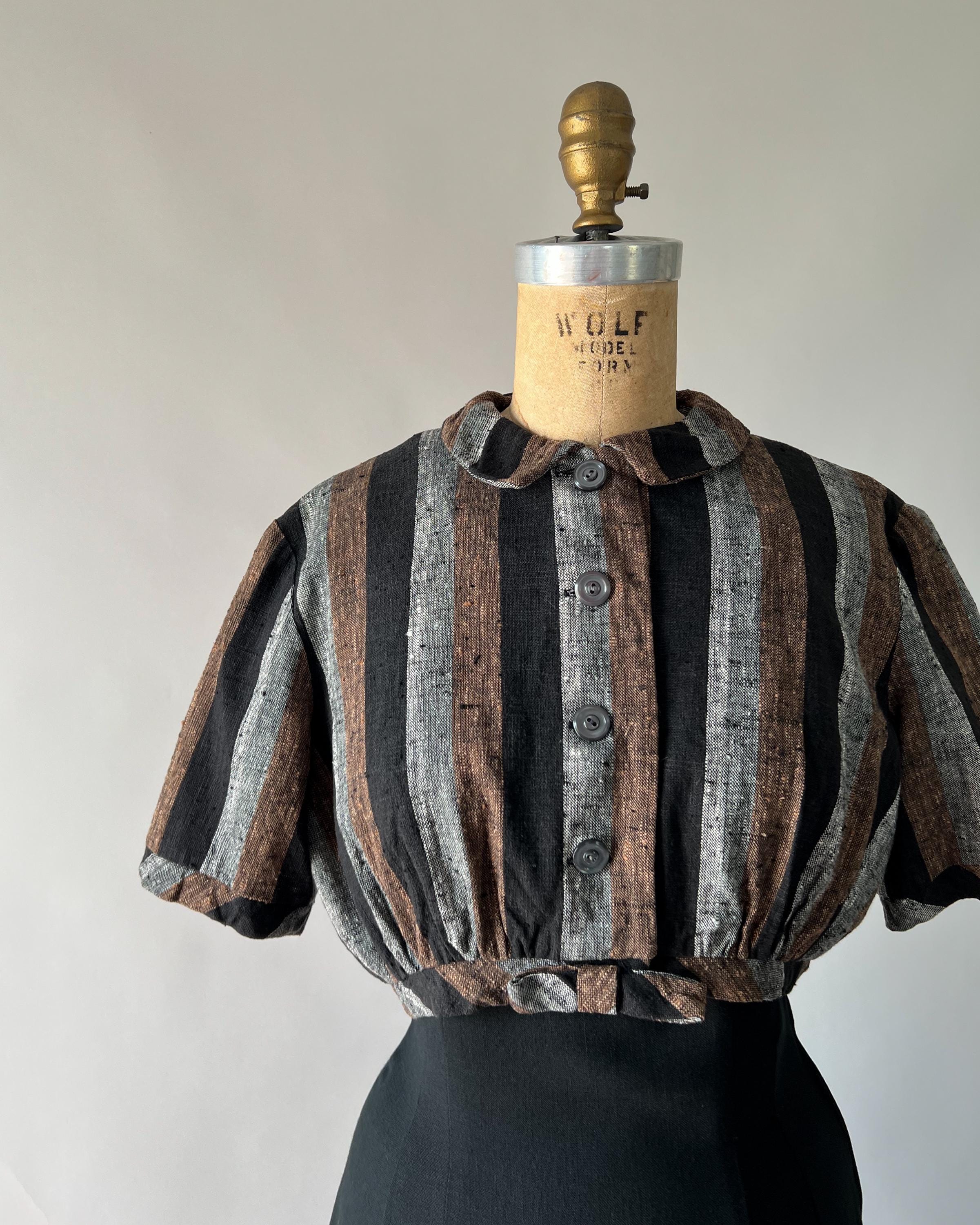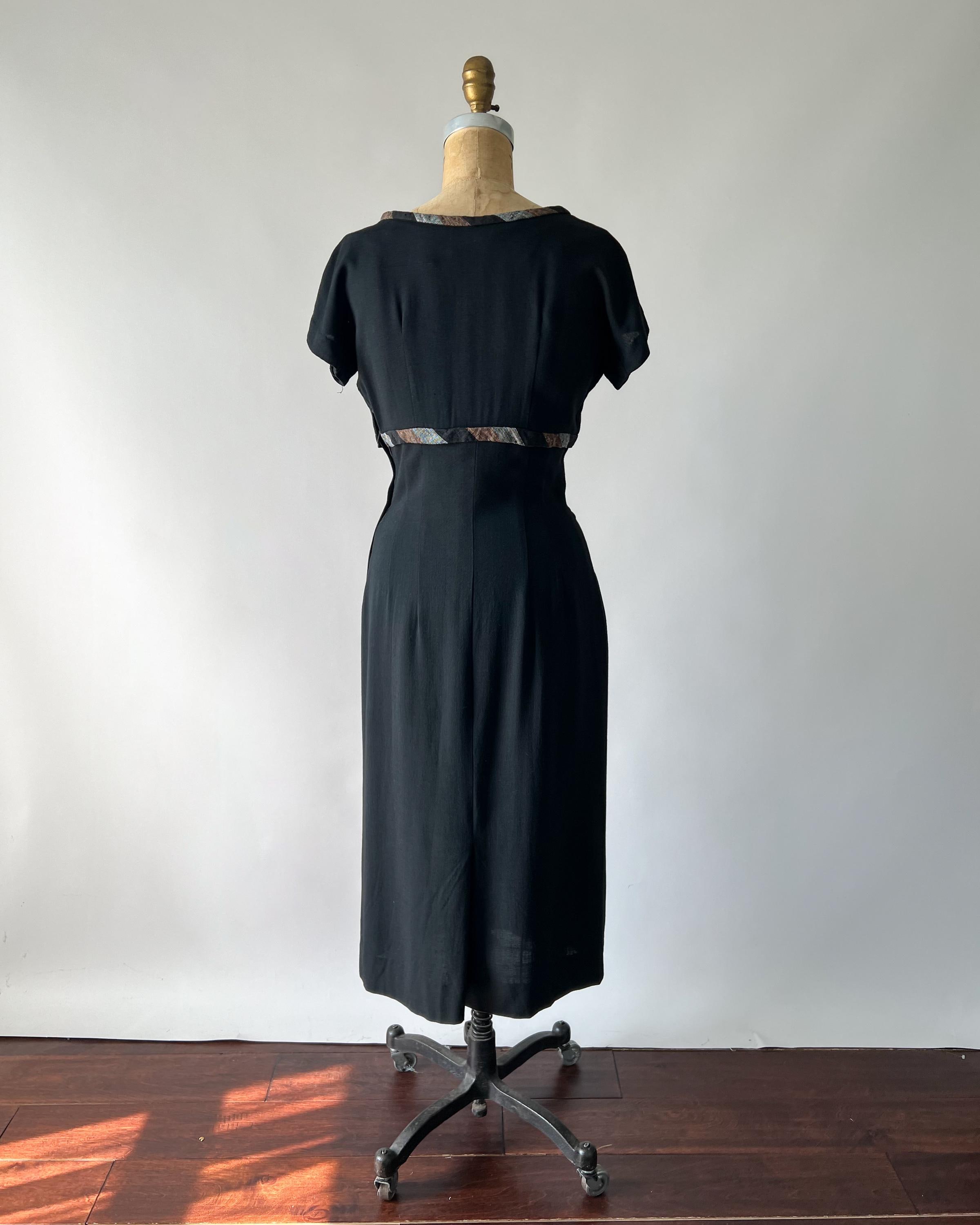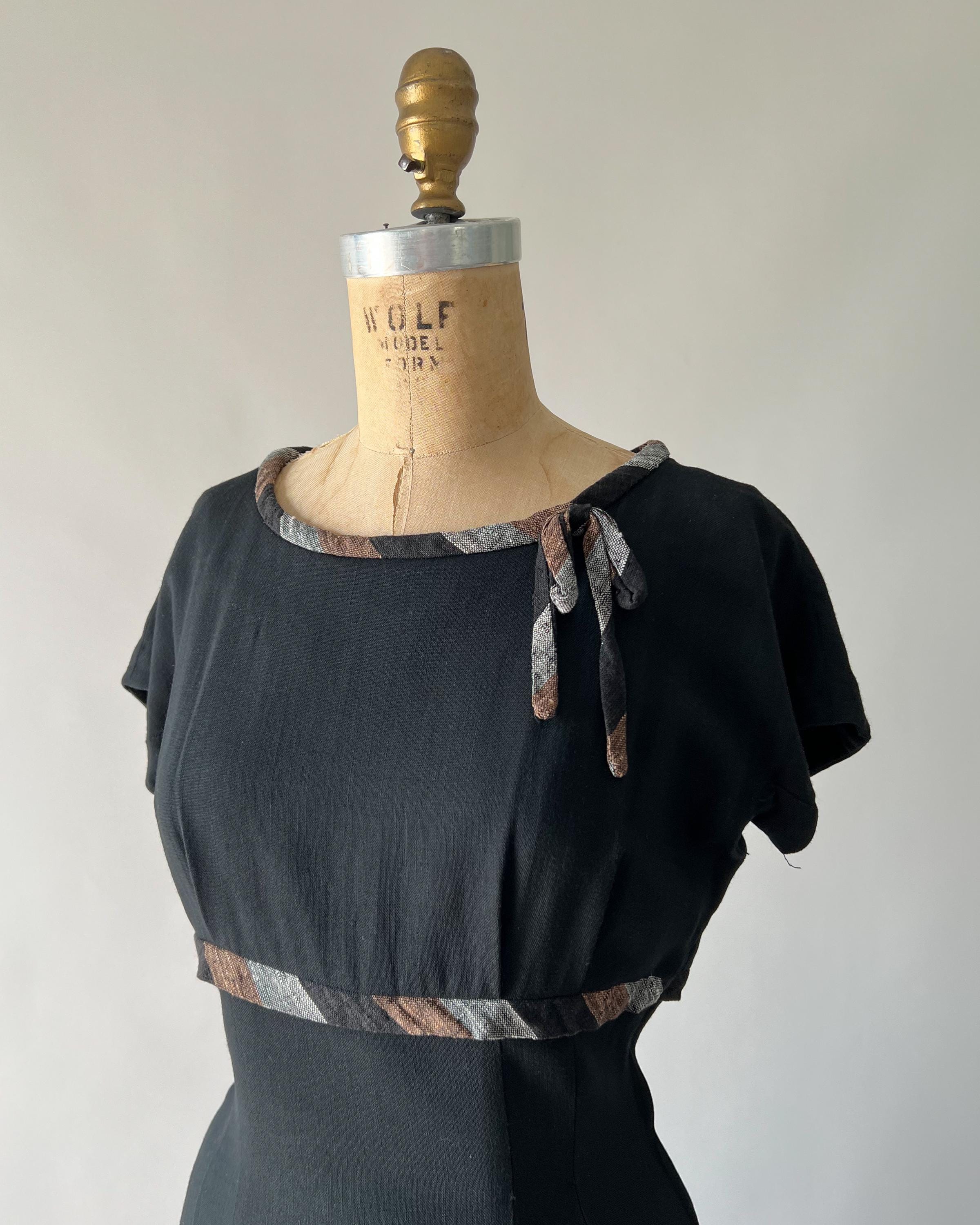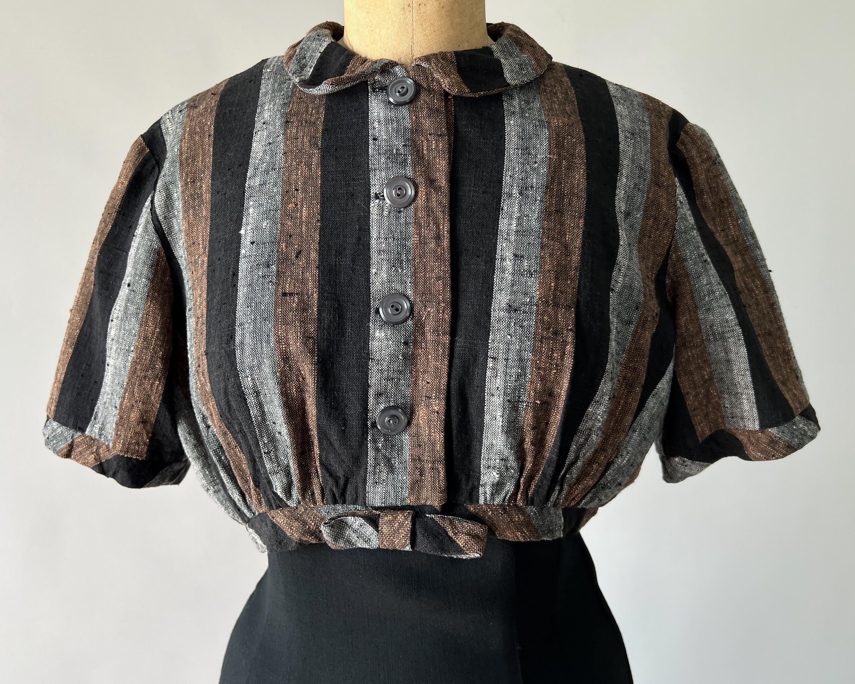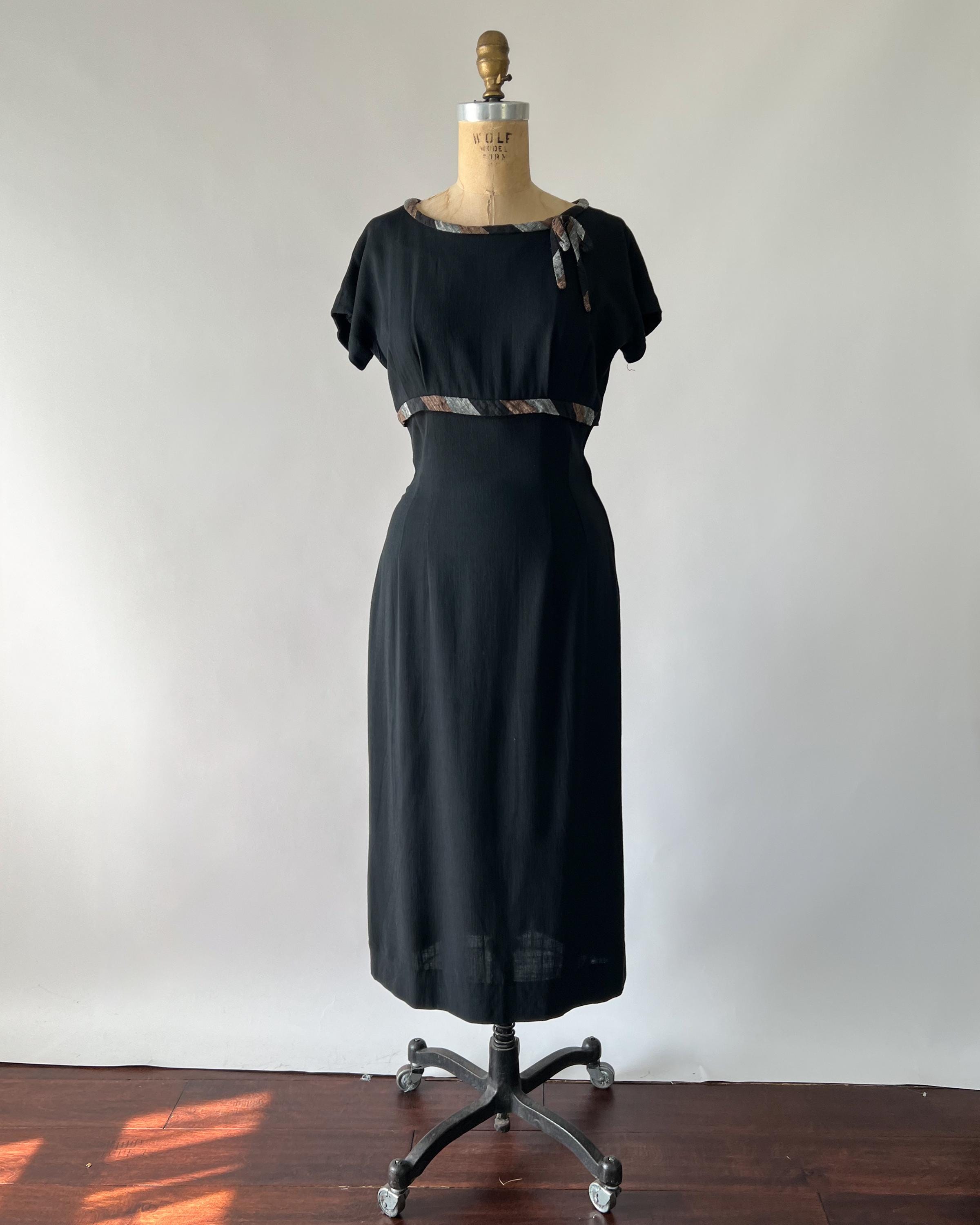 A chic 1950s dress and jacket set! This classic set includes a black linen like rayon sheath dress with flattering princess seaming, short sleeves, a scoop neckline, and a slim, midi length pencil skirt. It features contrasting black, brown, and gray striped trim defining the empire waistline and edging the neckline (and tying in a jaunty bow at one side). Side metal zipper closure. The bolero / cropped jacket is done in matching striped fabric and features a cute peter pan collar, front buttons, and a front bow at the front waistline.