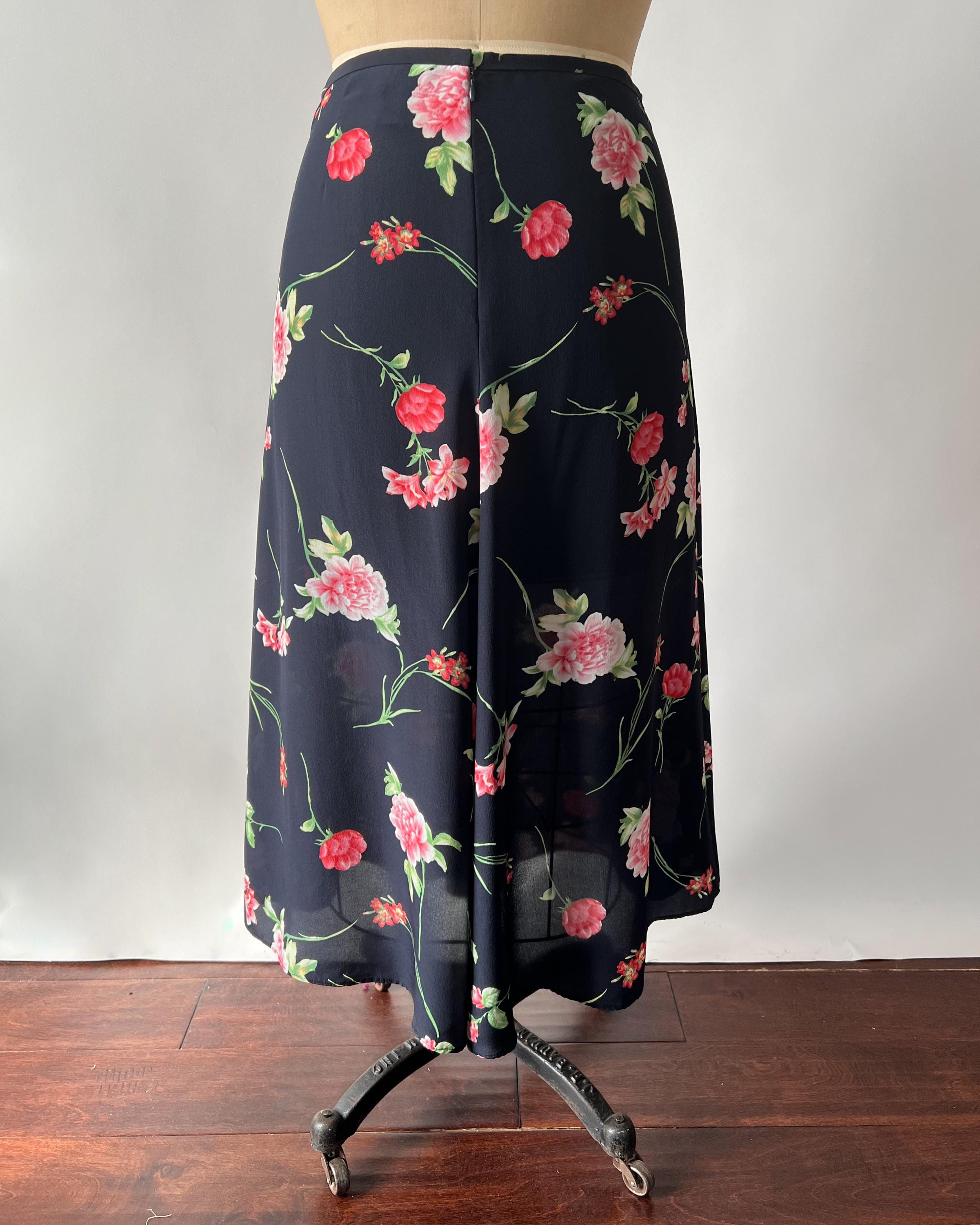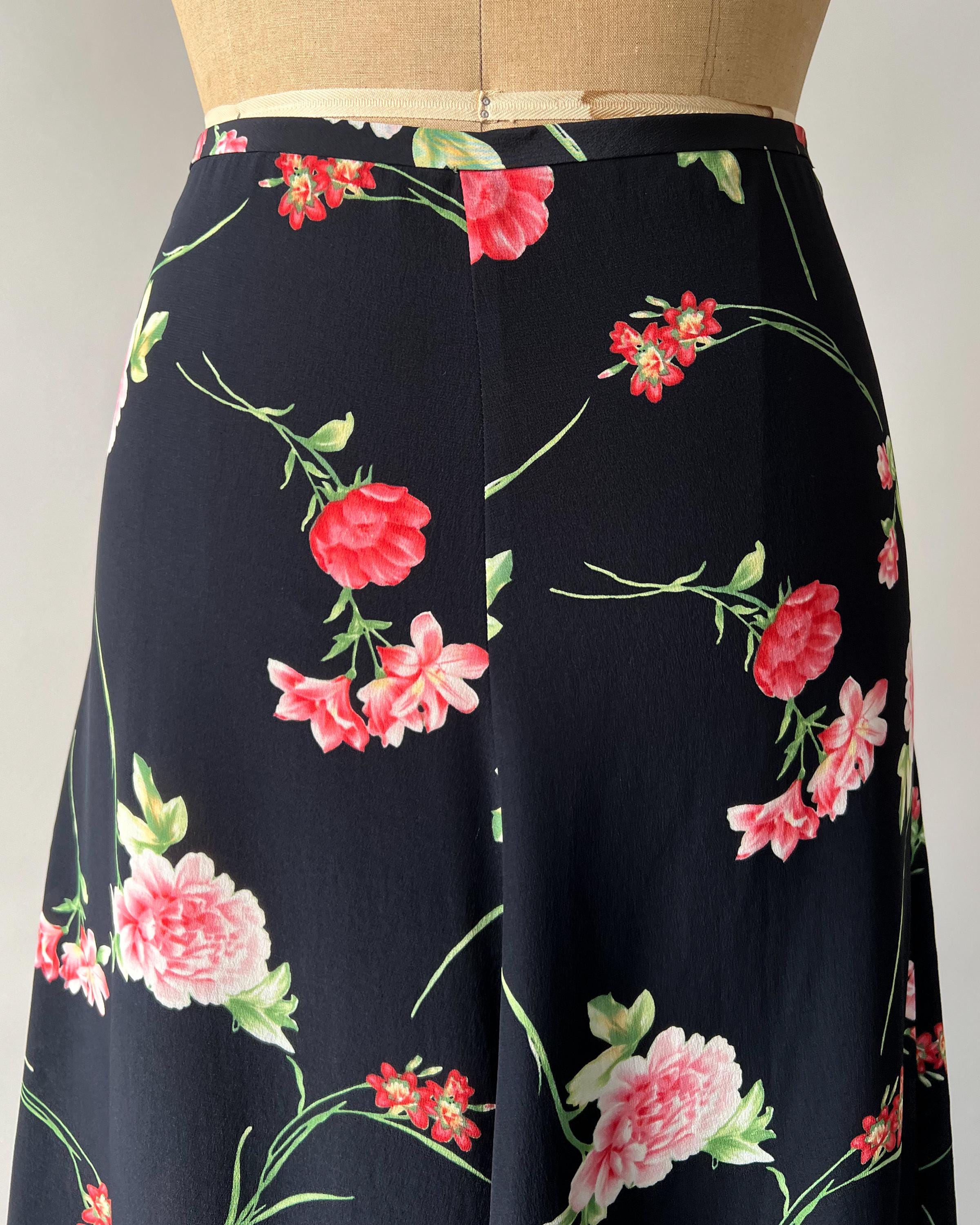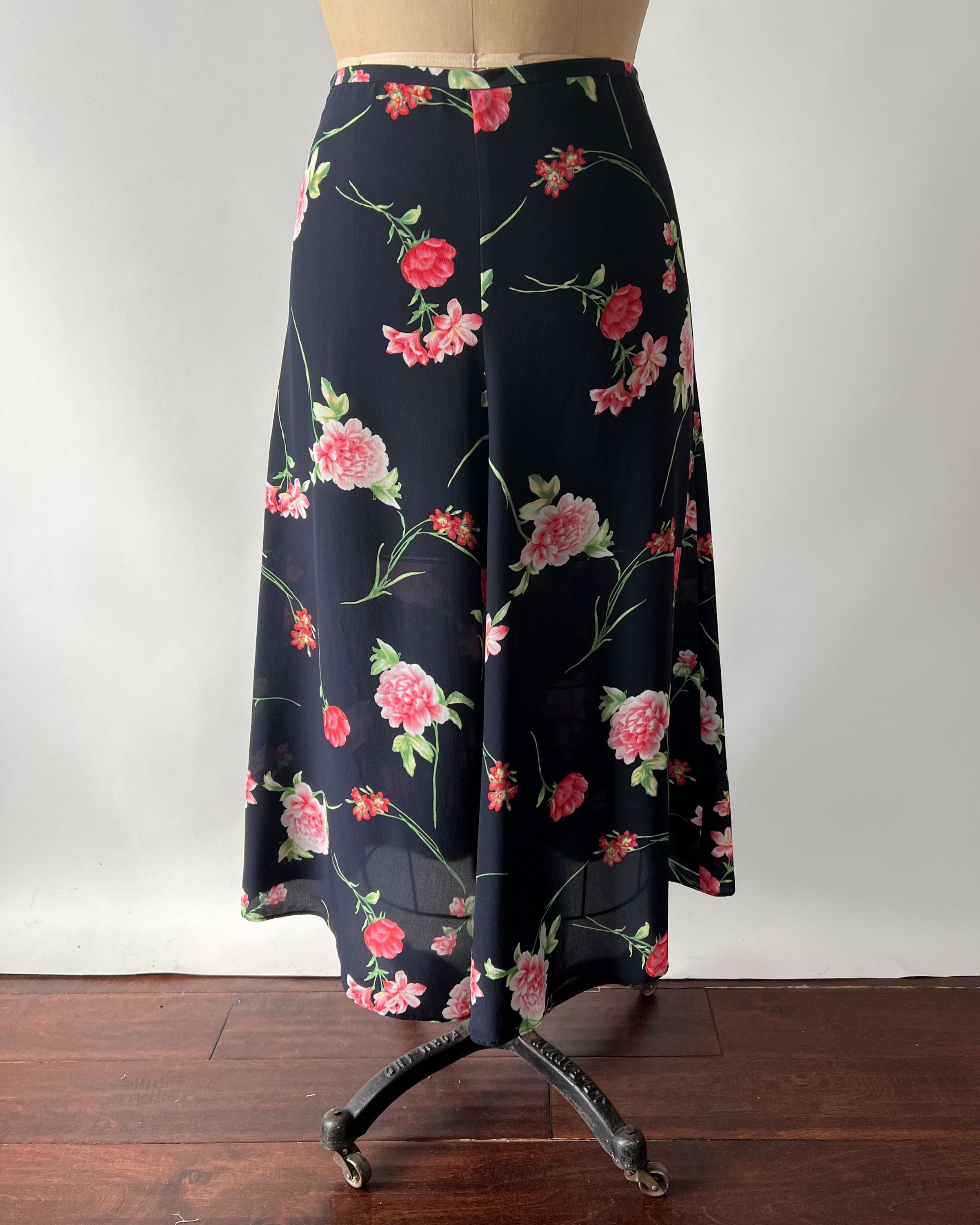 An absolutely gorgeous floral silk midi skirt from the 1990s! The skirt is made from a lightweight navy silk printed with beautiful pink roses. The high waisted, paneled skirt has an a-line silhouette and a side zipper/hook and eye closure. Such a beautiful, high-quality, skirt that feels so soft and luxurious!