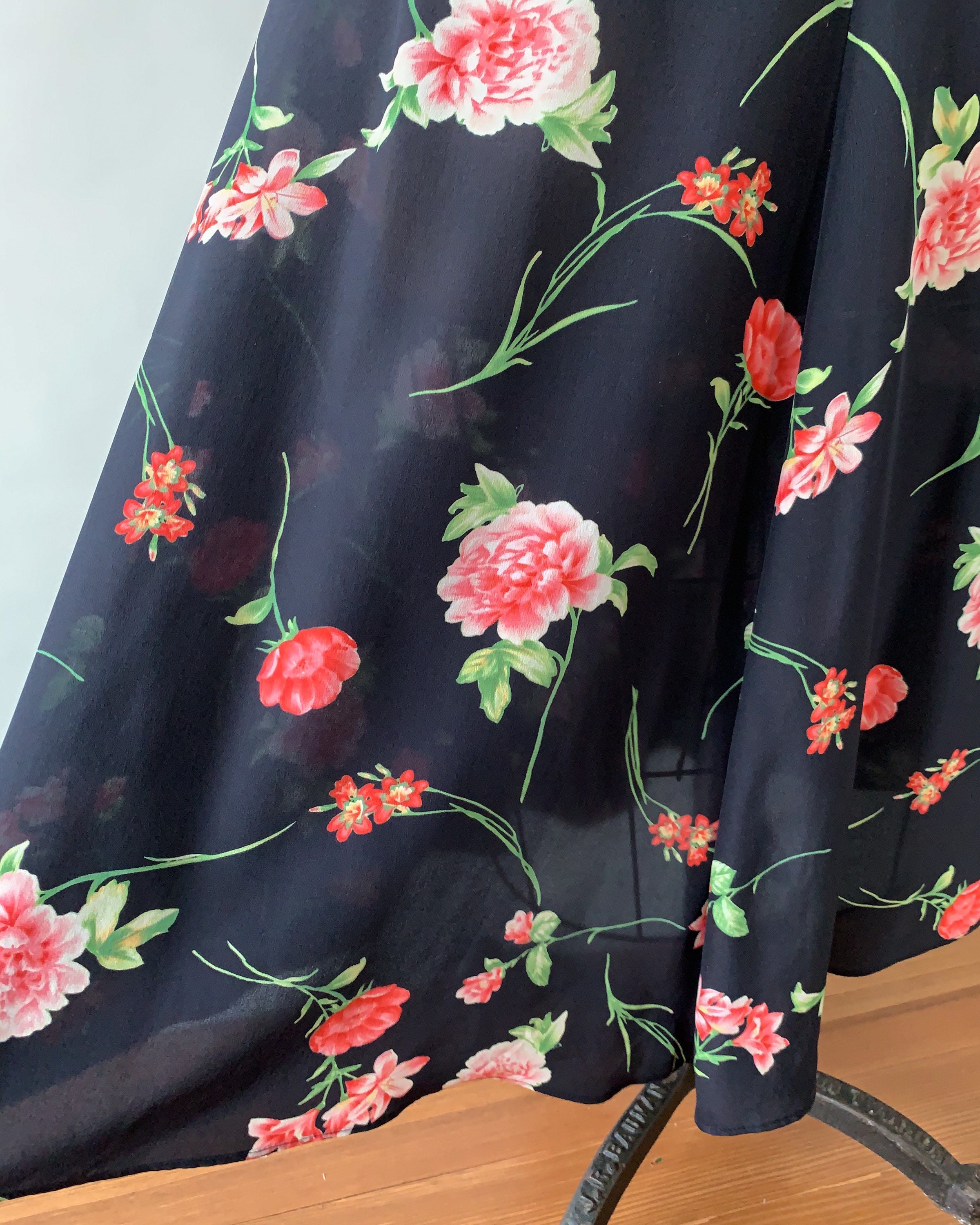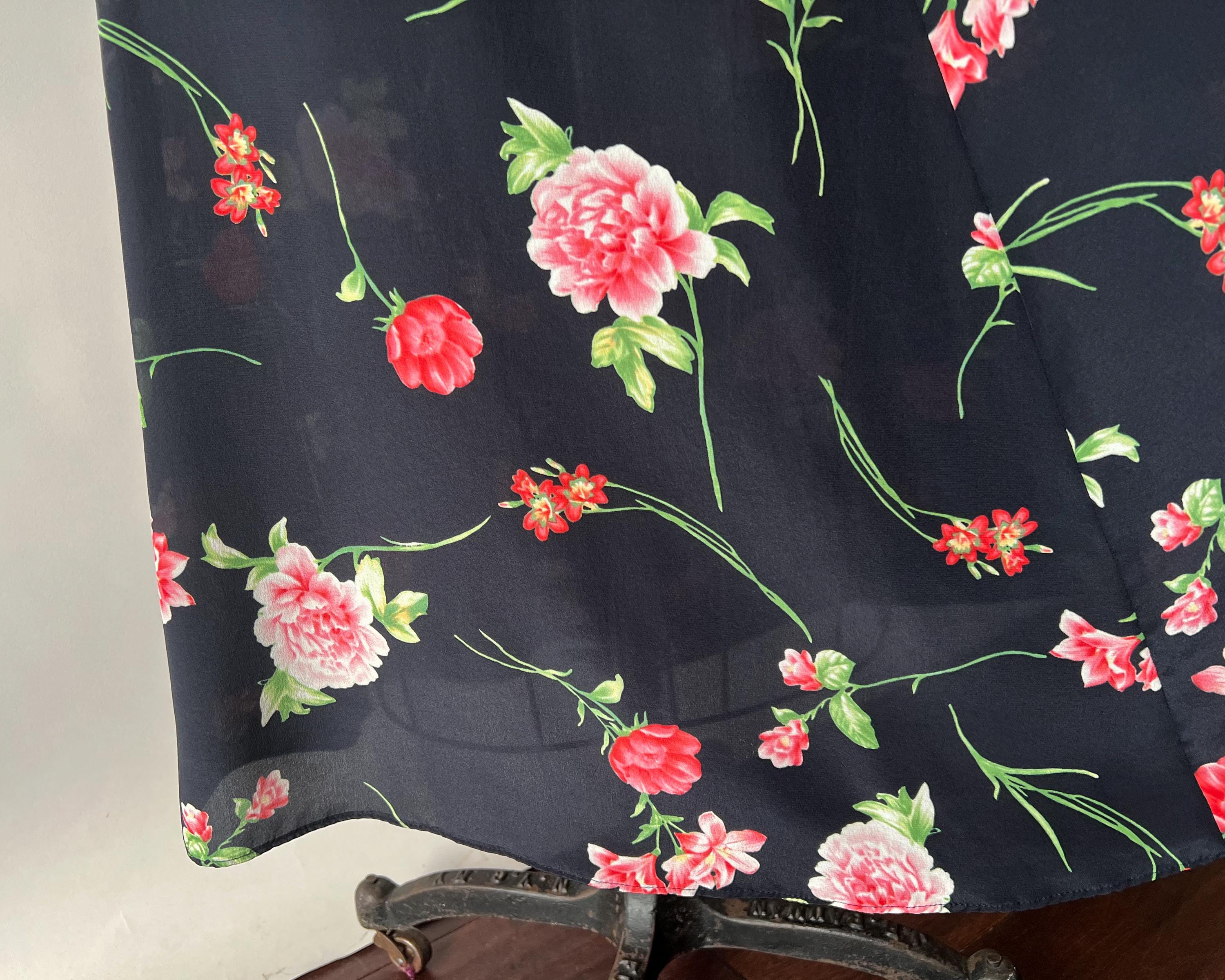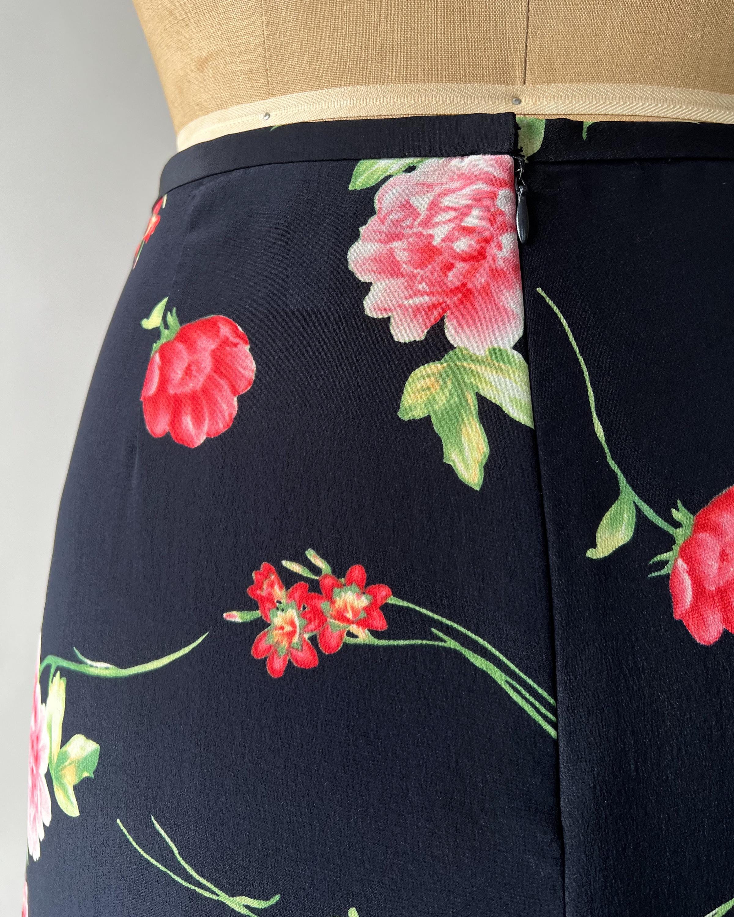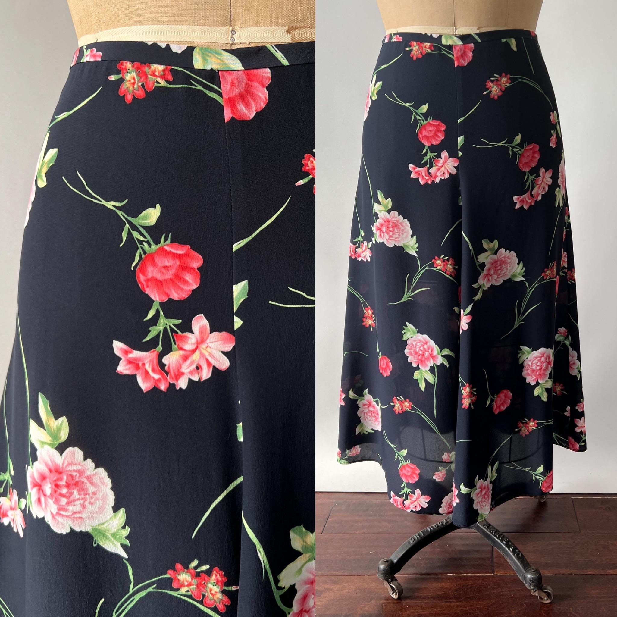 An absolutely gorgeous floral silk midi skirt from the 1990s! The skirt is made from a lightweight navy silk printed with beautiful pink roses. The high waisted, paneled skirt has an a-line silhouette and a side zipper/hook and eye closure. Such a beautiful, high-quality, skirt that feels so soft and luxurious!