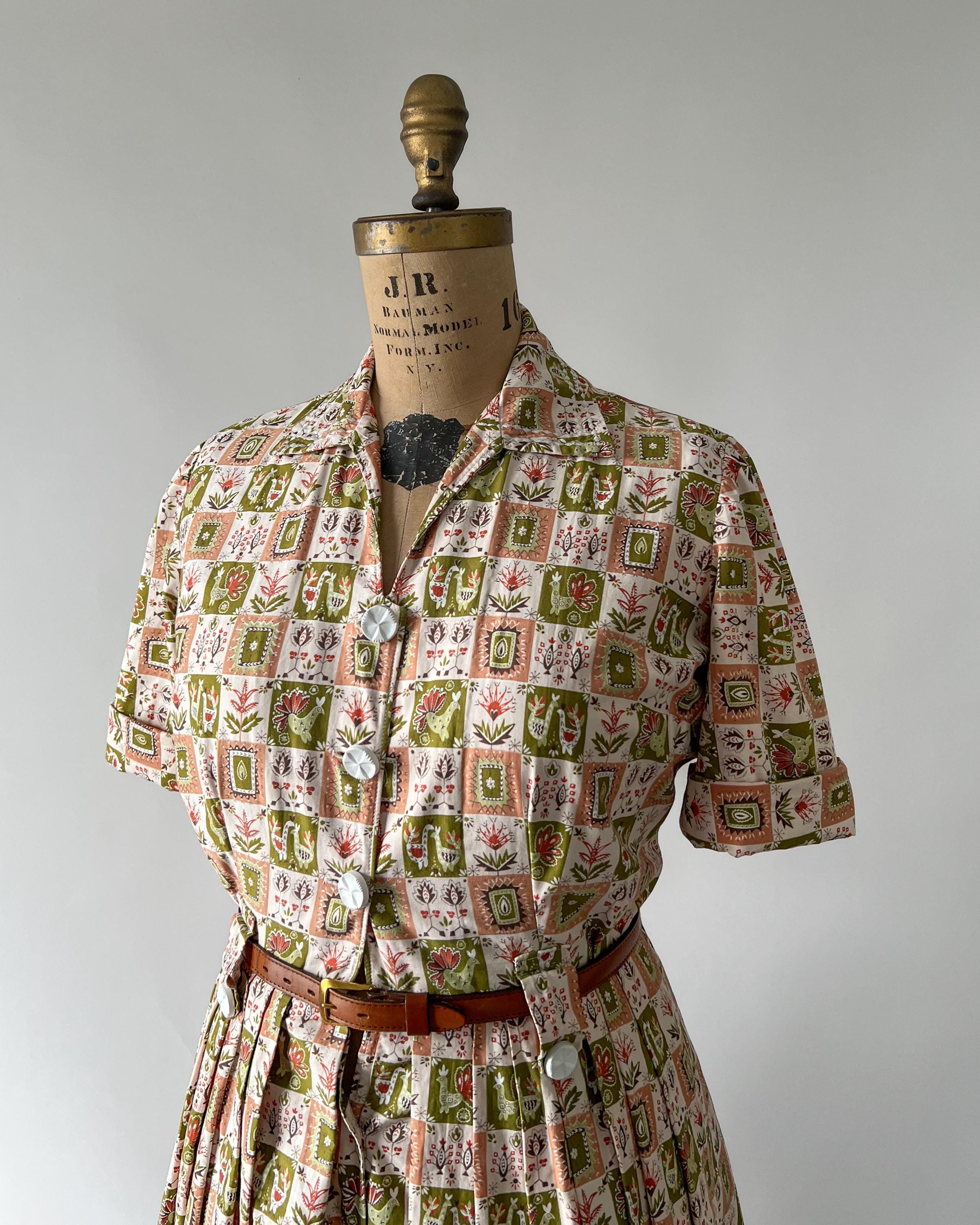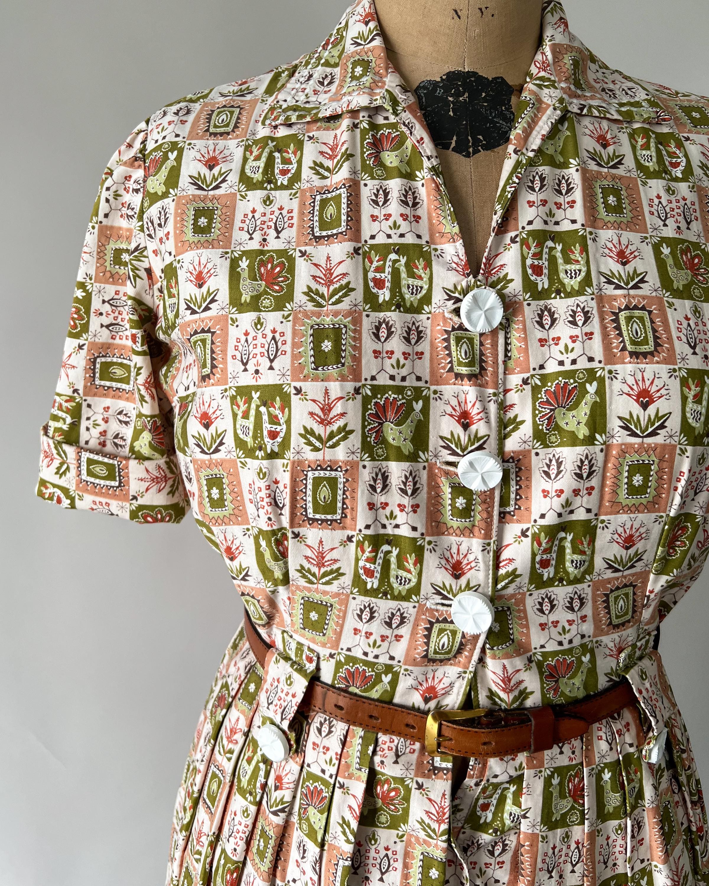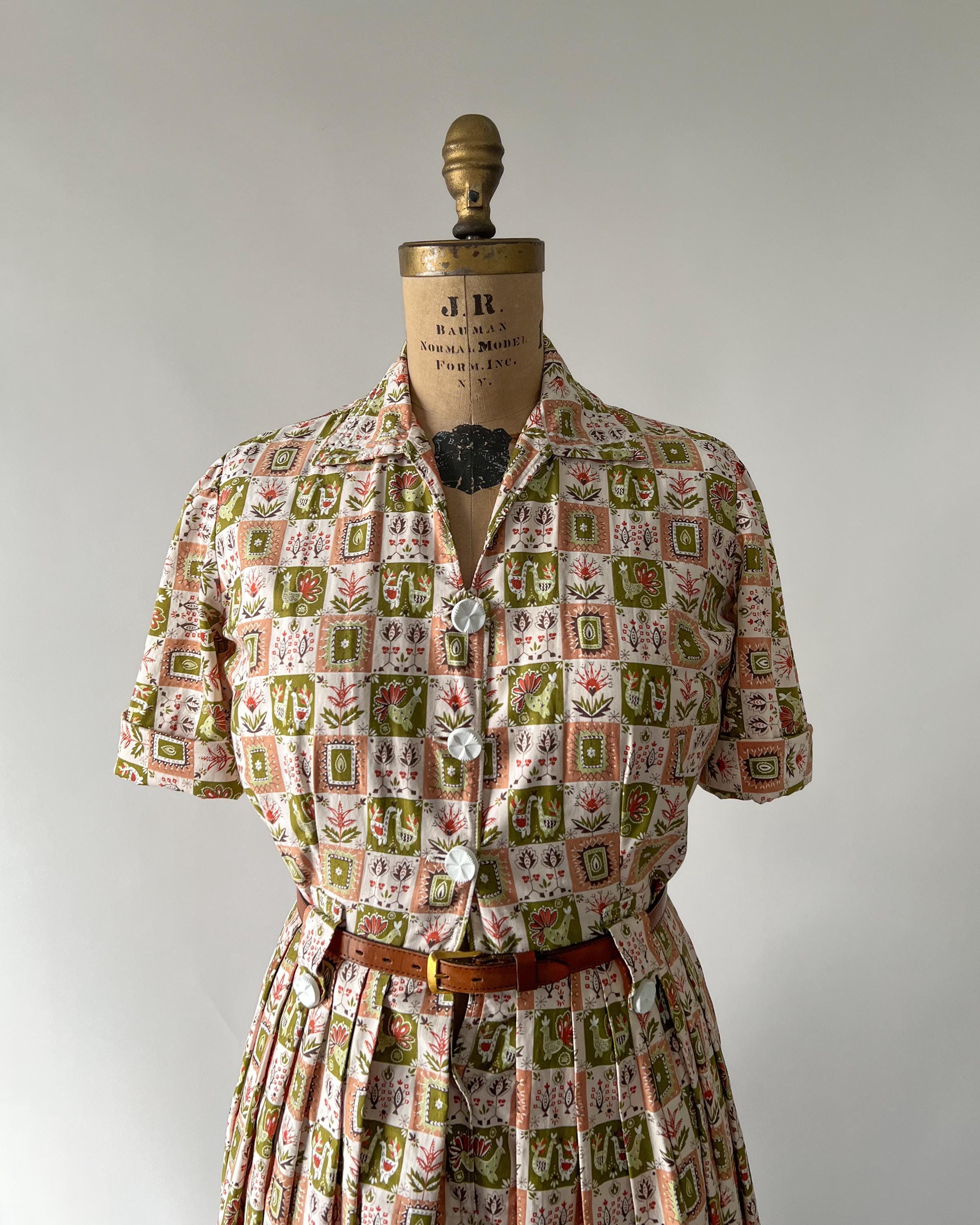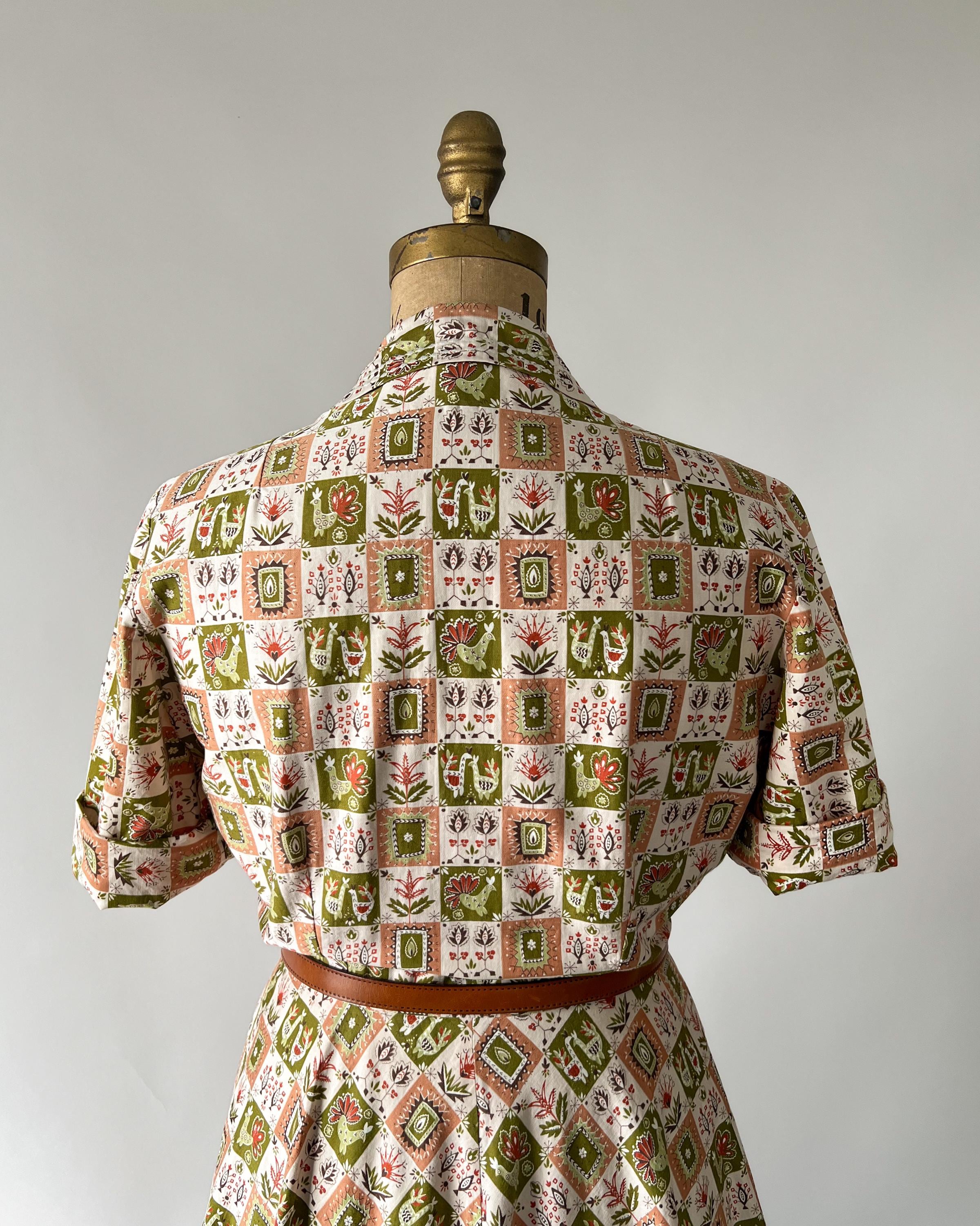 A cute, classic 1950s or early 1960s shirtdress. Made from “Chalet Swiss” Waverly bonded fabric with a quirky folk style rooster print, the collared dress has short cuffed sleeves, a nipped waist with belt loops, and a midi length shirt pleated skirt. It features white plastic buttons down the front of the bodice and decorating the front belt loops.