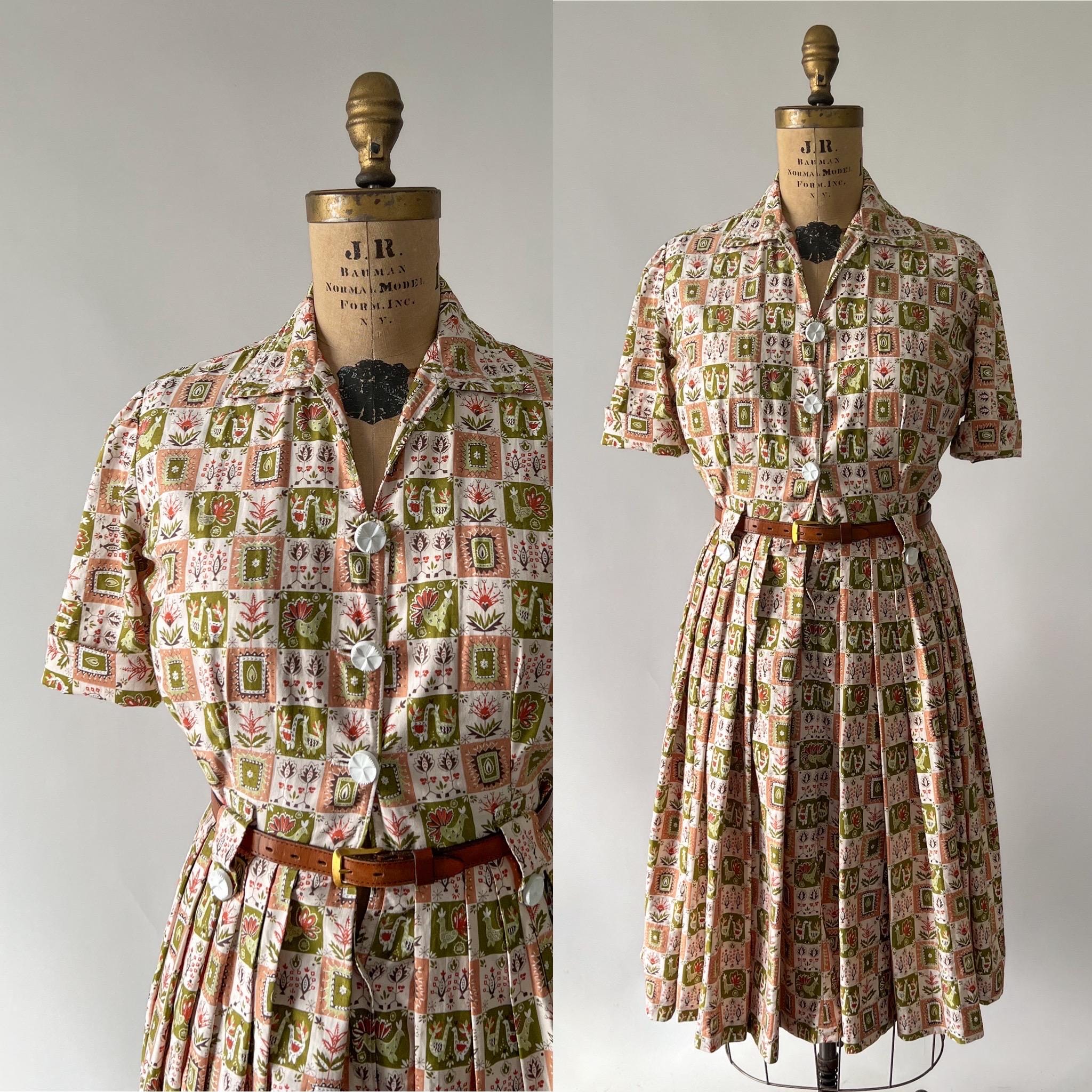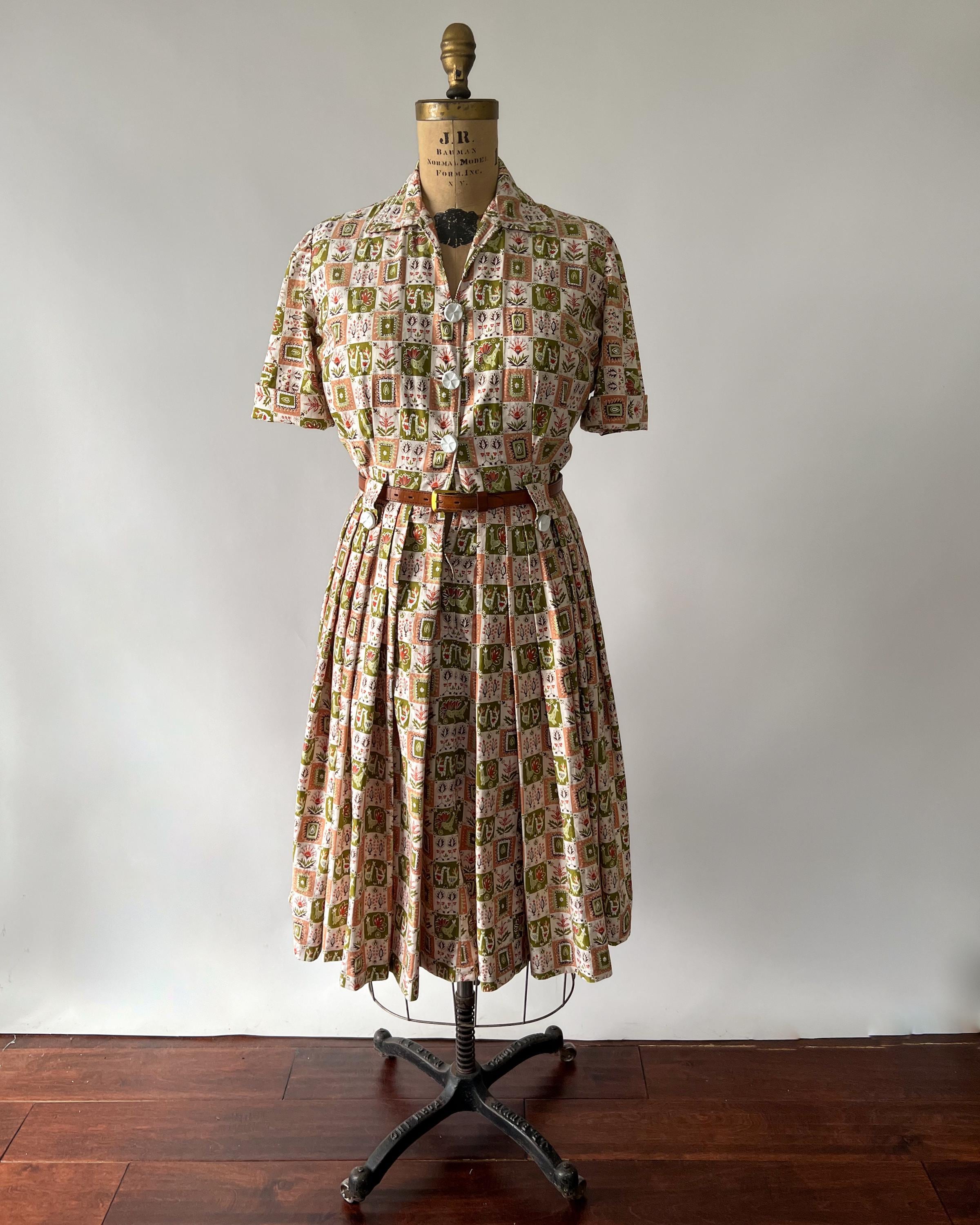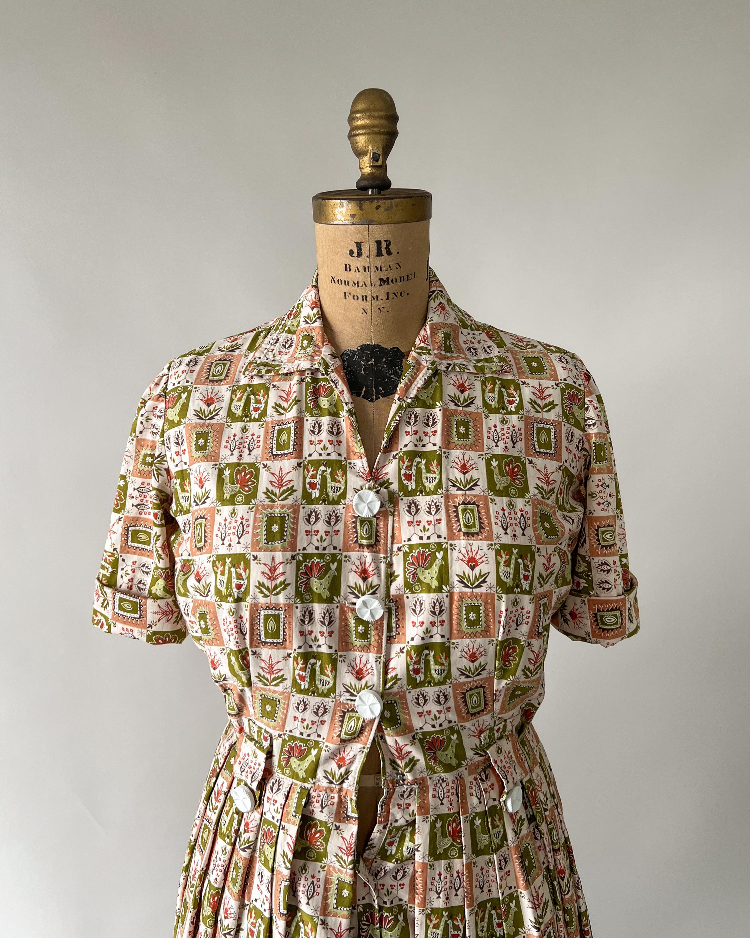 A cute, classic 1950s or early 1960s shirtdress. Made from “Chalet Swiss” Waverly bonded fabric with a quirky folk style rooster print, the collared dress has short cuffed sleeves, a nipped waist with belt loops, and a midi length shirt pleated skirt. It features white plastic buttons down the front of the bodice and decorating the front belt loops.
