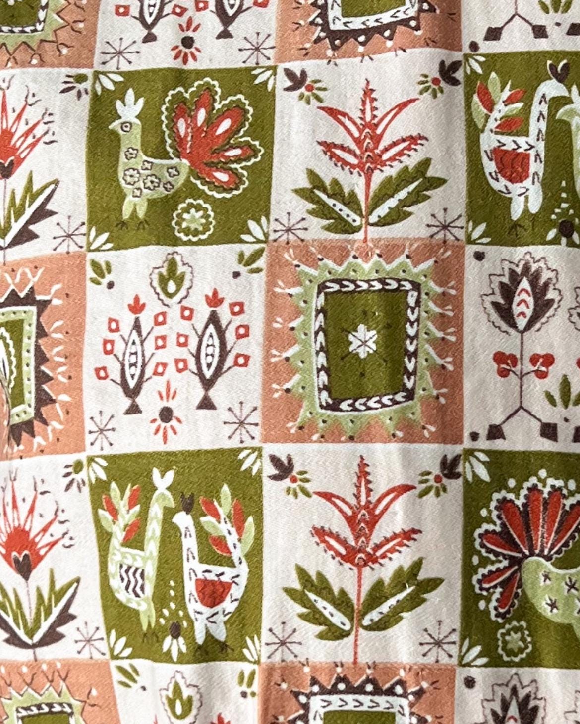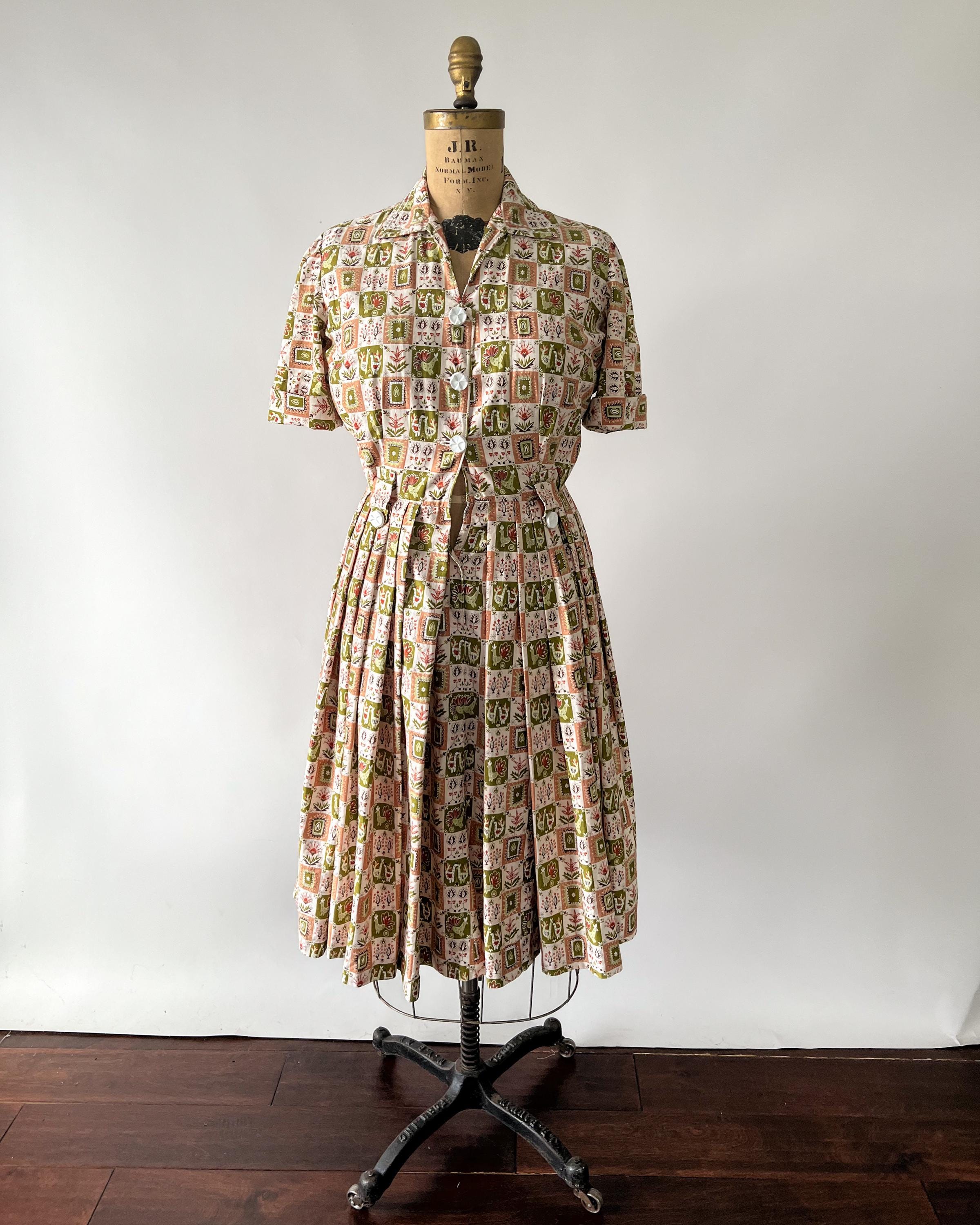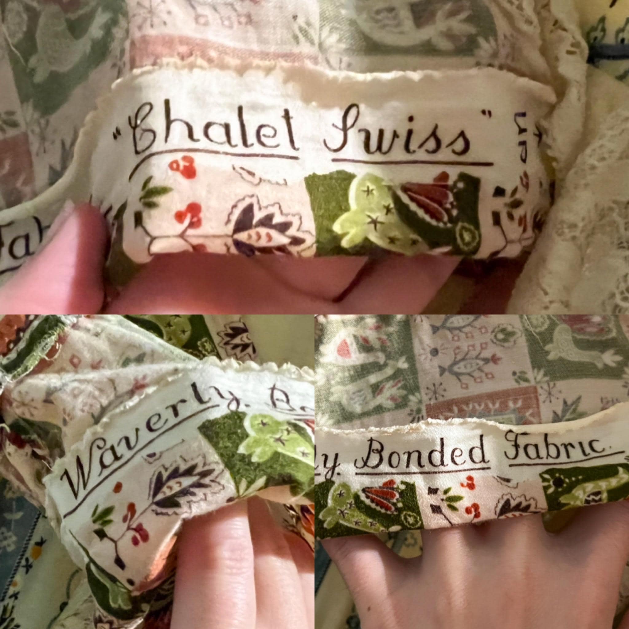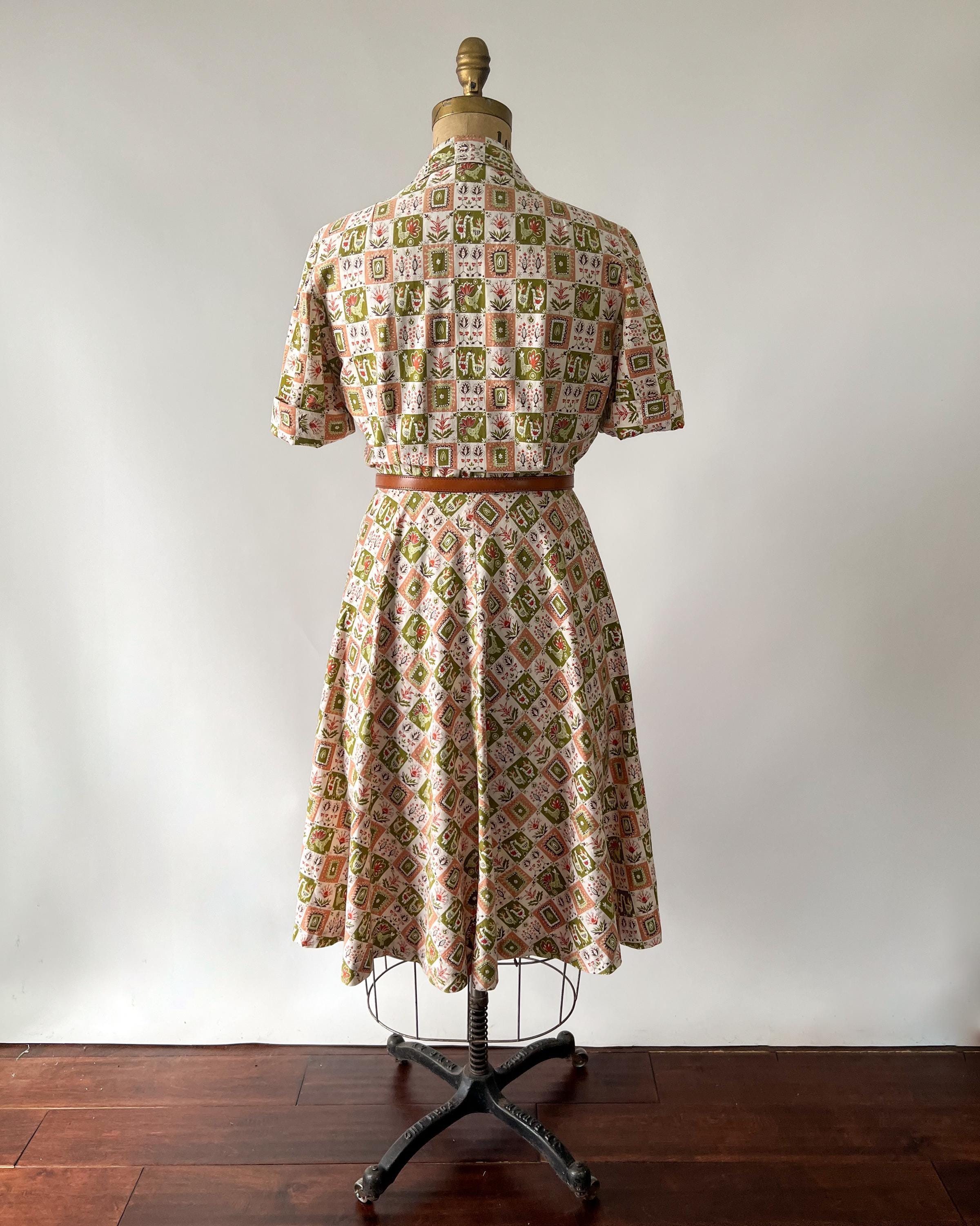 A cute, classic 1950s or early 1960s shirtdress. Made from “Chalet Swiss” Waverly bonded fabric with a quirky folk style rooster print, the collared dress has short cuffed sleeves, a nipped waist with belt loops, and a midi length shirt pleated skirt. It features white plastic buttons down the front of the bodice and decorating the front belt loops.