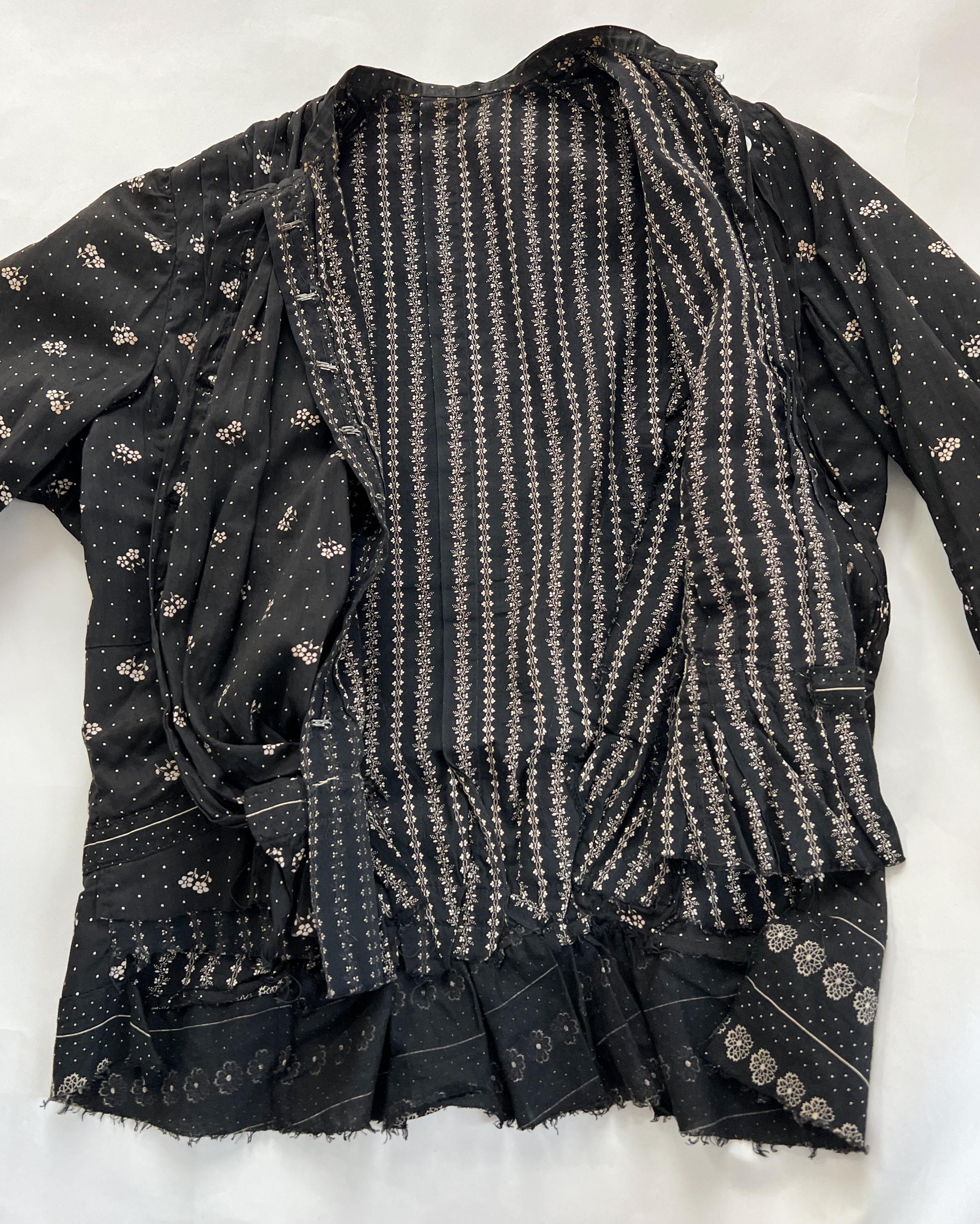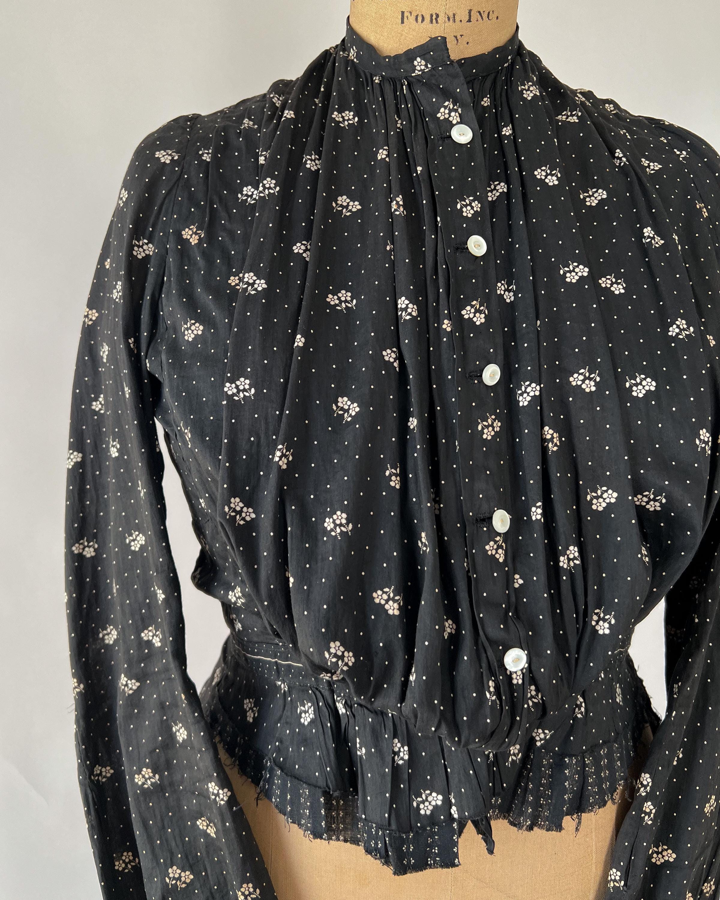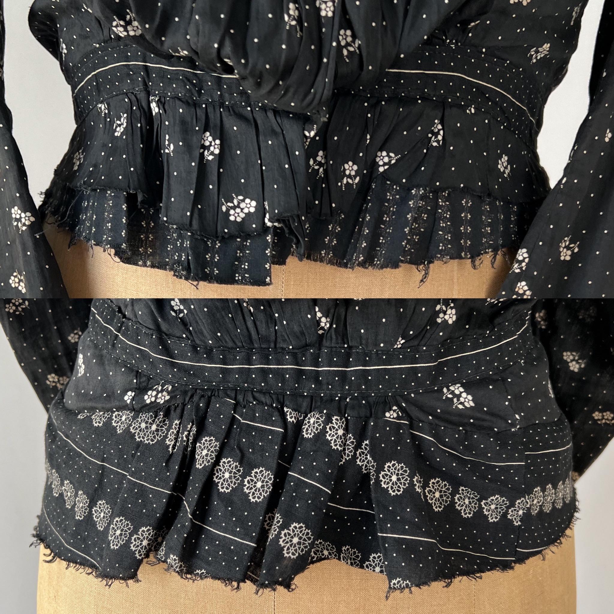 Amazing Victorian turn of the century late 1890s / early 1900s black and white floral calico bodice and skirt set. The bodice has a crew neckline and features a pleated, pigeon front with MOP buttons down the front, as well as a contrasting striped calico waistband with a peplum hem. It has a fitted lining in contrasting calico which fastens down the front with hooks and eyes (while the outer bodice buttons over the top). The blouse has long, full bishop sleeves which are gathered into fitted, buttoned cuffs. The high waisted, full length skirt has a slight trumpet shape and features a horizontal pleat as well as a double ruffled hem. It is fully lined with black cotton with black velvet hem binding. Back button closure (with a hand done button hole). The set includes both machine and hand stitching. The bodice looks likes it could have been altered at some point. Such an amazing piece of history in a rare larger size!