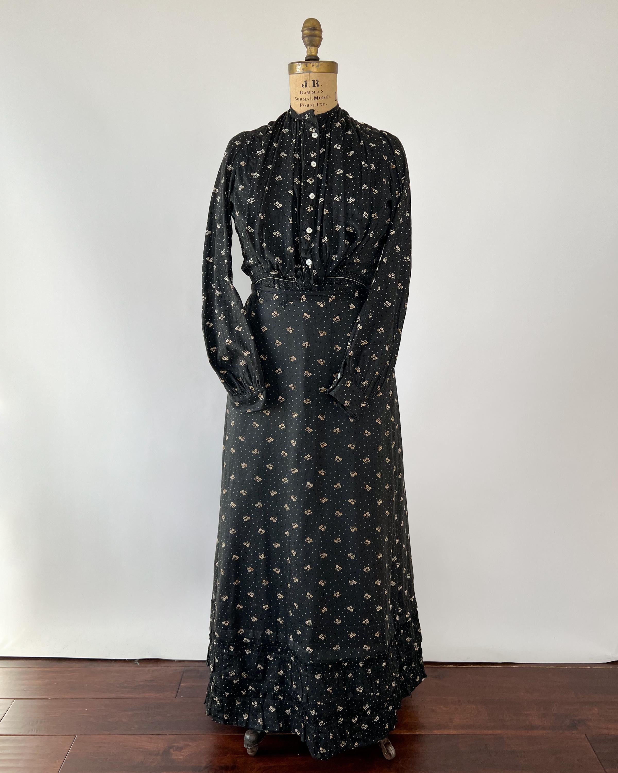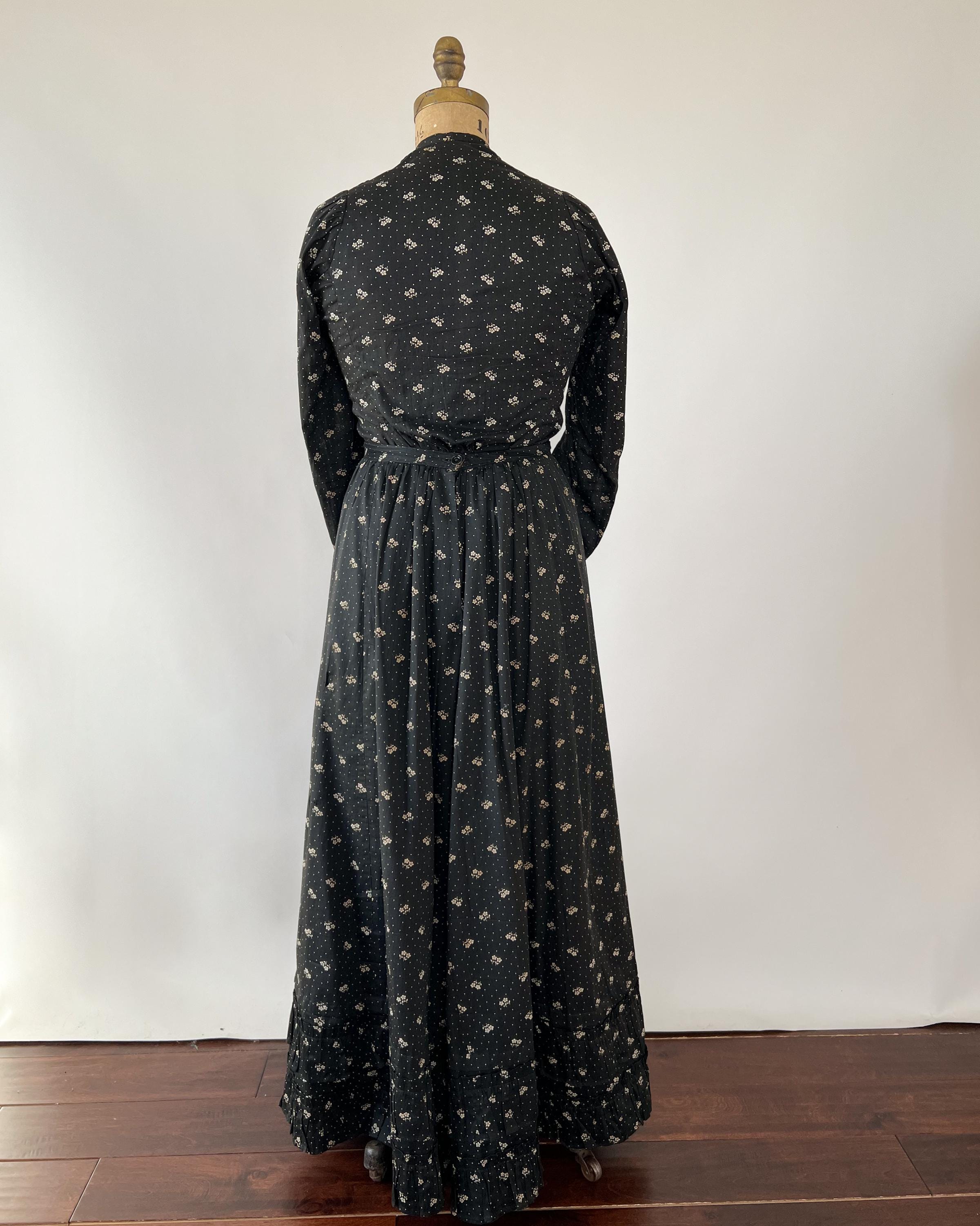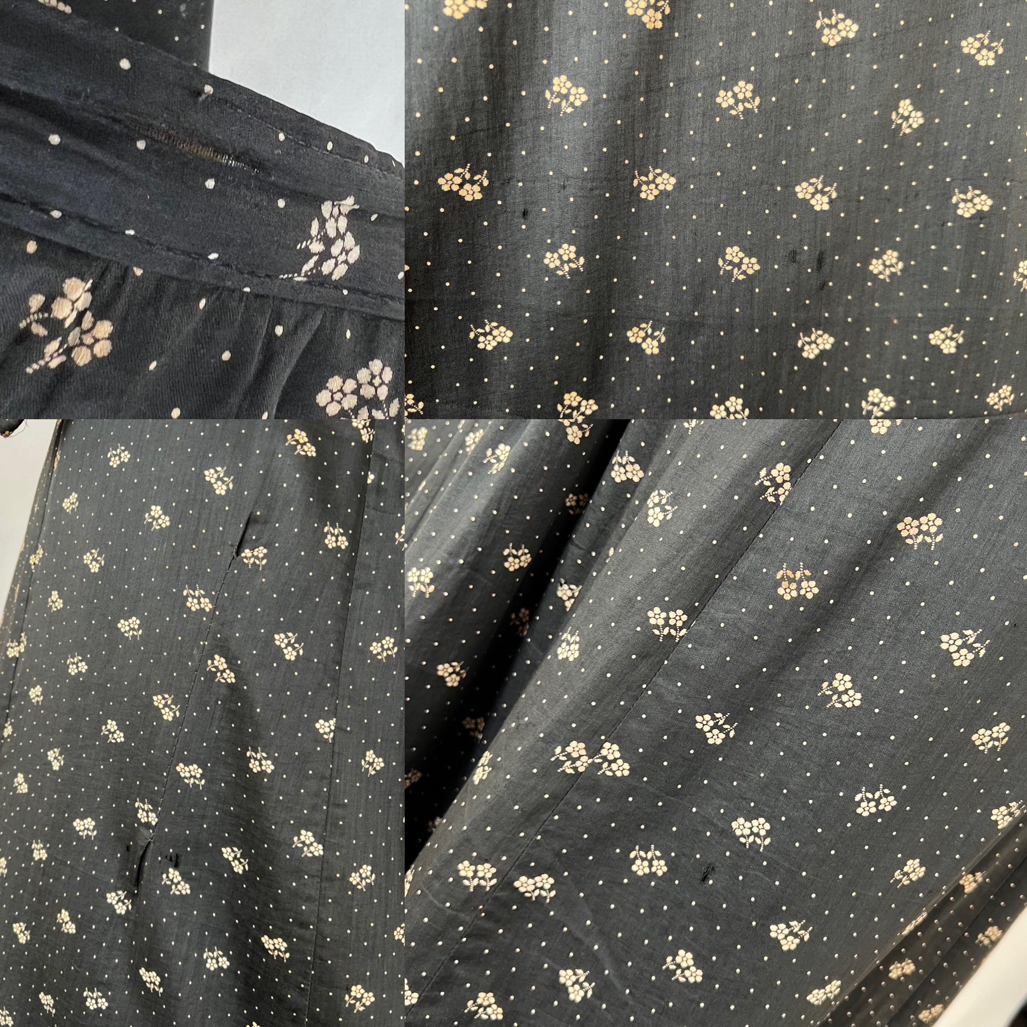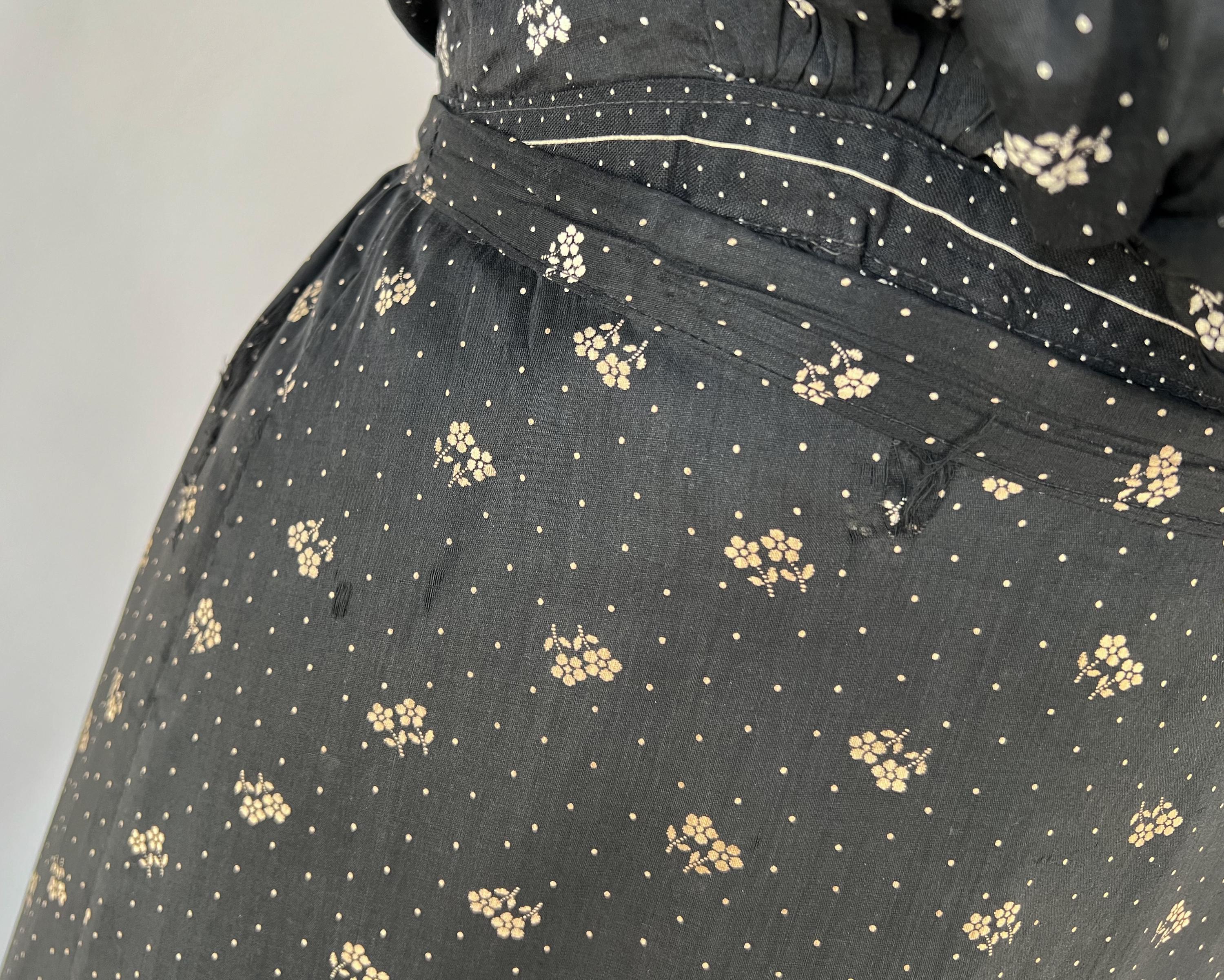 Antique Dress, Victorian Edwardian 1890s 1900s Black Calico Floral Bodice Skirt Set, Primitive Farm Pioneer Mourning, Medium, 29 30 Waist