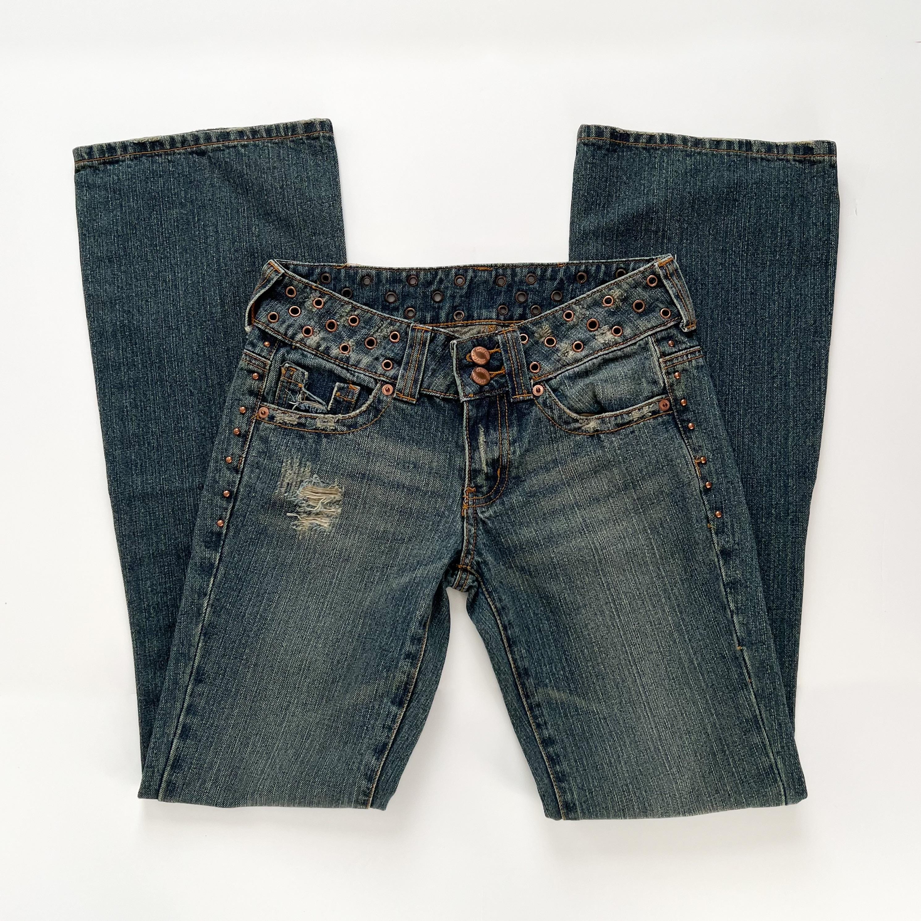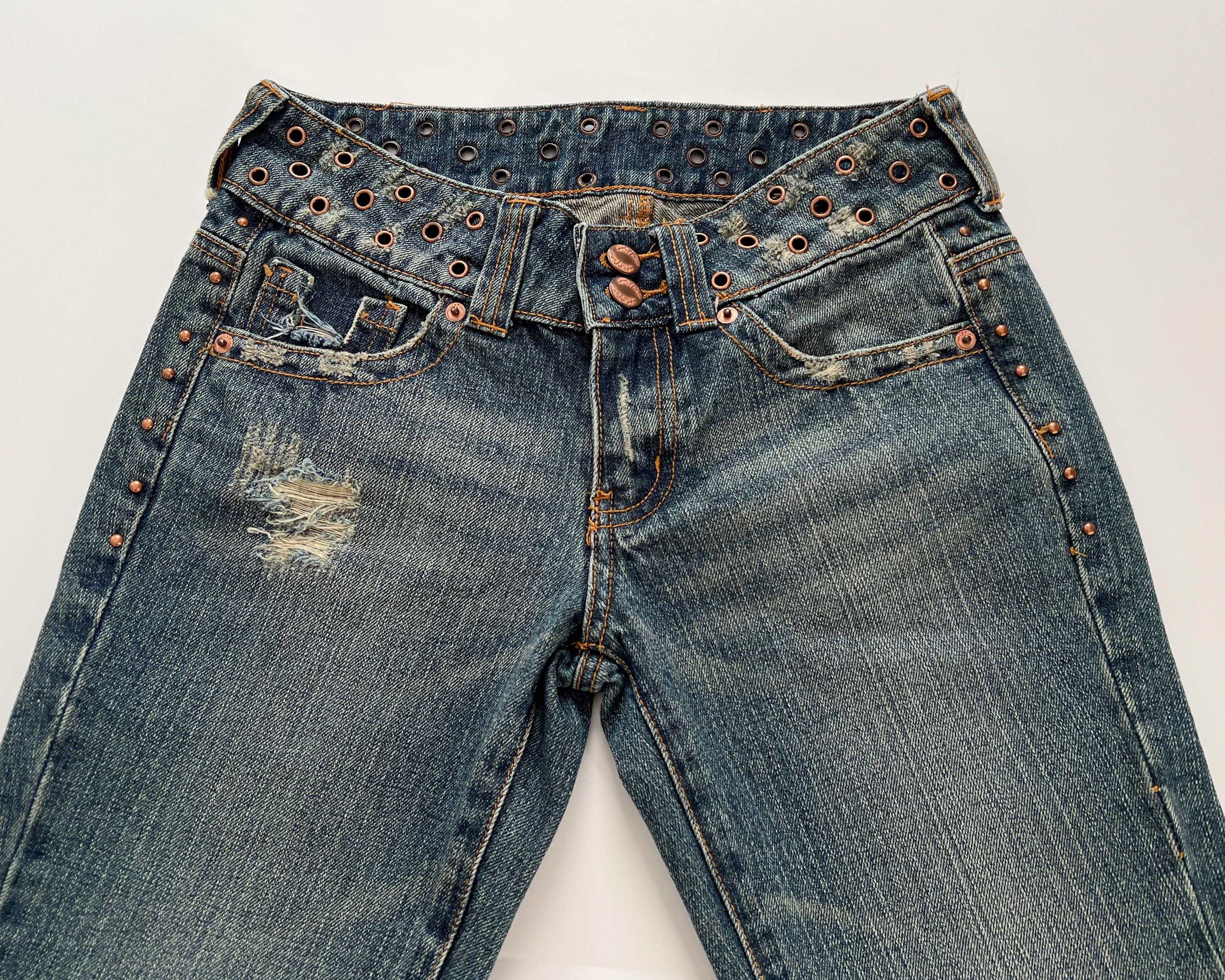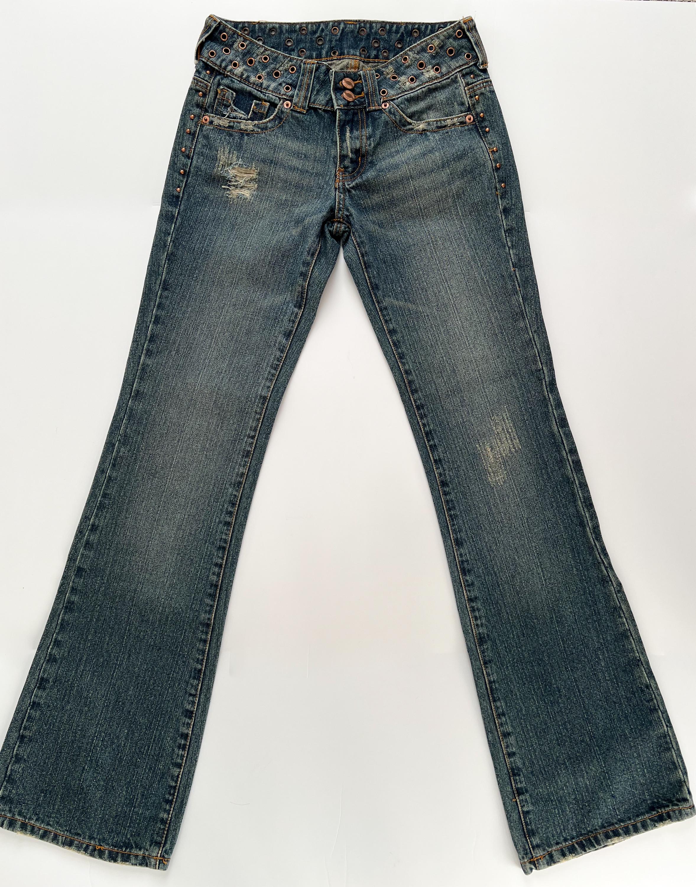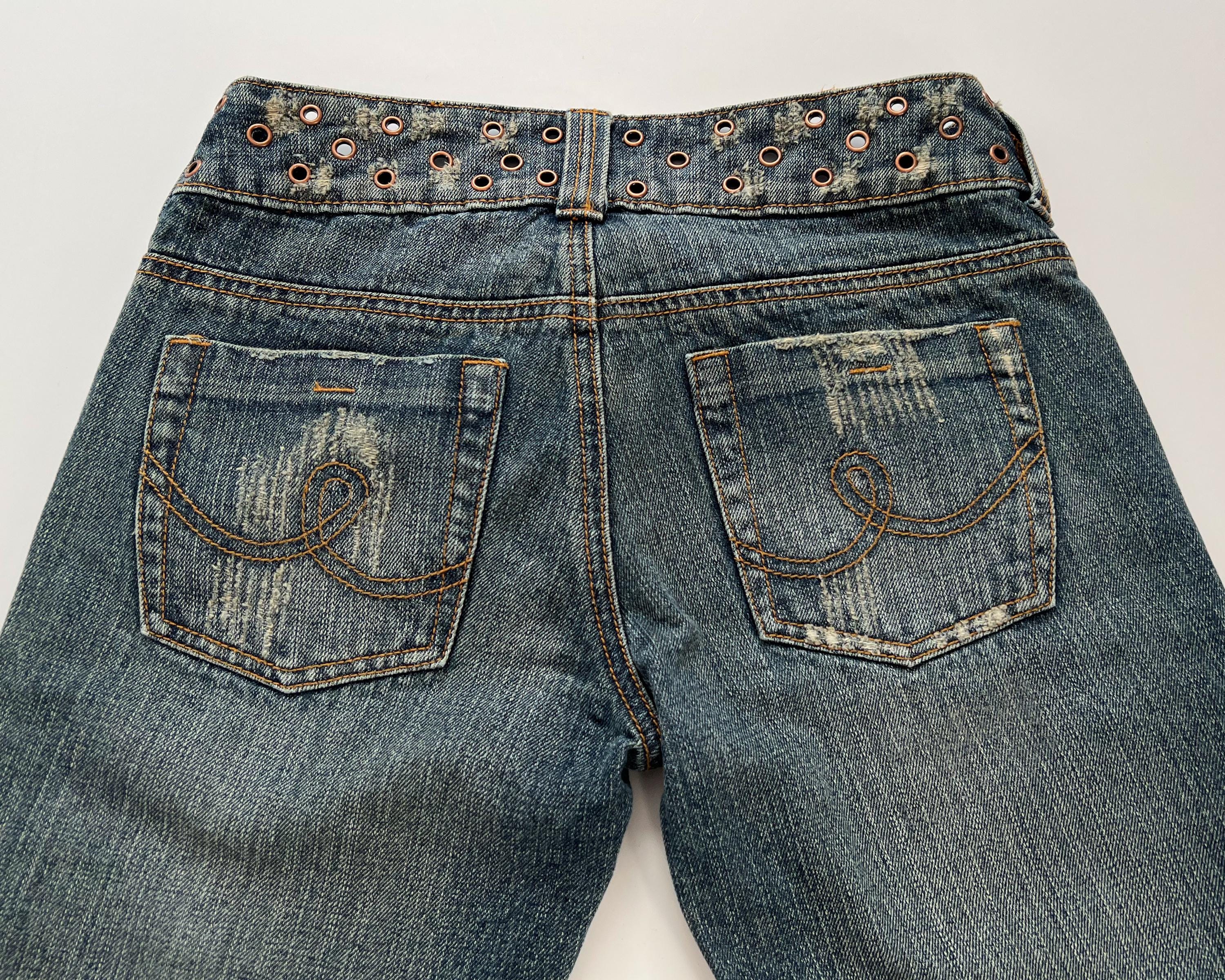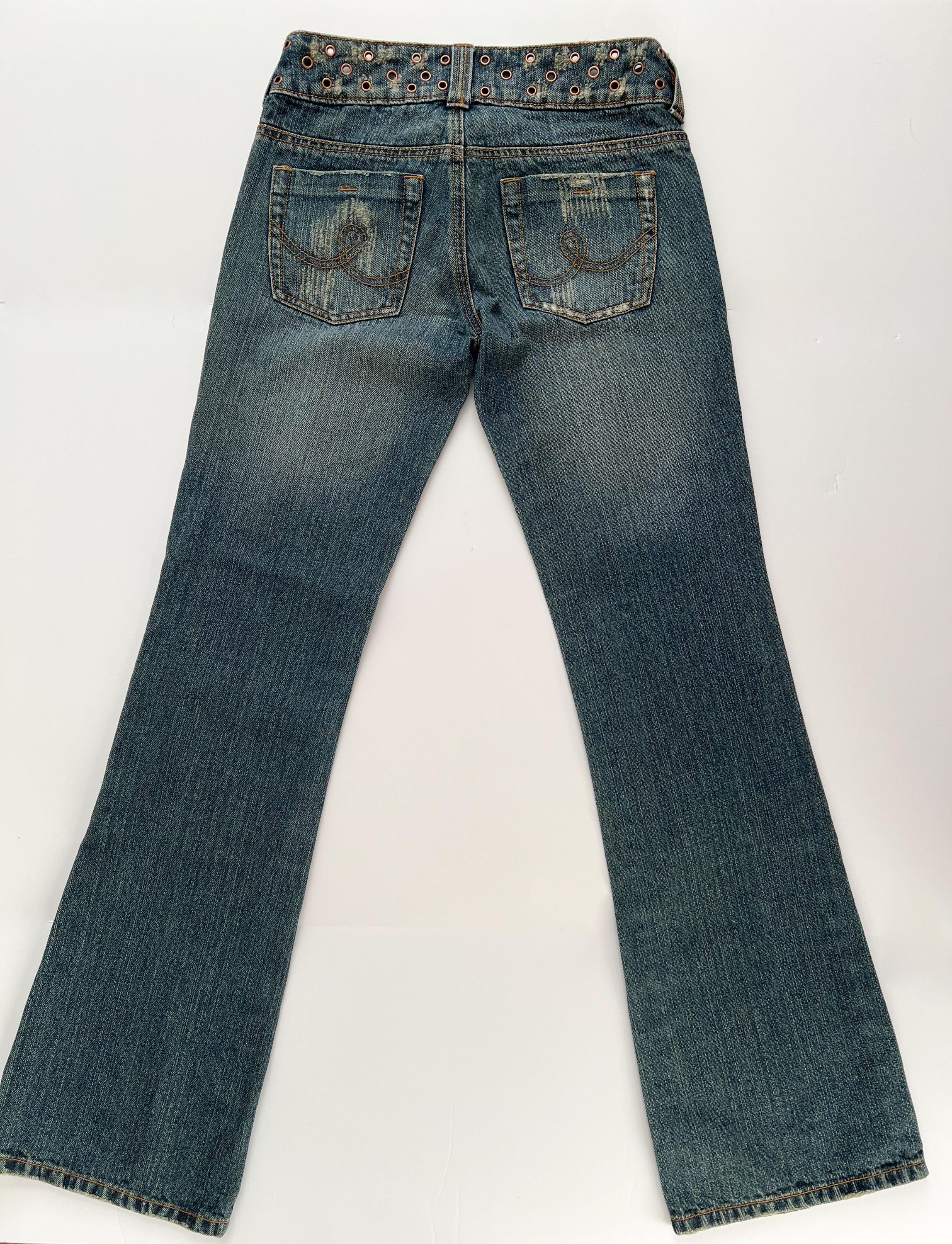 A great pair of early 2000s jeans! They have a great faded stone wash, flared legs, and a low rise. They feature distressed details and grommets around the waistband as well as studs down the hips.