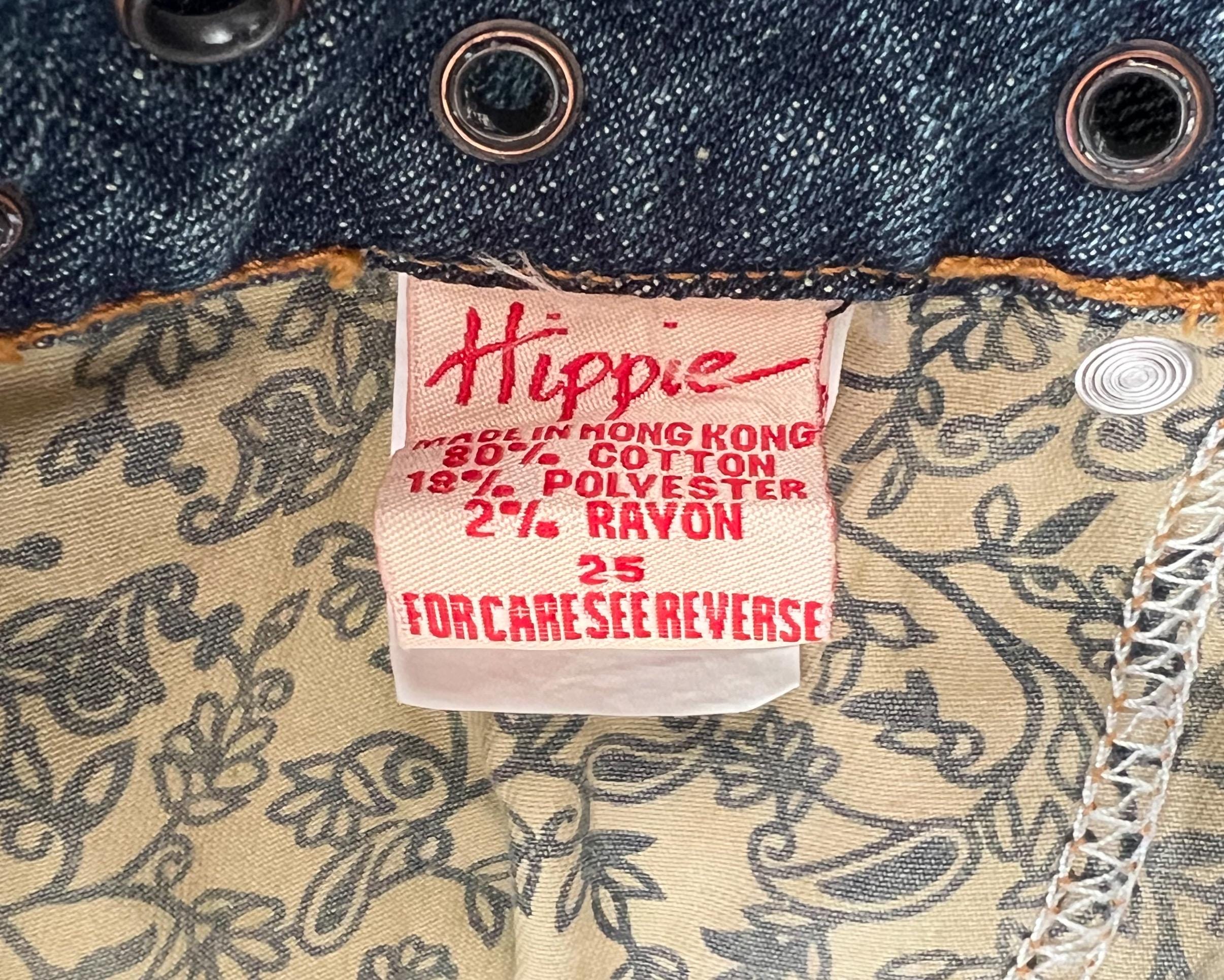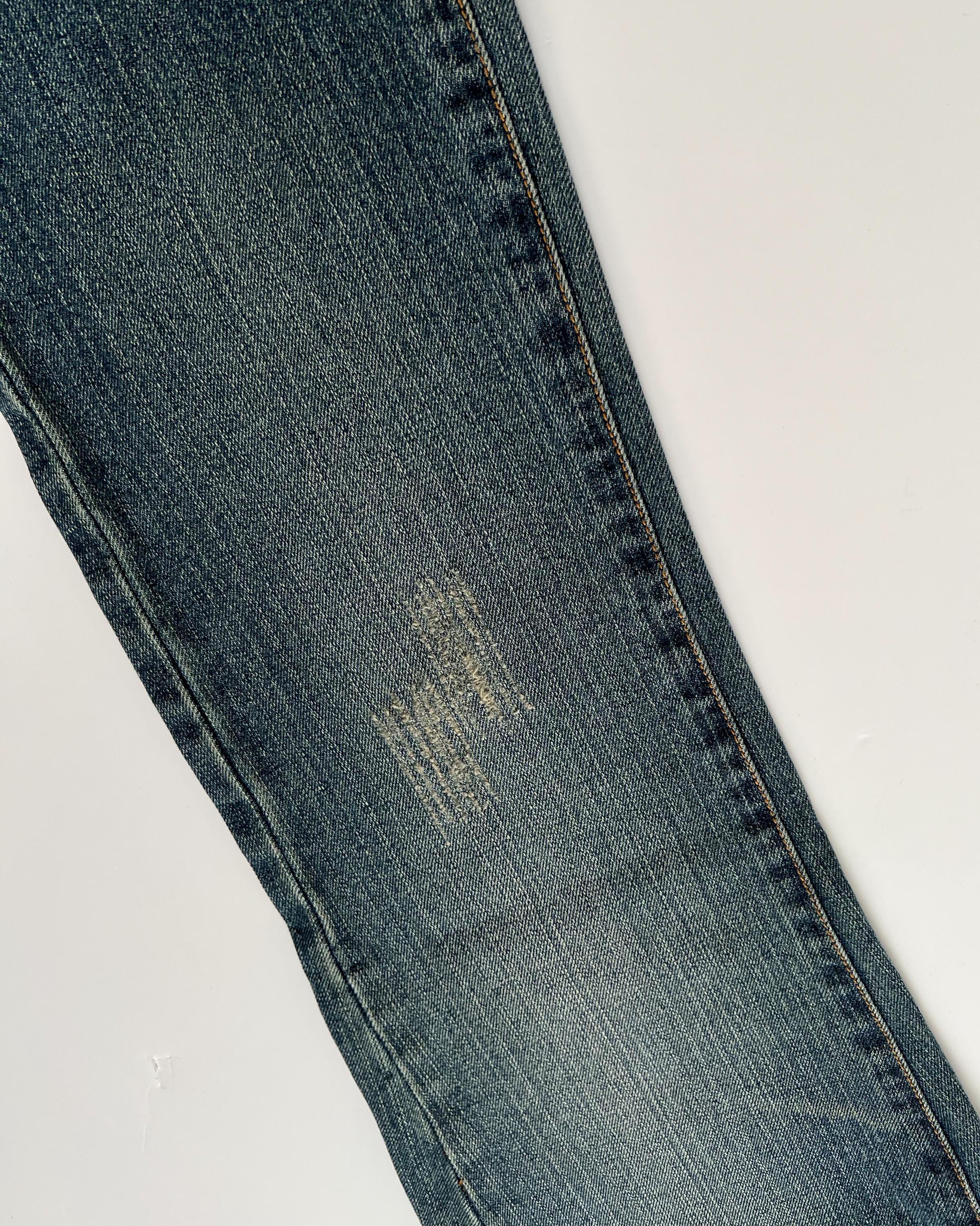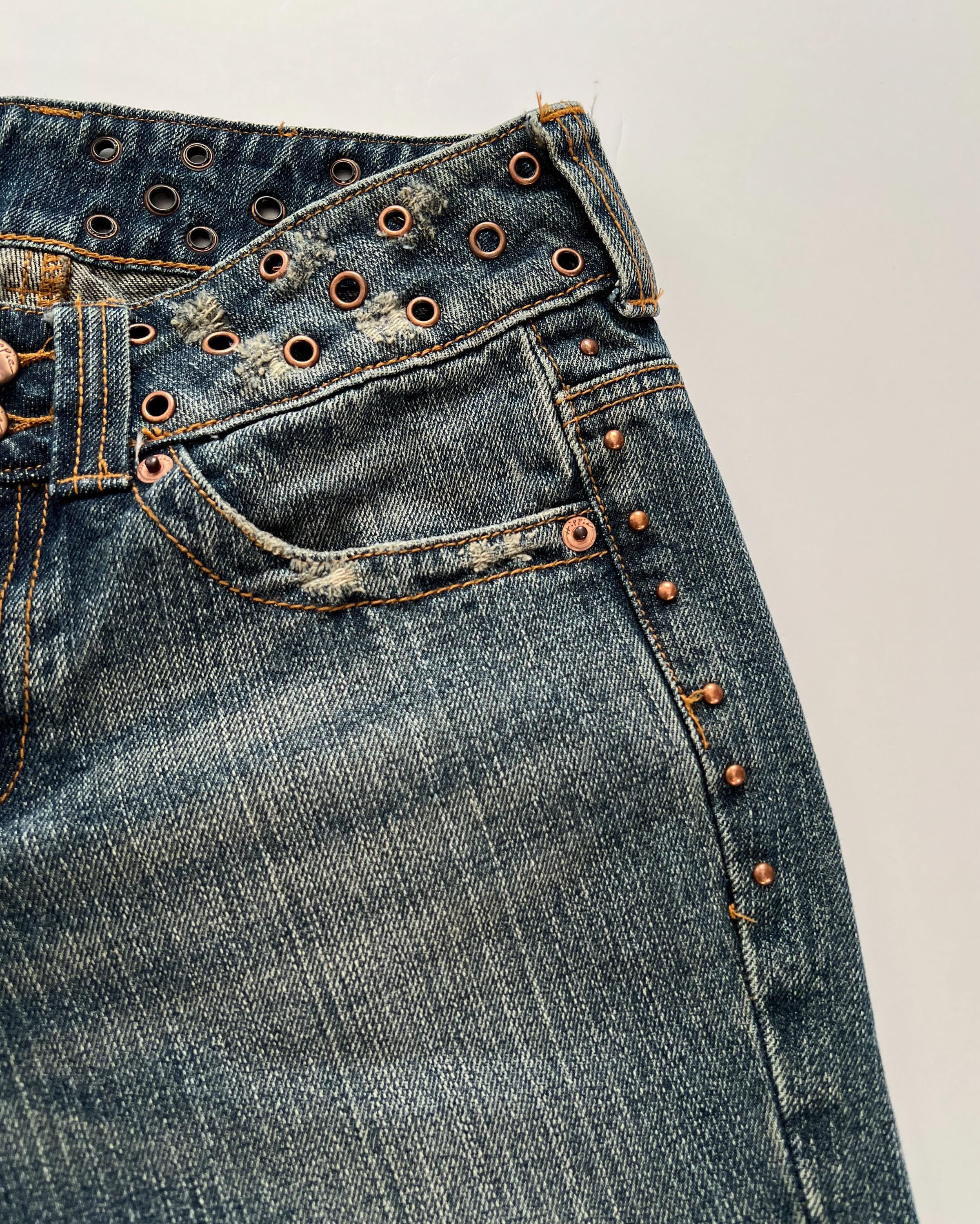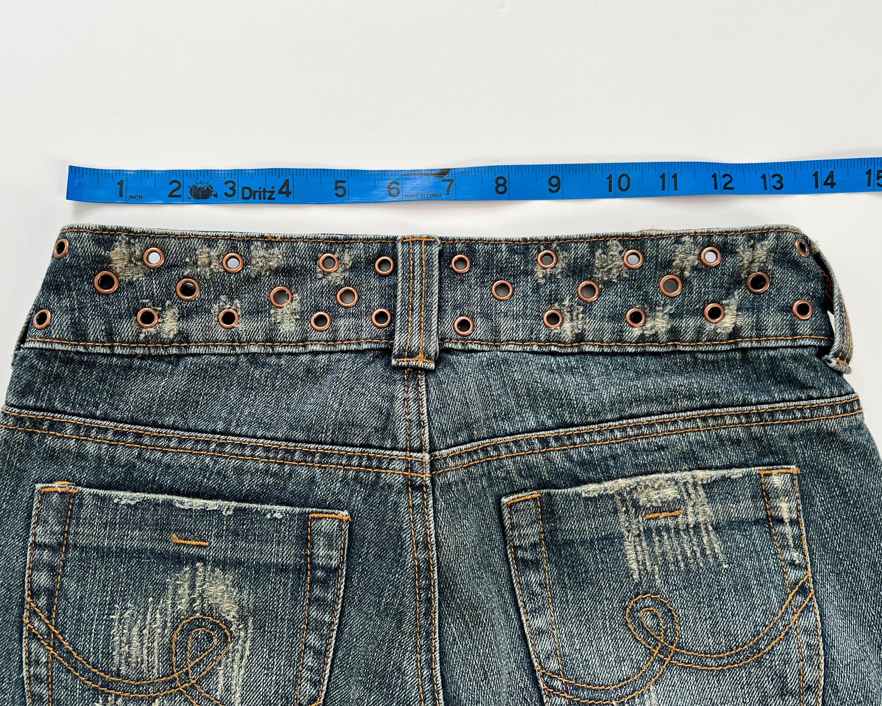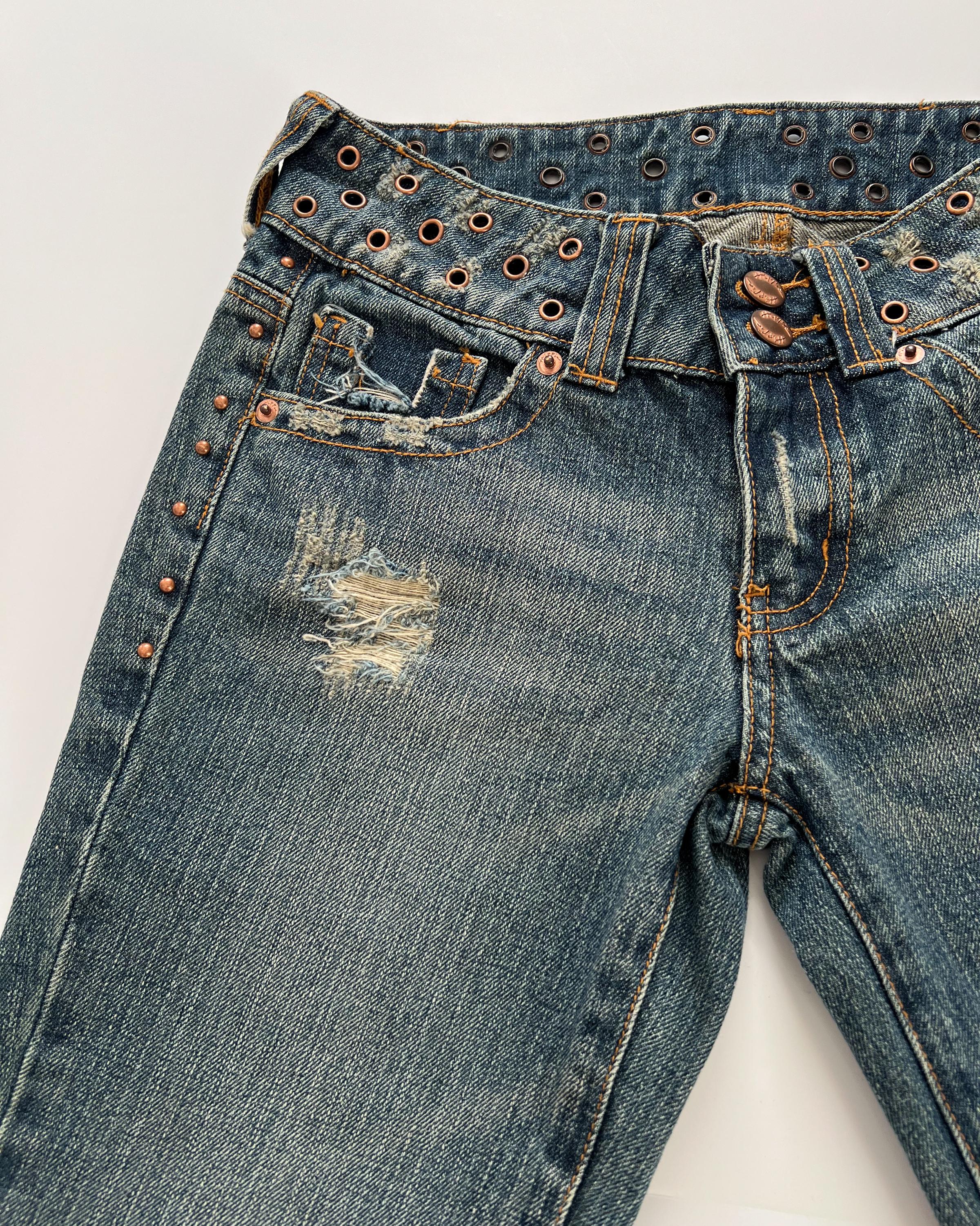 A great pair of early 2000s jeans! They have a great faded stone wash, flared legs, and a low rise. They feature distressed details and grommets around the waistband as well as studs down the hips.