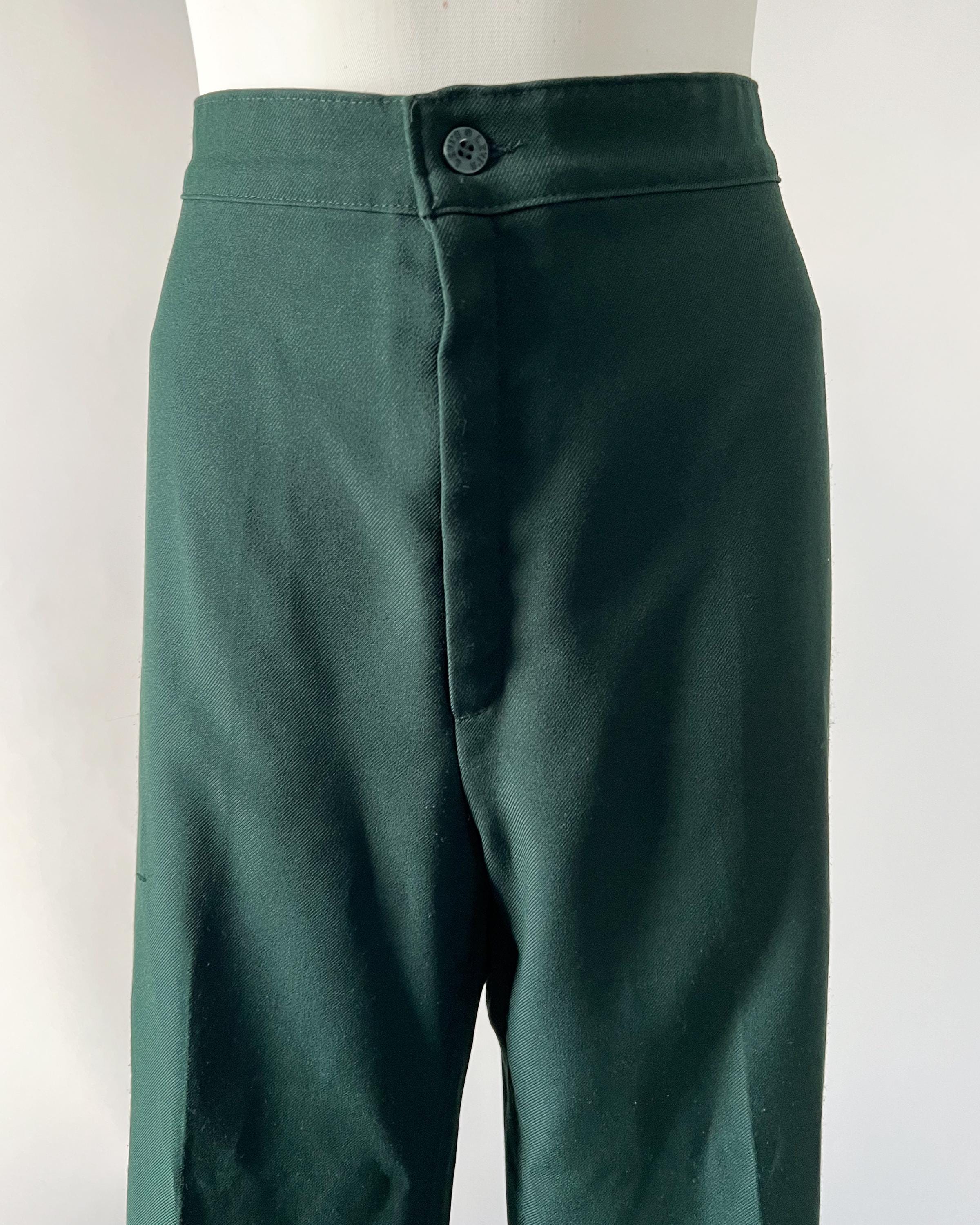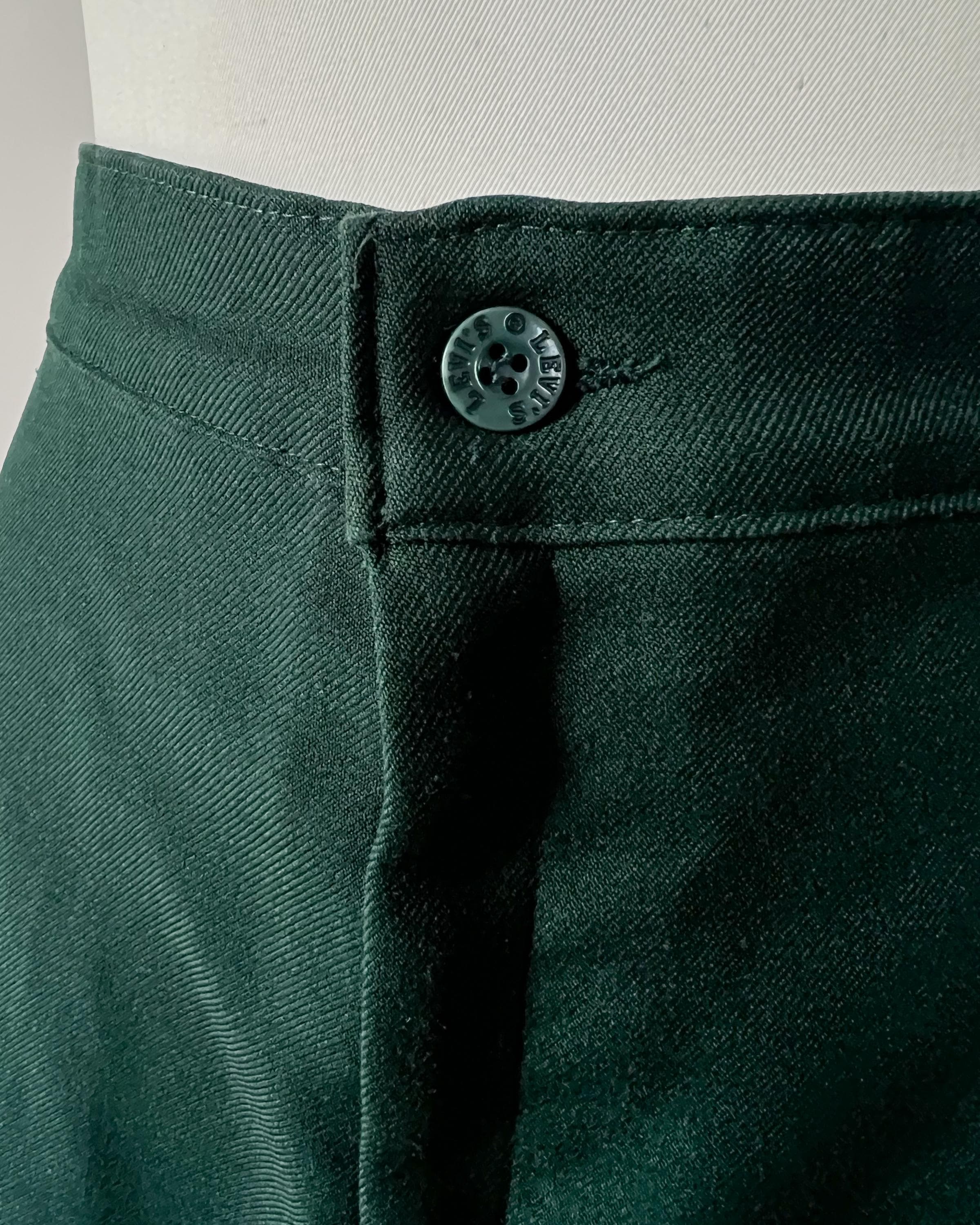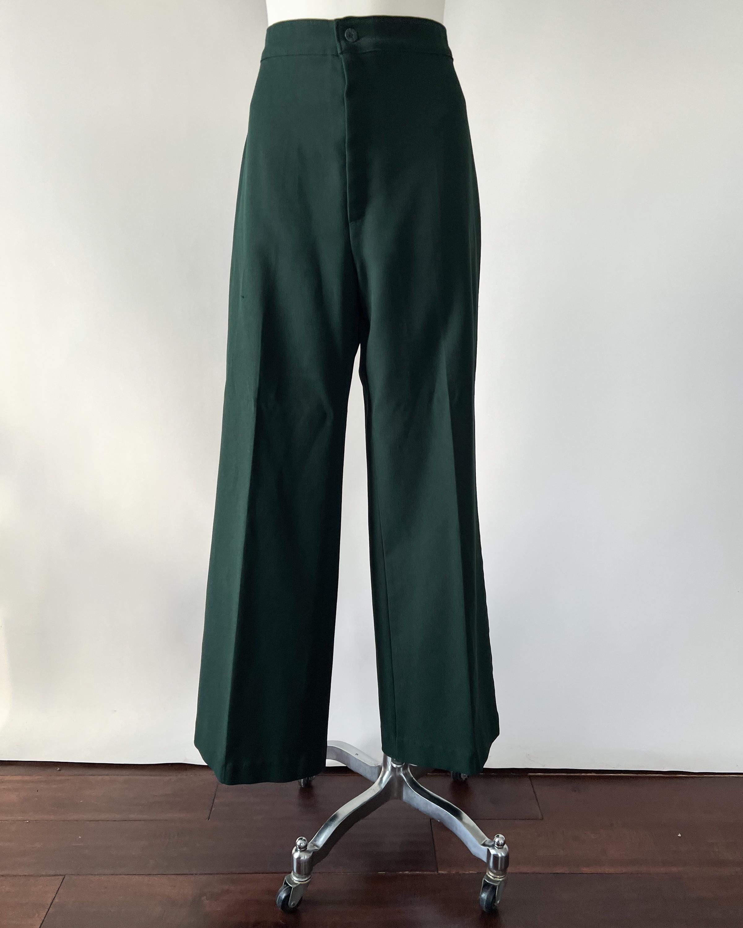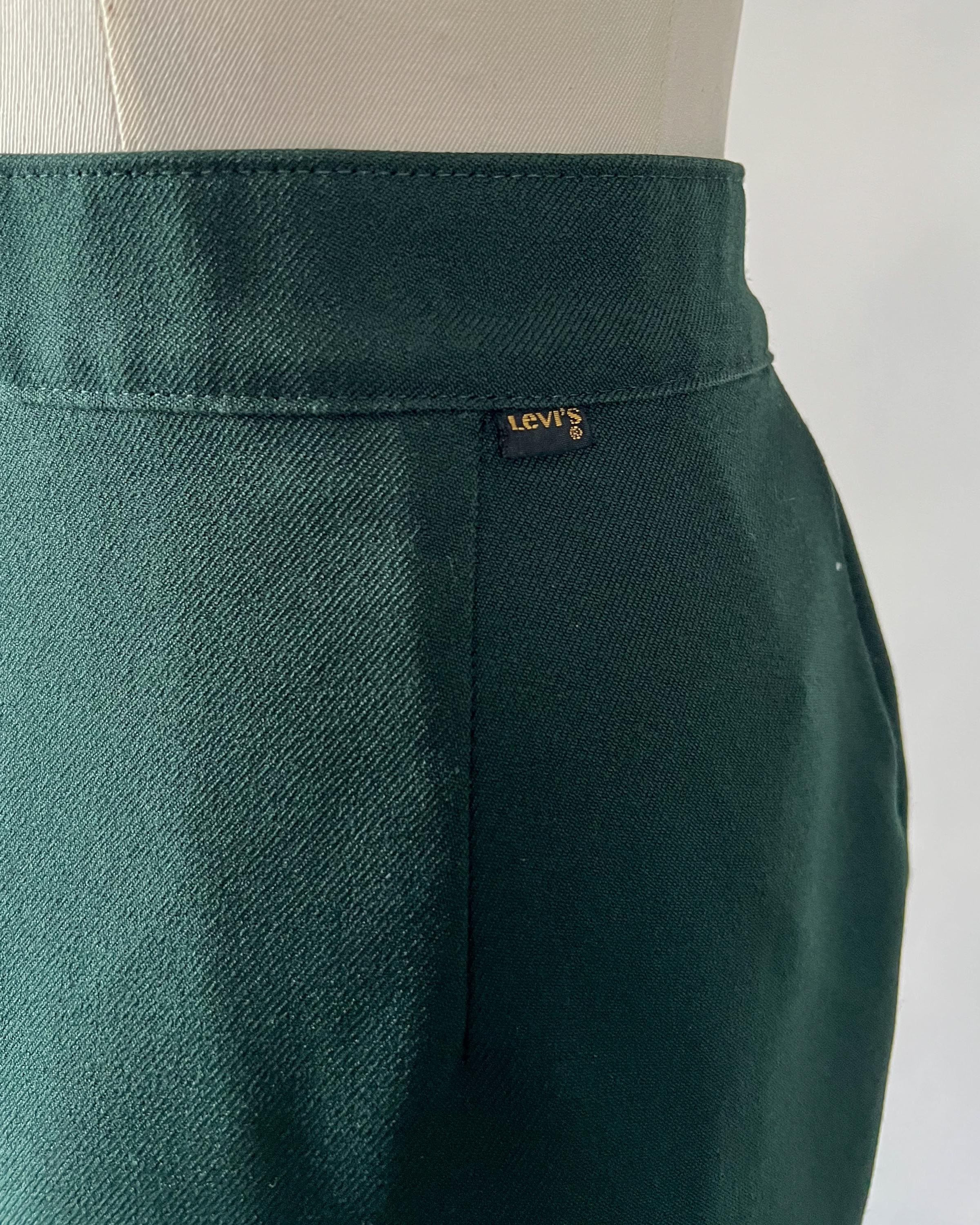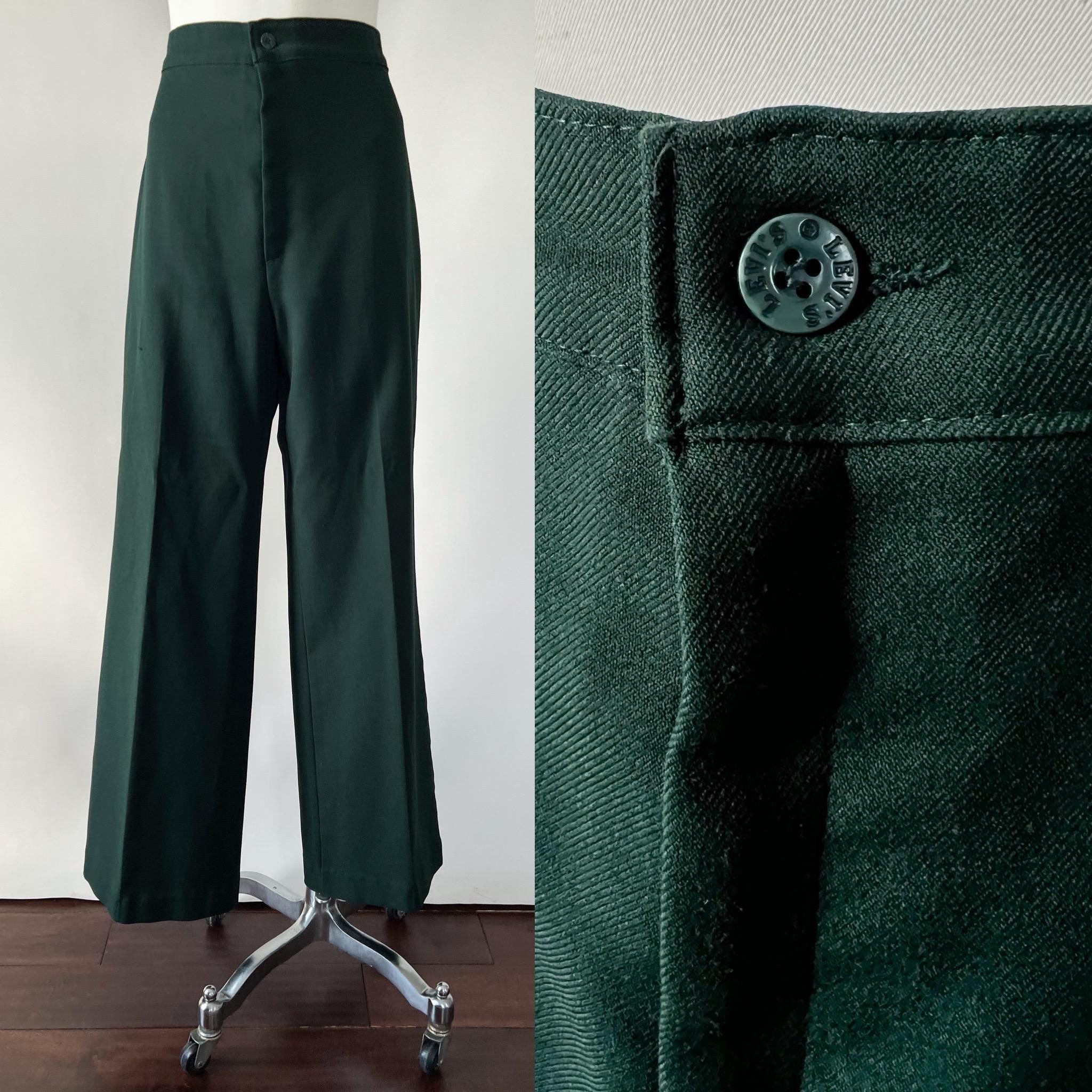 A great pair of Levi’s wide leg polyester pants in a rich dark pine / evergreen color. They are high waisted and have a slim fit with flared legs. They have a front button and zip fly closure.