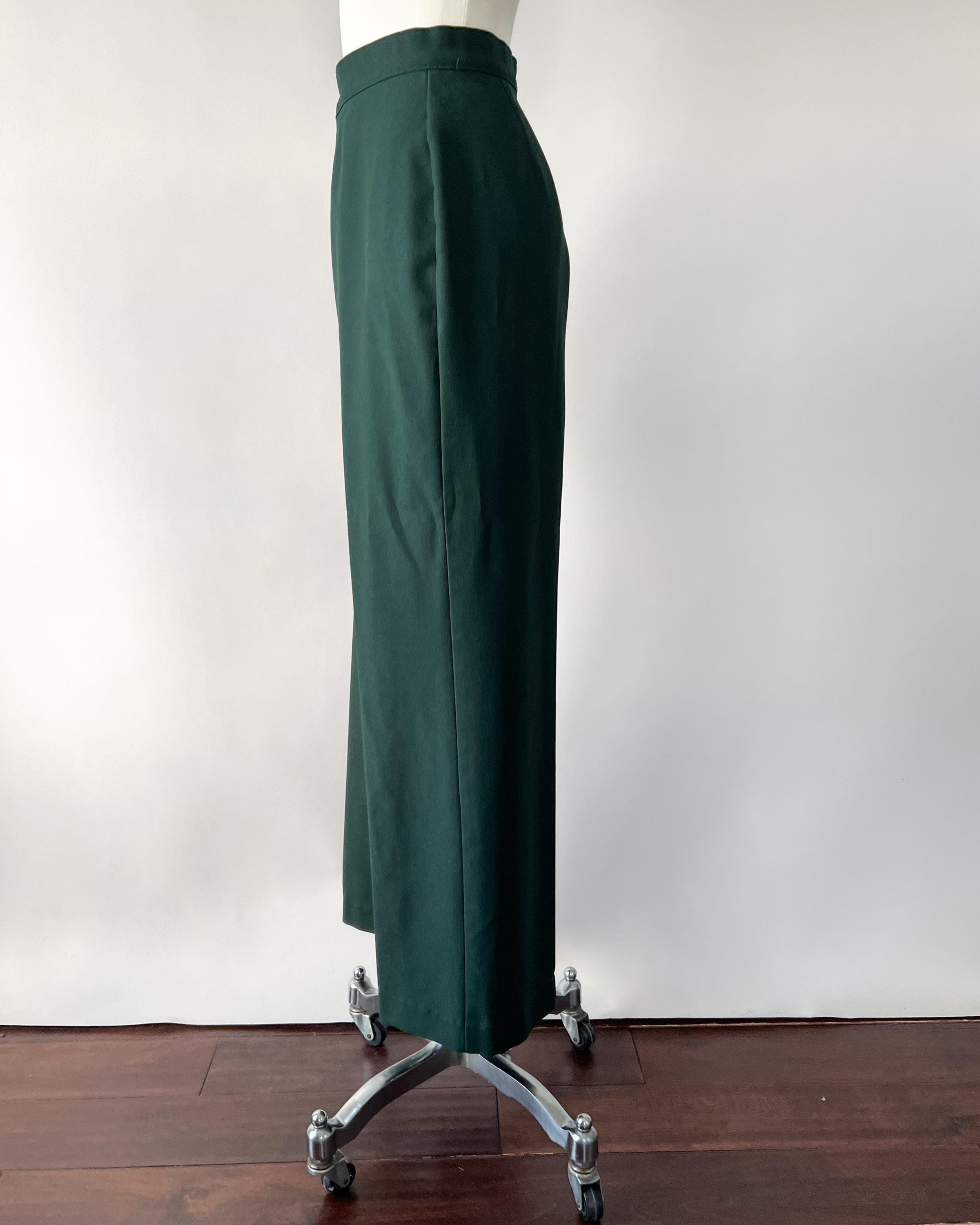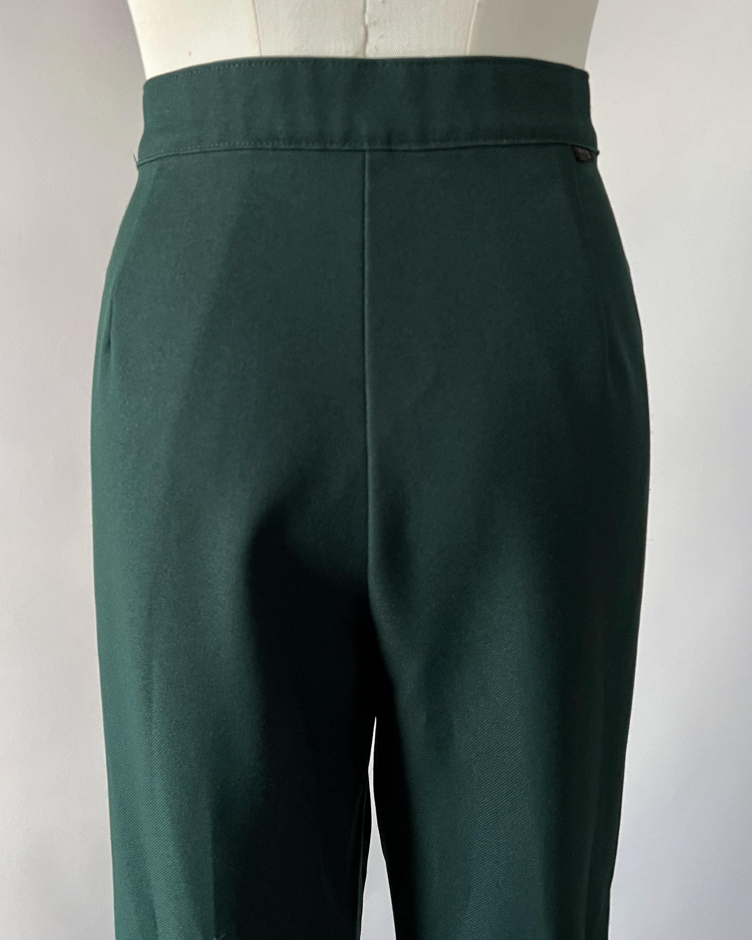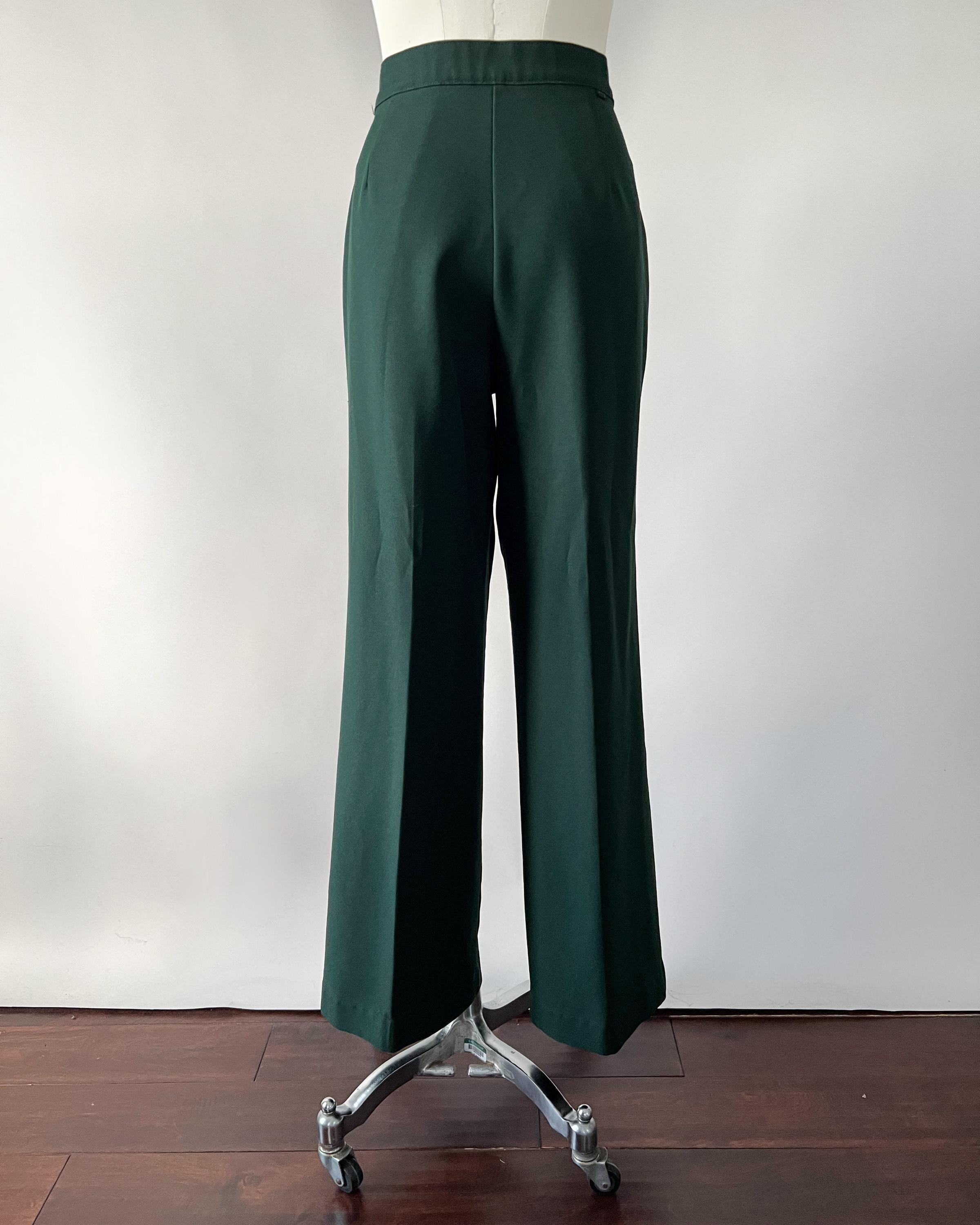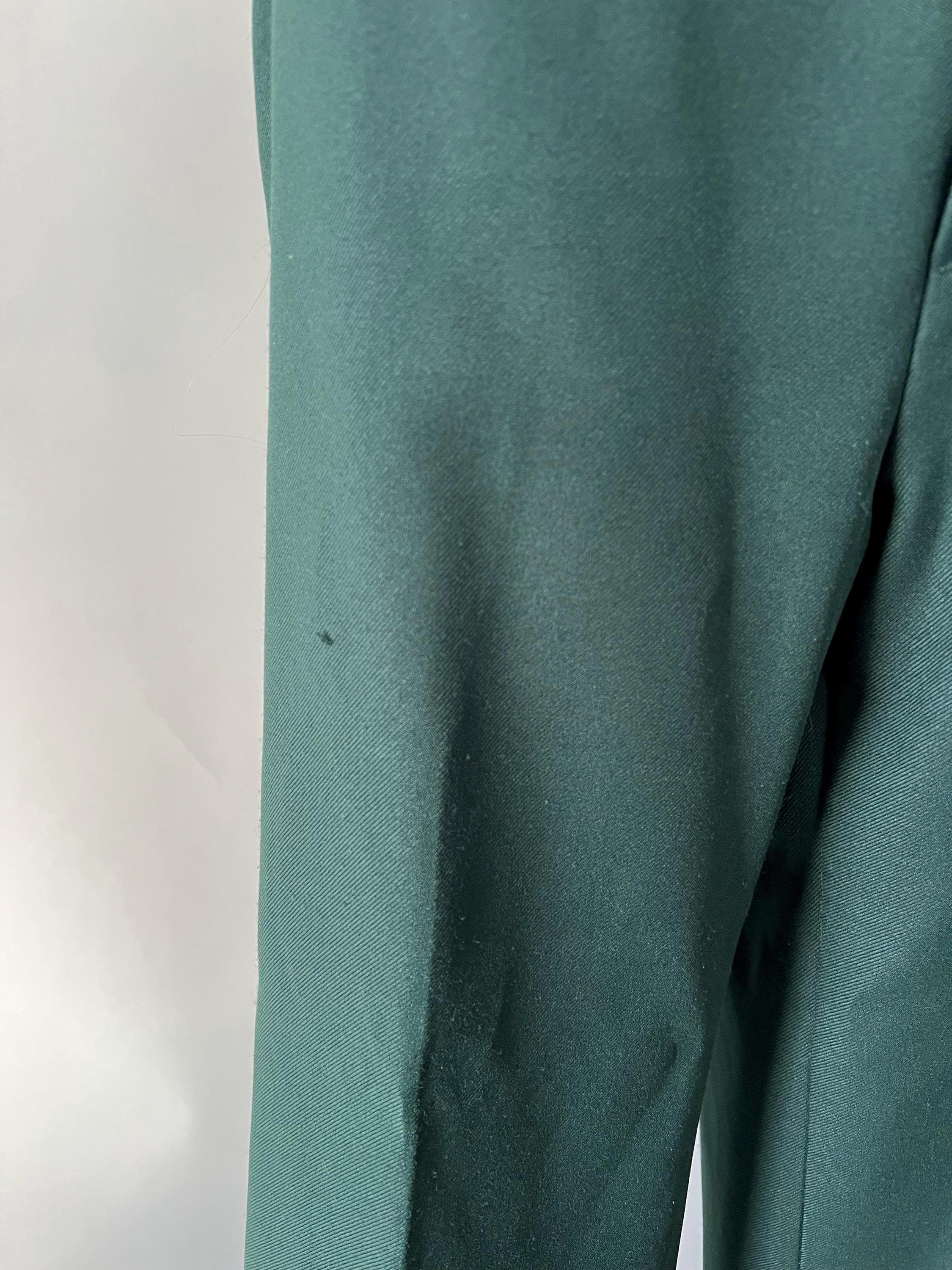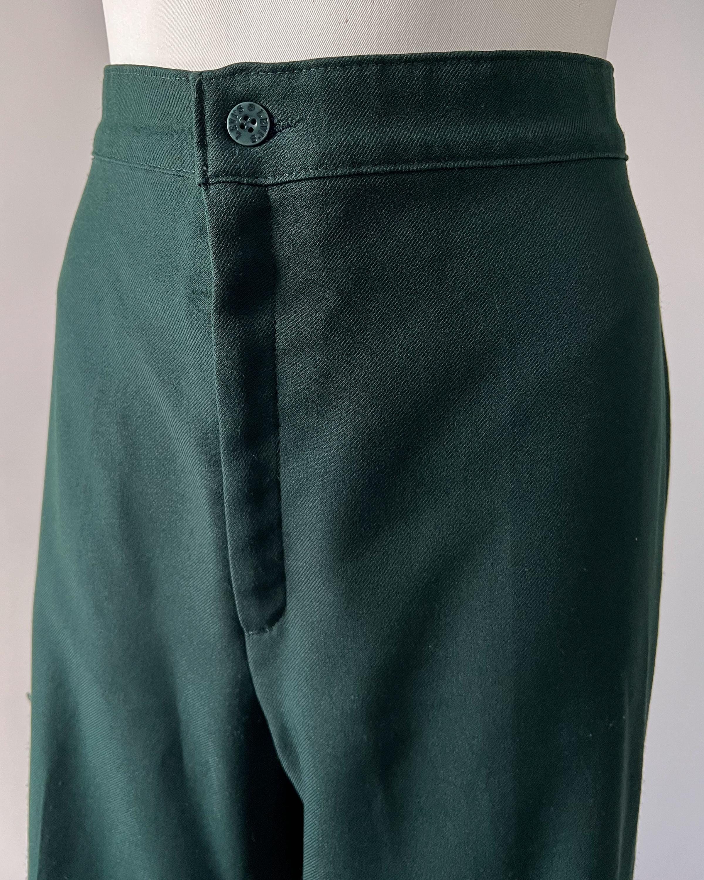 A great pair of Levi’s wide leg polyester pants in a rich dark pine / evergreen color. They are high waisted and have a slim fit with flared legs. They have a front button and zip fly closure.