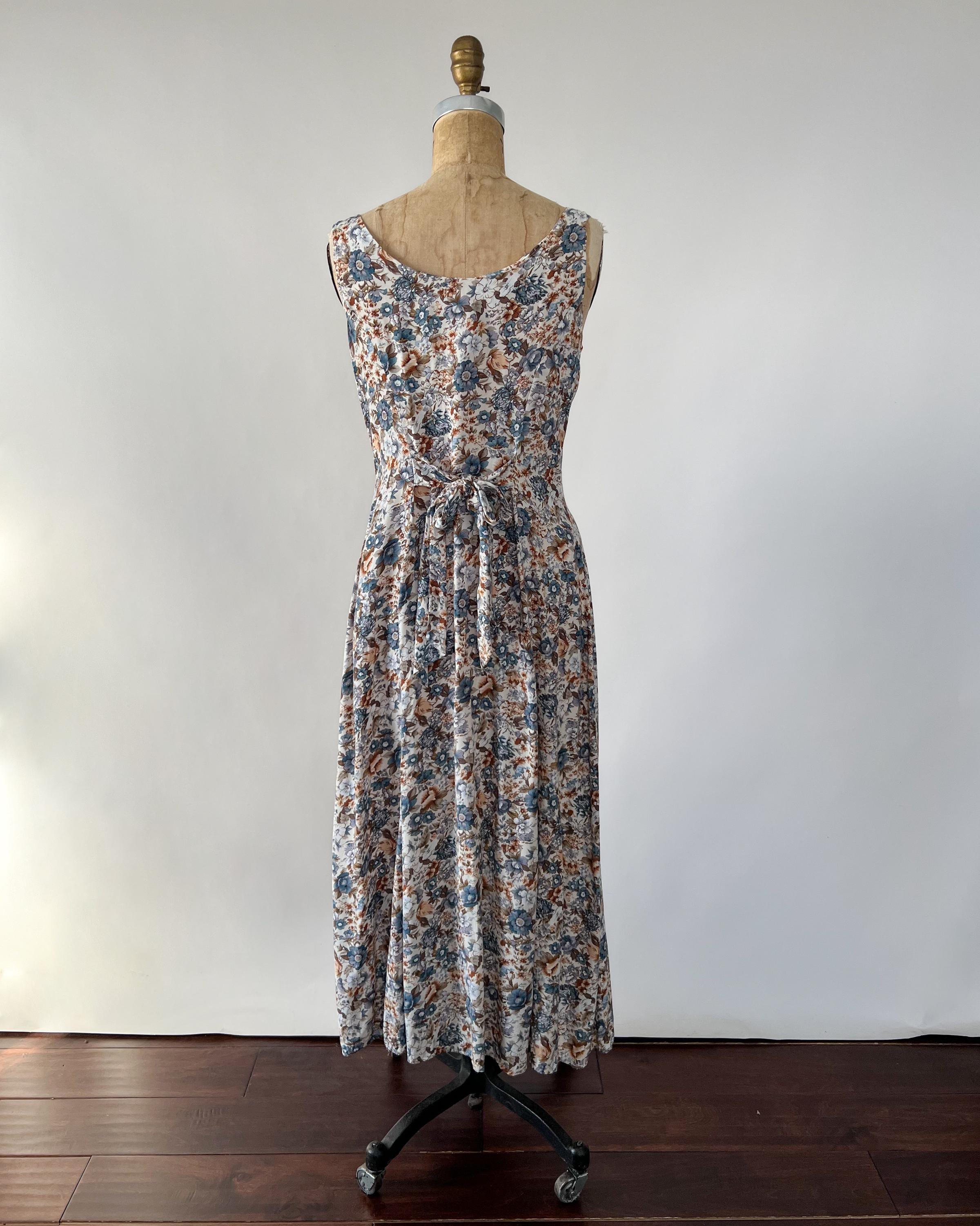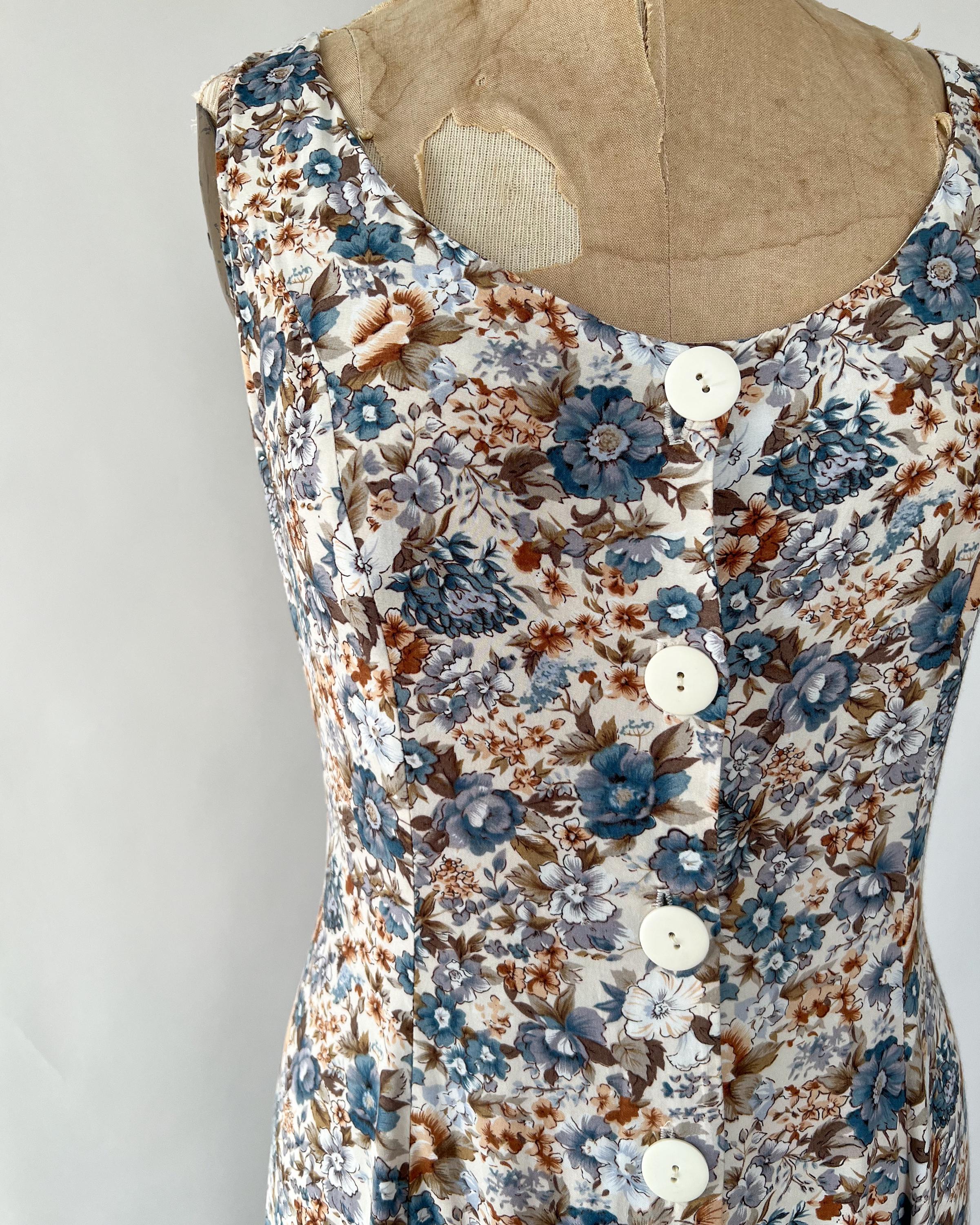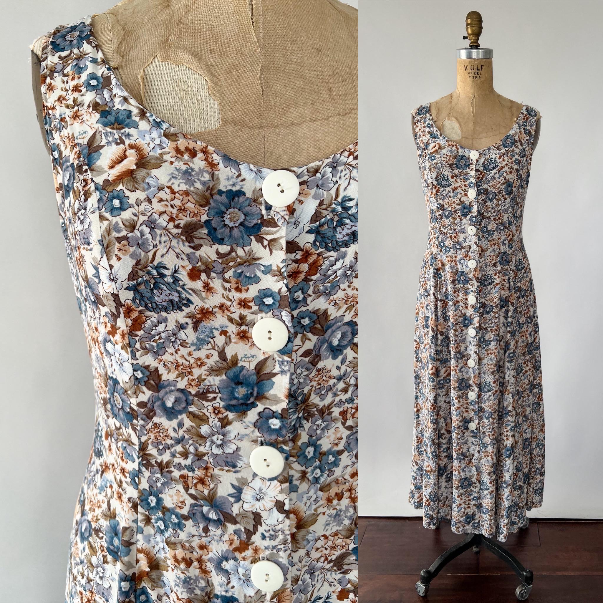 A gorgeous 1990s rayon midi dress with lovely blue and brown floral print! The sleeveless dress features a flattering fit with a scoop neckline and princess seaming, and a full, midi length skirt. Attatched ties in back to cinch the waist. Front button closure. Perfect to layer with a chunky cardigan!