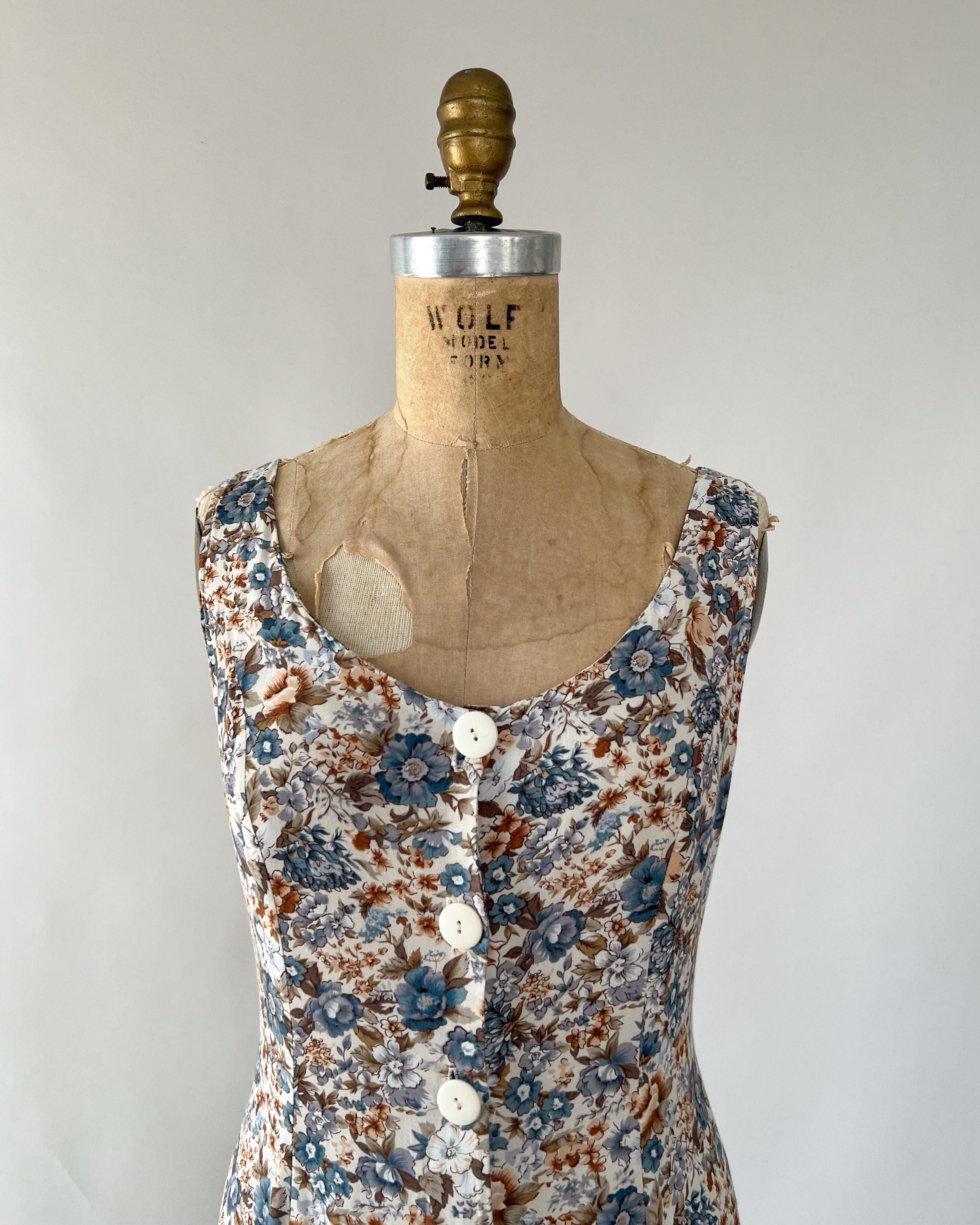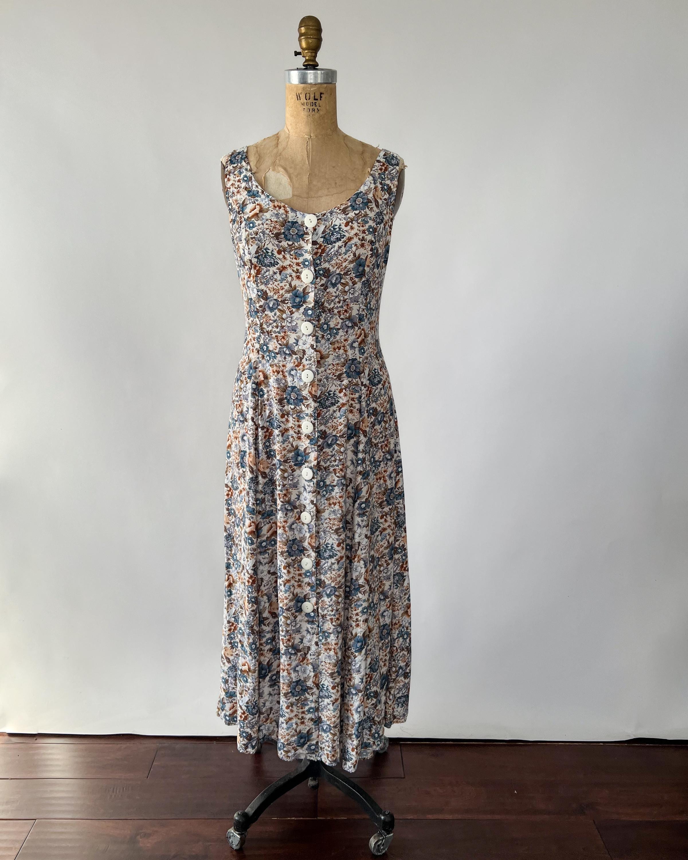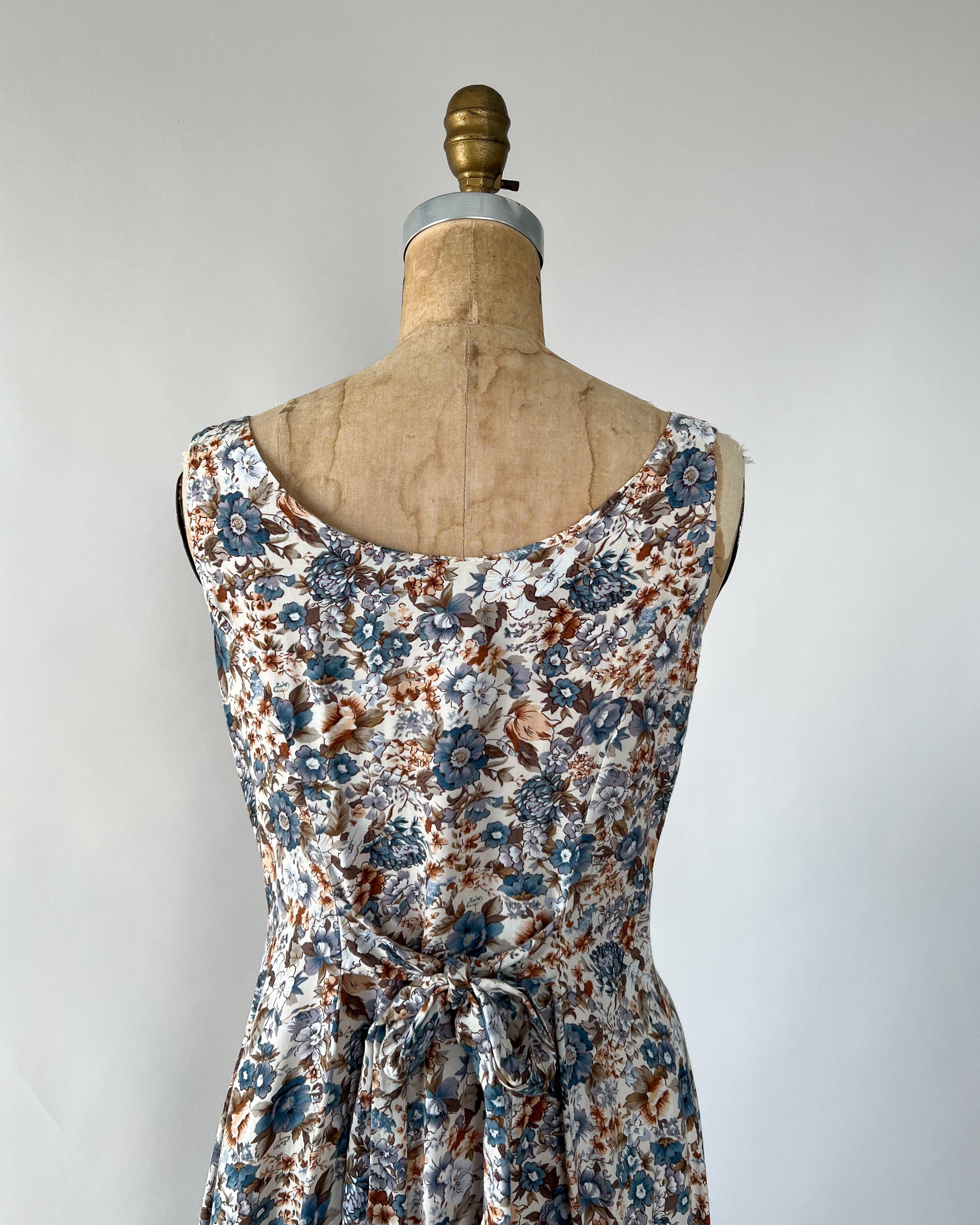 A gorgeous 1990s rayon midi dress with lovely blue and brown floral print! The sleeveless dress features a flattering fit with a scoop neckline and princess seaming, and a full, midi length skirt. Attatched ties in back to cinch the waist. Front button closure. Perfect to layer with a chunky cardigan!