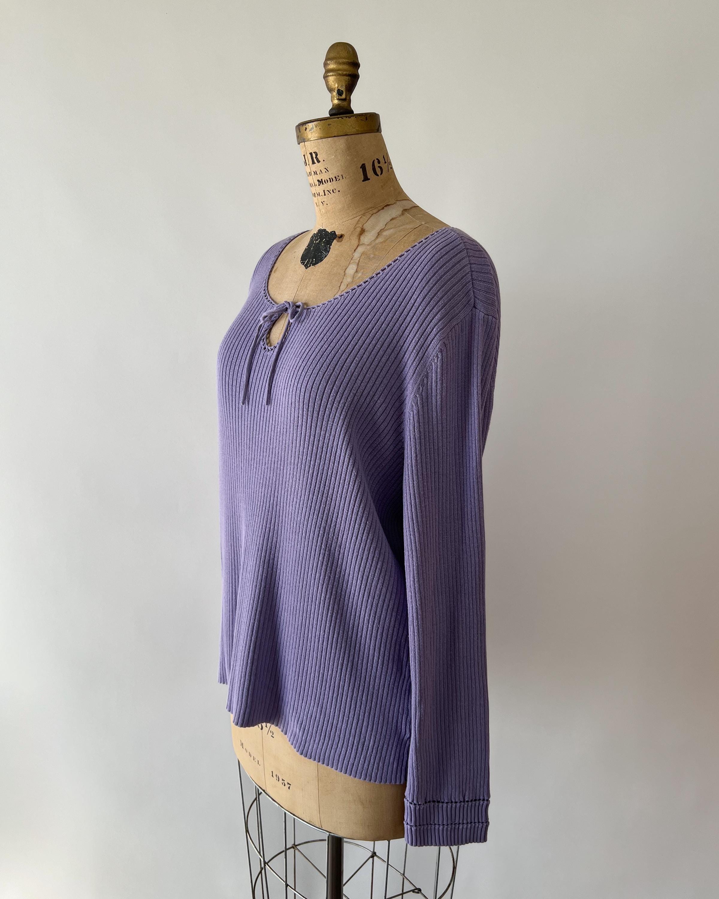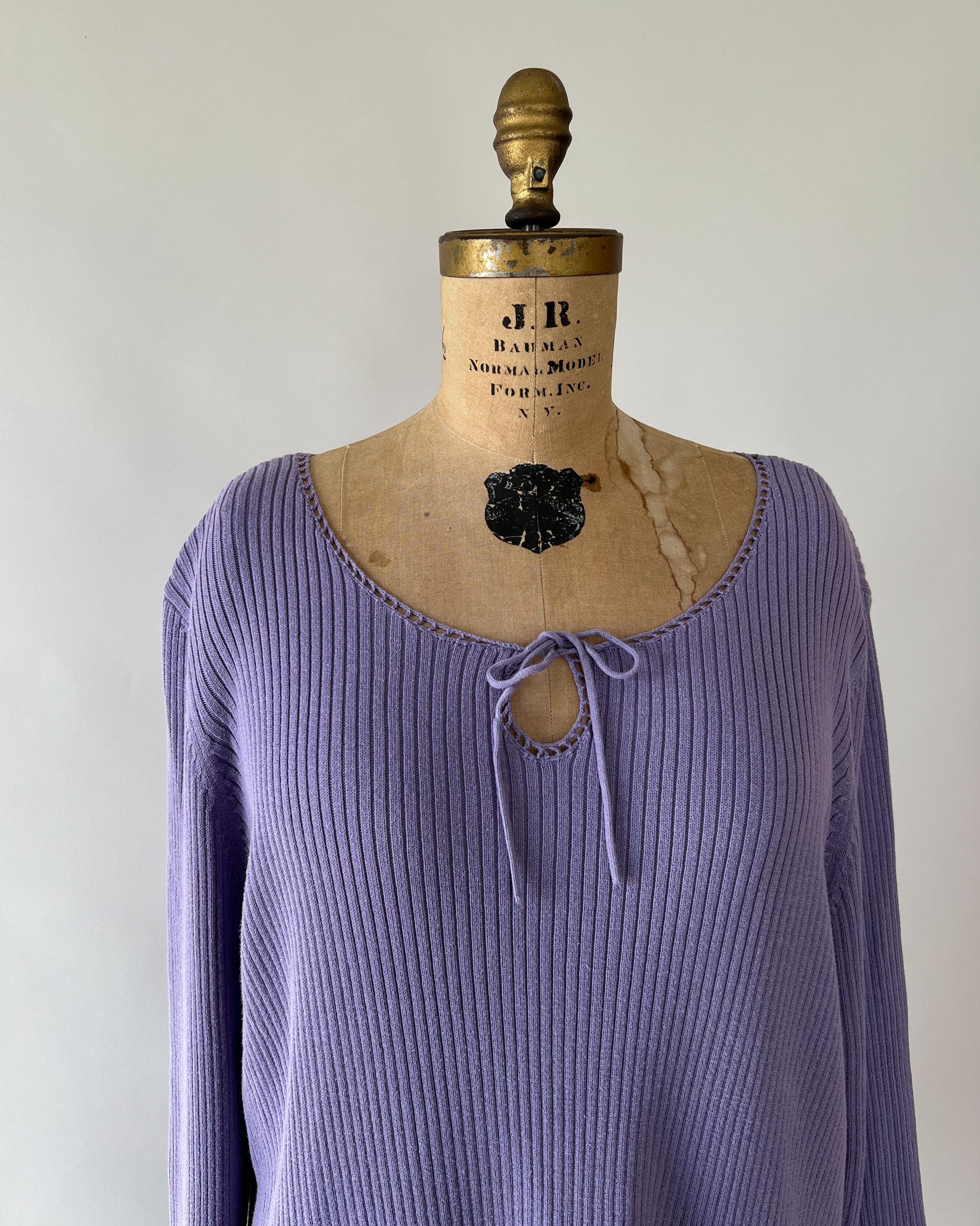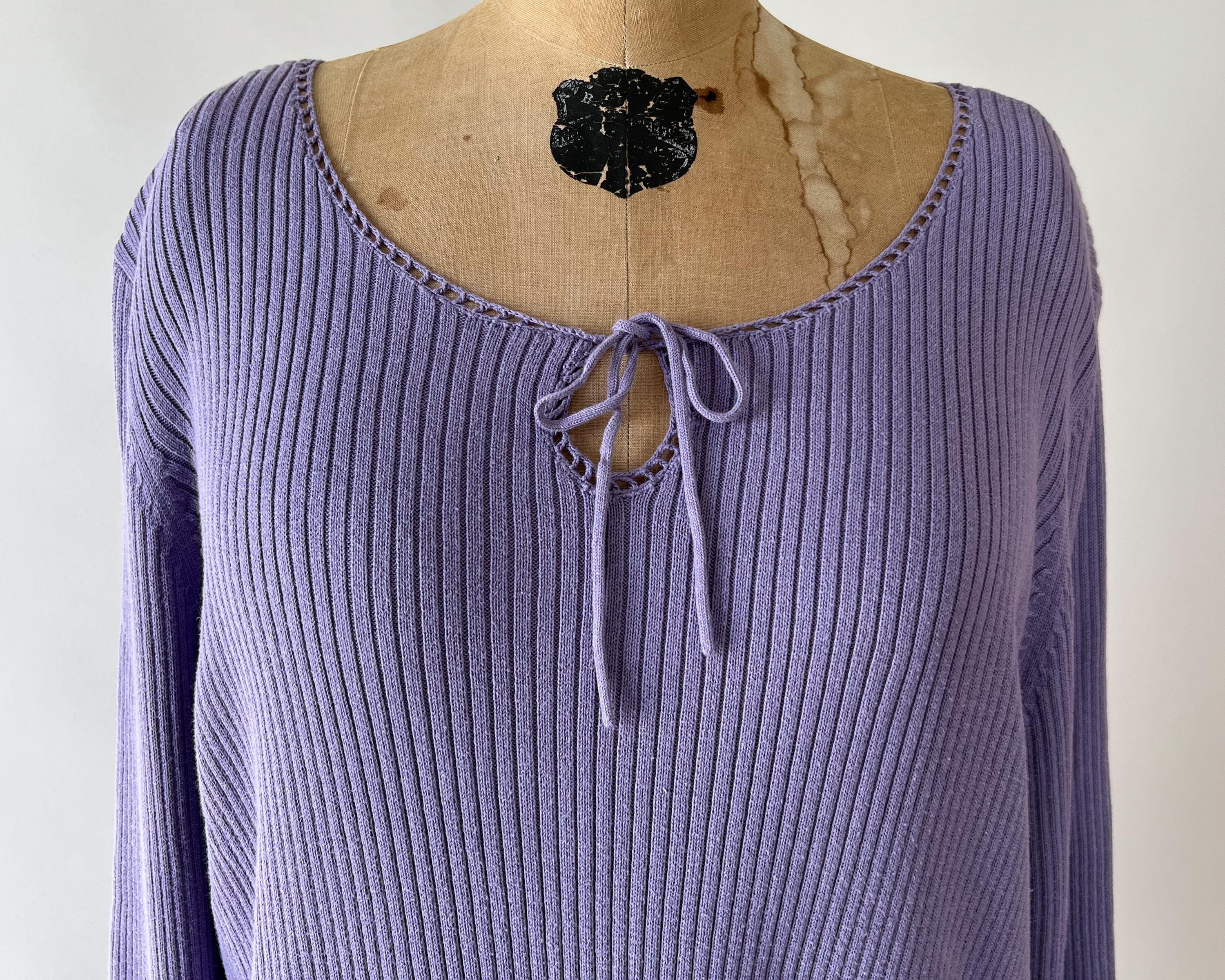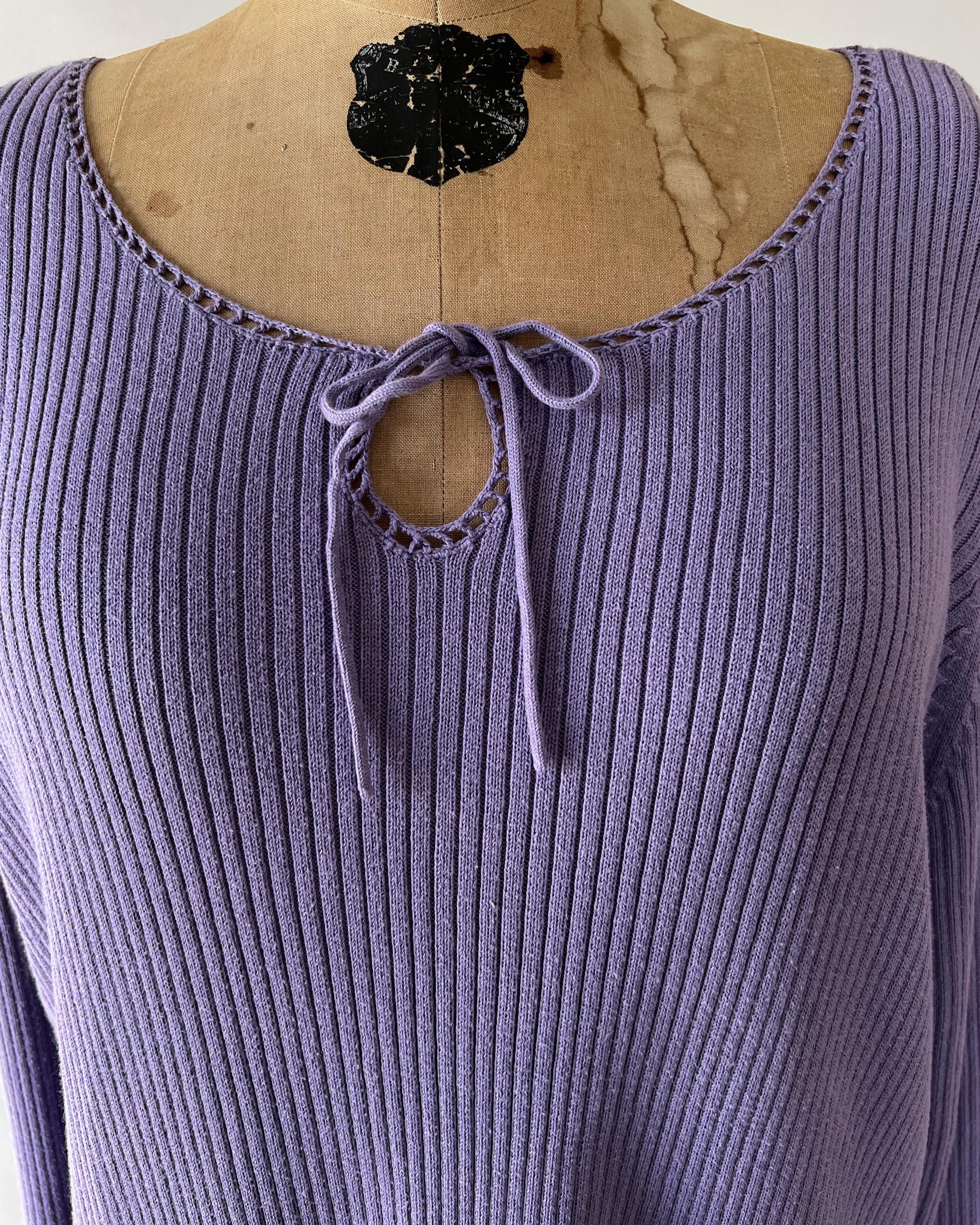 A late 1990s / early 2000s Y2K cotton blend rib knit sweater in a lovely purple shade. The top has a tie front keyhole neckline and long sleeves with a cutout detail.