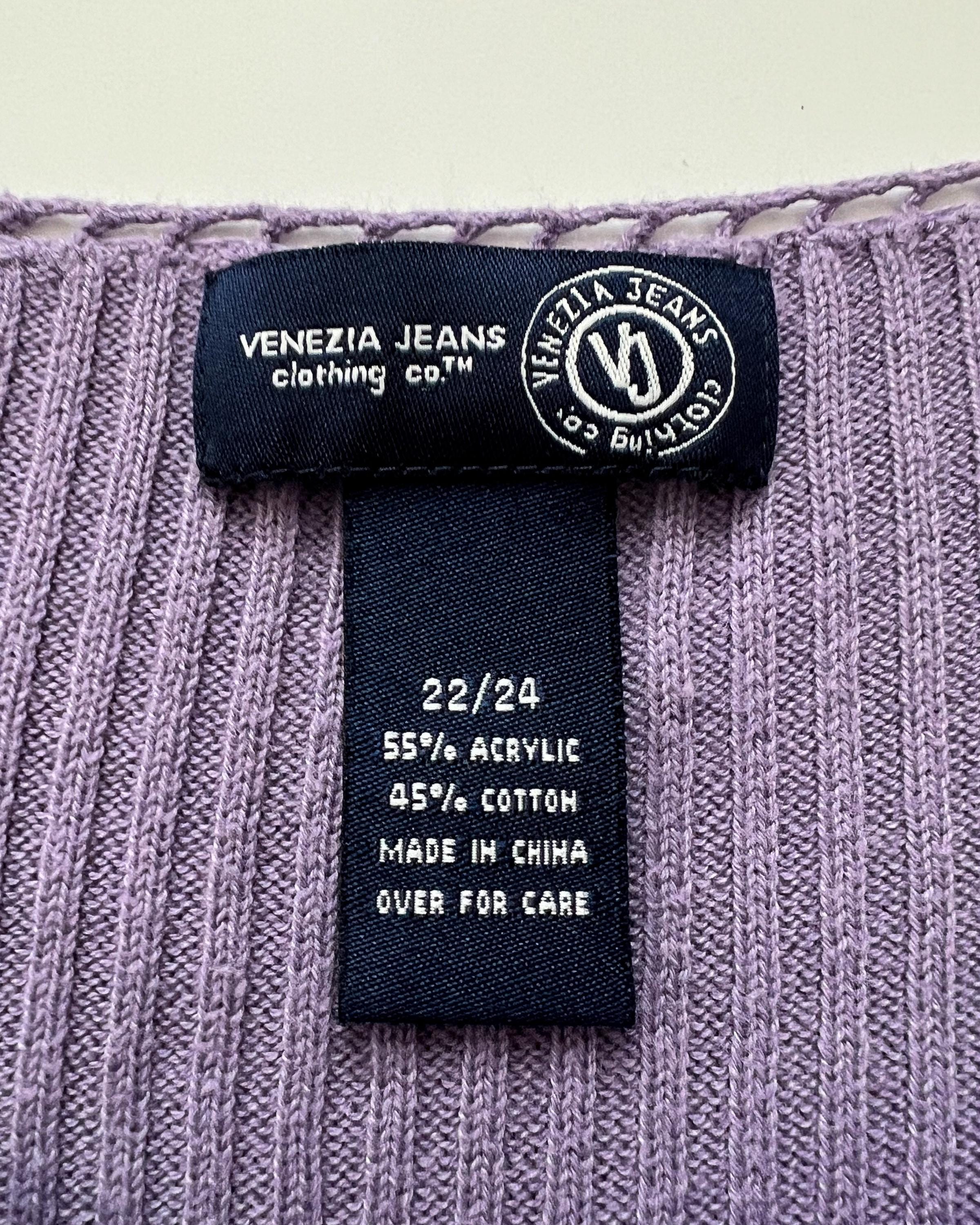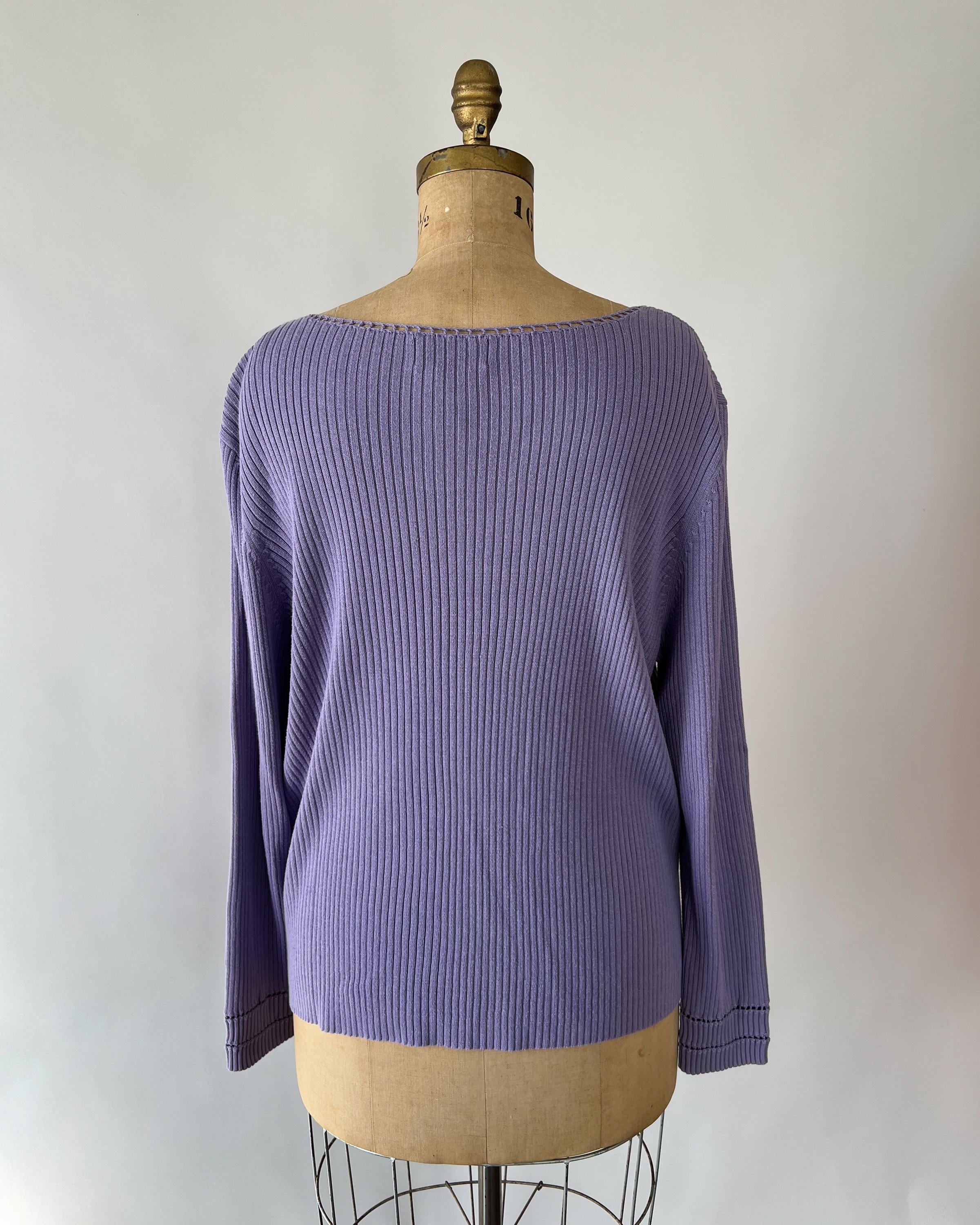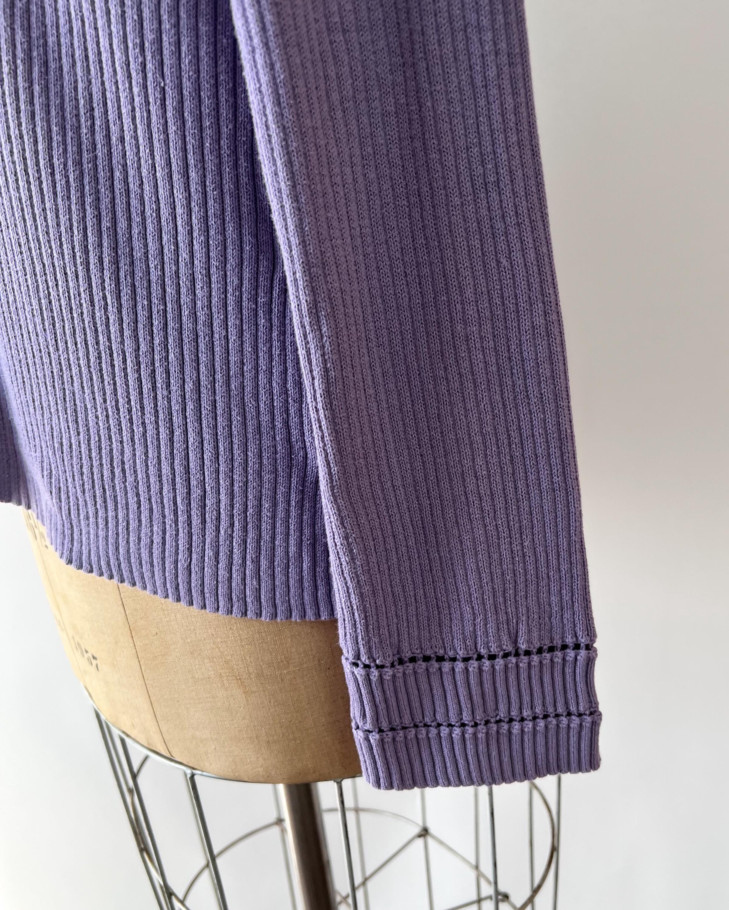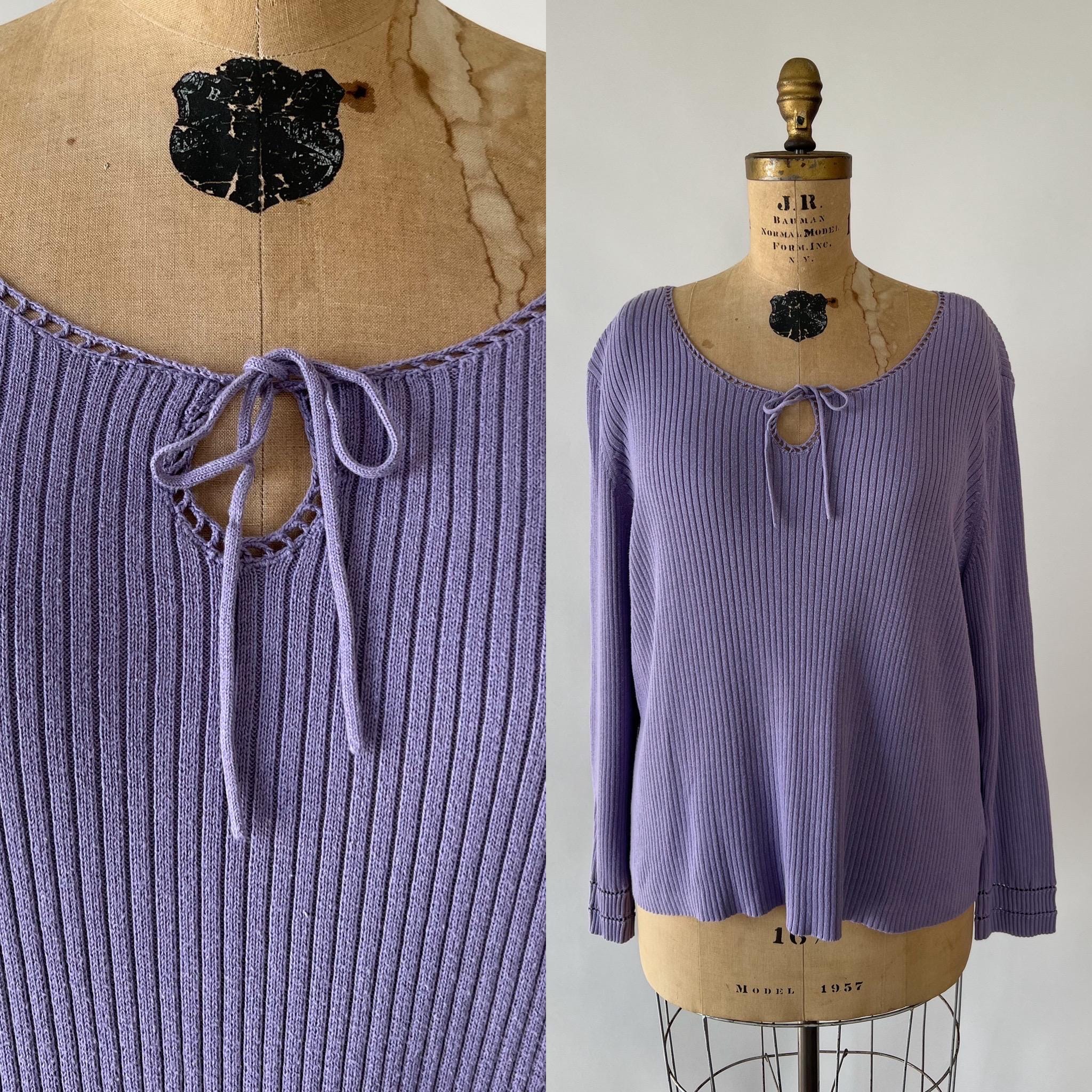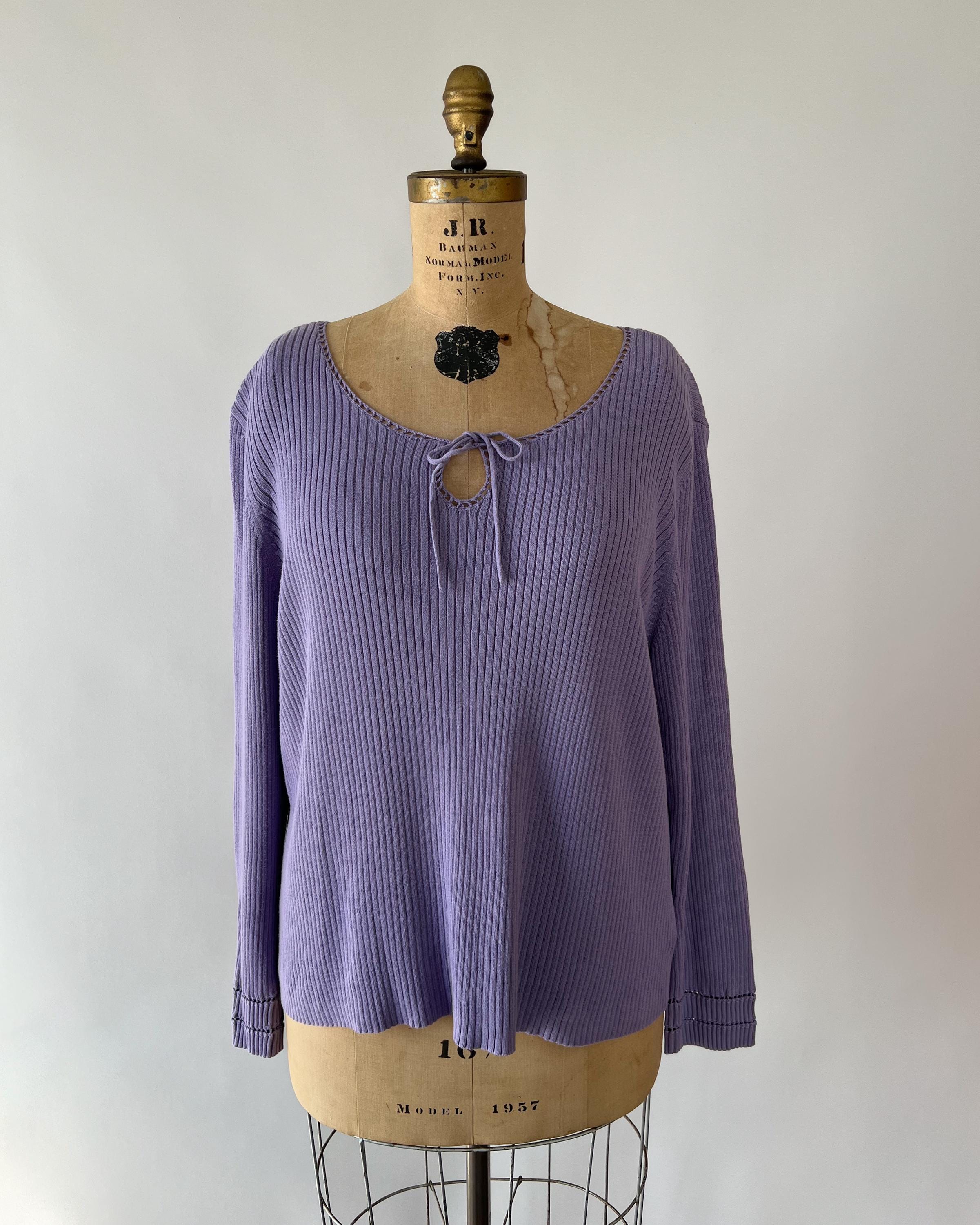 A late 1990s / early 2000s Y2K cotton blend rib knit sweater in a lovely purple shade. The top has a tie front keyhole neckline and long sleeves with a cutout detail.