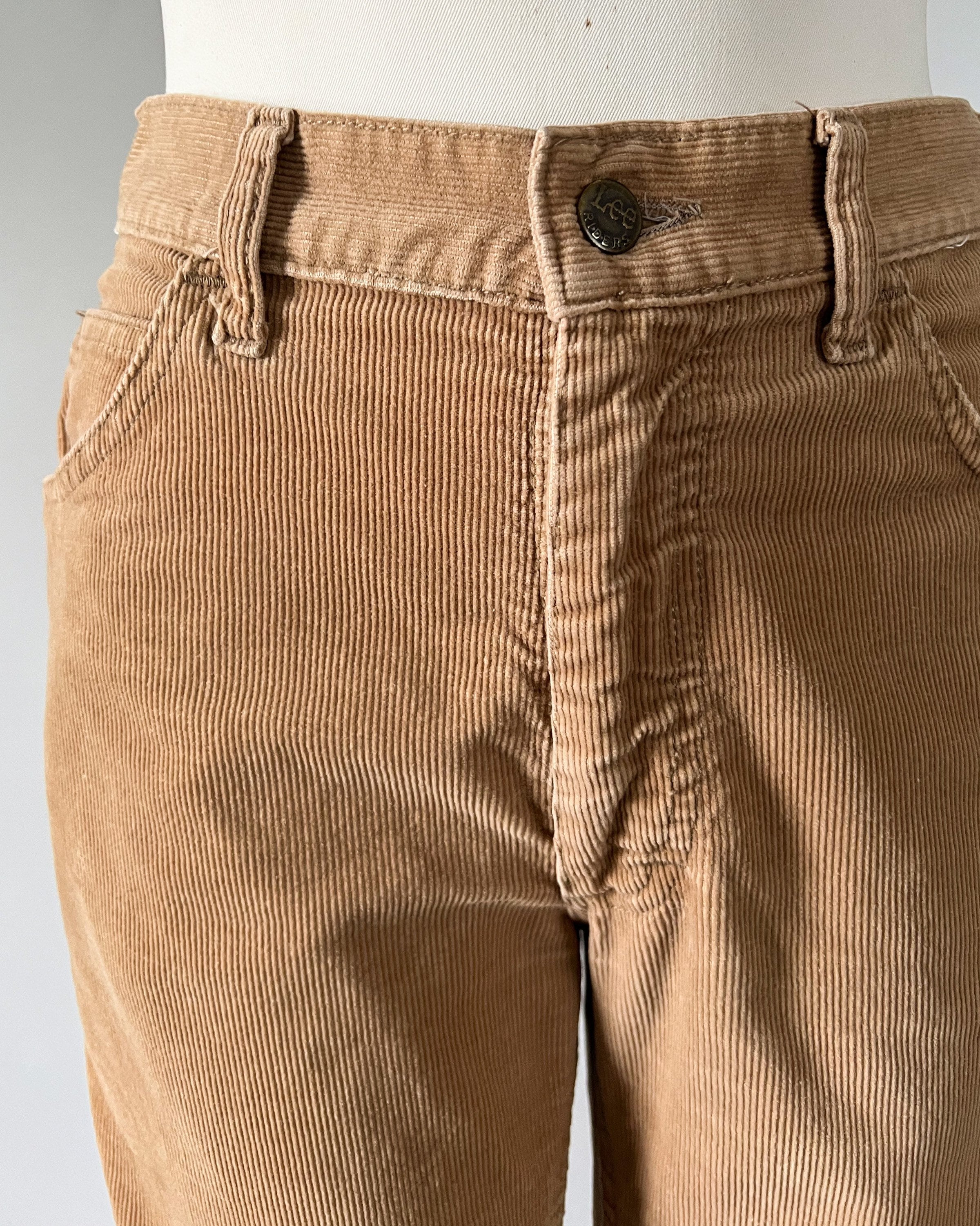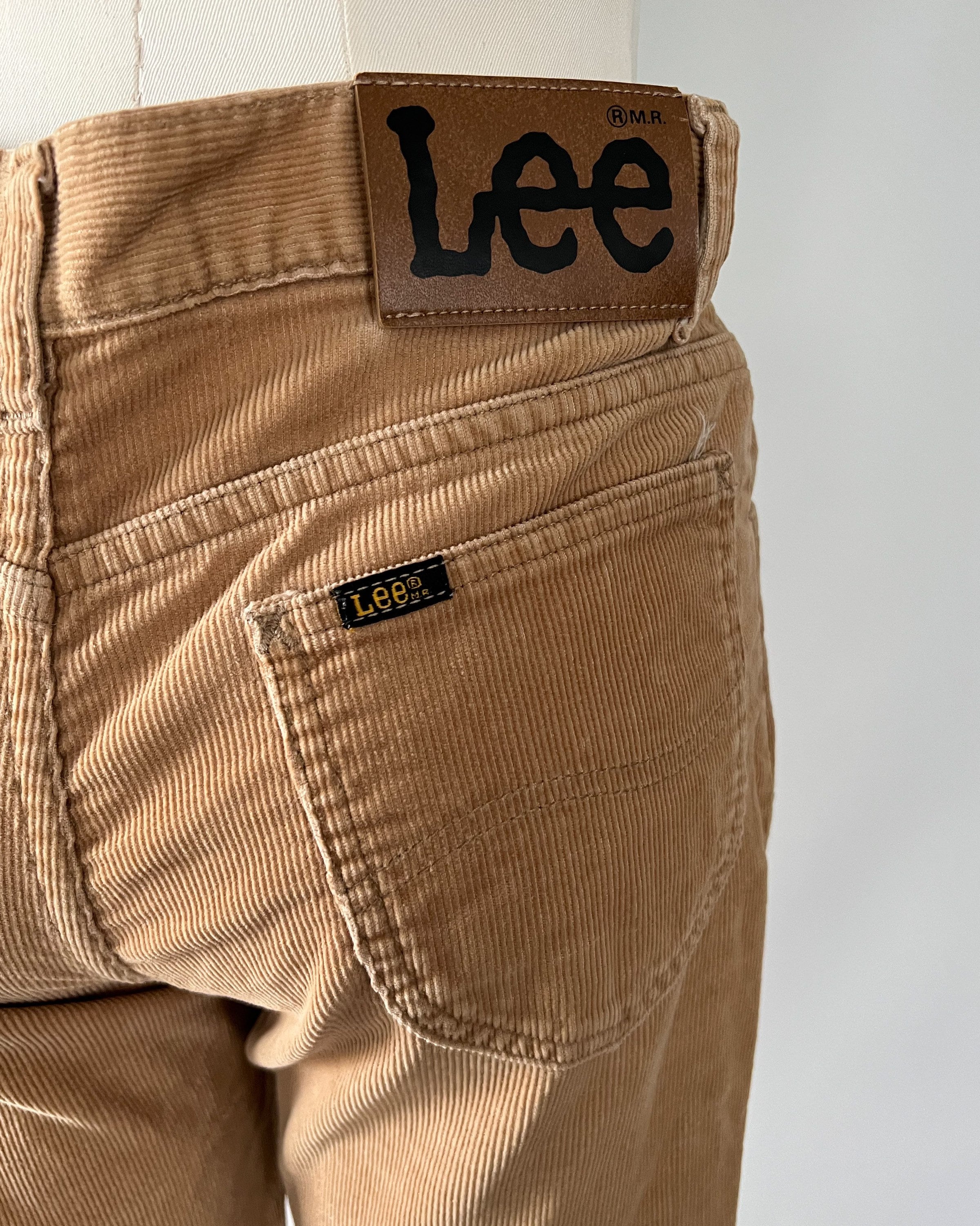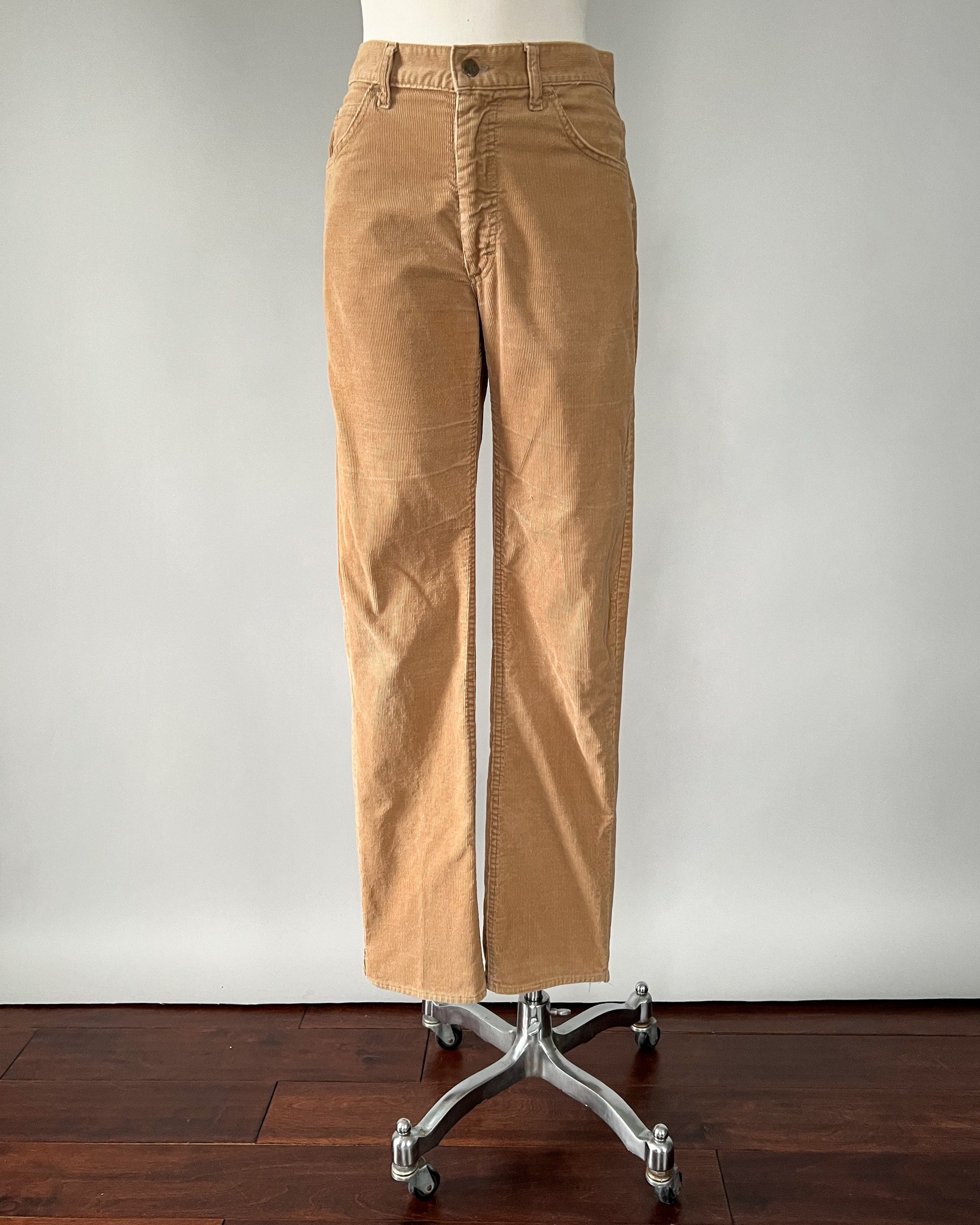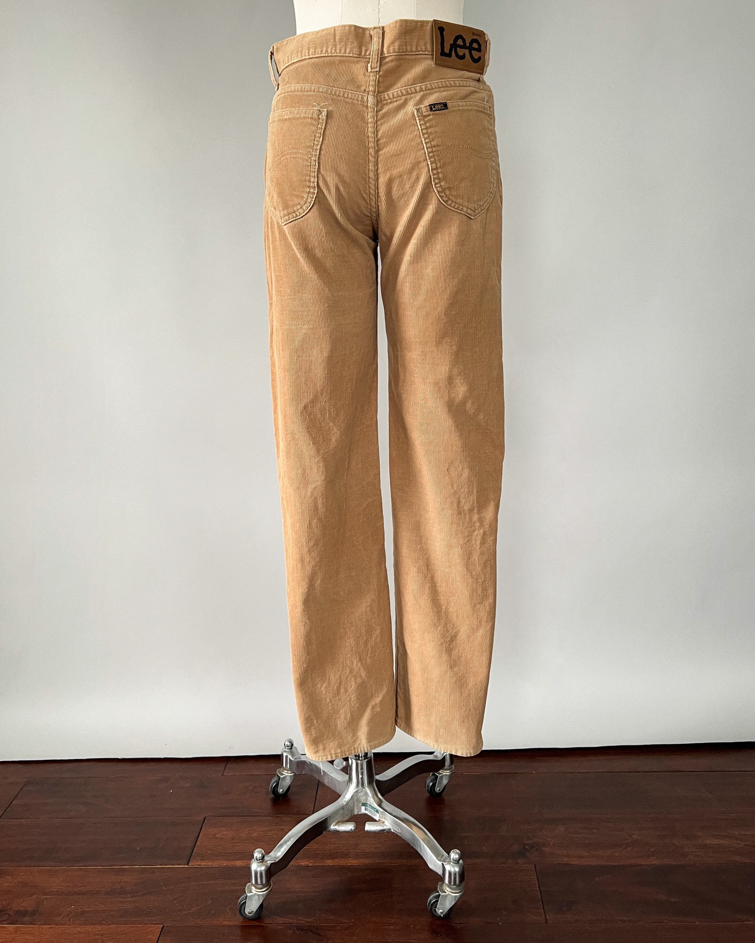 A great pair of 1980s tan corduroy pants by Lee. They have a high rise and a slim fit with slightly tapered legs. Perfect to pair with all your sweaters for the holidays!