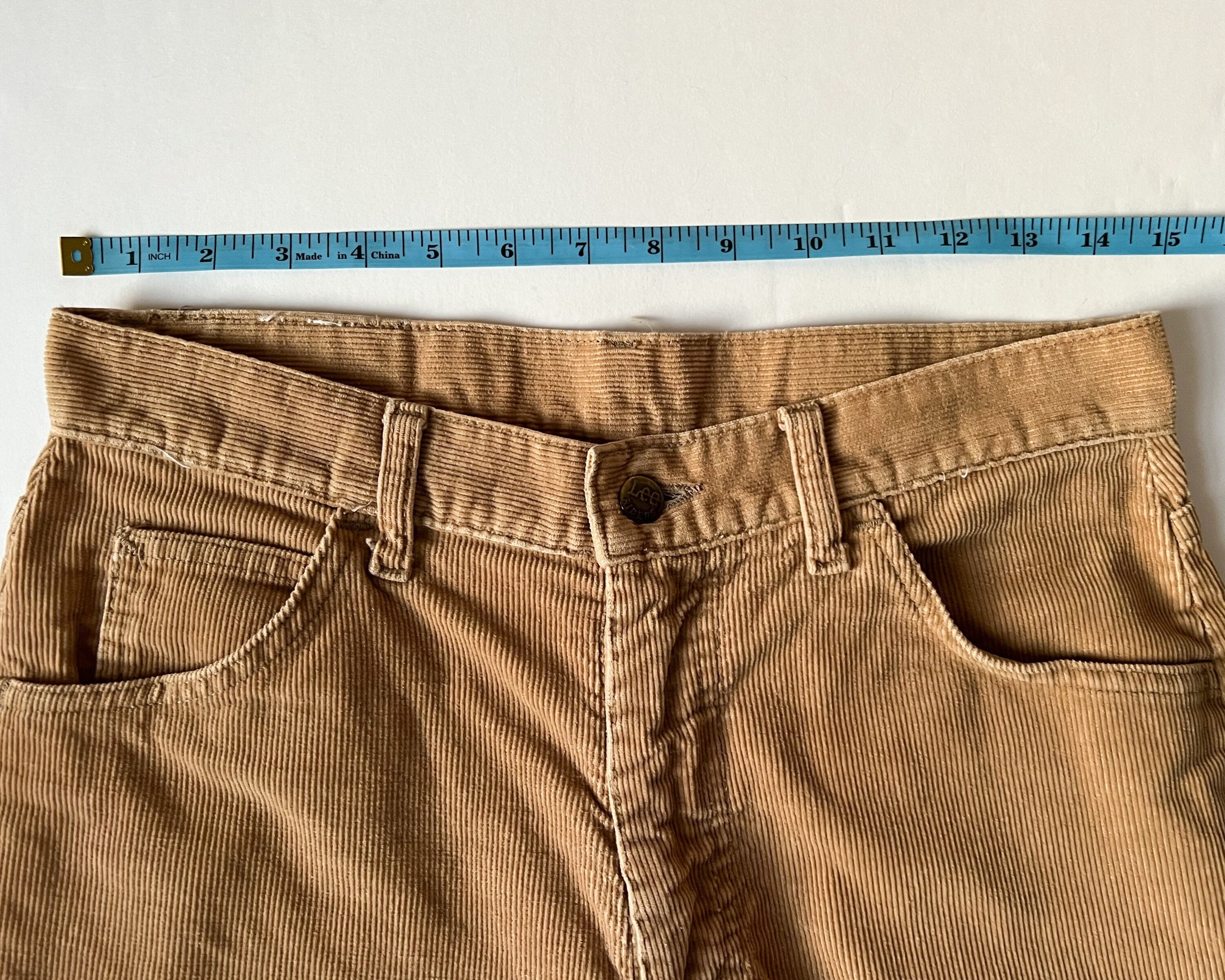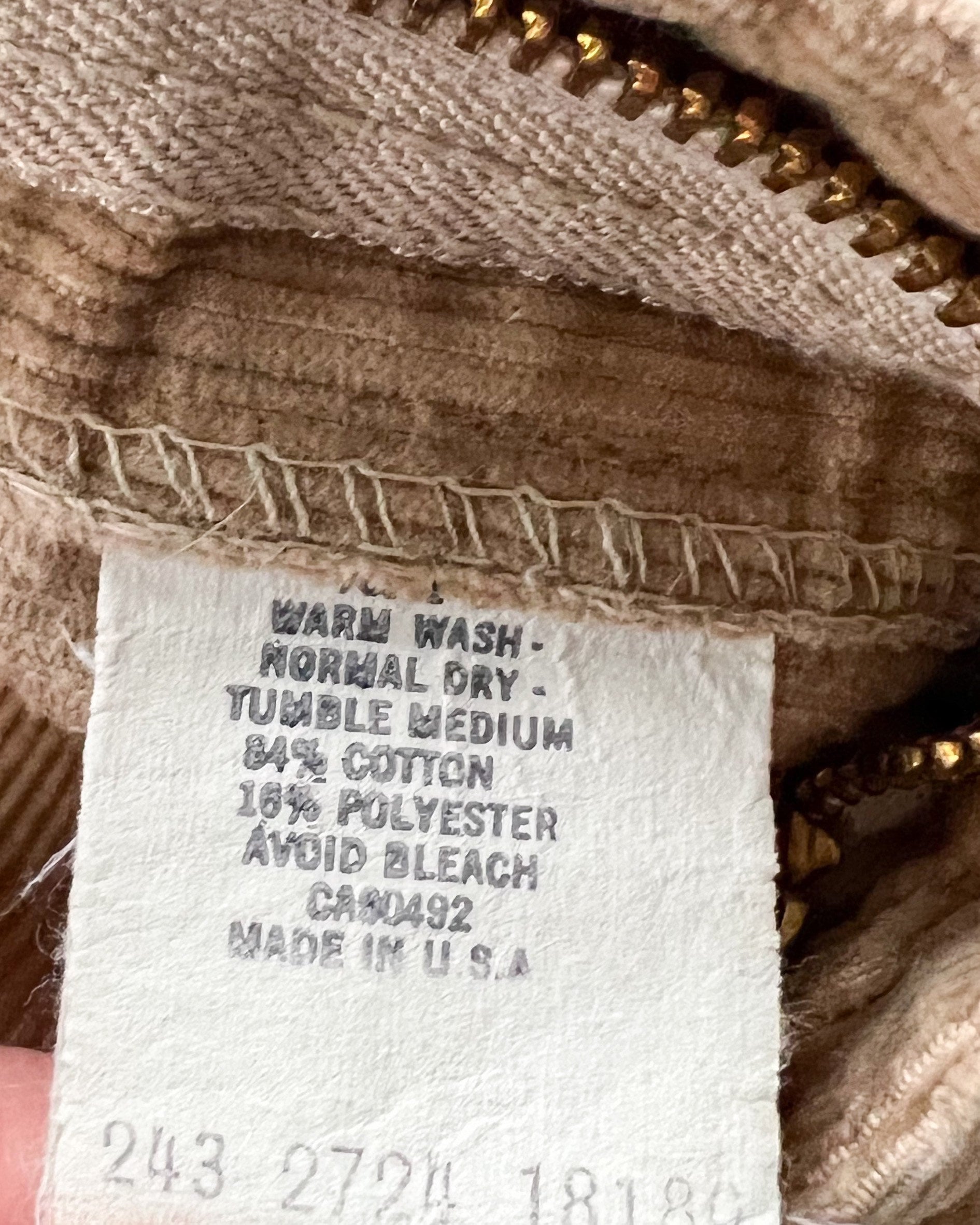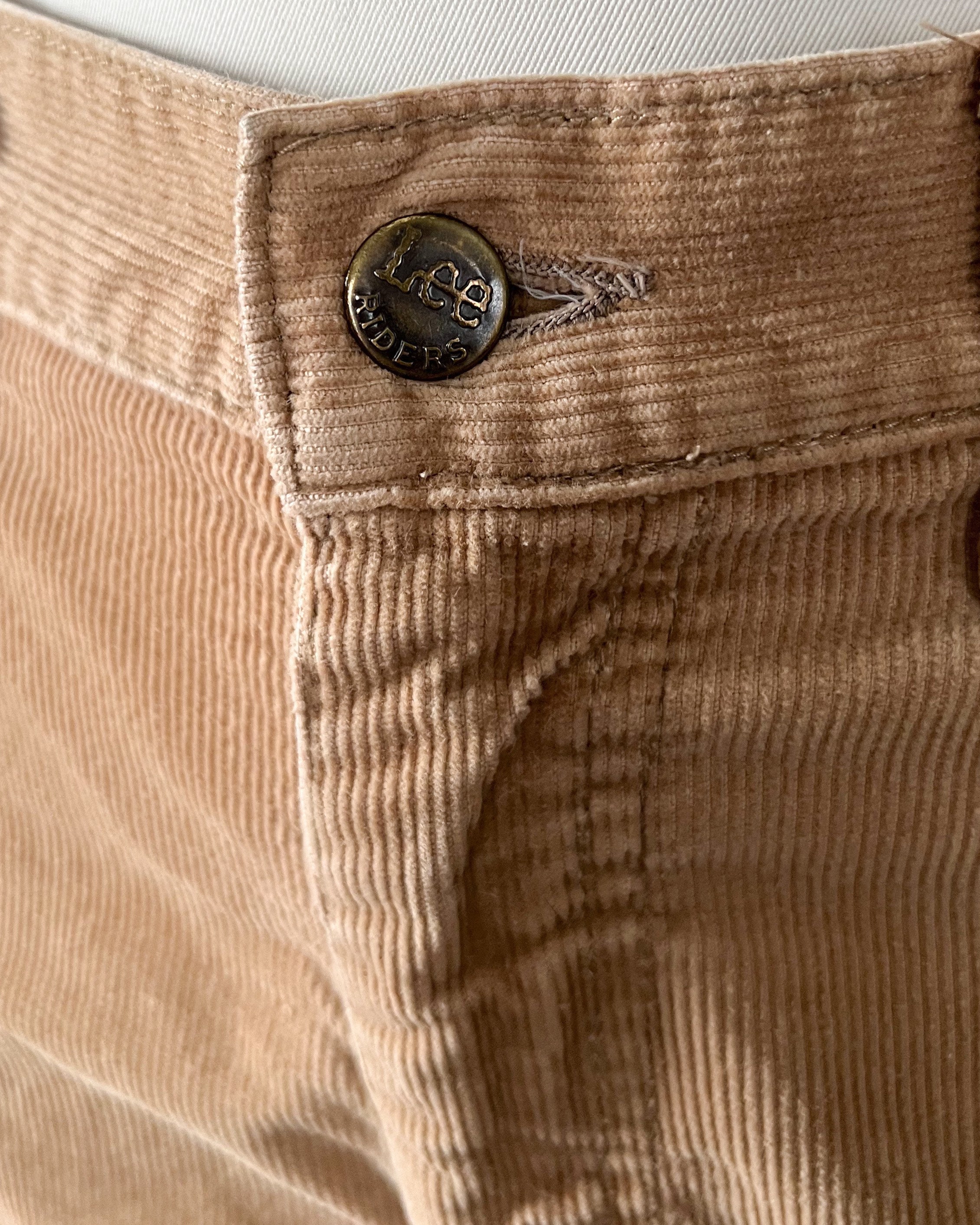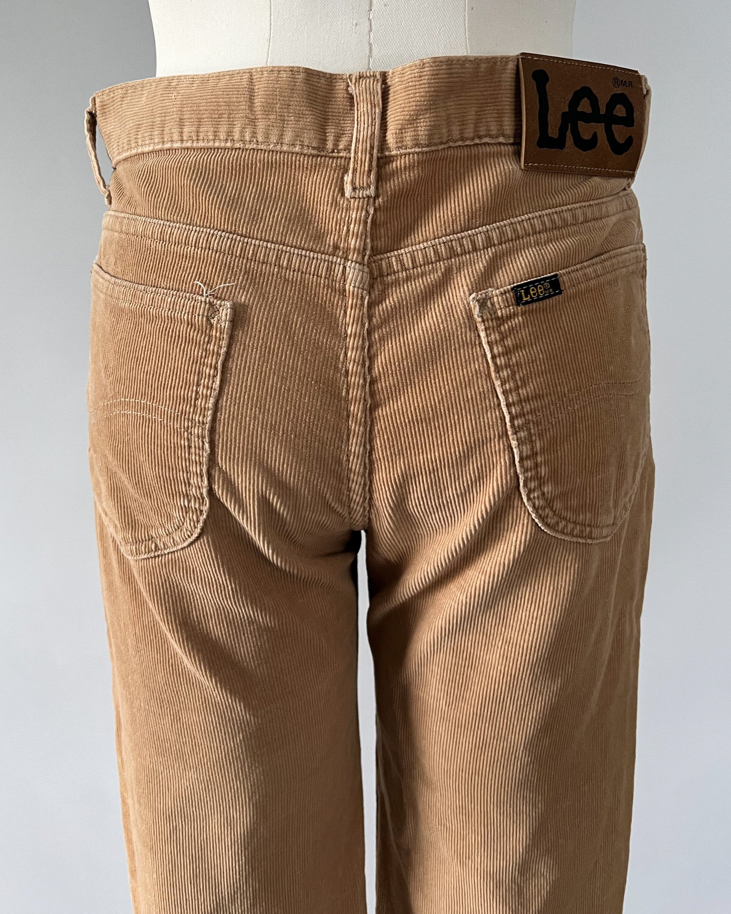 A great pair of 1980s tan corduroy pants by Lee. They have a high rise and a slim fit with slightly tapered legs. Perfect to pair with all your sweaters for the holidays!