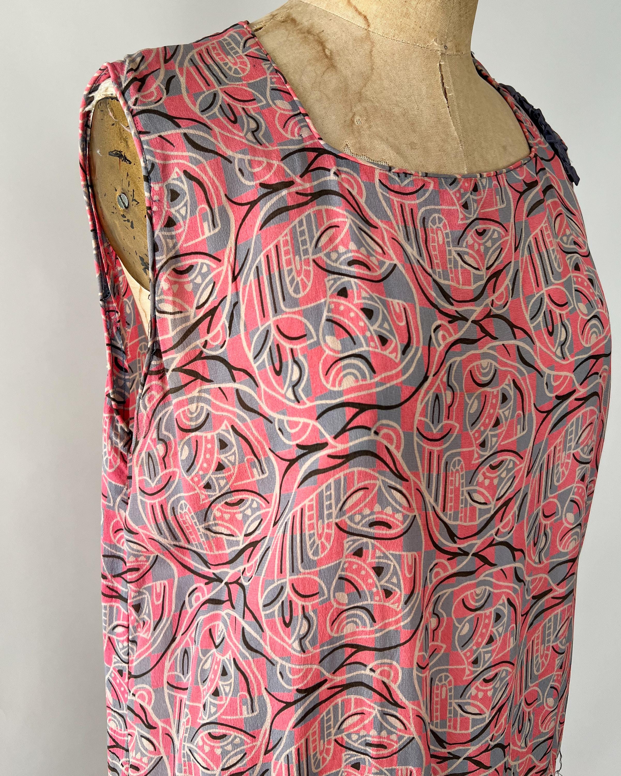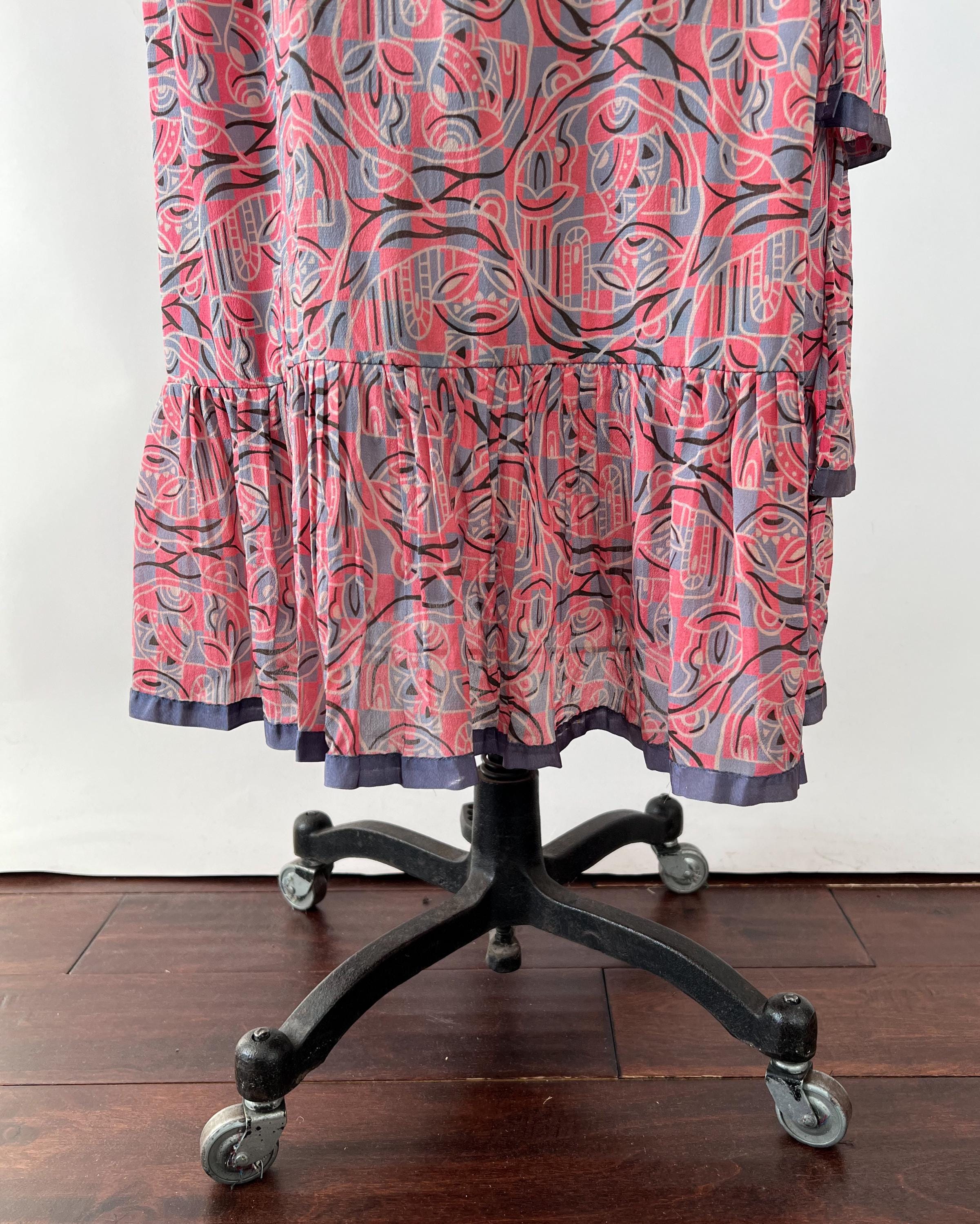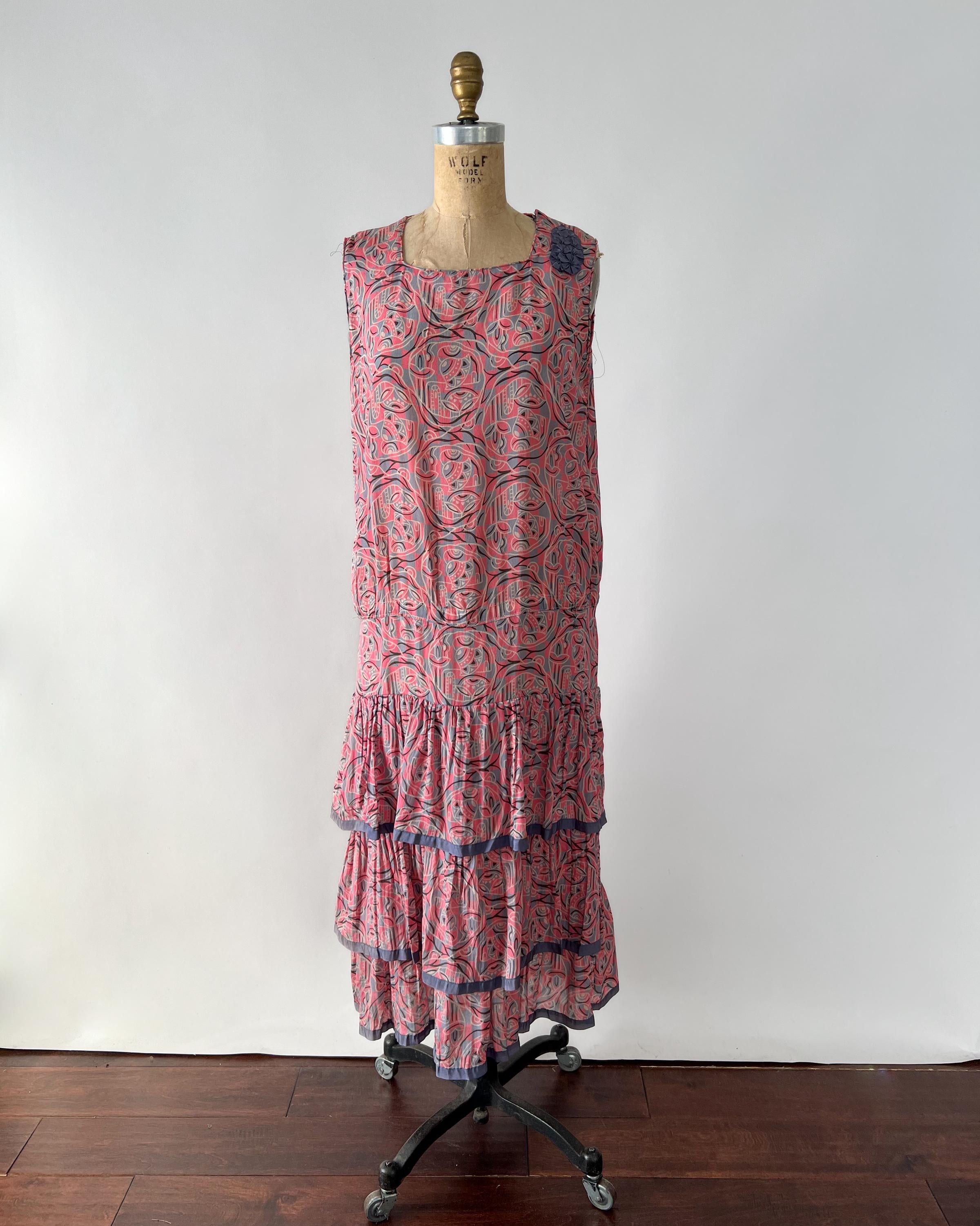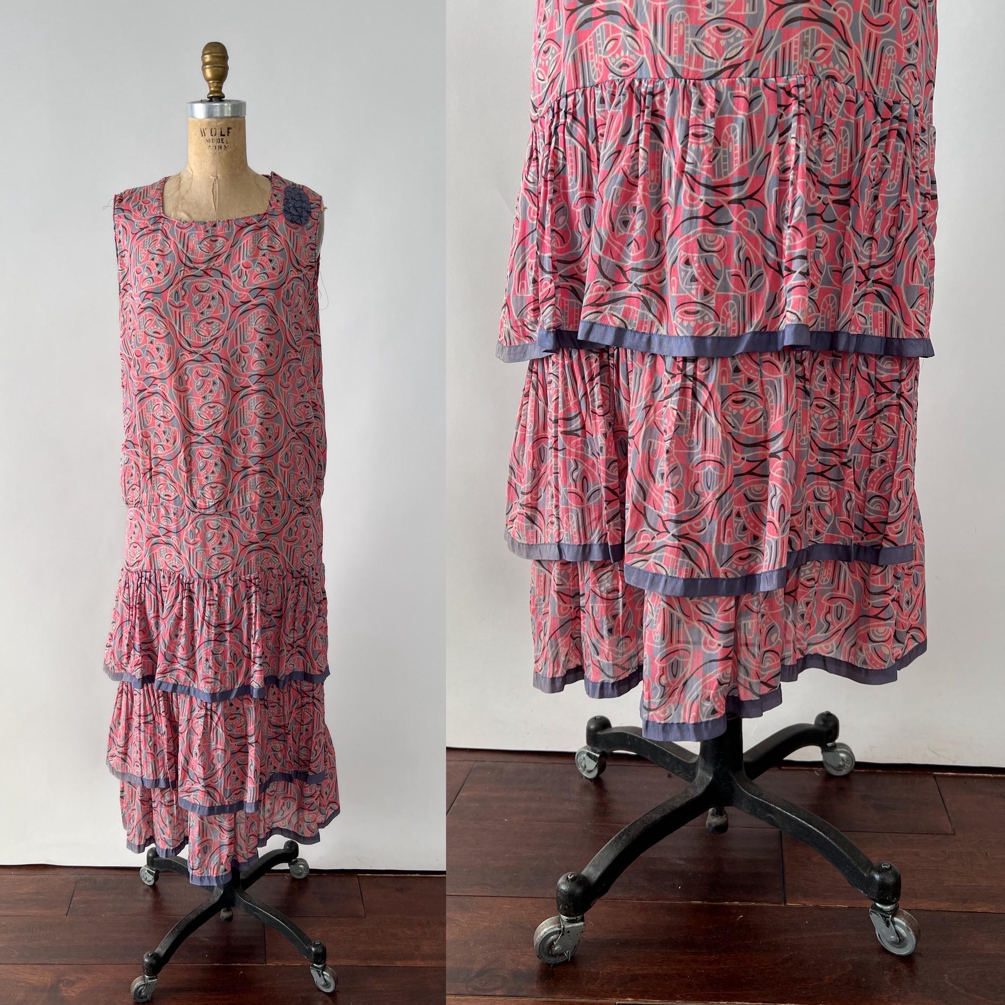 A gorgeous, vibrant flapper dress from the 1920s! Made from a beautiful blue and pink silk with a geometric print, the dress has a classic 20s drop-waist silhouette with a loose, blouson, sleeveless bodice, a low waistline, and a midi length ruffled skirt. The skirt features a ruffled hem with two additional ruffles in front, all of which are trimmed with coordinating blue gross grain. A sweet blue ribbon rossette adorns one shoulder. Side snap / hook and eye closure. Such a striking dress in wonderful, wearable condition!