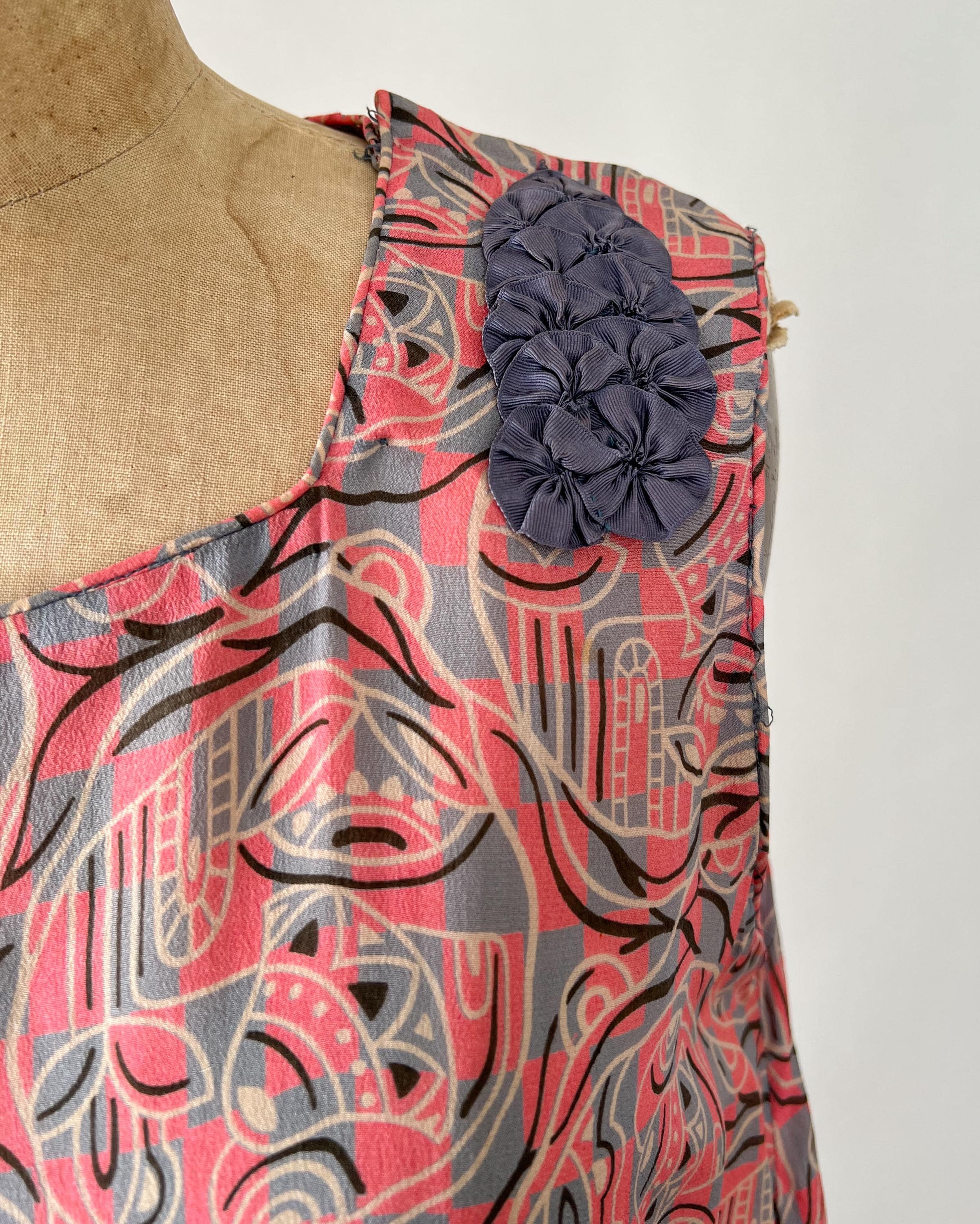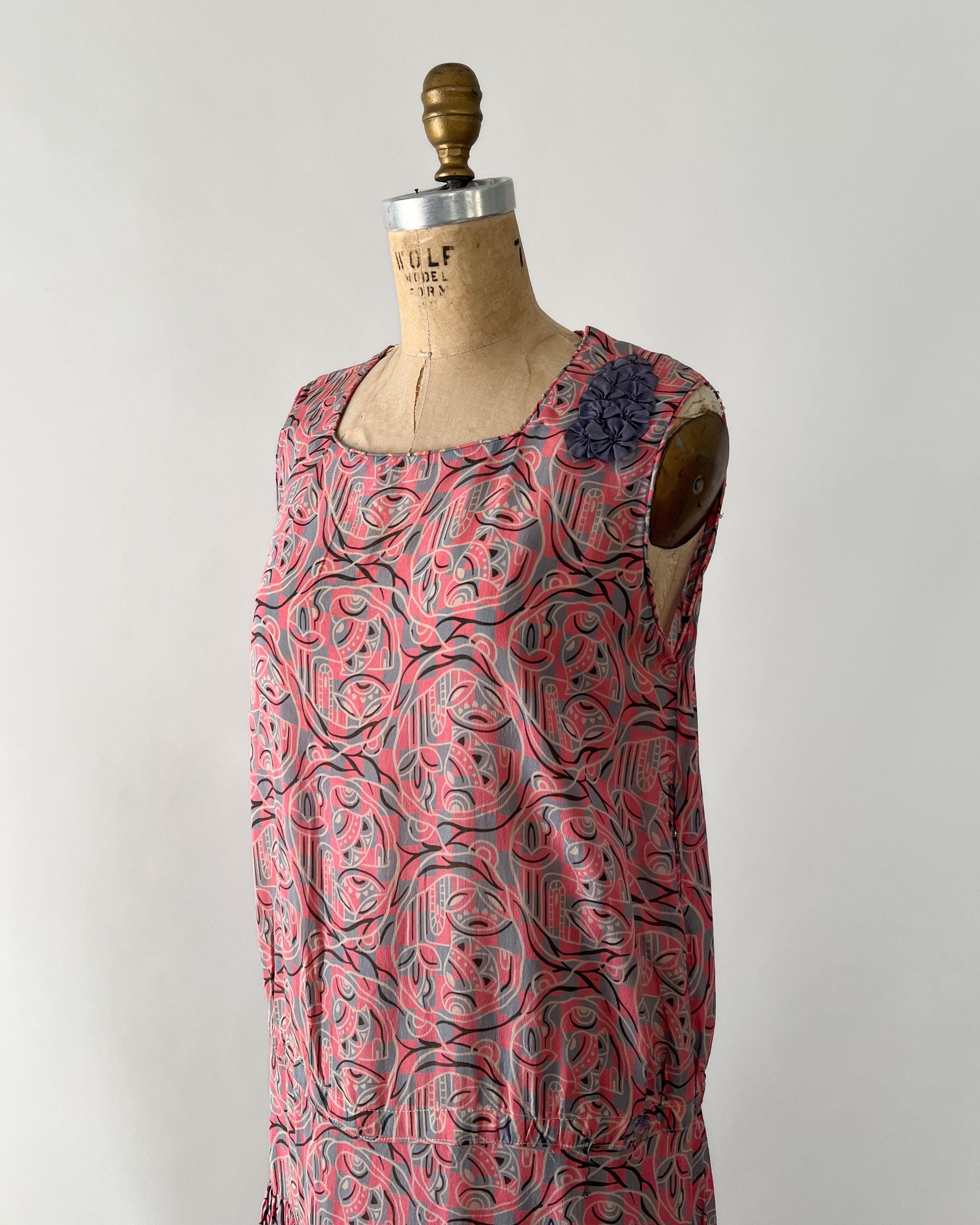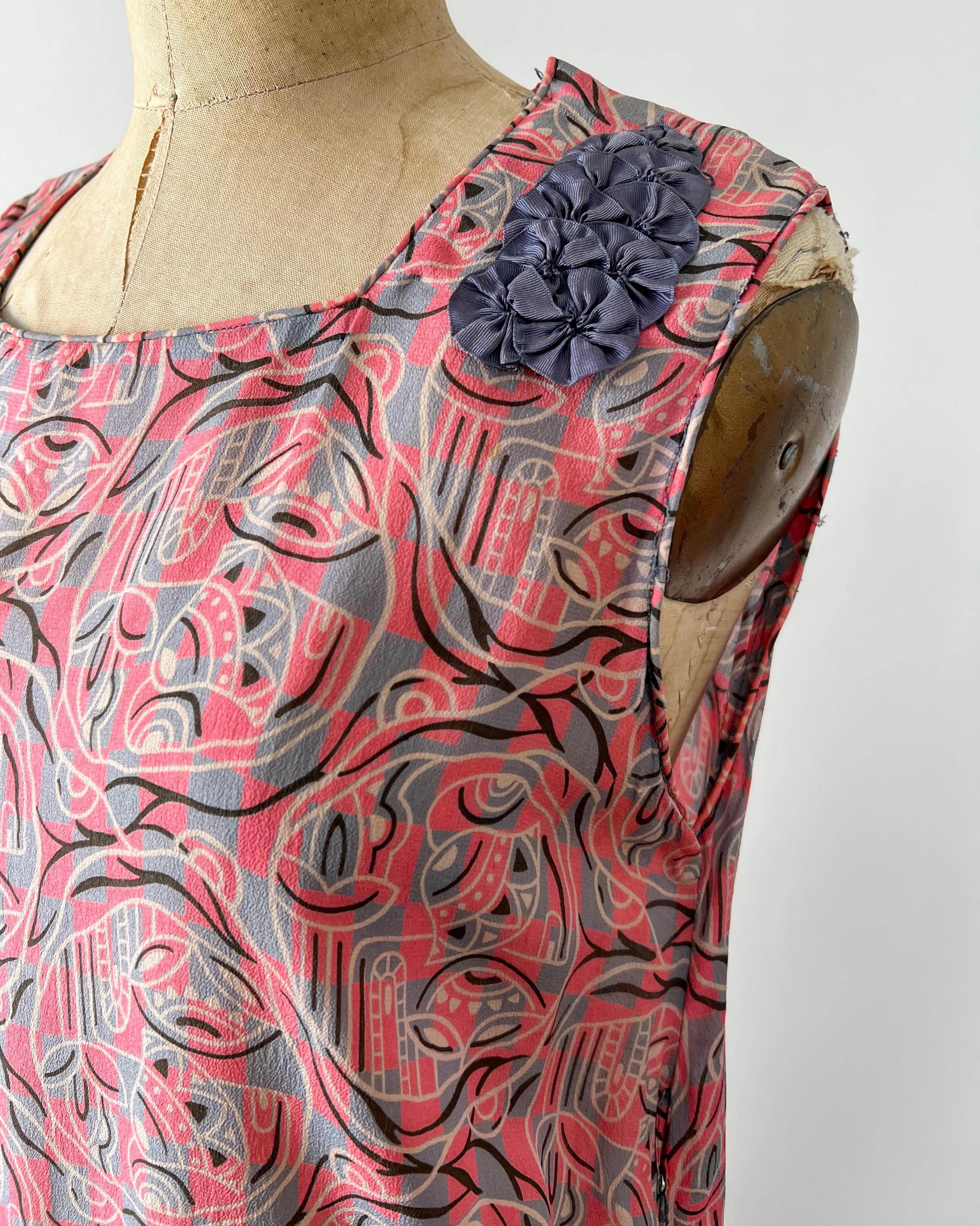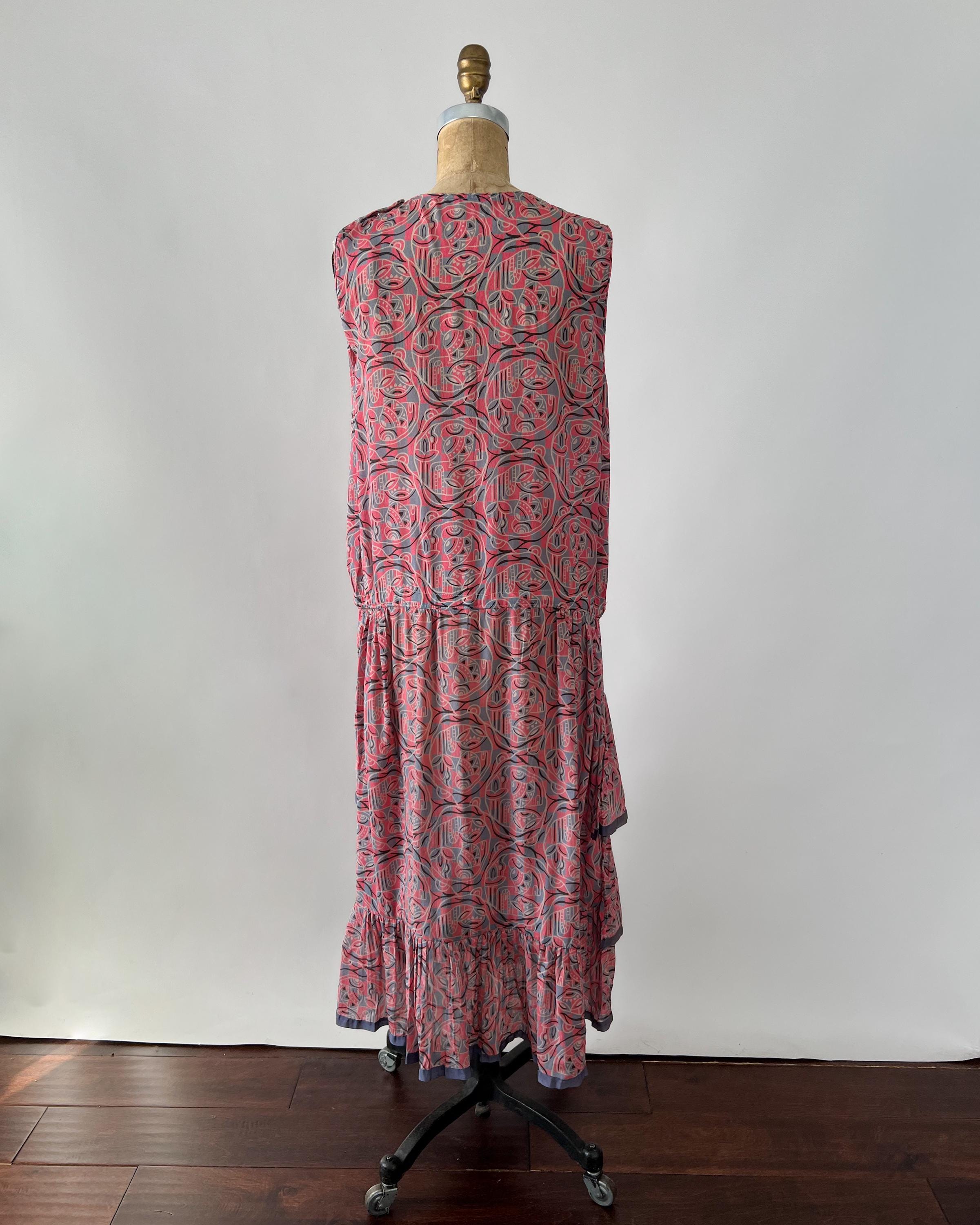 A gorgeous, vibrant flapper dress from the 1920s! Made from a beautiful blue and pink silk with a geometric print, the dress has a classic 20s drop-waist silhouette with a loose, blouson, sleeveless bodice, a low waistline, and a midi length ruffled skirt. The skirt features a ruffled hem with two additional ruffles in front, all of which are trimmed with coordinating blue gross grain. A sweet blue ribbon rossette adorns one shoulder. Side snap / hook and eye closure. Such a striking dress in wonderful, wearable condition!