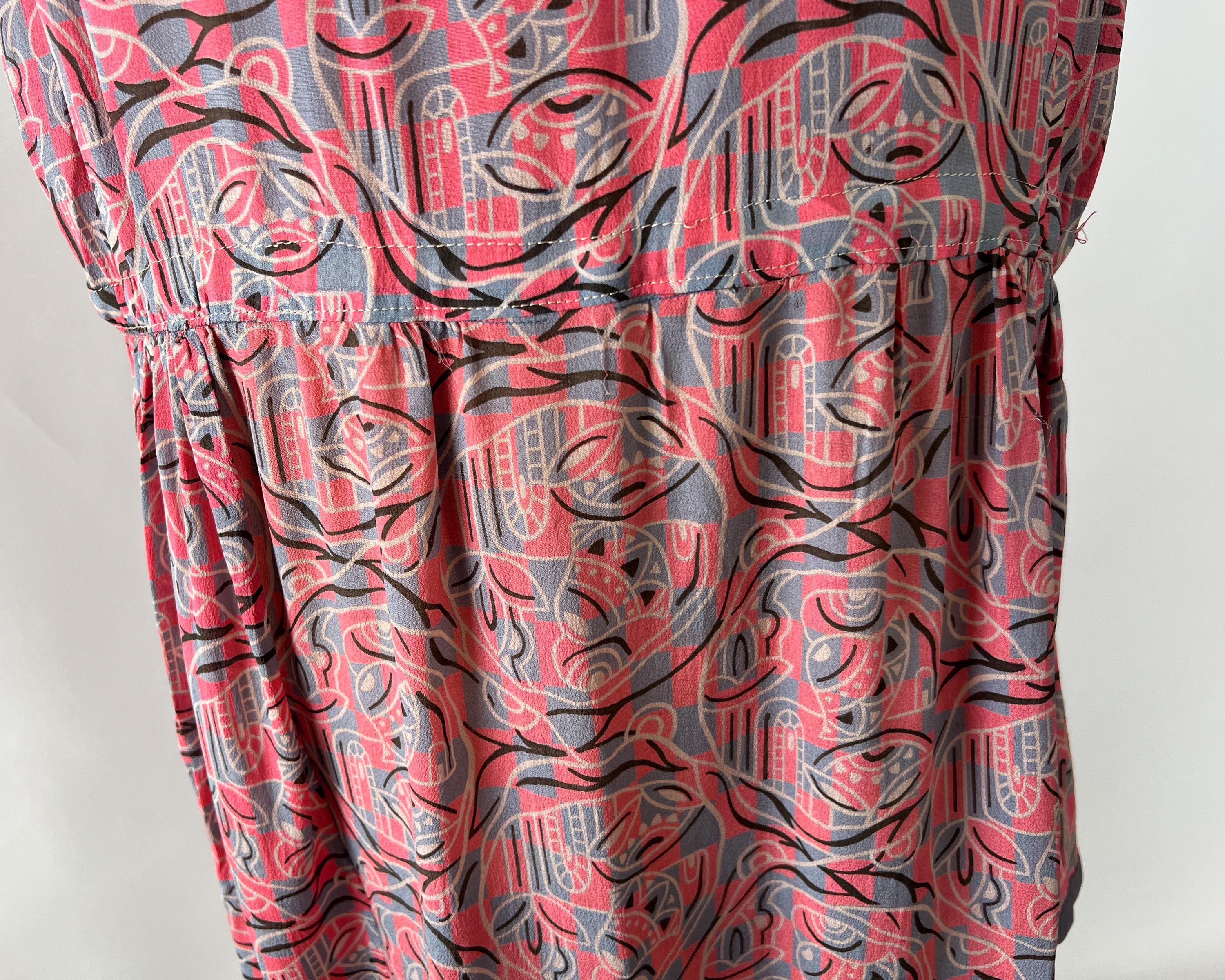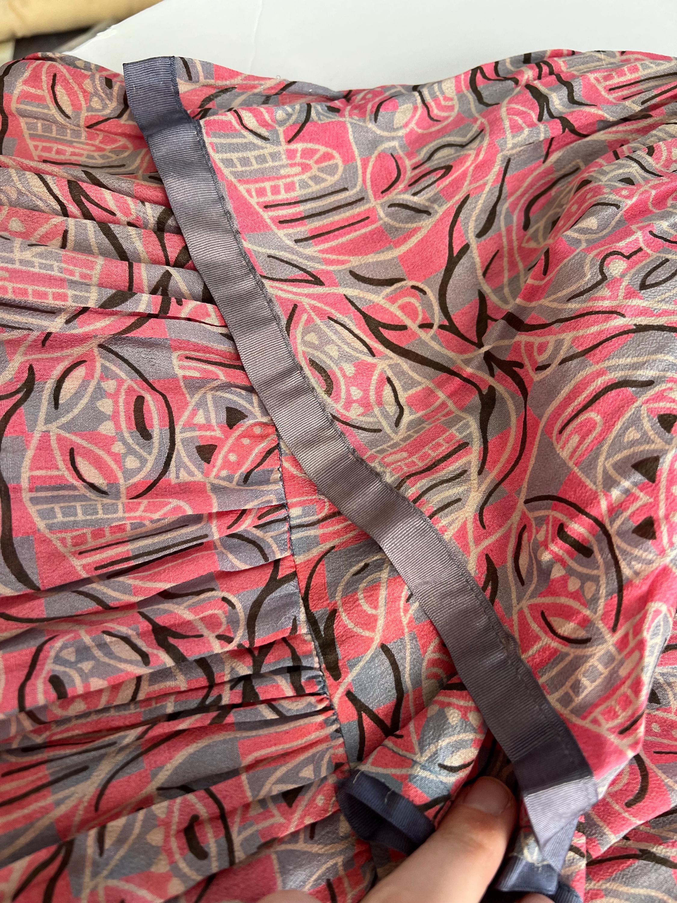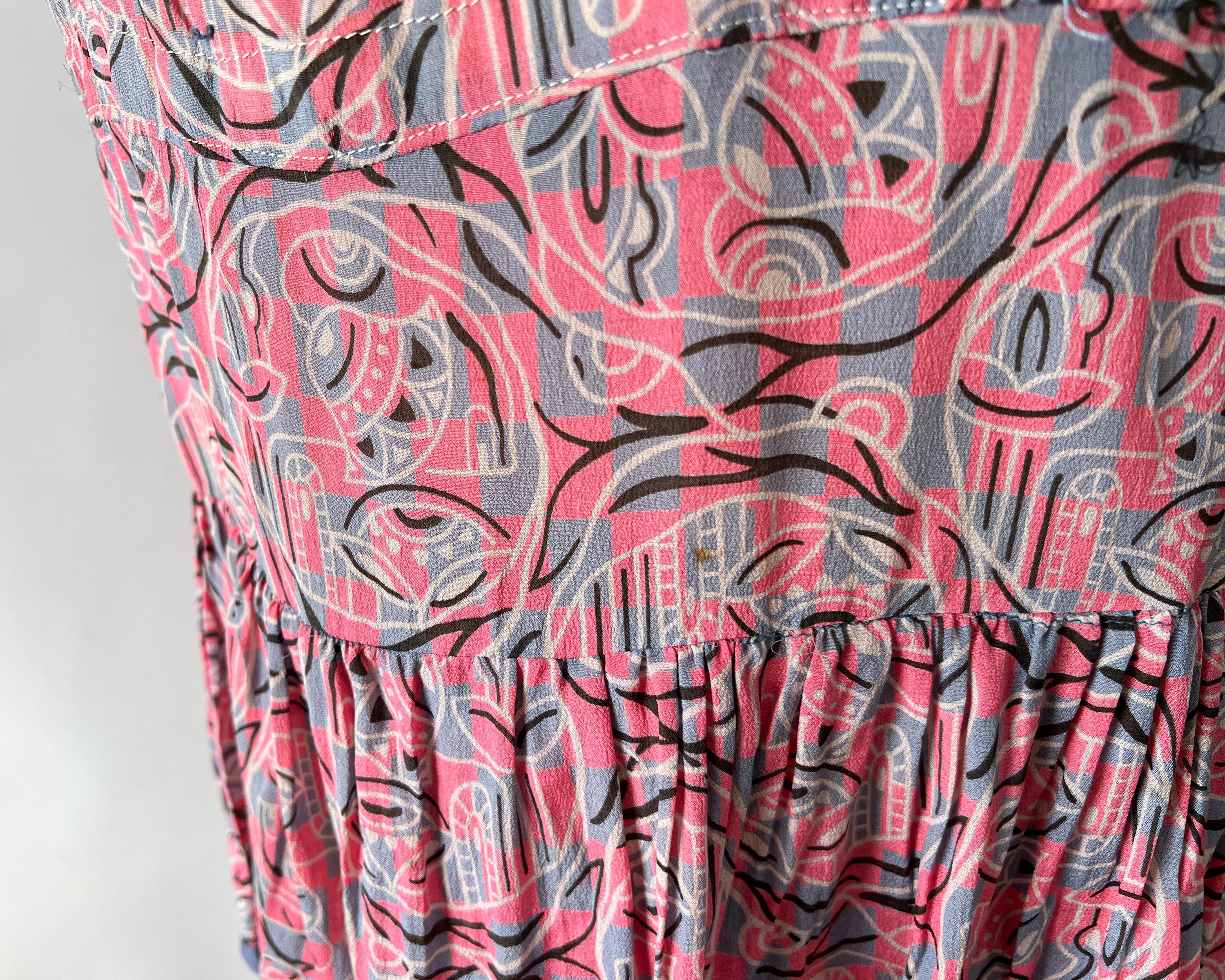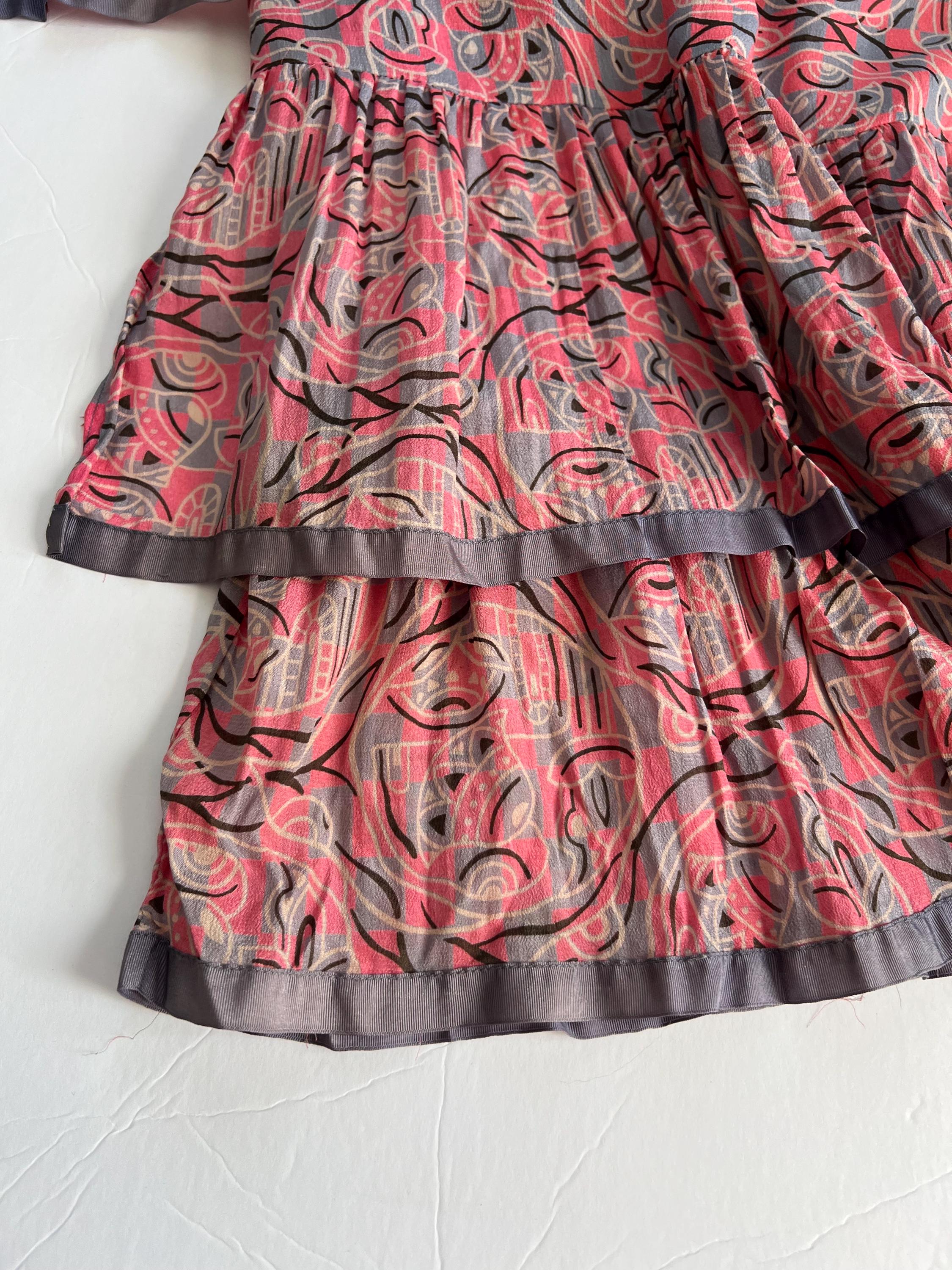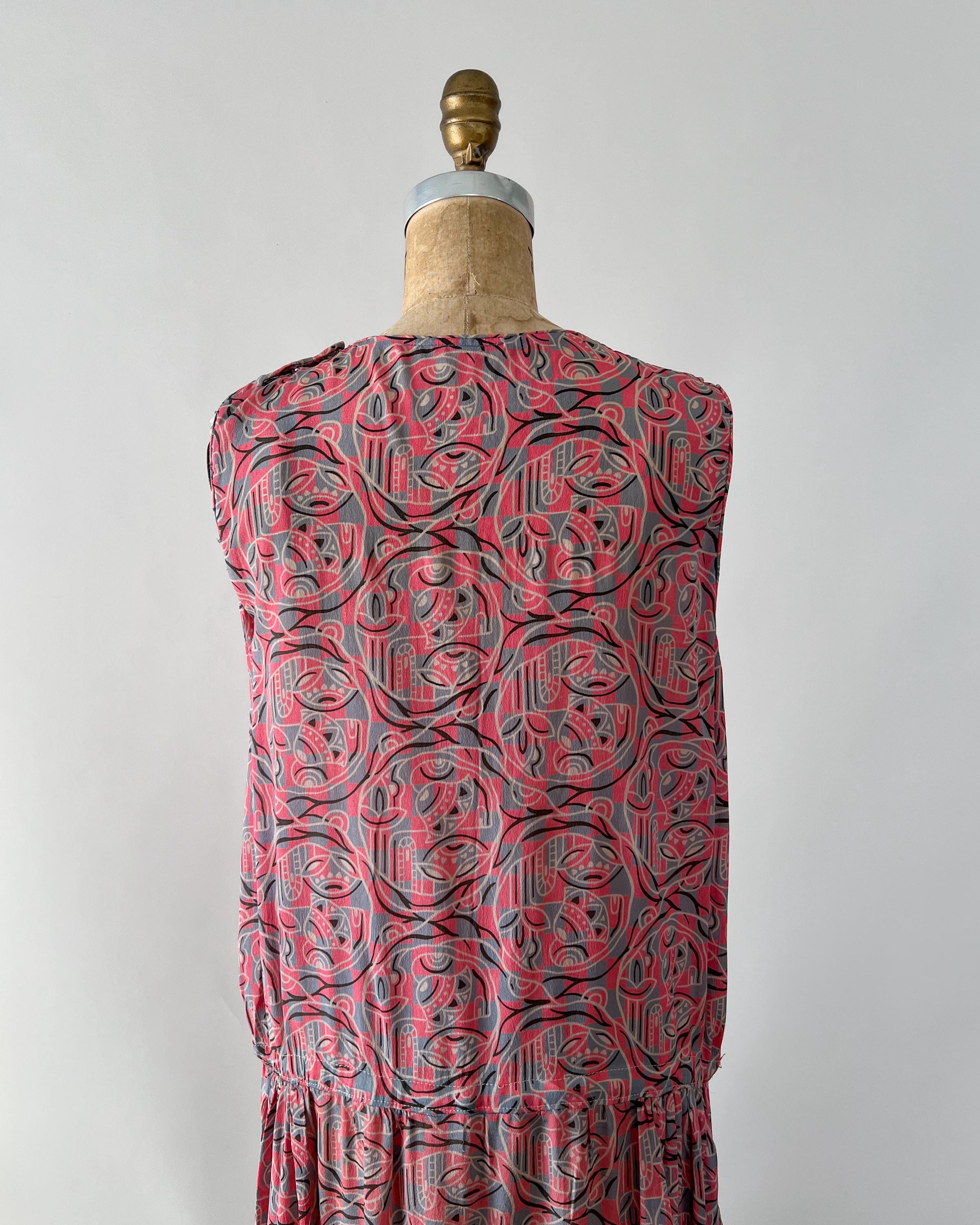 A gorgeous, vibrant flapper dress from the 1920s! Made from a beautiful blue and pink silk with a geometric print, the dress has a classic 20s drop-waist silhouette with a loose, blouson, sleeveless bodice, a low waistline, and a midi length ruffled skirt. The skirt features a ruffled hem with two additional ruffles in front, all of which are trimmed with coordinating blue gross grain. A sweet blue ribbon rossette adorns one shoulder. Side snap / hook and eye closure. Such a striking dress in wonderful, wearable condition!
