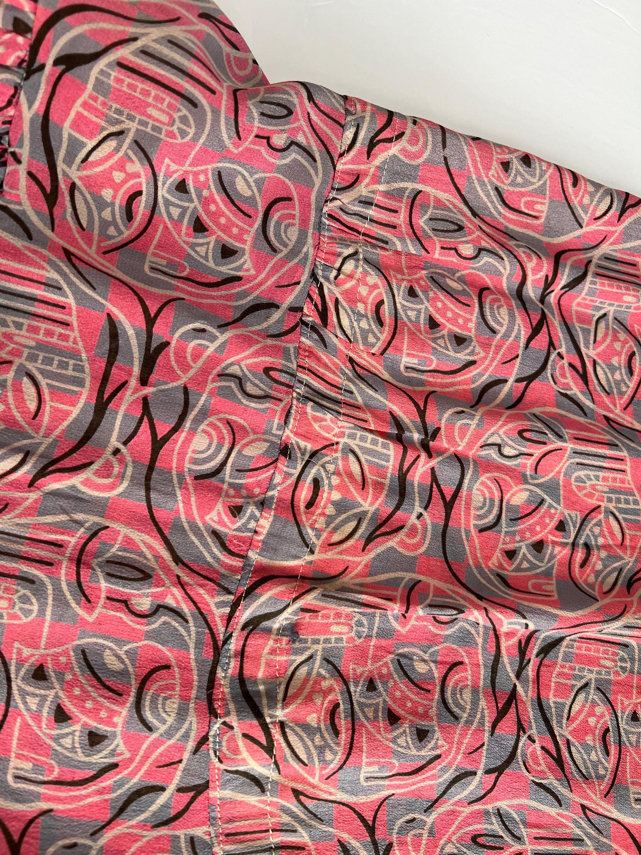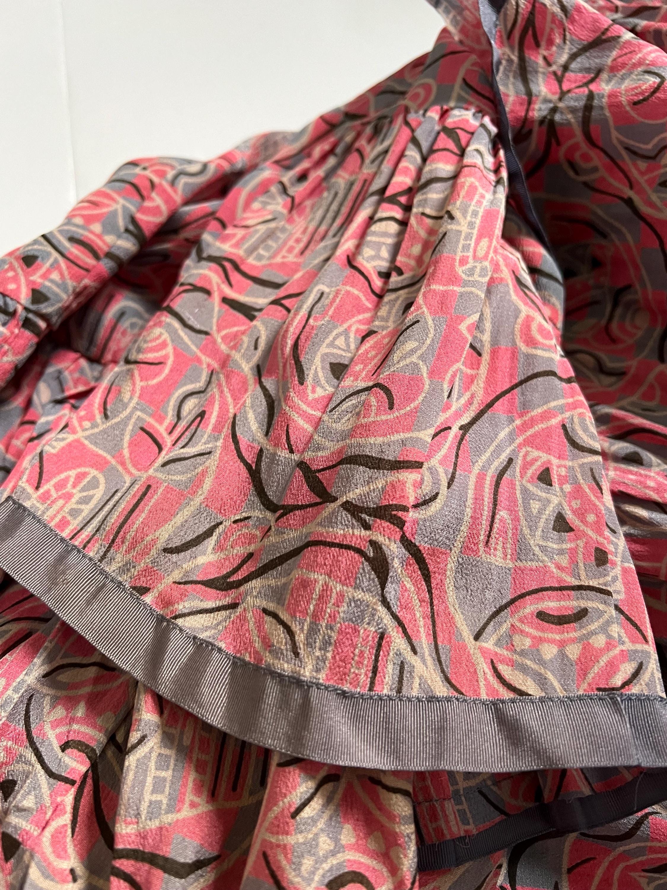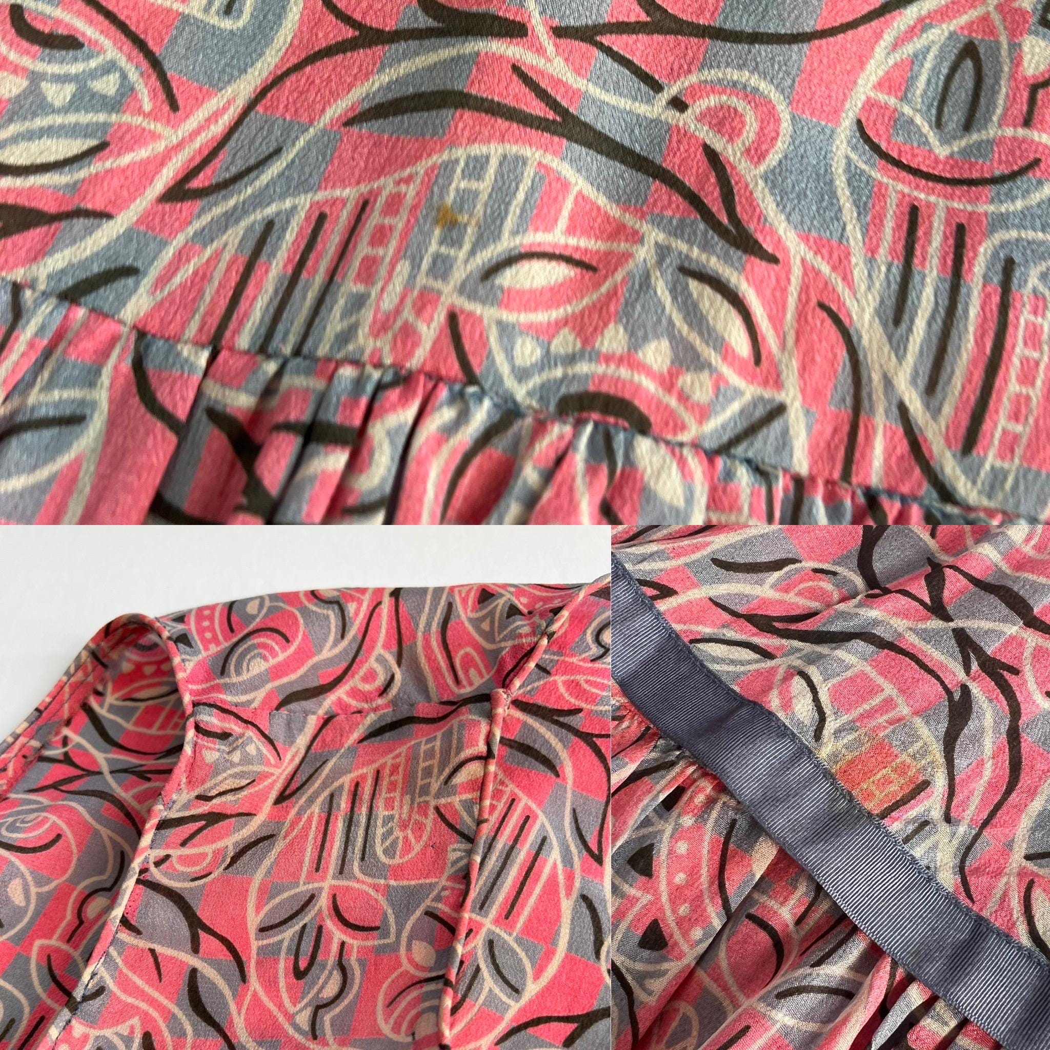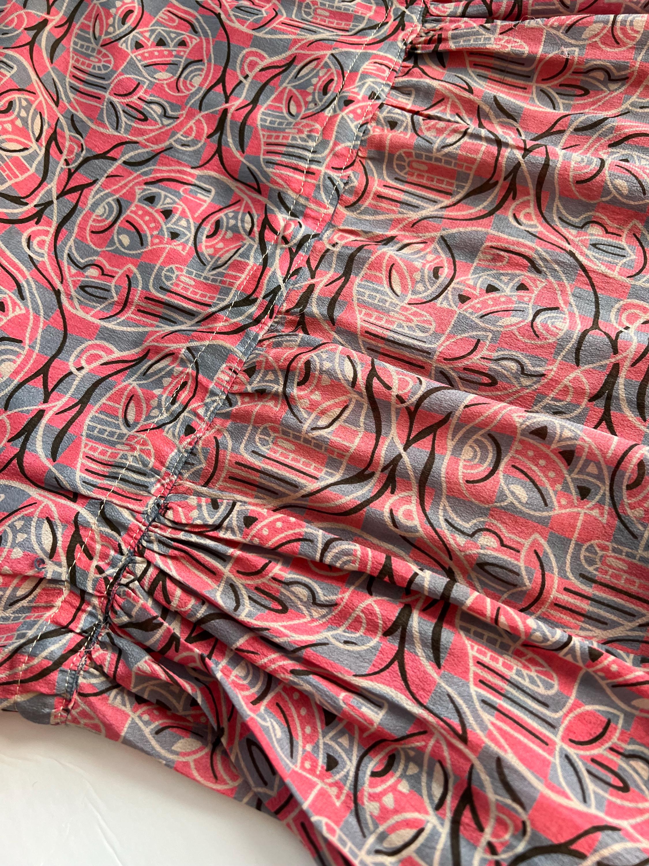 A gorgeous, vibrant flapper dress from the 1920s! Made from a beautiful blue and pink silk with a geometric print, the dress has a classic 20s drop-waist silhouette with a loose, blouson, sleeveless bodice, a low waistline, and a midi length ruffled skirt. The skirt features a ruffled hem with two additional ruffles in front, all of which are trimmed with coordinating blue gross grain. A sweet blue ribbon rossette adorns one shoulder. Side snap / hook and eye closure. Such a striking dress in wonderful, wearable condition!