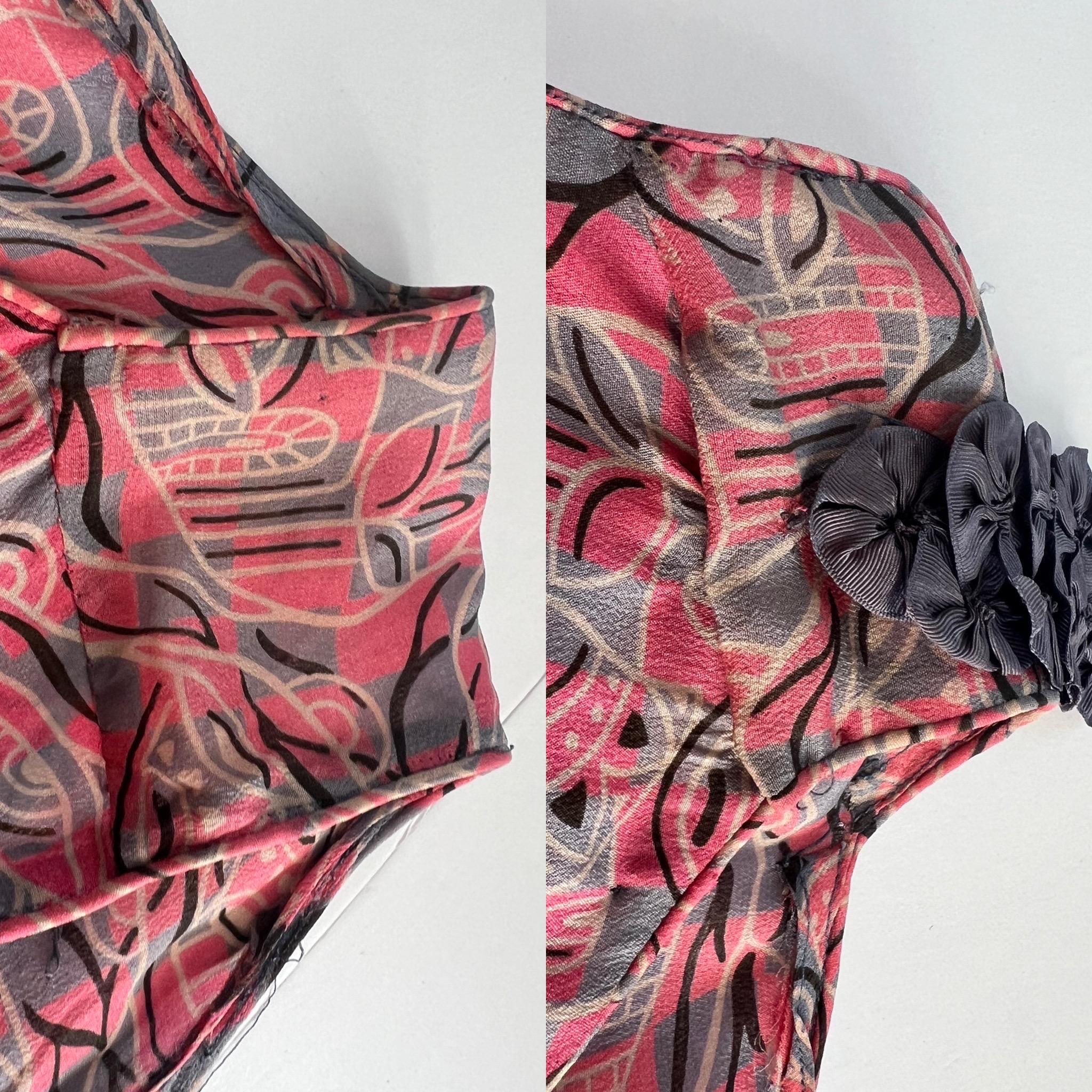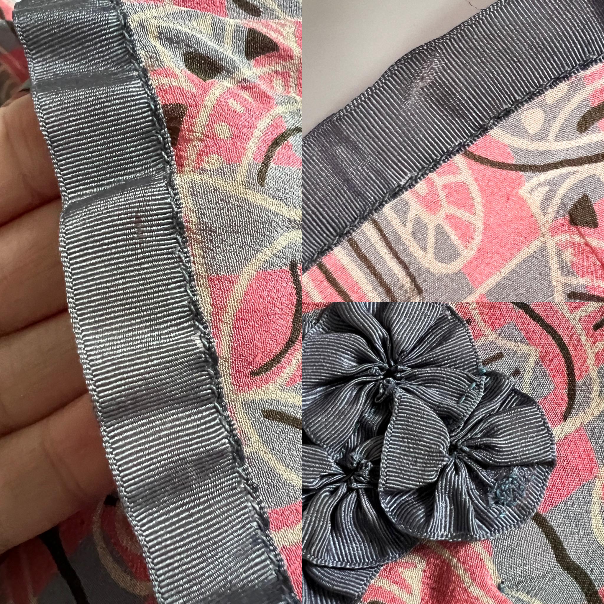 Condition: This dress is in very nice condition for its age! There is a some overall dinginess as well as some scattered small spots / areas of faint yellowing, particularly at the waist and shoulders as well as on the skirt. There is some slight fading down one side of the dress, although this is subtle (most noticeable when comparing the ribbon trim to the other side). The ribbon trim seems a little brittle in areas (there are a few little tears and I have mended a small area on the rosette). I opted not to try and hand wash this as color bleed seemed likely. I’ll leave cleaning to the buyer’s trusted dry cleaner. See photos for more detail. Sold as-is.
