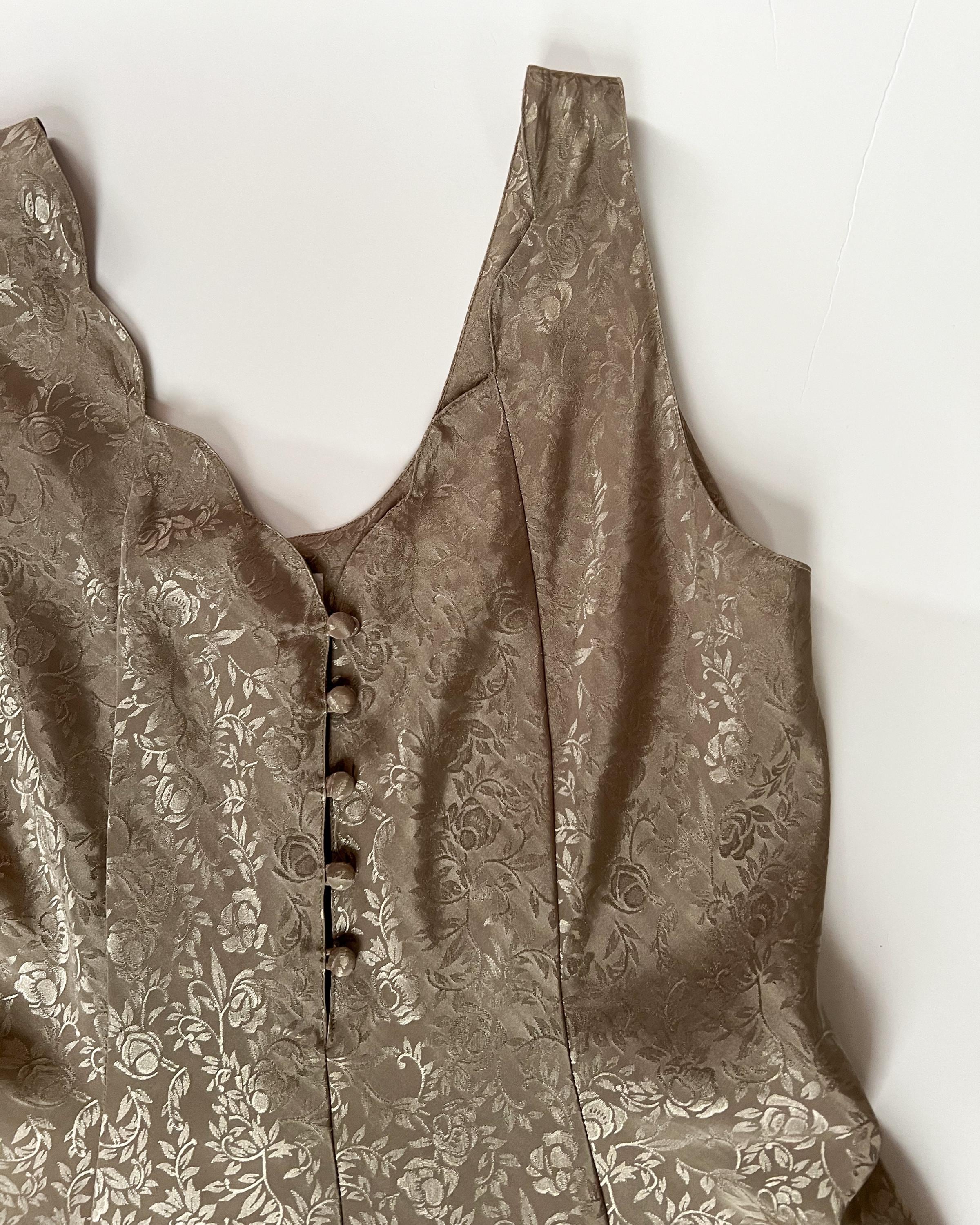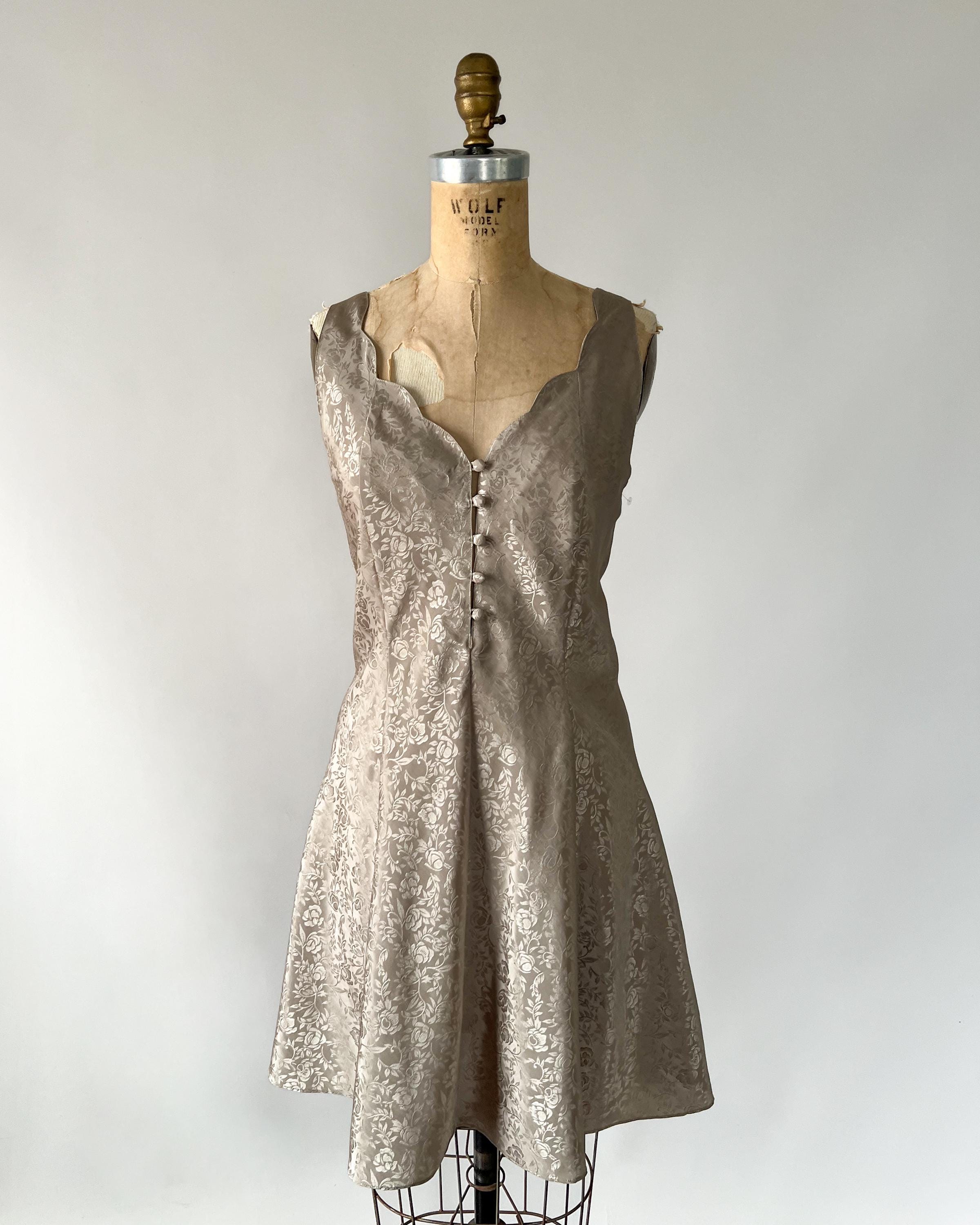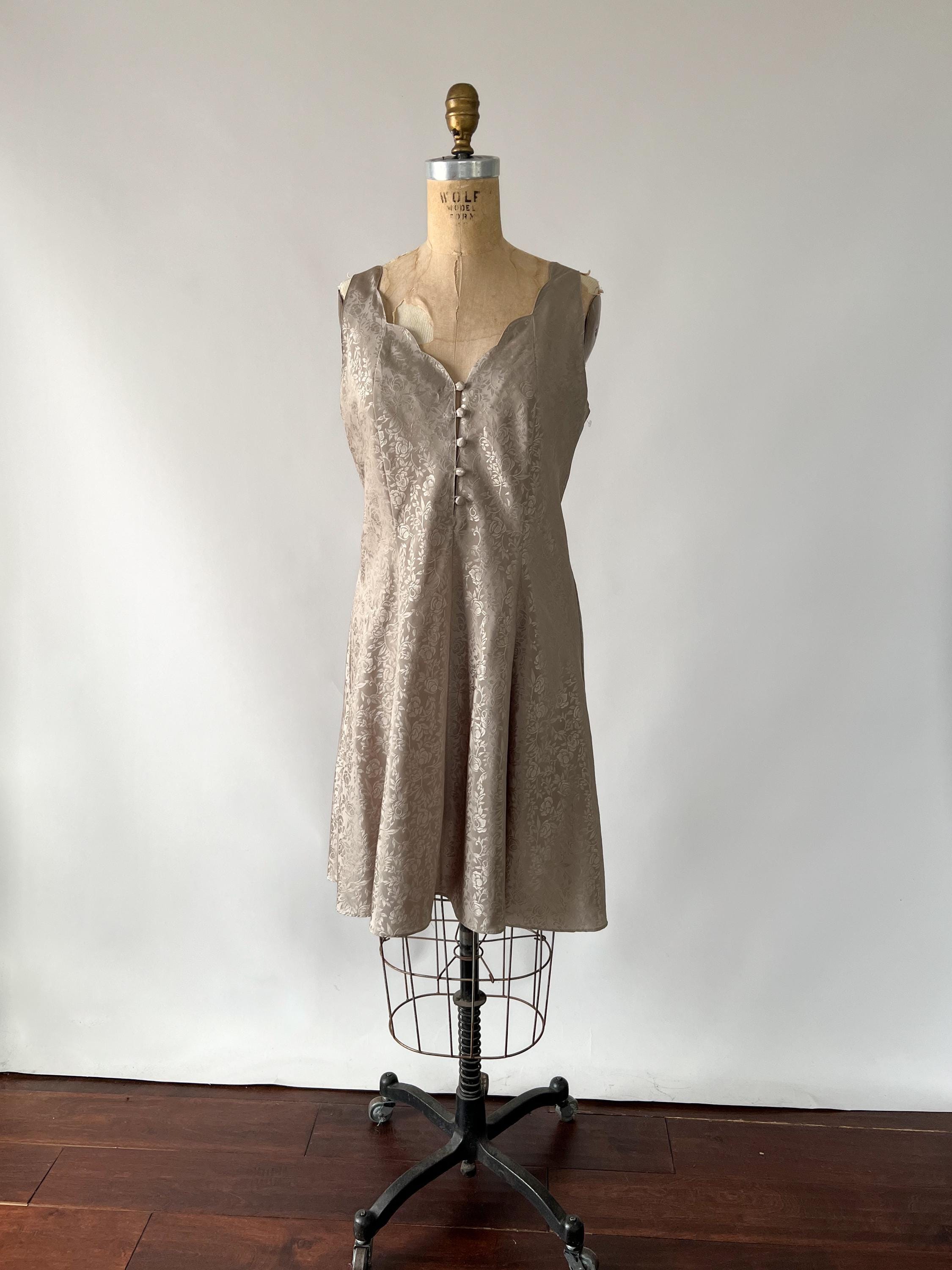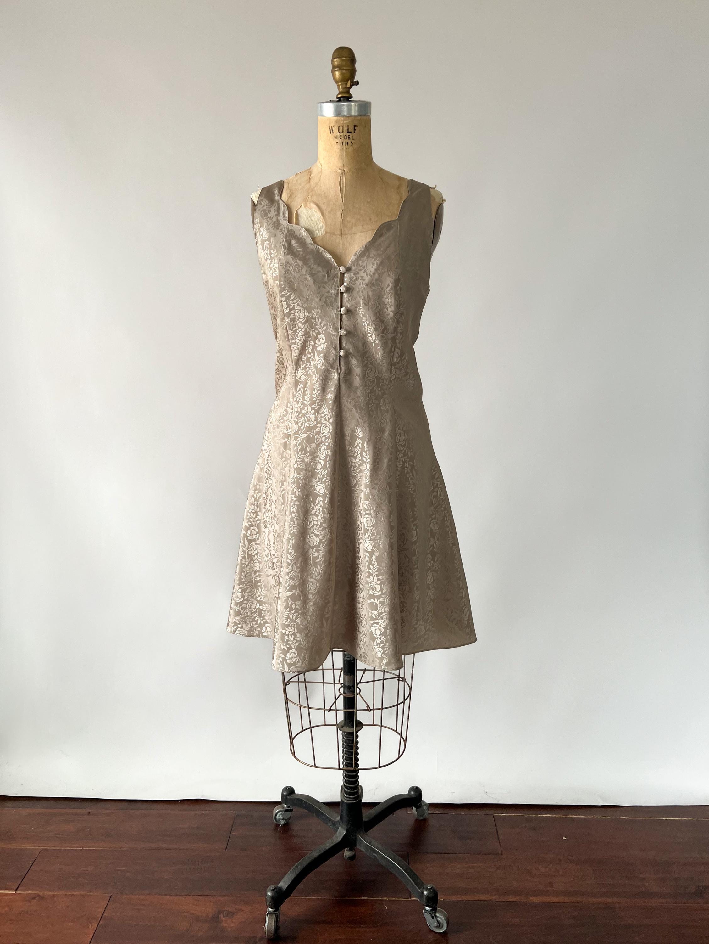 A lovely 1990s gold satin Jacquard slip dress! The sleeveless dress has a sexy front scalloped v neck, flattering princess seaming, a nipped waist, and a flared, full skirt in a flirty shorter length. It features front covered buttons. While this may have been intended to be a nightgown, I think it’s cute enough to be worn as a dress!