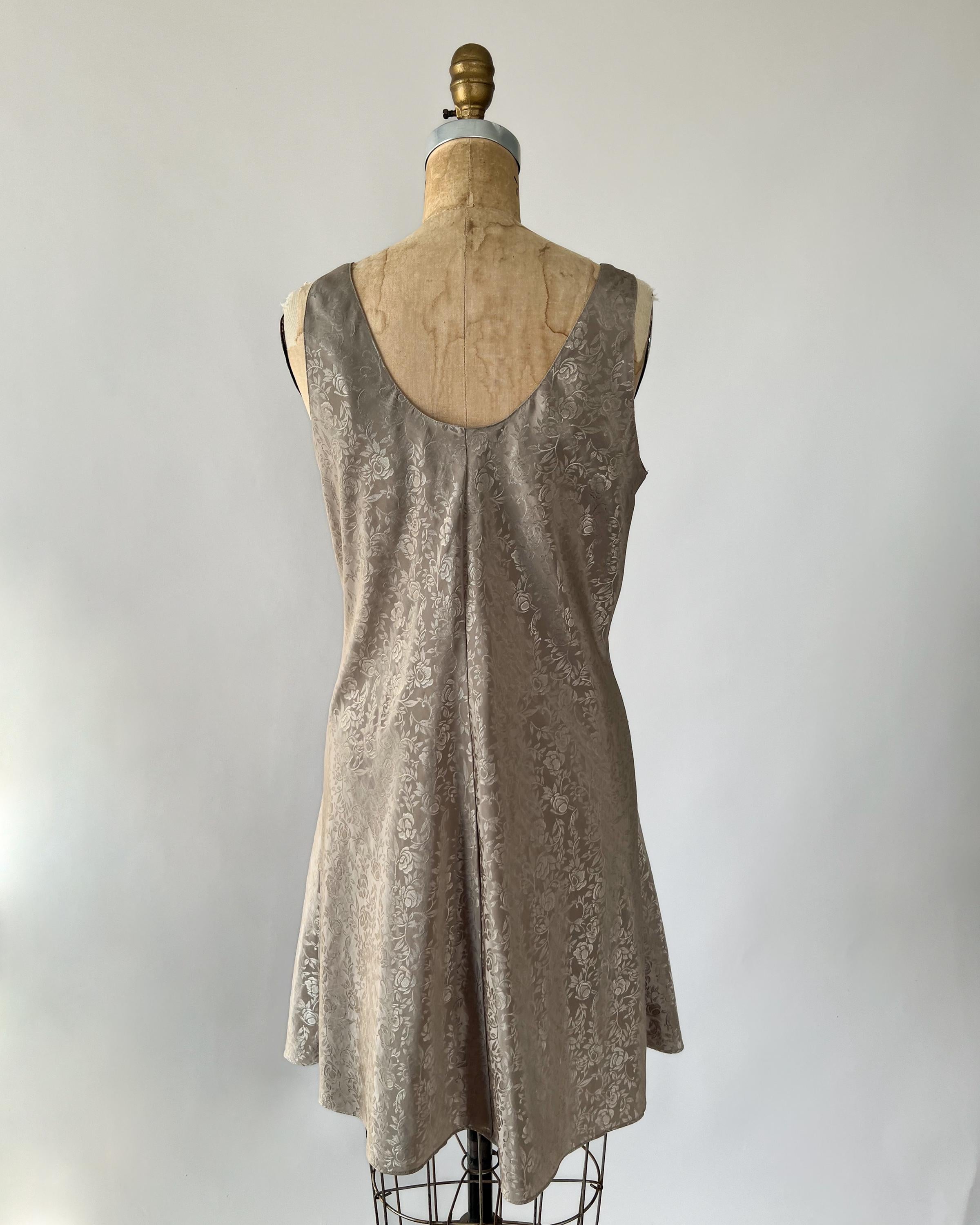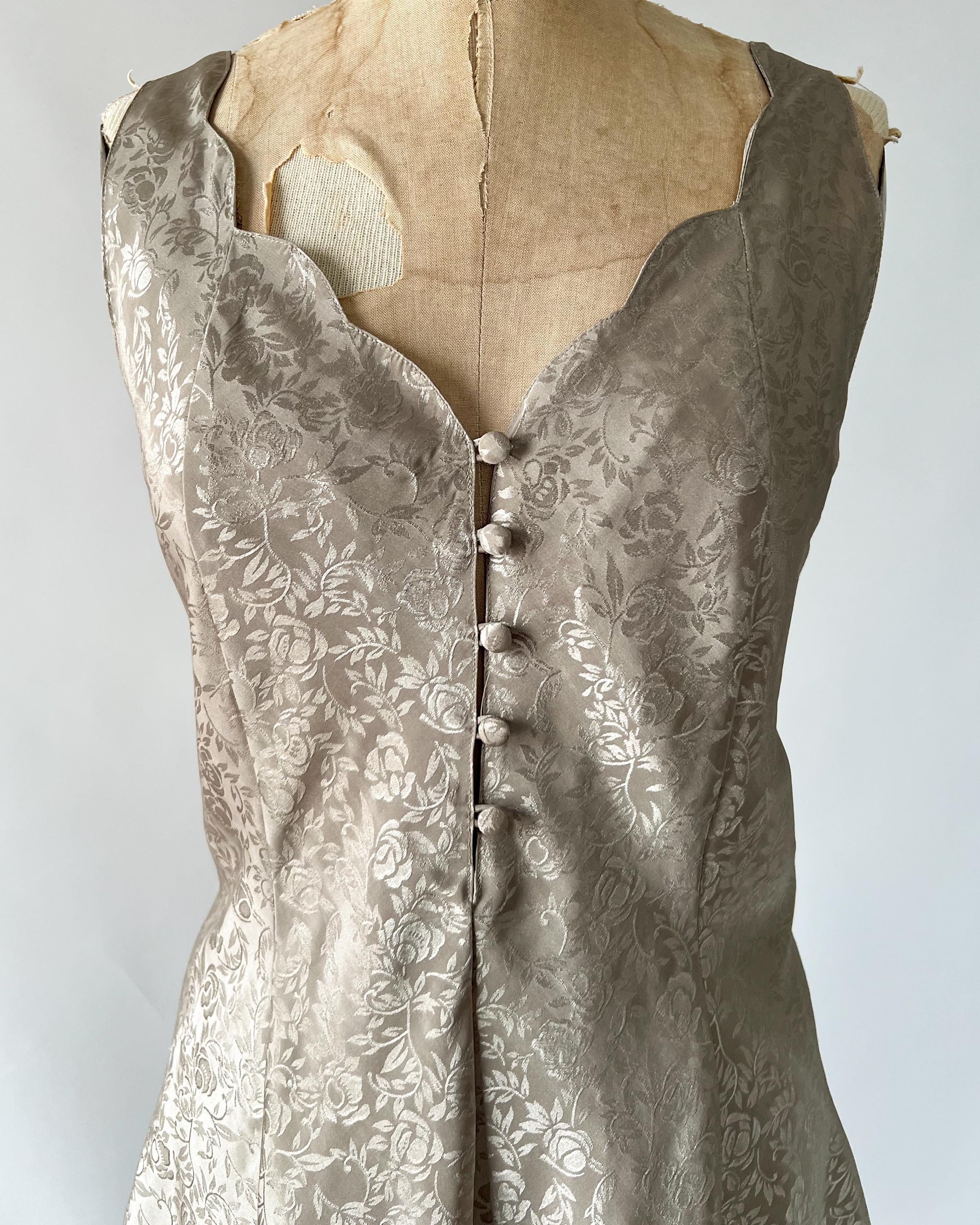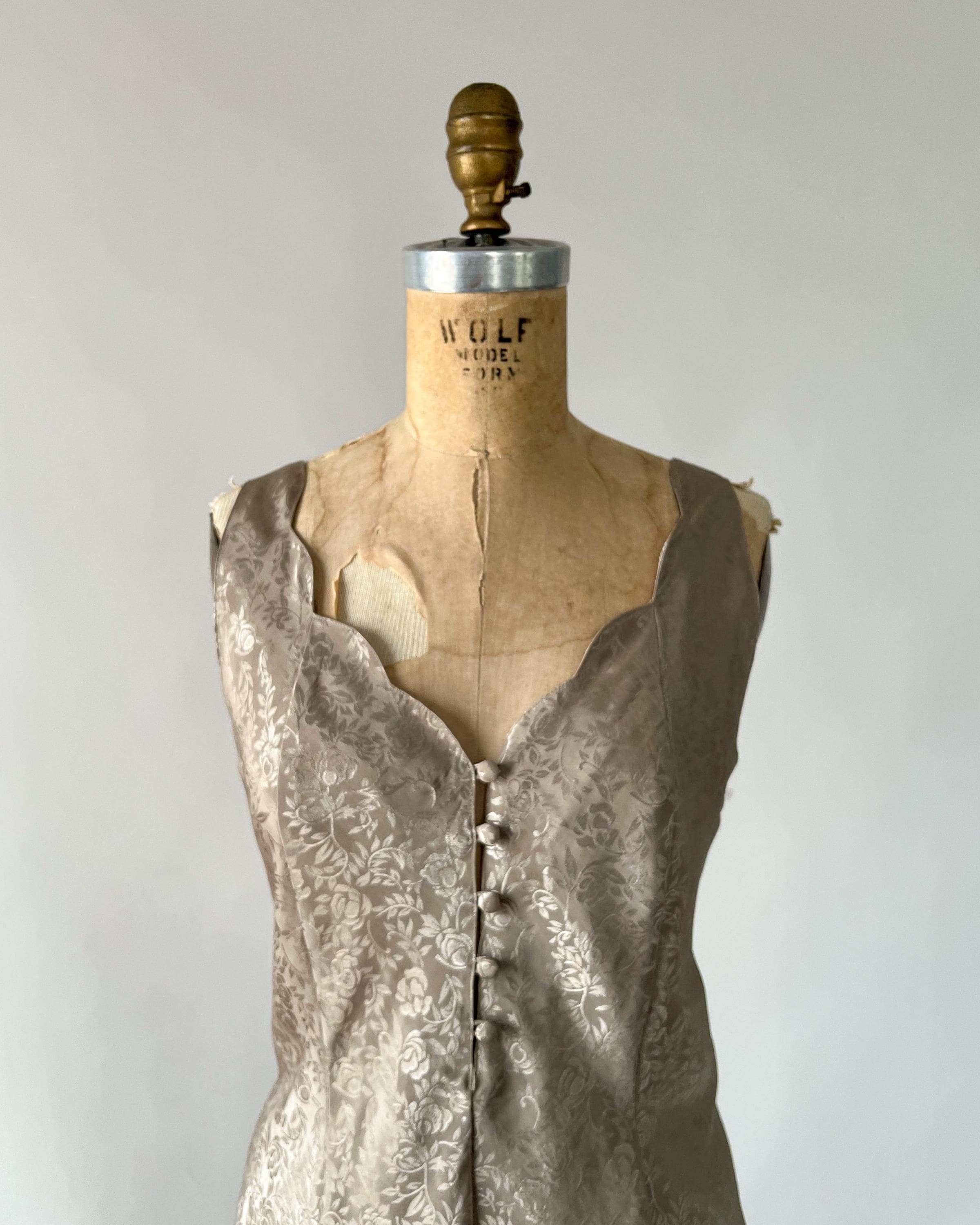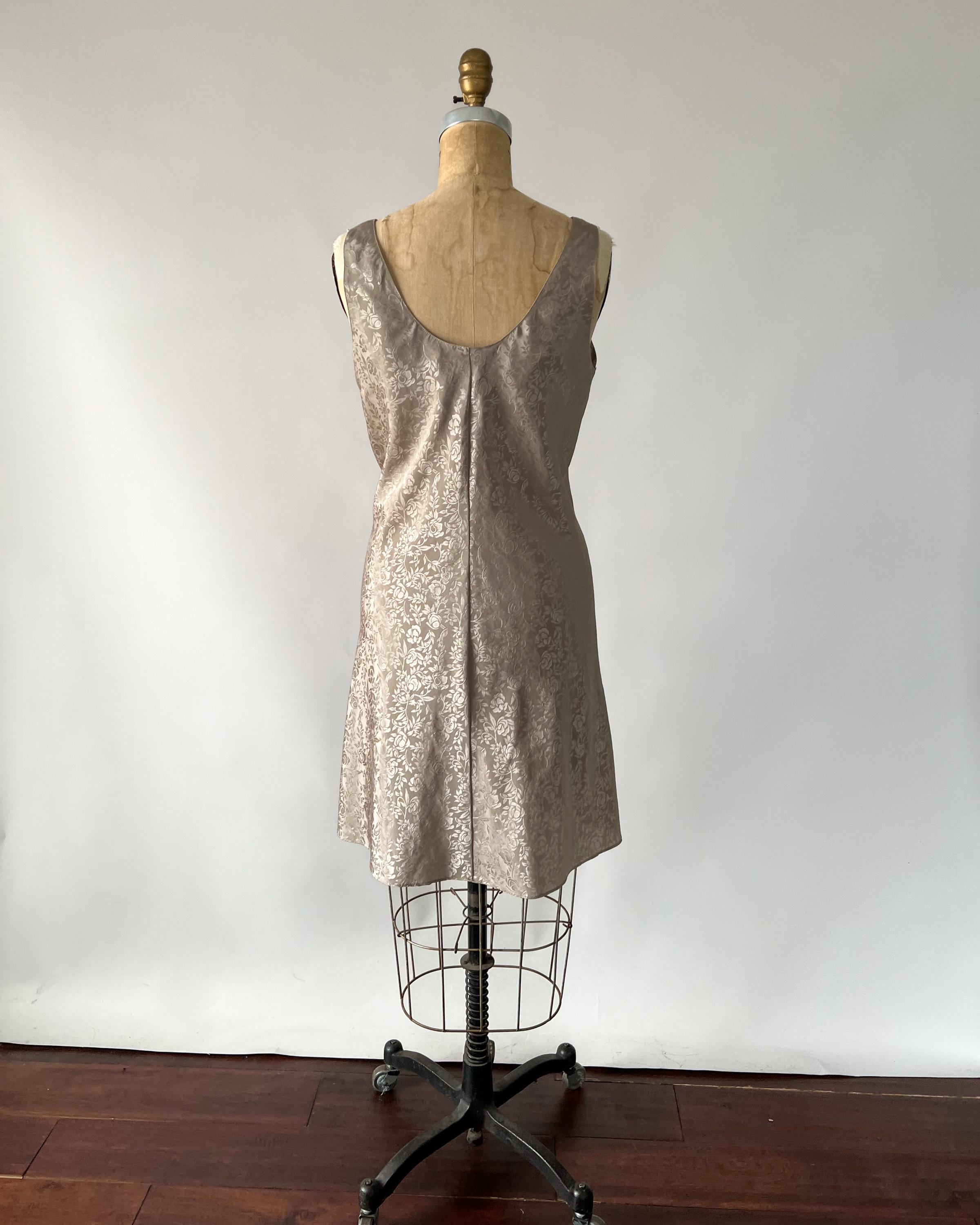A lovely 1990s gold satin Jacquard slip dress! The sleeveless dress has a sexy front scalloped v neck, flattering princess seaming, a nipped waist, and a flared, full skirt in a flirty shorter length. It features front covered buttons. While this may have been intended to be a nightgown, I think it’s cute enough to be worn as a dress!
