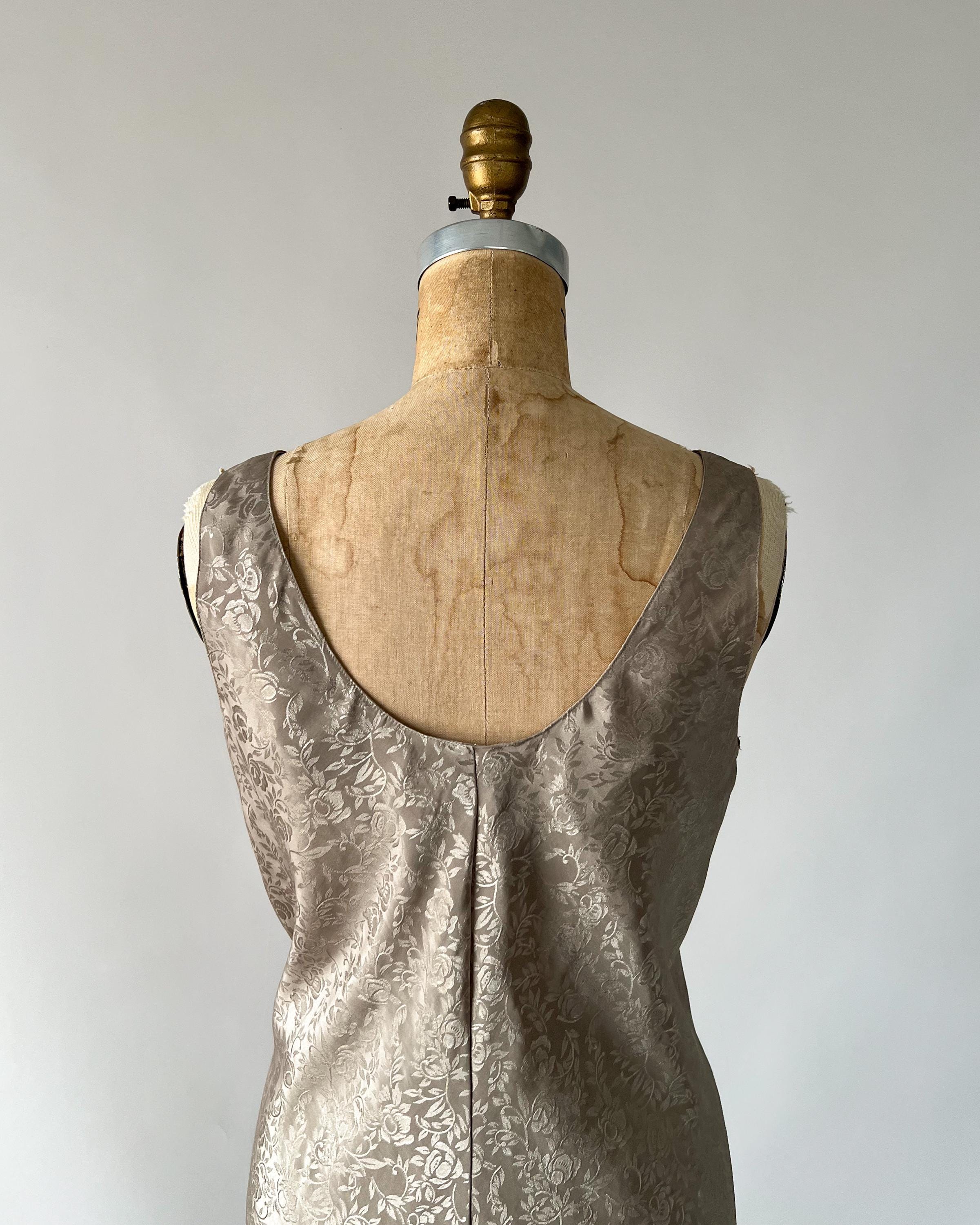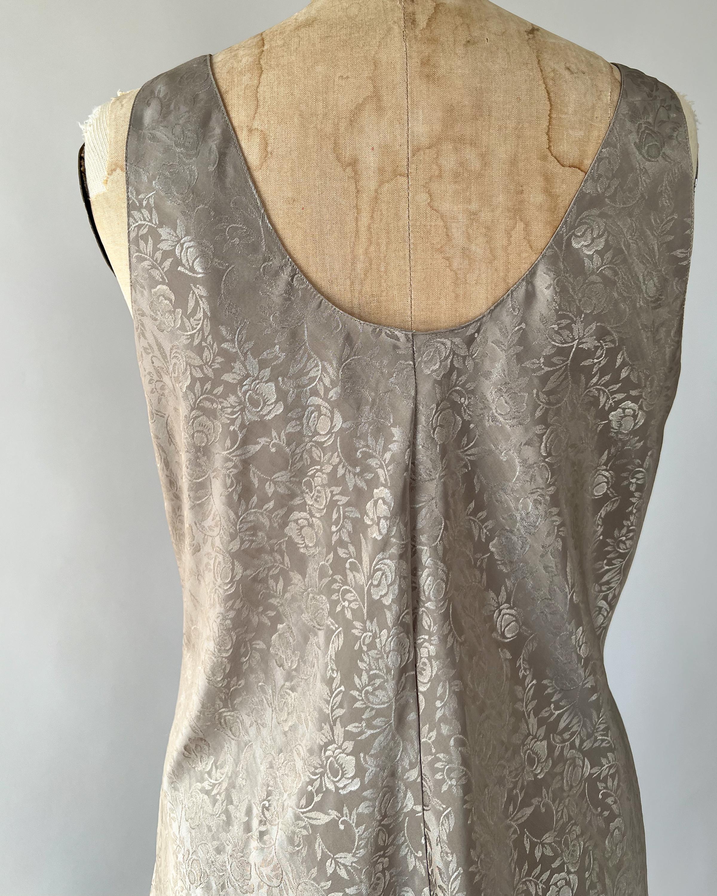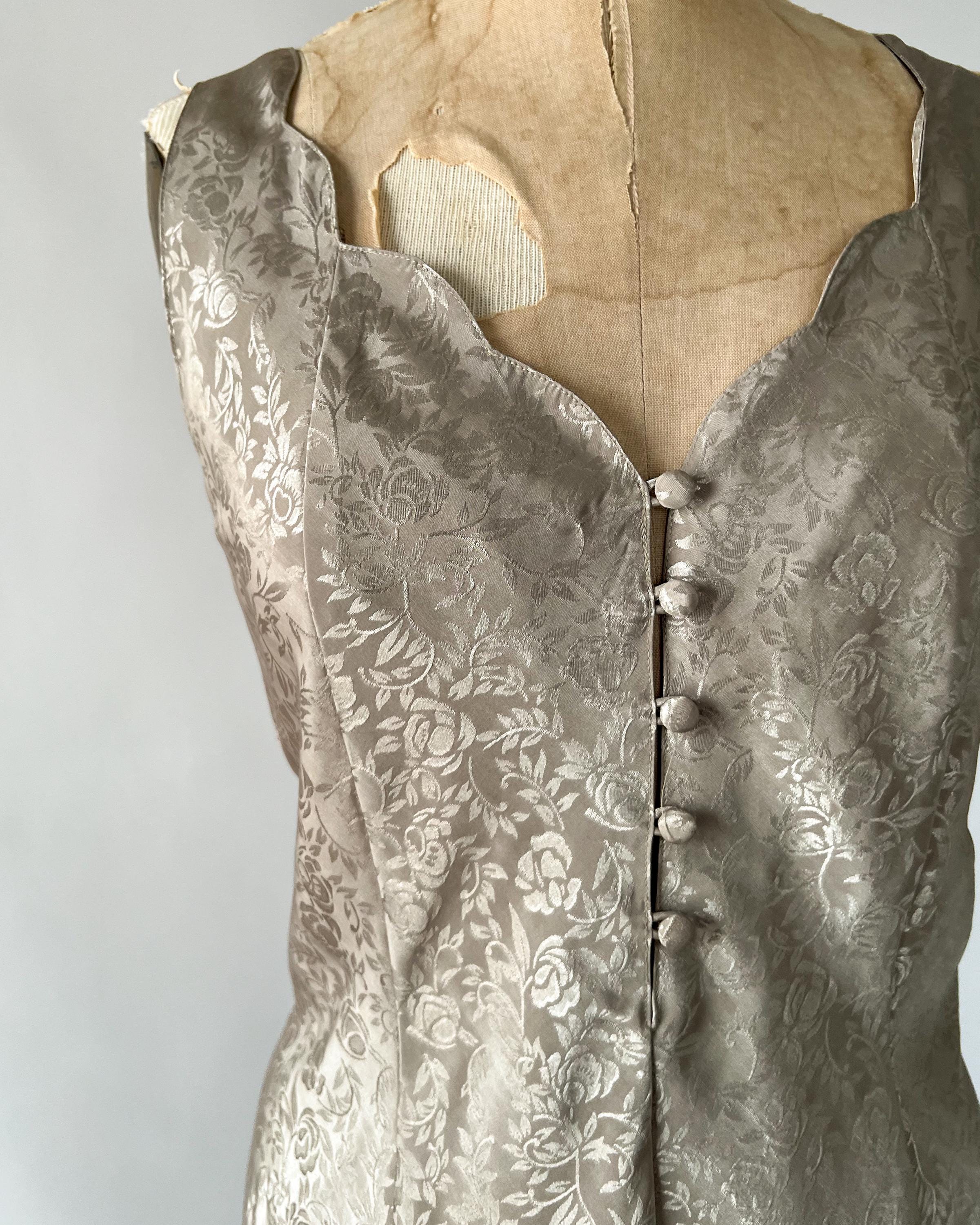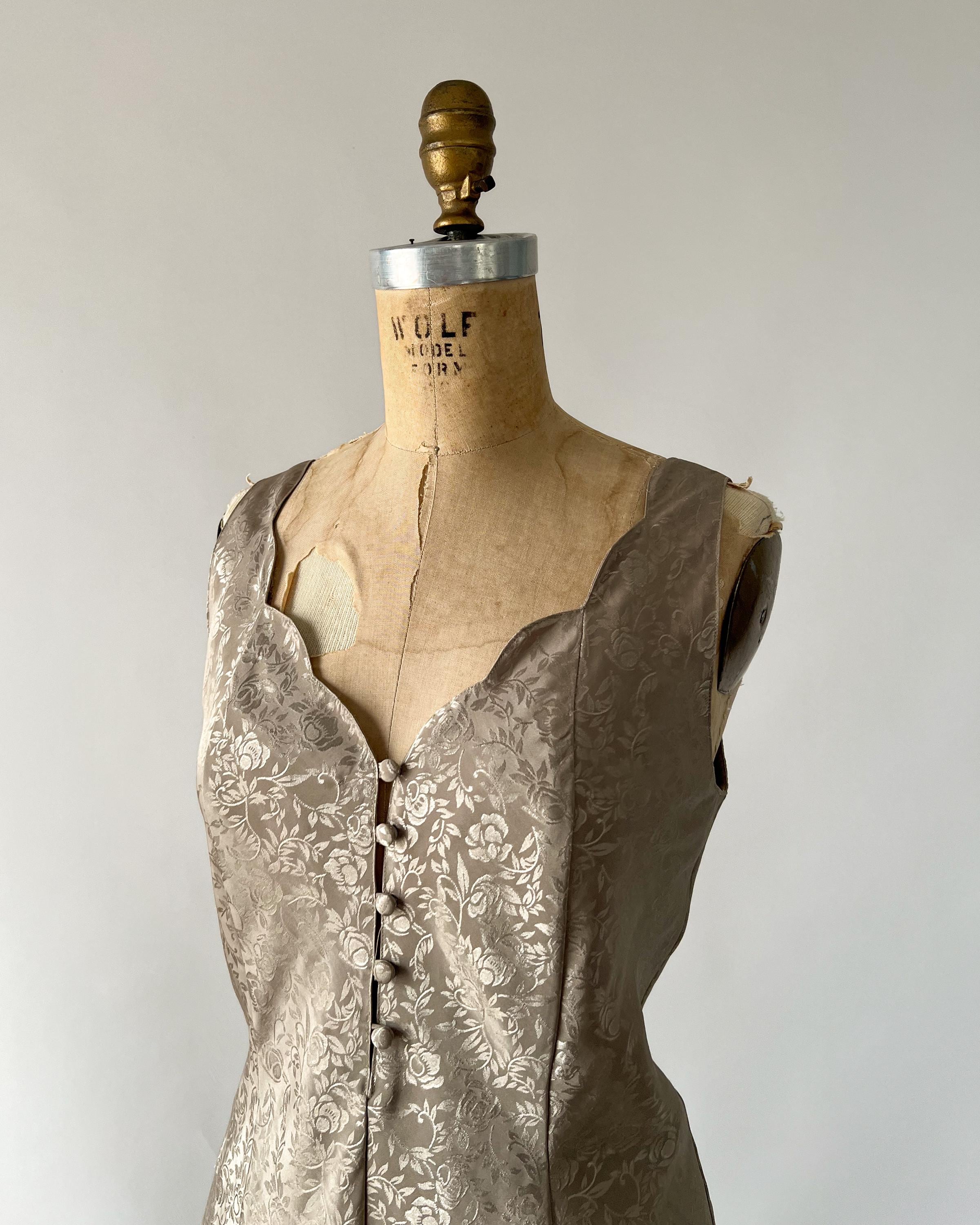 A lovely 1990s gold satin Jacquard slip dress! The sleeveless dress has a sexy front scalloped v neck, flattering princess seaming, a nipped waist, and a flared, full skirt in a flirty shorter length. It features front covered buttons. While this may have been intended to be a nightgown, I think it’s cute enough to be worn as a dress!