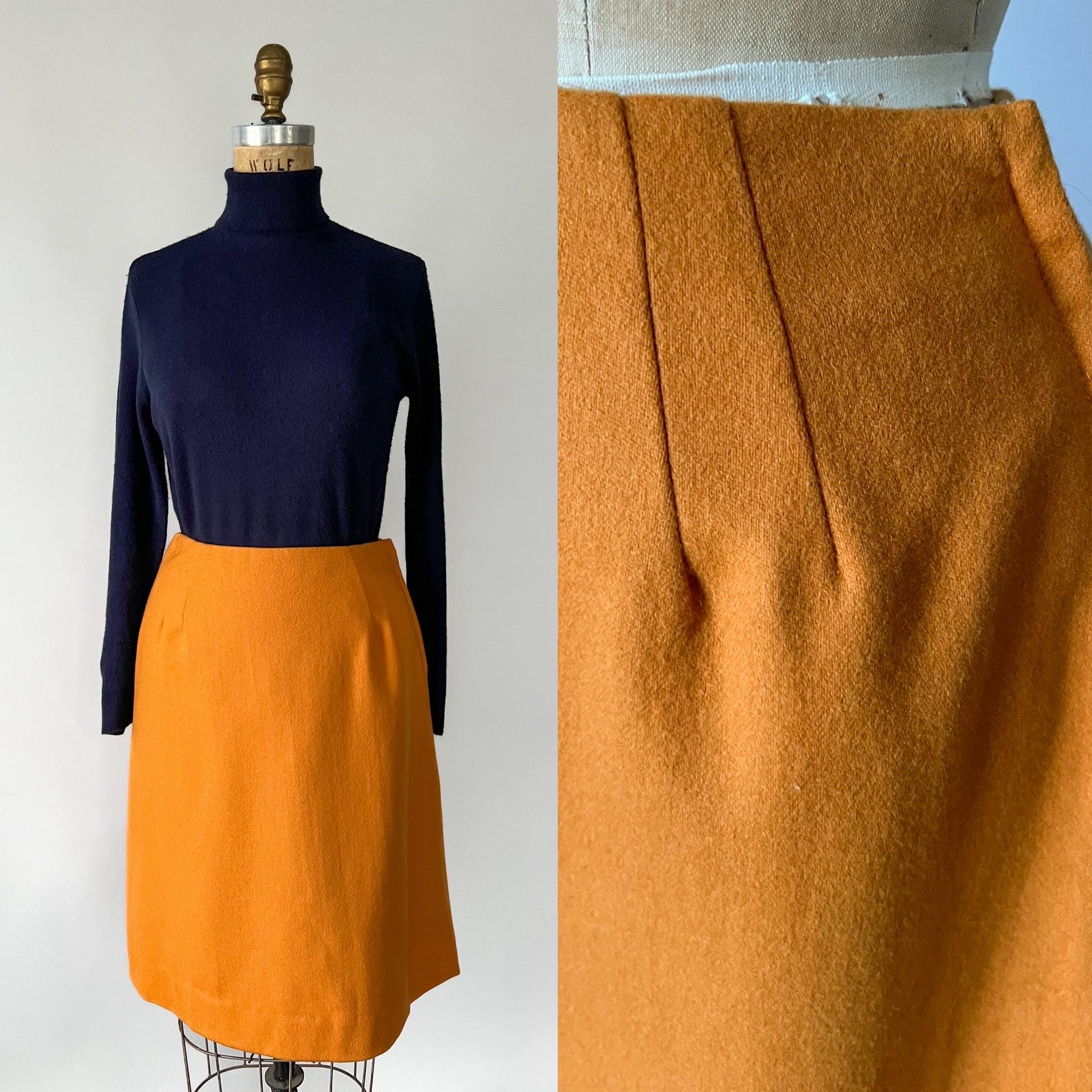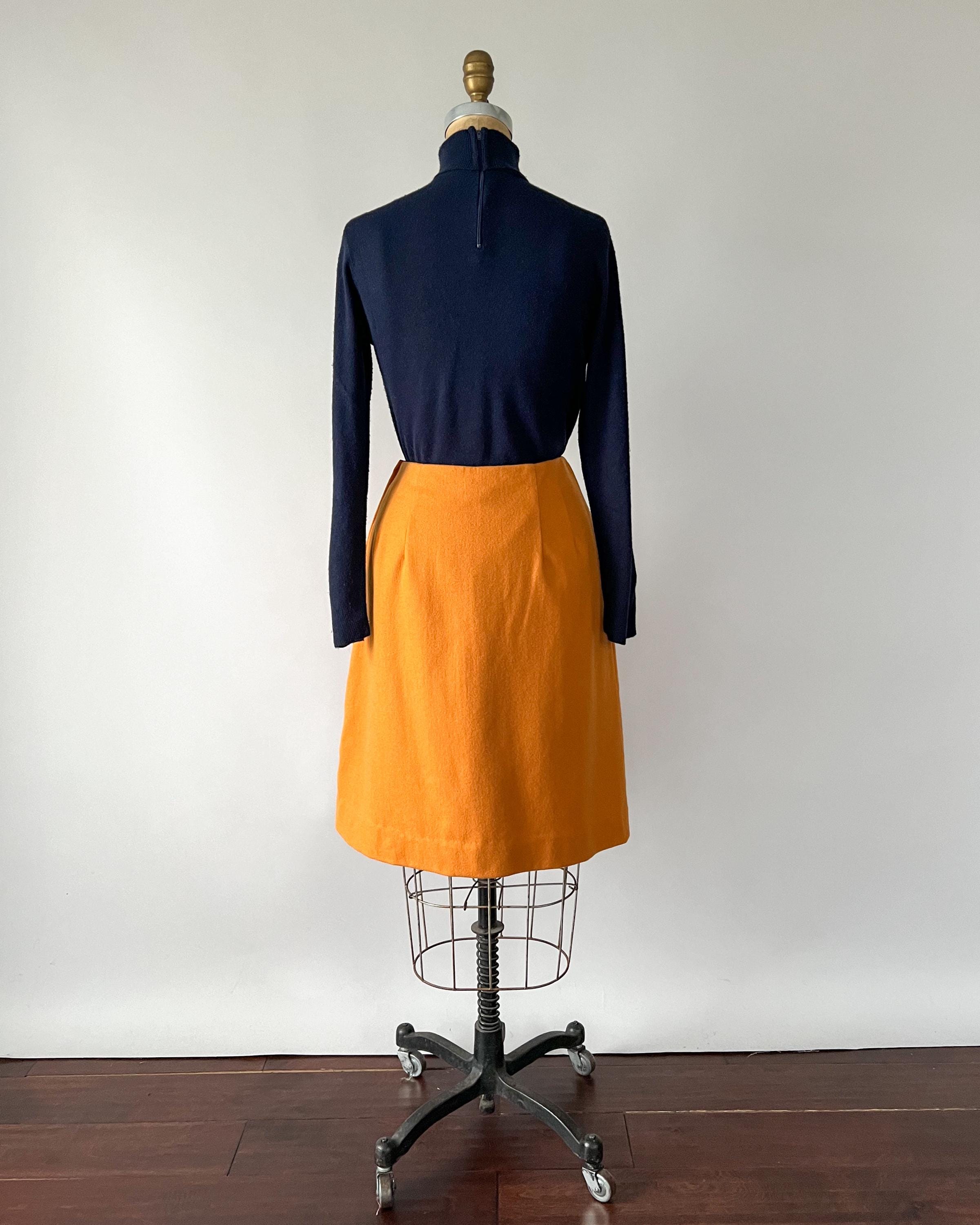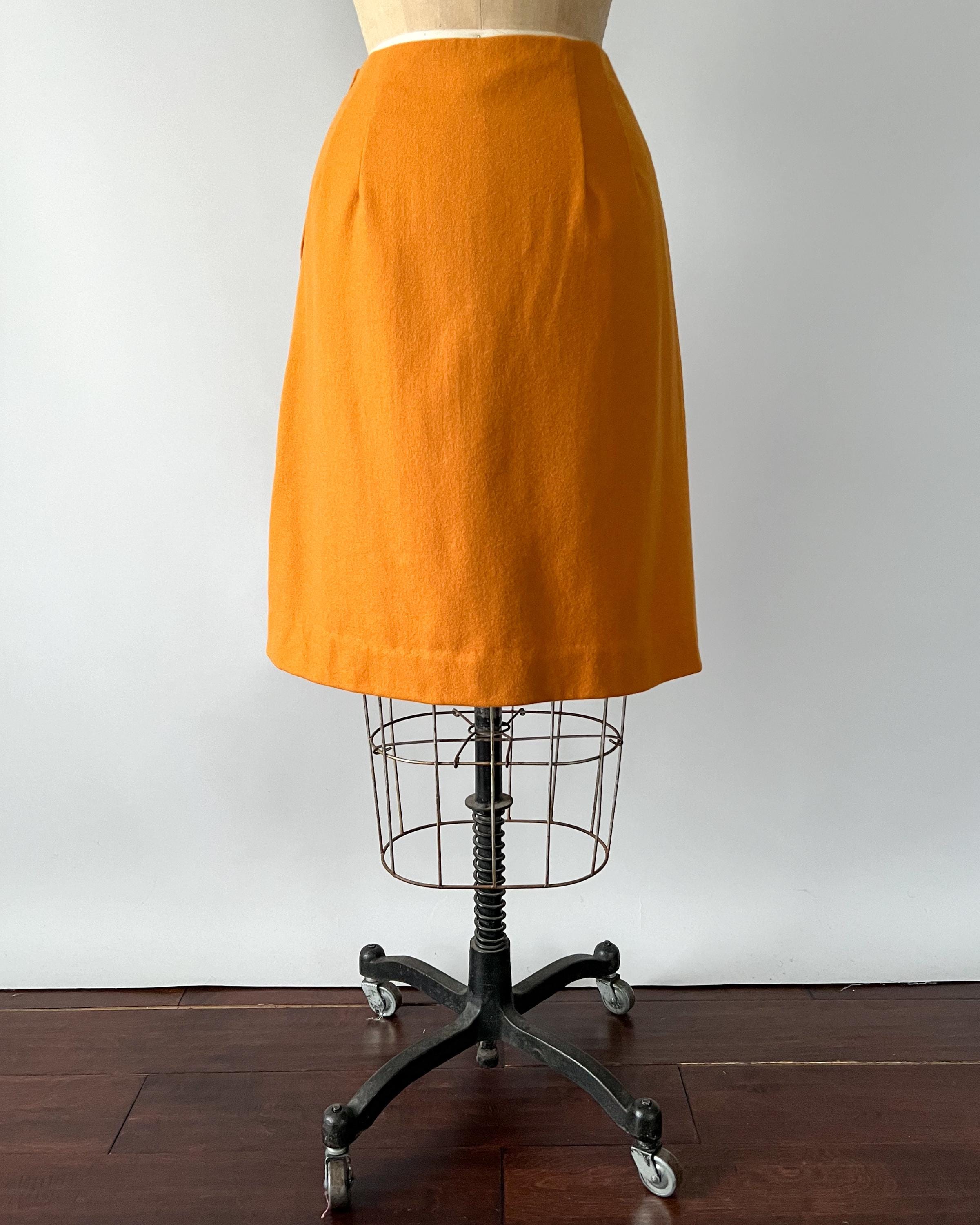 A classic 1970s mustard yellow wool pencil skirt. The high waisted skirt has a slim fit and hits at about the knee. Side zipper closure.
