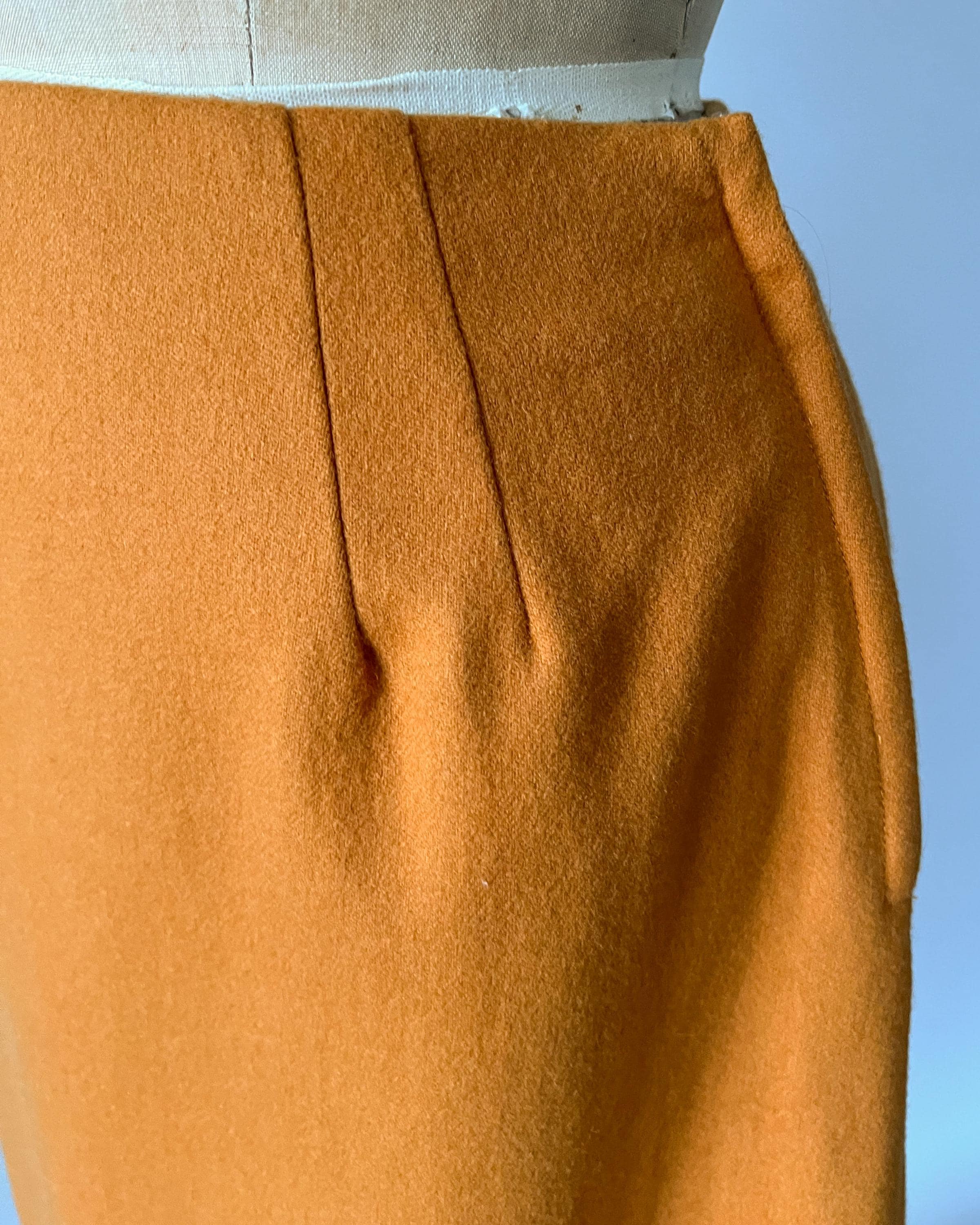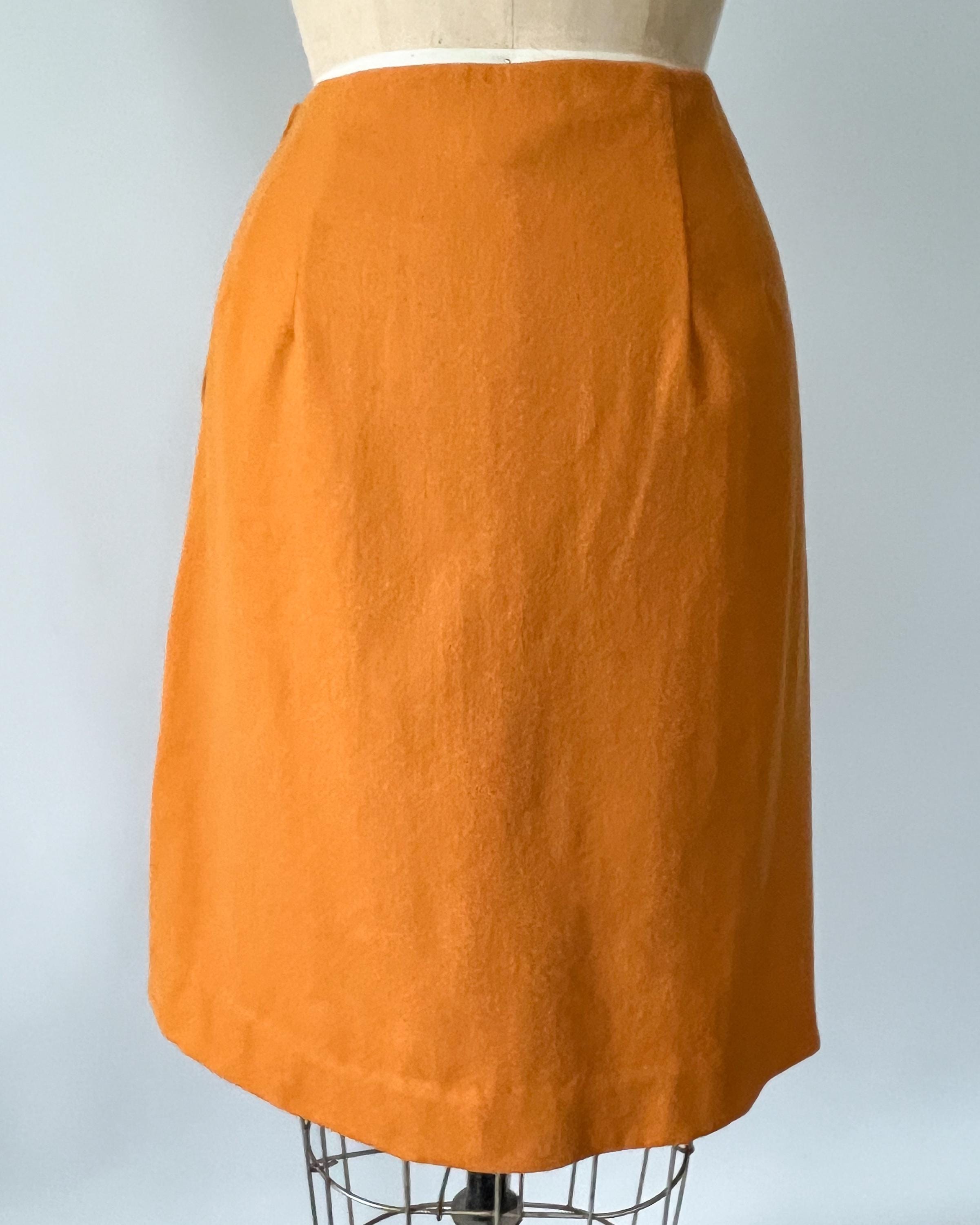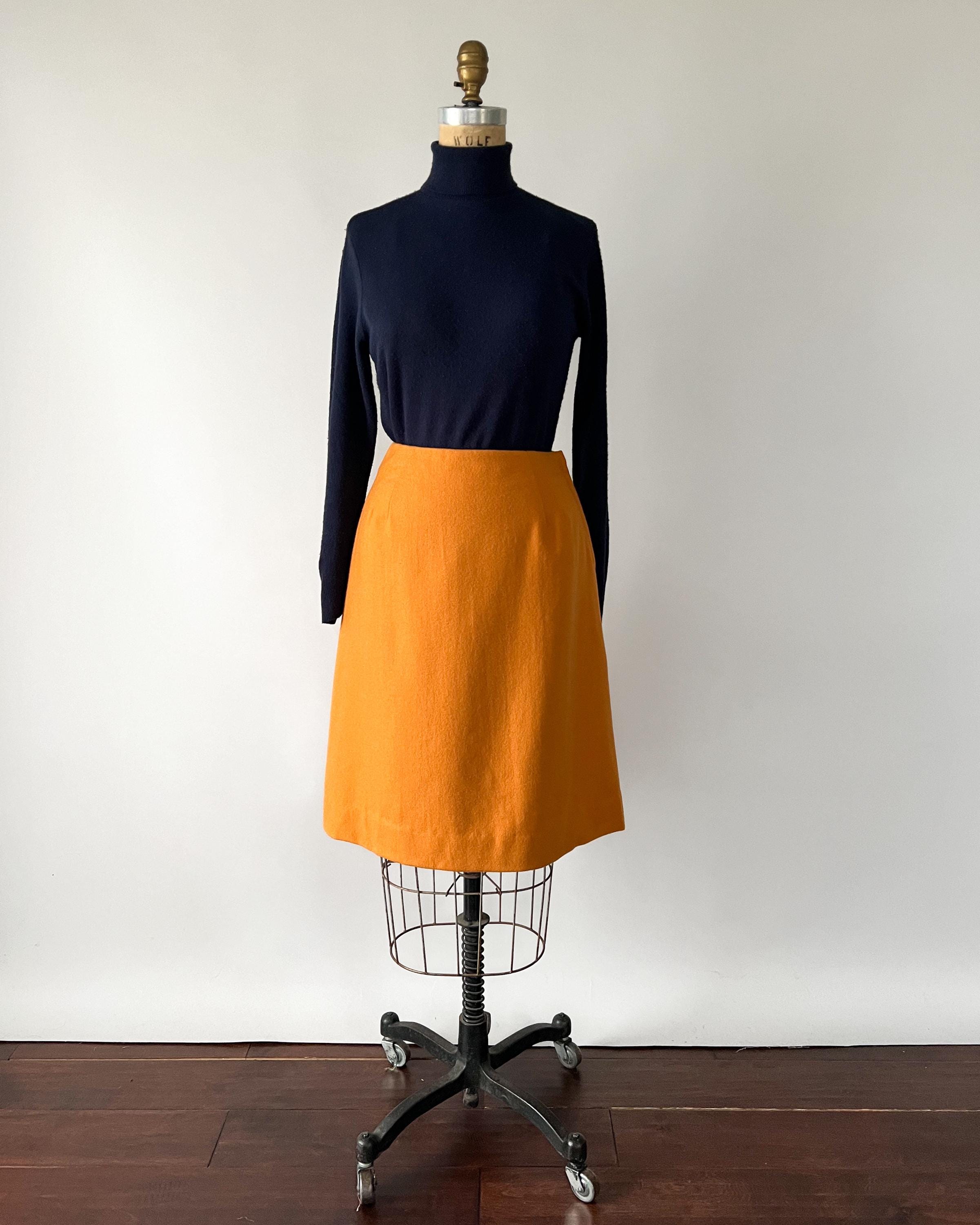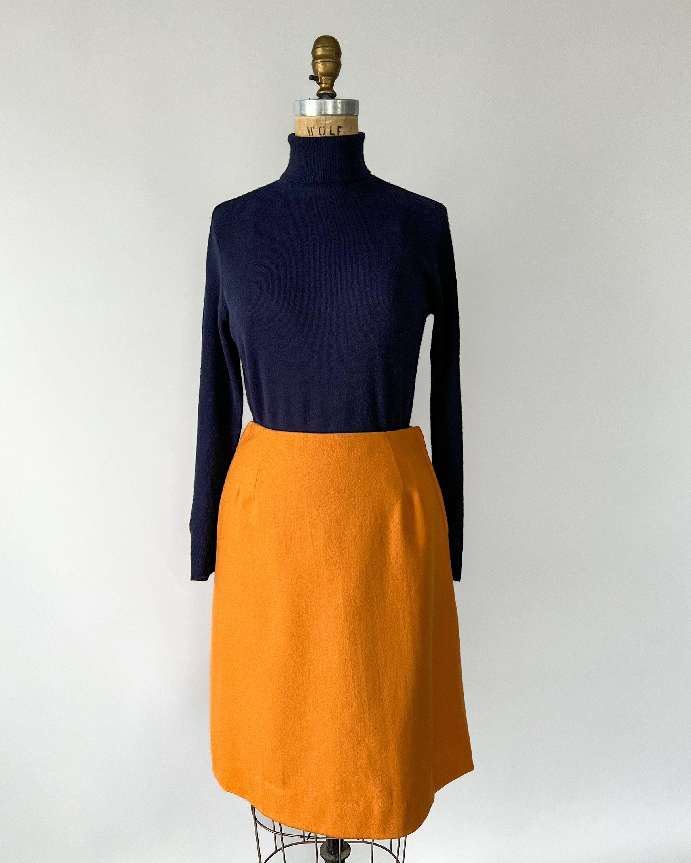 A classic 1970s mustard yellow wool pencil skirt. The high waisted skirt has a slim fit and hits at about the knee. Side zipper closure.