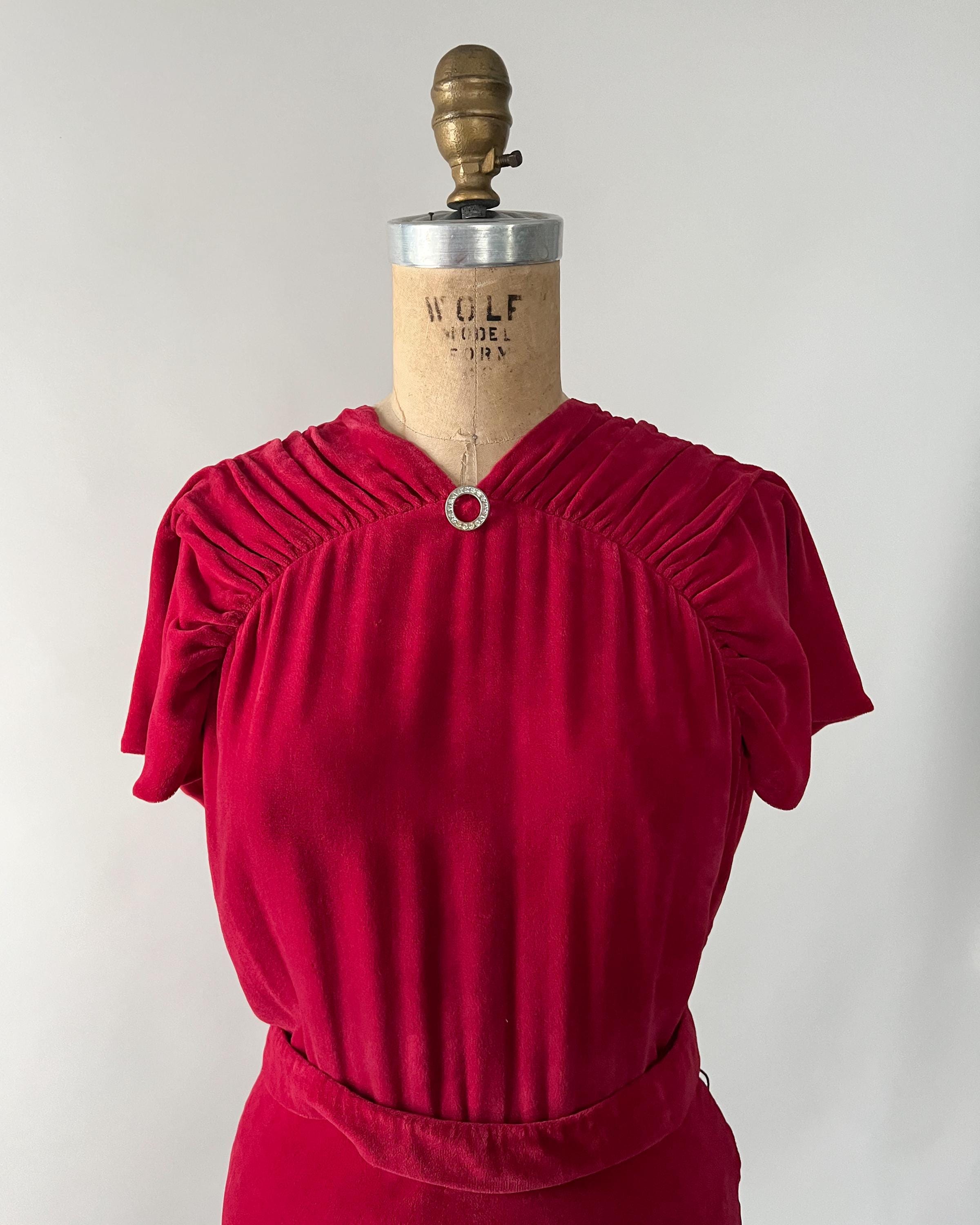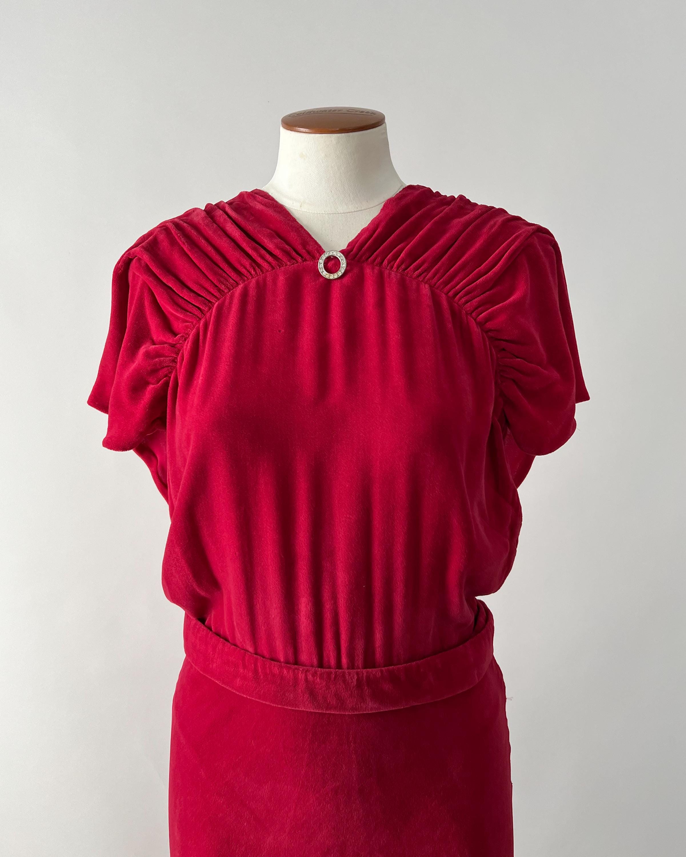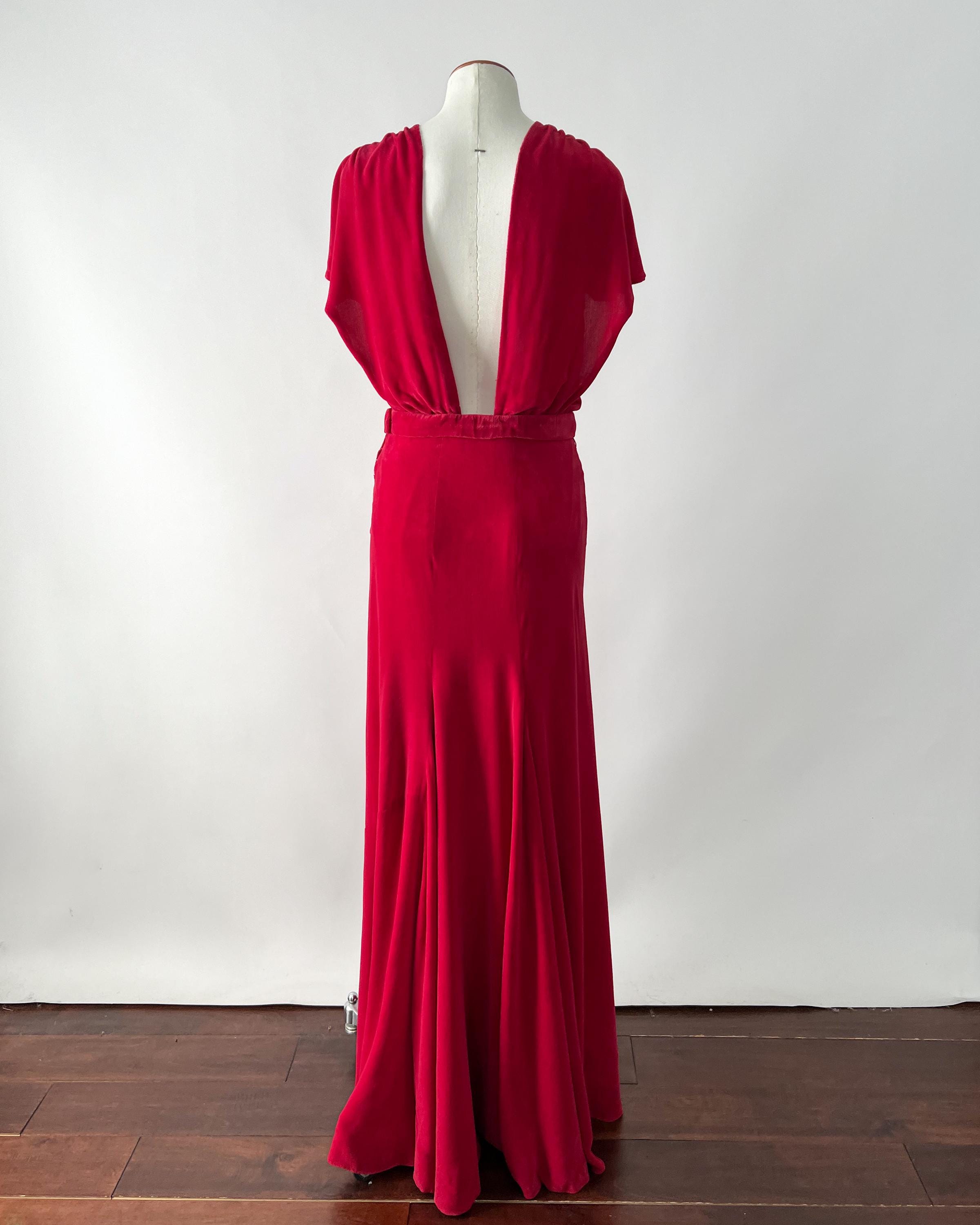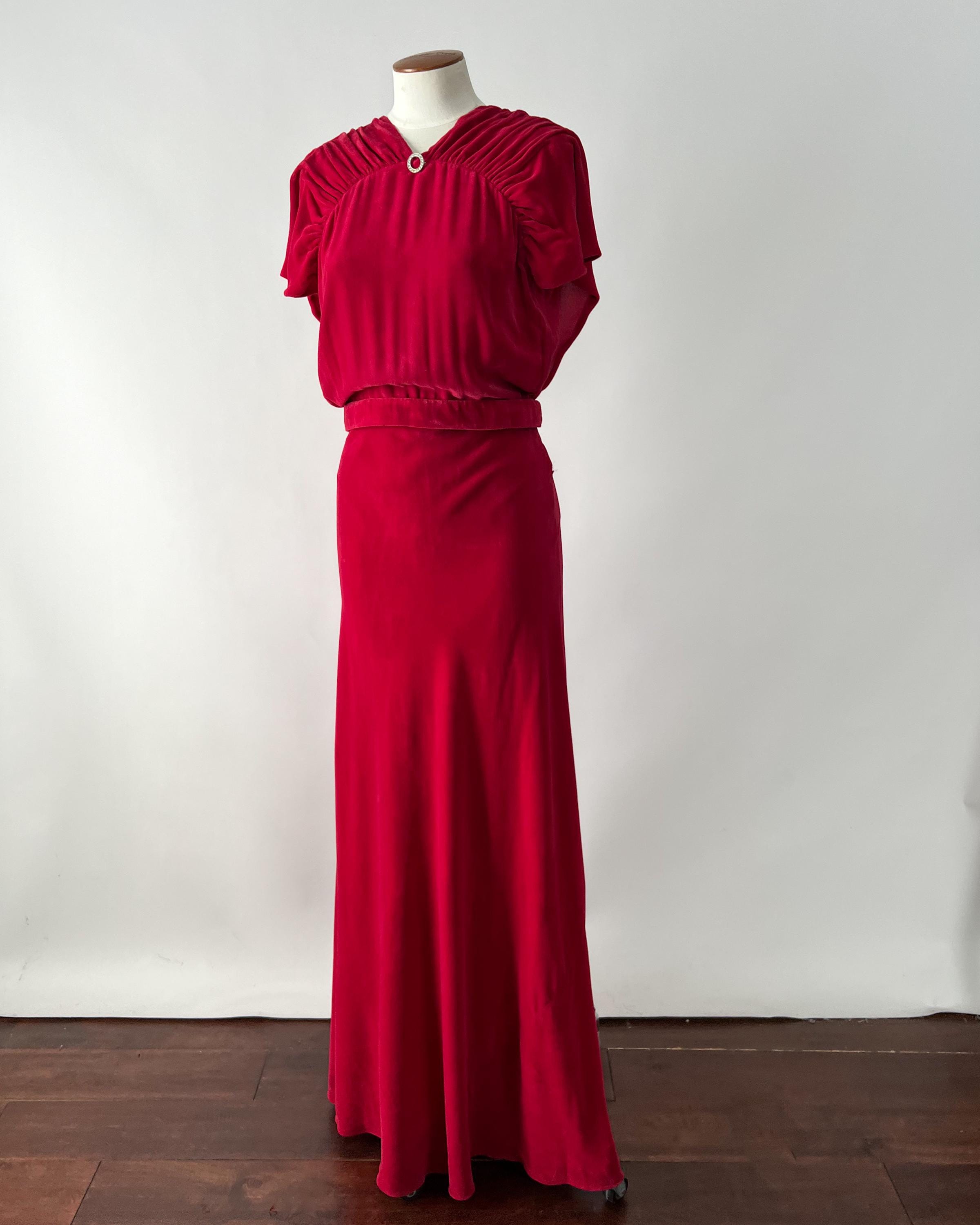 A gorgeous 1930s raspberry red velvet evening gown! This beautiful formal dress has a blouson bodice with a front yoke with ruching across the shoulders and sleeves, a nipped waist with an attached belt, and a long, slim, bias cut maxi skirt that flares at the hem. It features a sexy open back! I have added a vintage rhinestone pin which I will include in the listing. Perfect for the holidays!