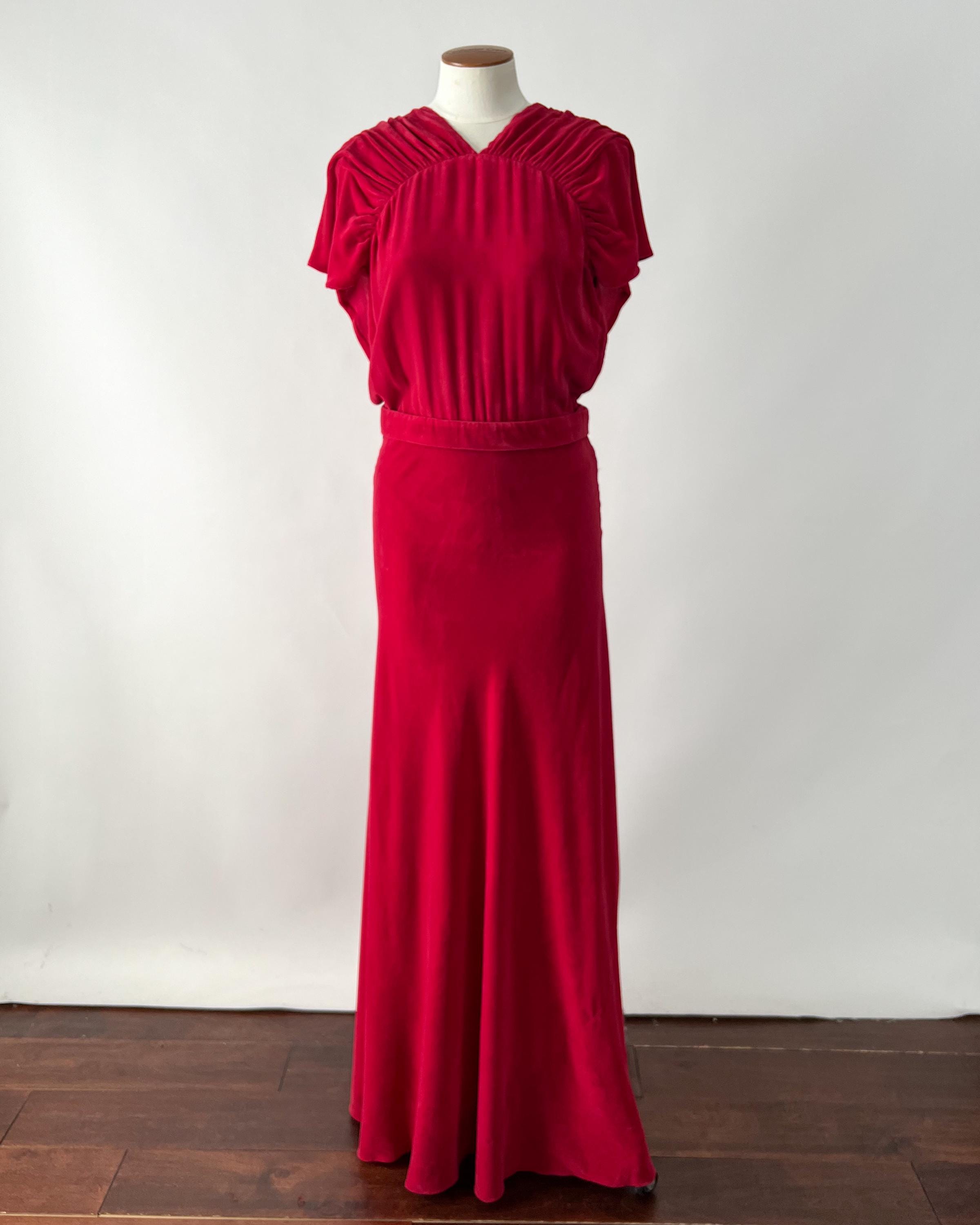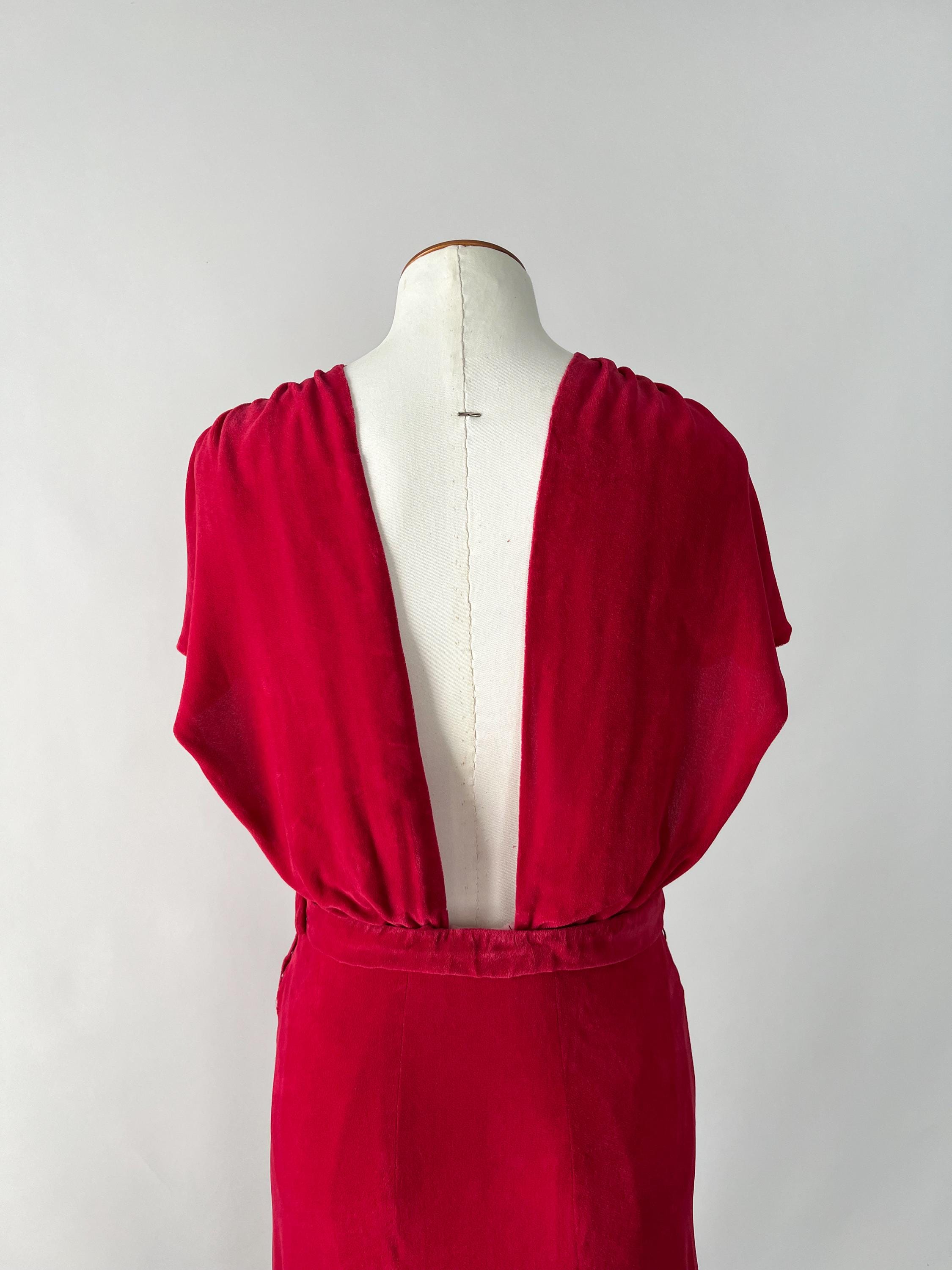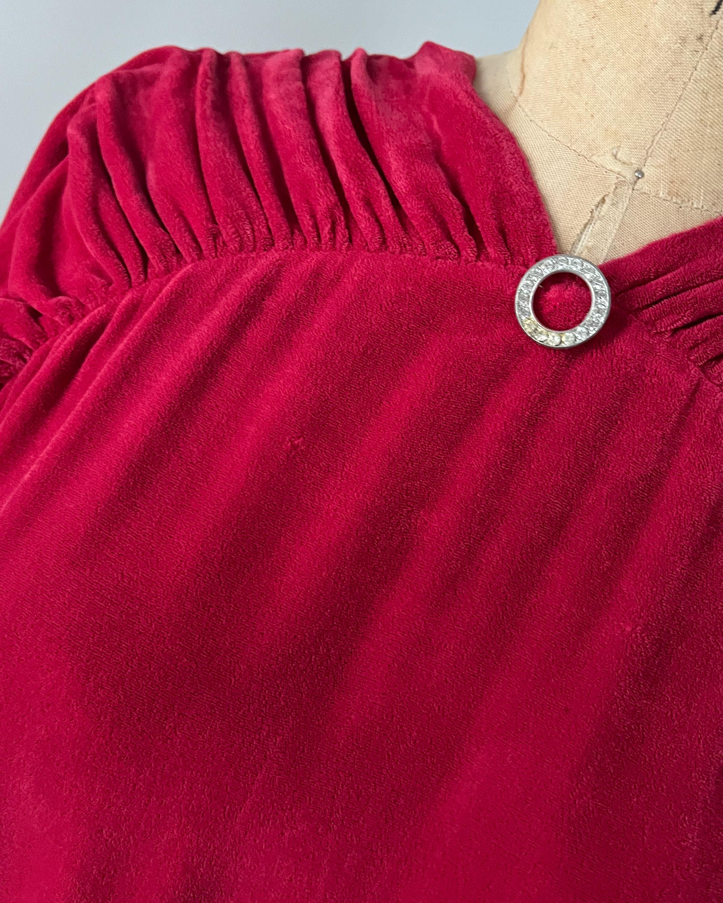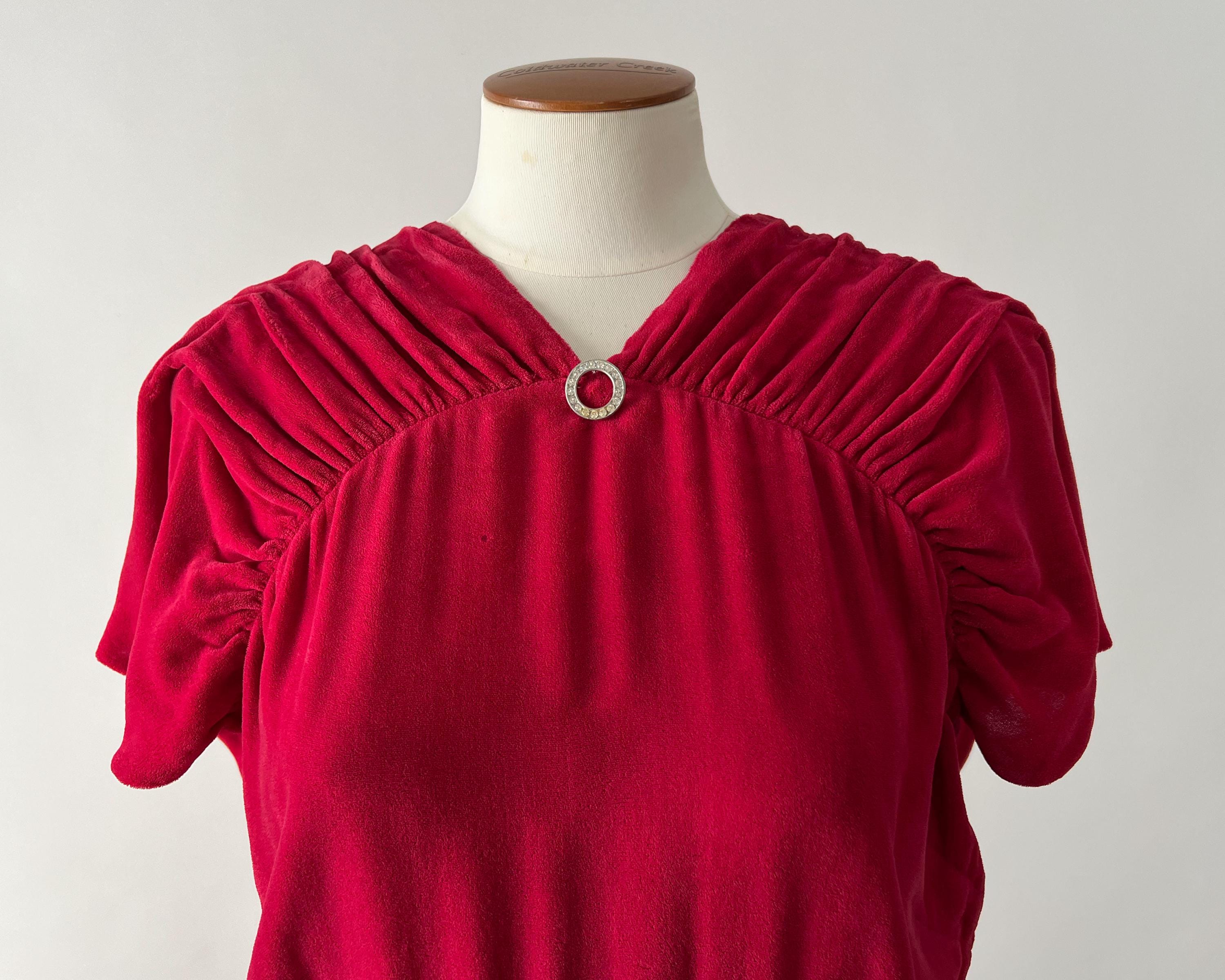 A gorgeous 1930s raspberry red velvet evening gown! This beautiful formal dress has a blouson bodice with a front yoke with ruching across the shoulders and sleeves, a nipped waist with an attached belt, and a long, slim, bias cut maxi skirt that flares at the hem. It features a sexy open back! I have added a vintage rhinestone pin which I will include in the listing. Perfect for the holidays!