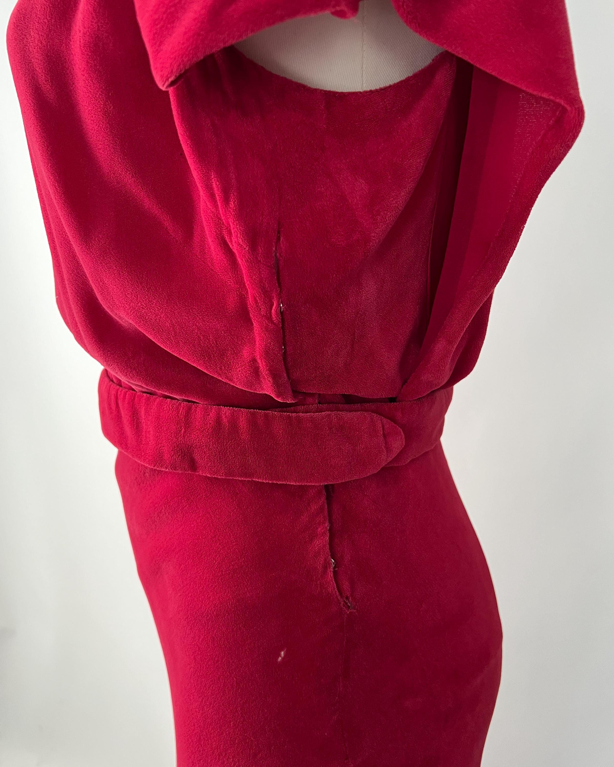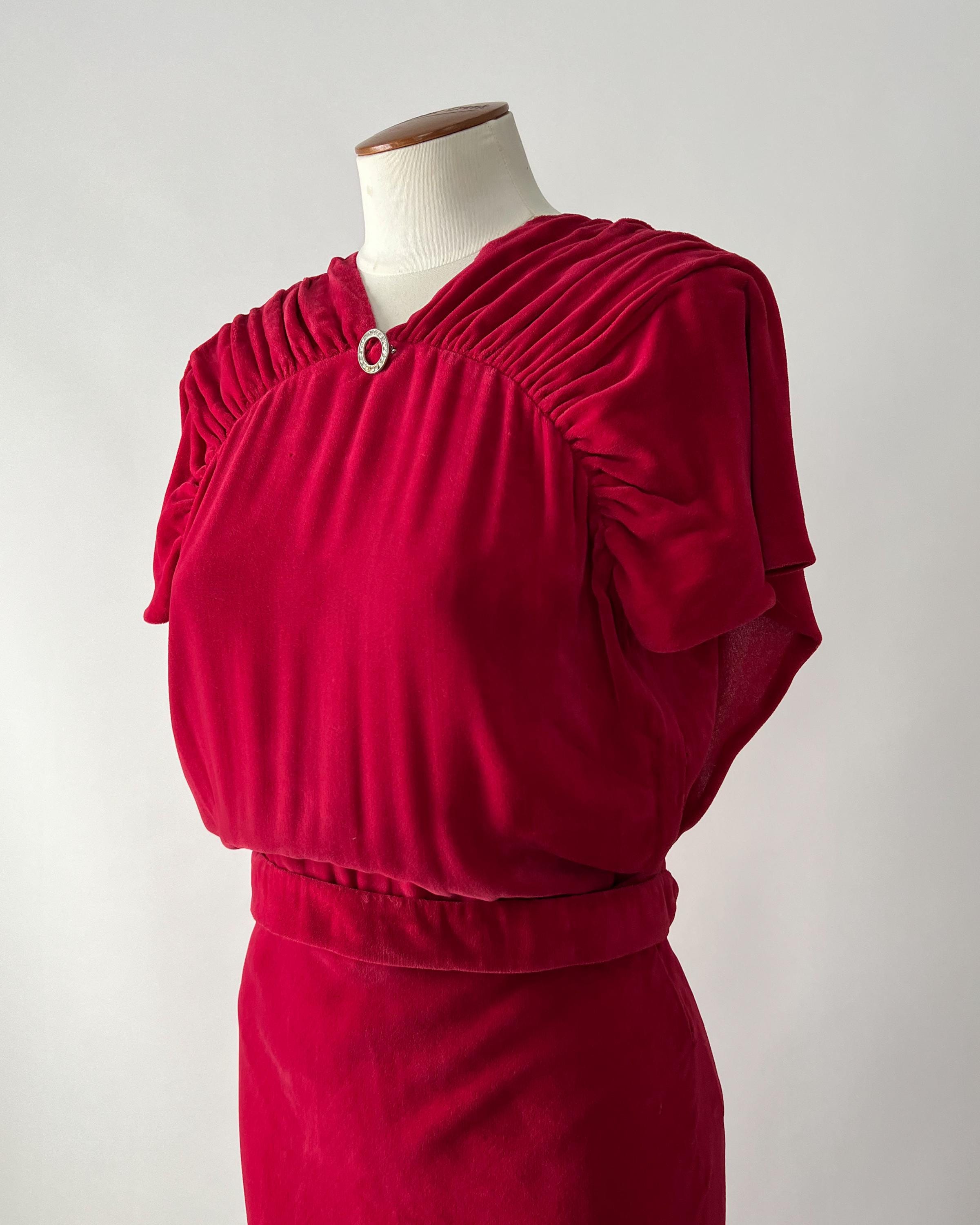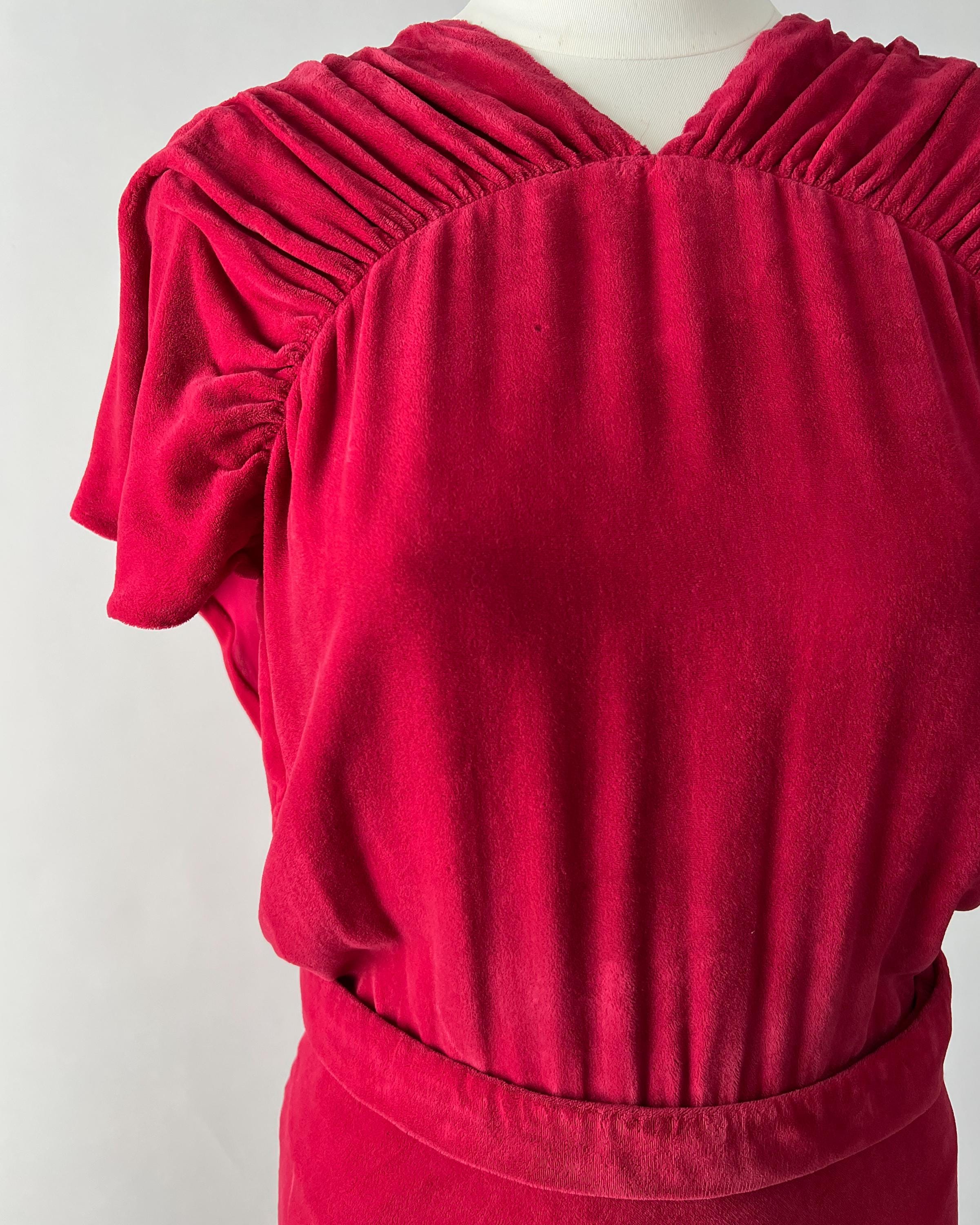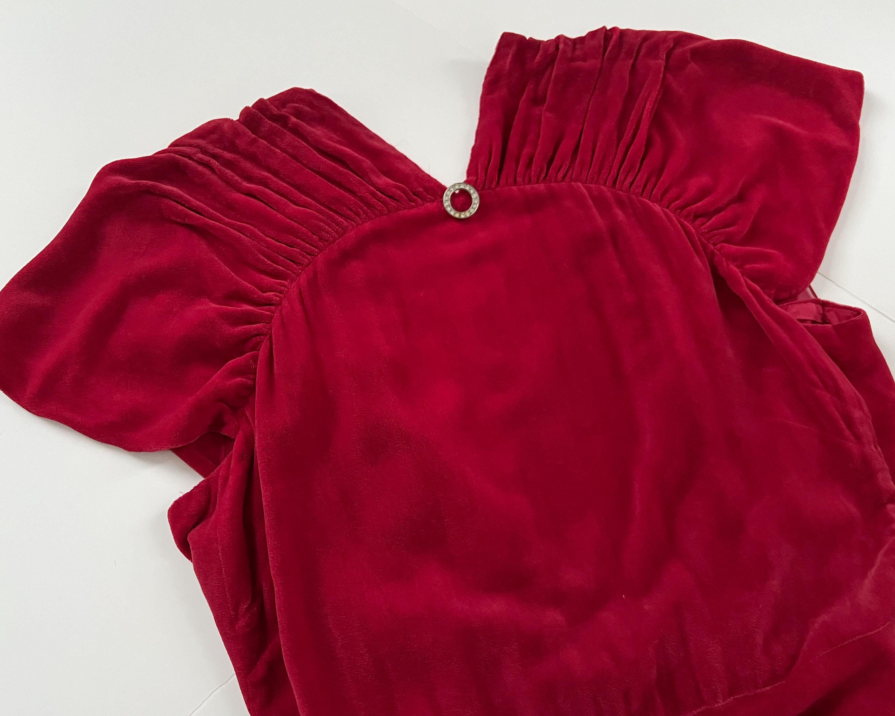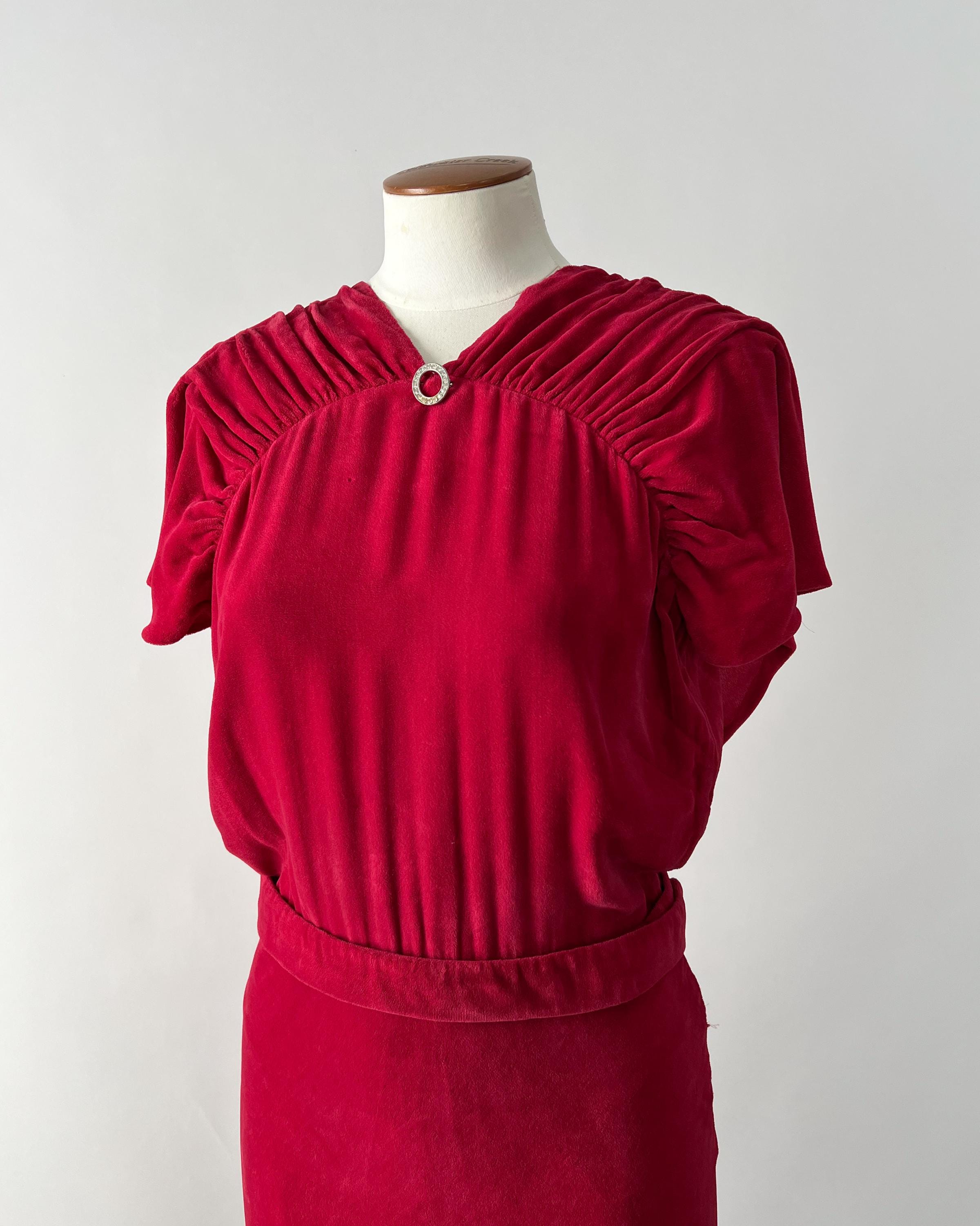 A gorgeous 1930s raspberry red velvet evening gown! This beautiful formal dress has a blouson bodice with a front yoke with ruching across the shoulders and sleeves, a nipped waist with an attached belt, and a long, slim, bias cut maxi skirt that flares at the hem. It features a sexy open back! I have added a vintage rhinestone pin which I will include in the listing. Perfect for the holidays!