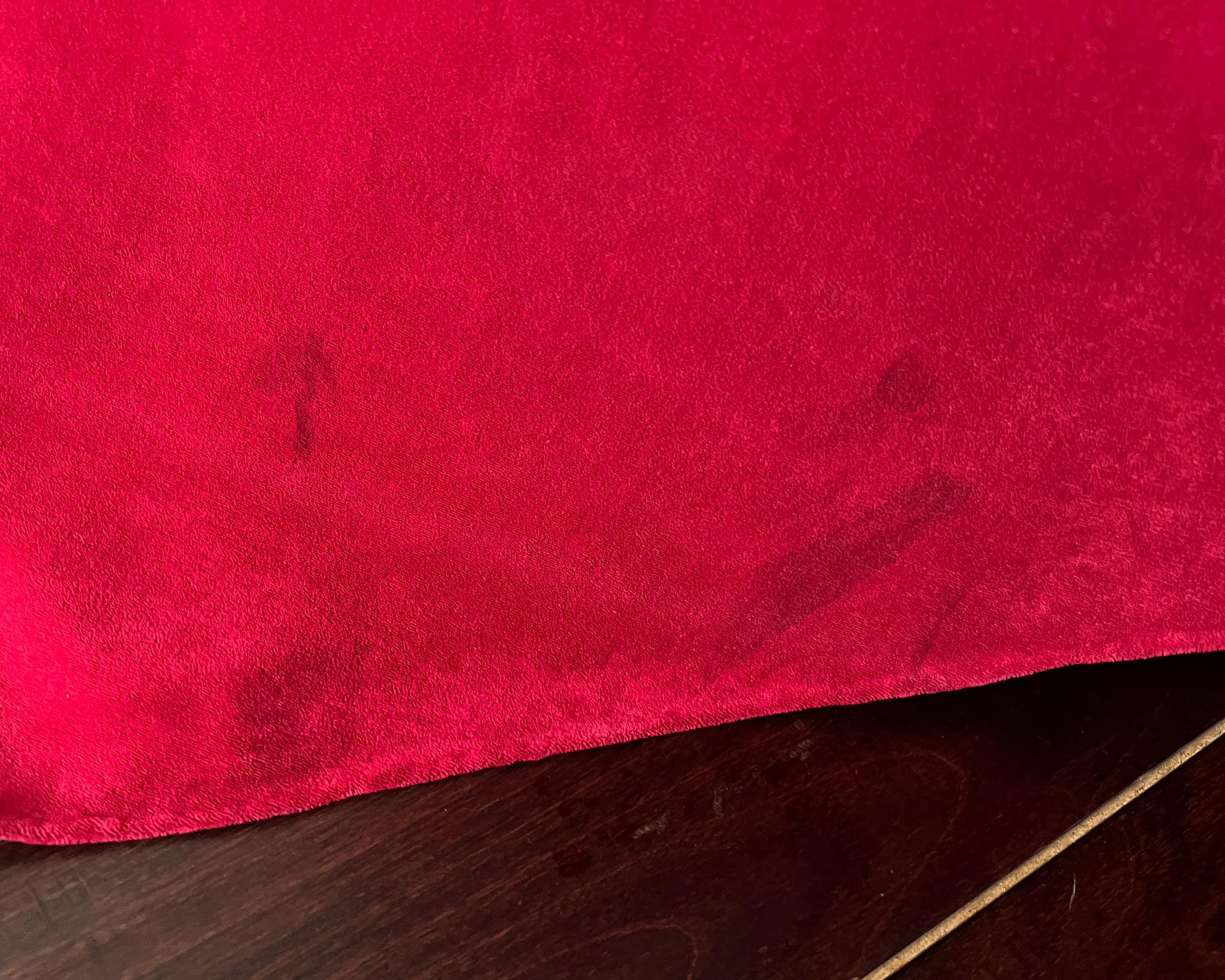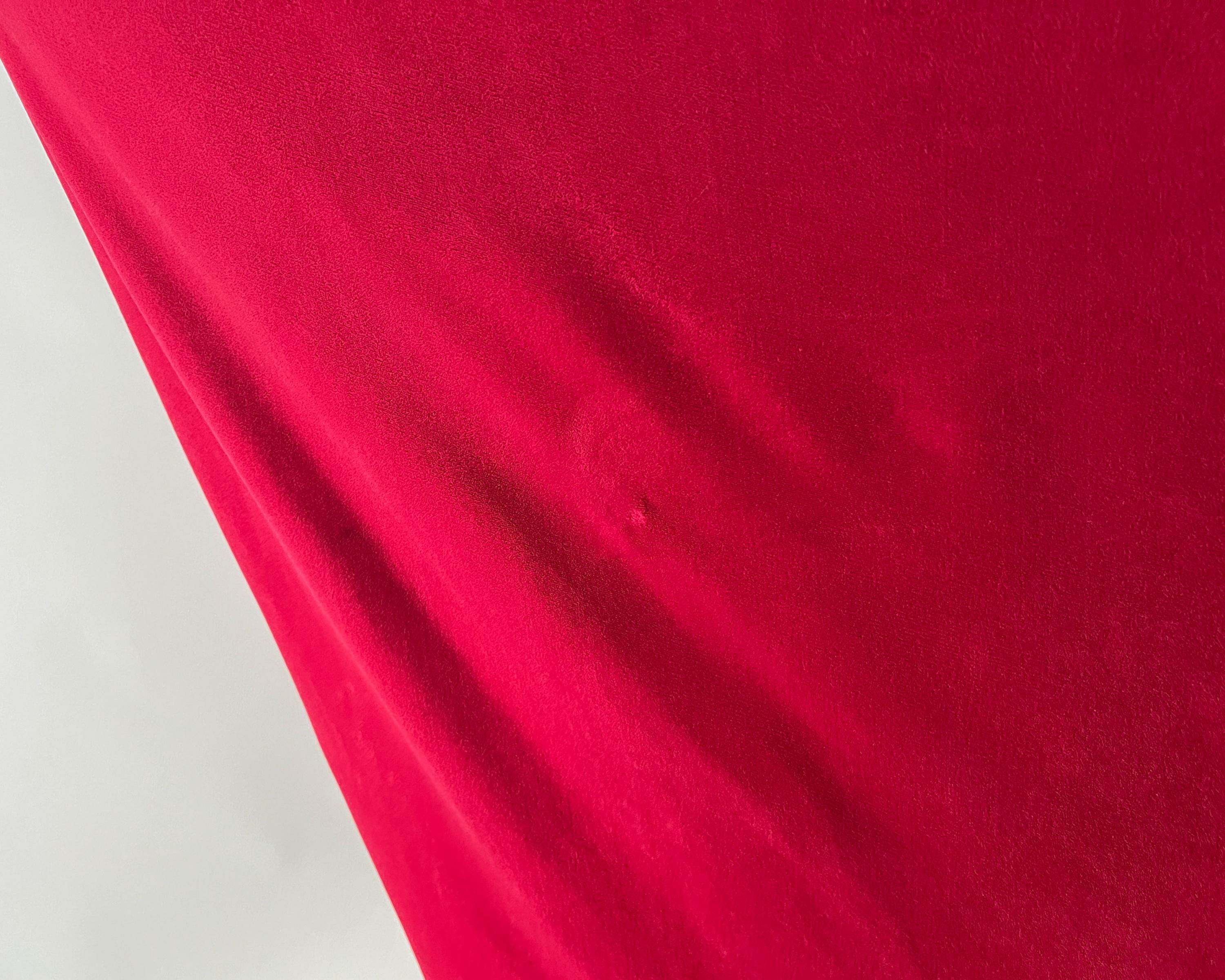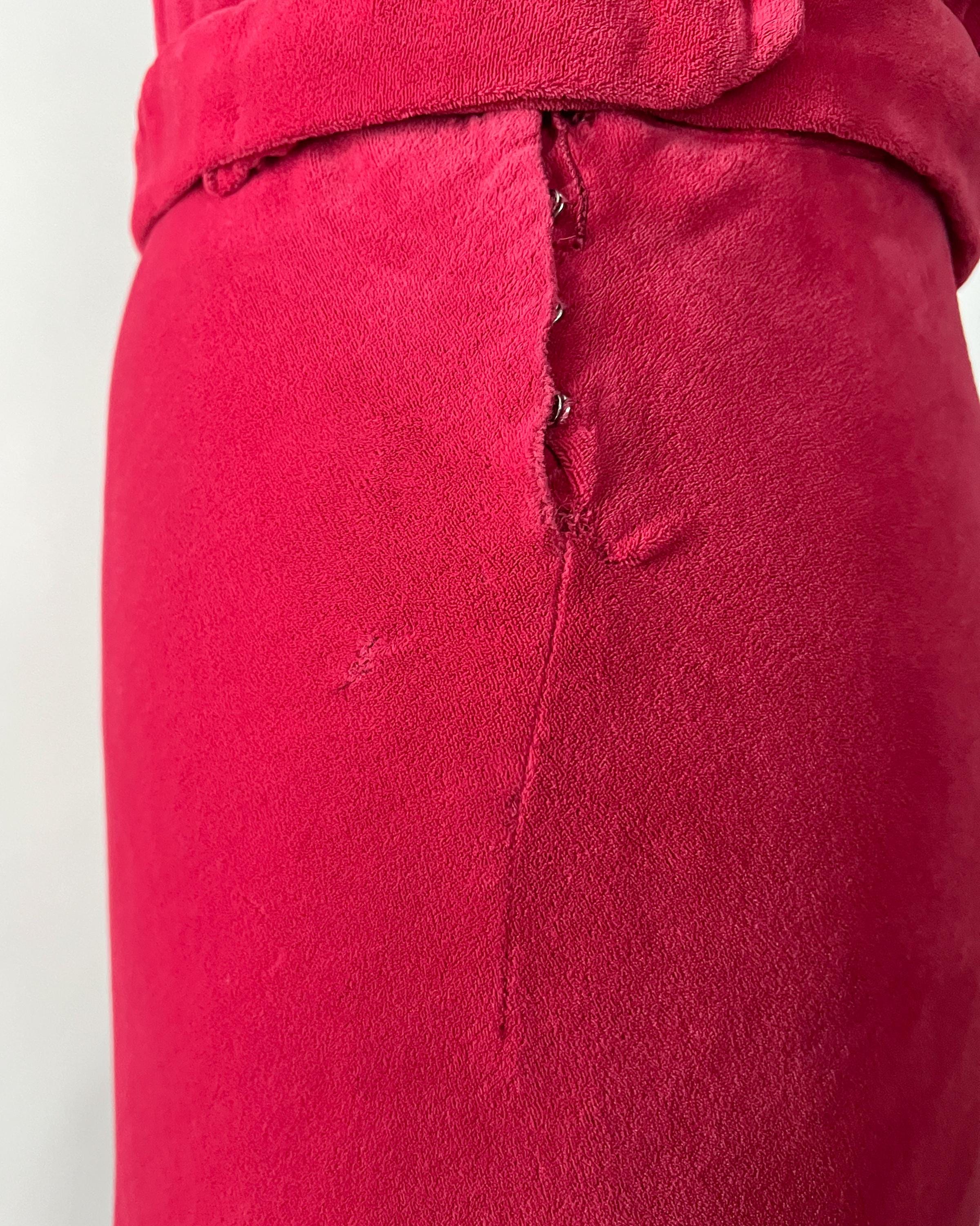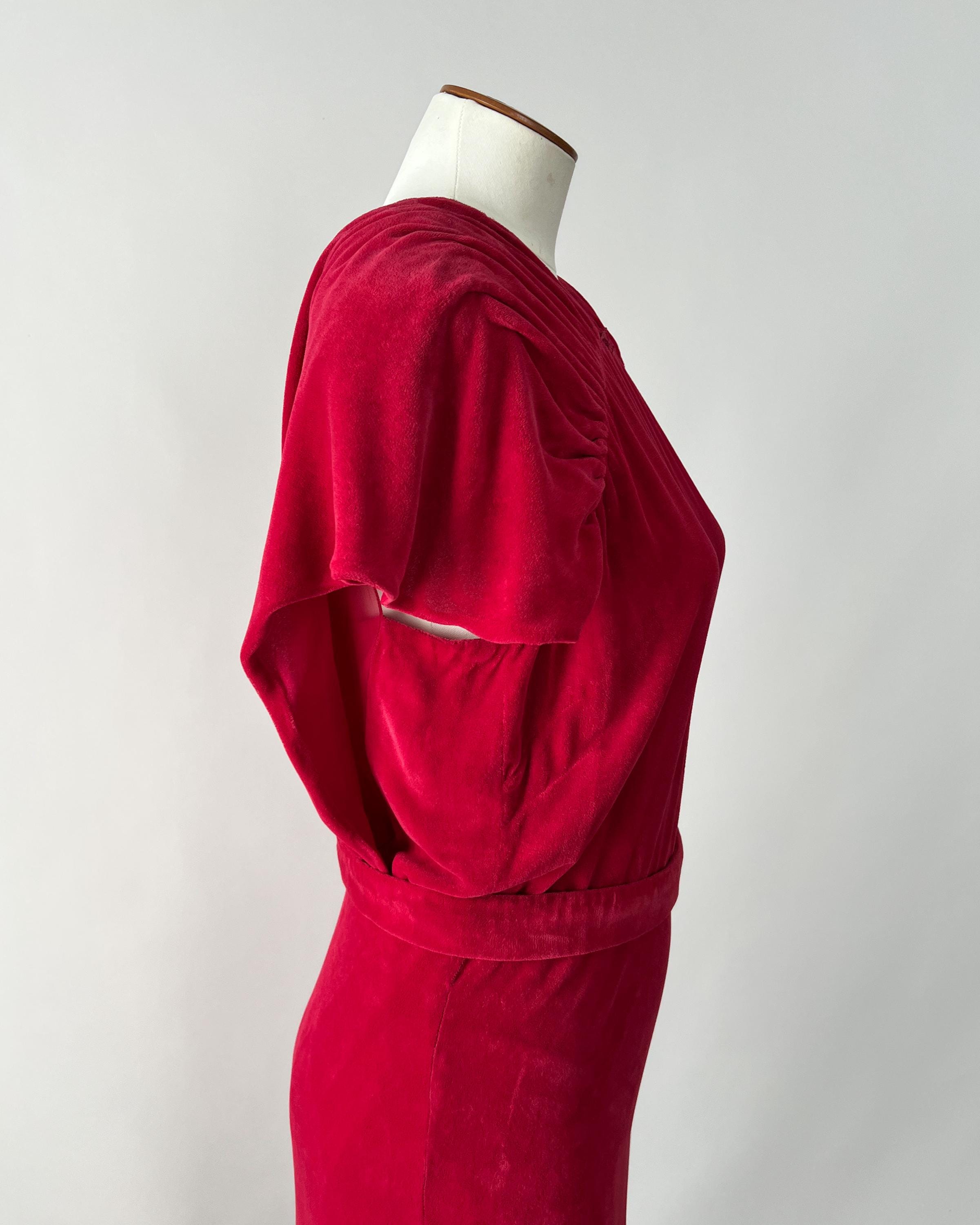 A gorgeous 1930s raspberry red velvet evening gown! This beautiful formal dress has a blouson bodice with a front yoke with ruching across the shoulders and sleeves, a nipped waist with an attached belt, and a long, slim, bias cut maxi skirt that flares at the hem. It features a sexy open back! I have added a vintage rhinestone pin which I will include in the listing. Perfect for the holidays!