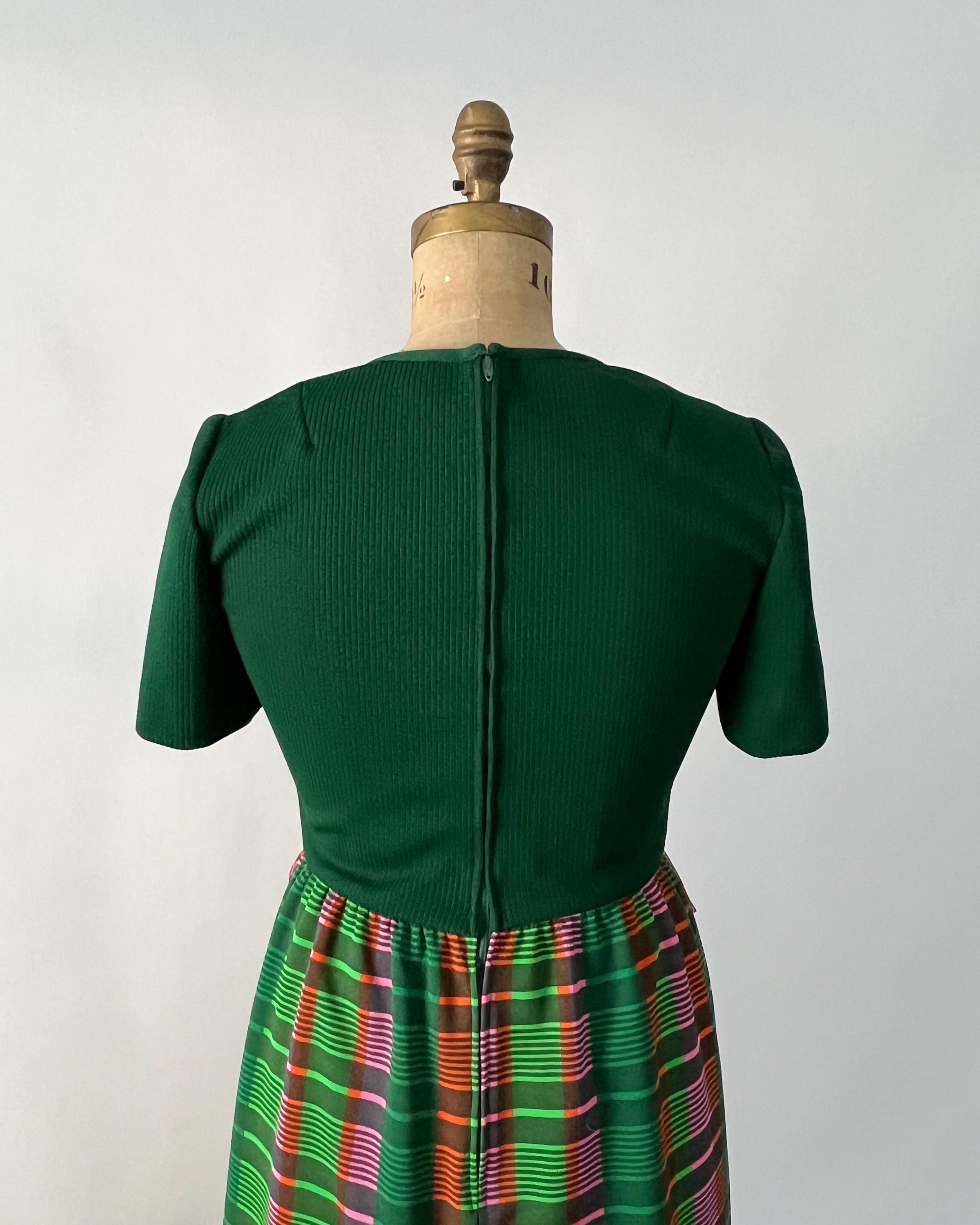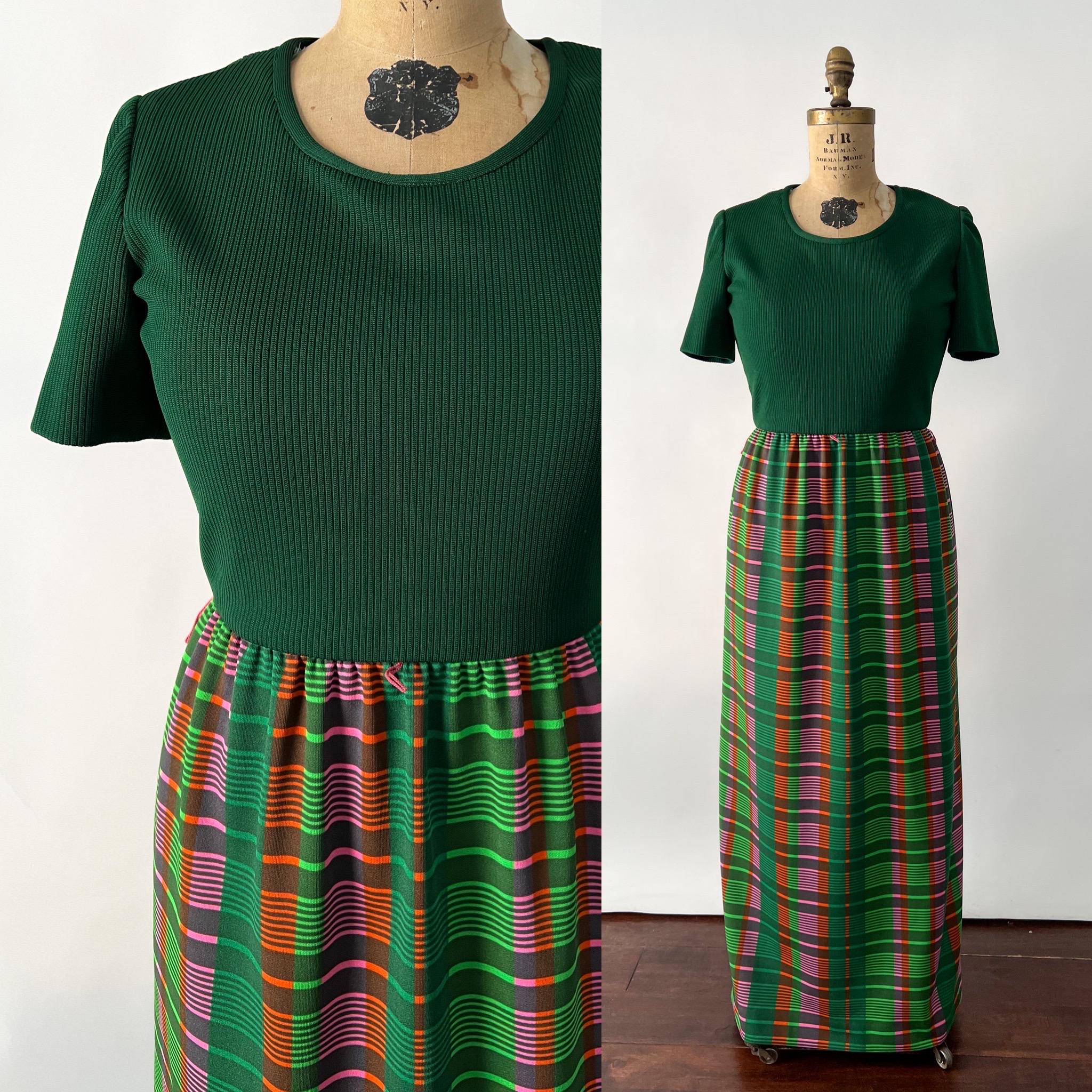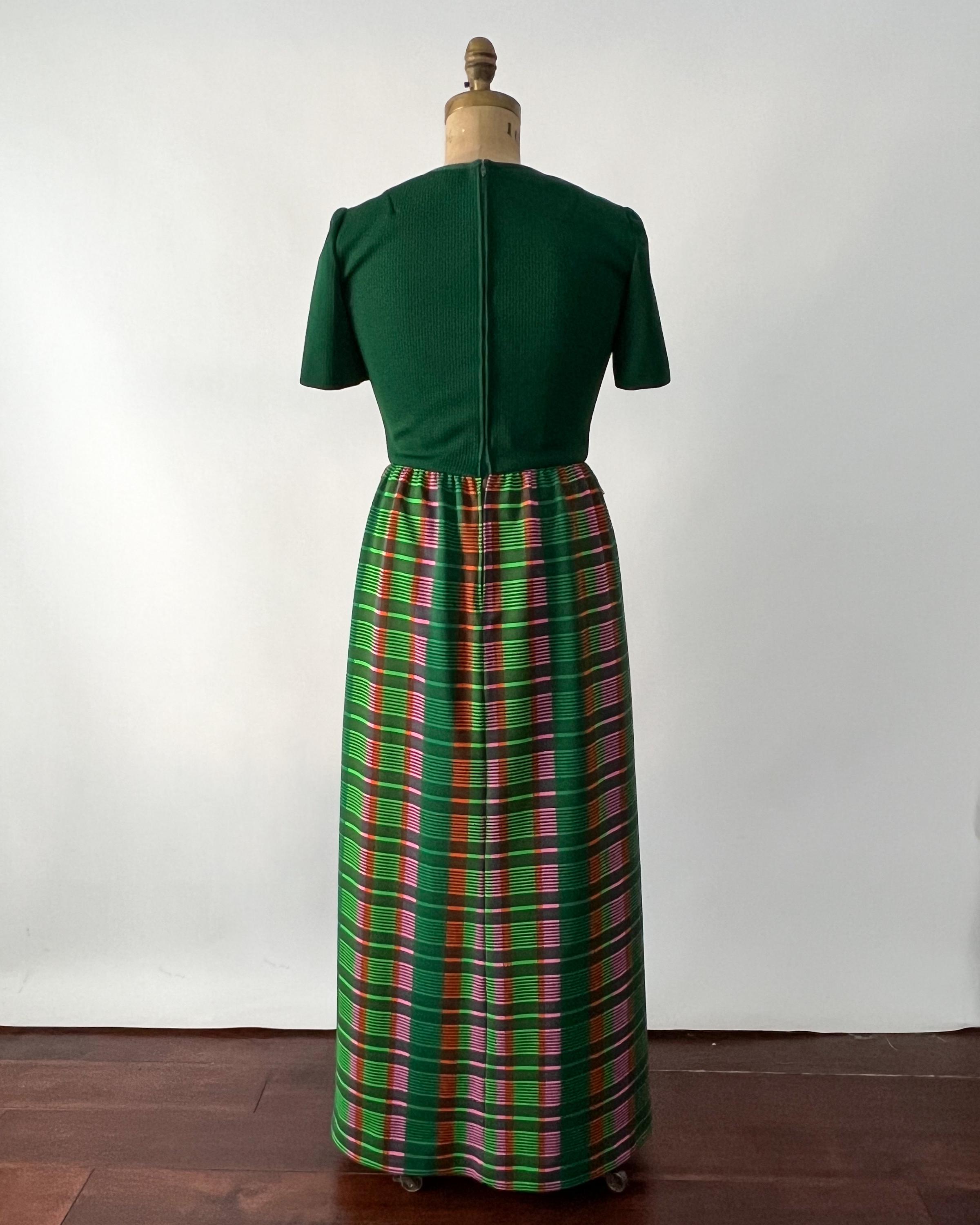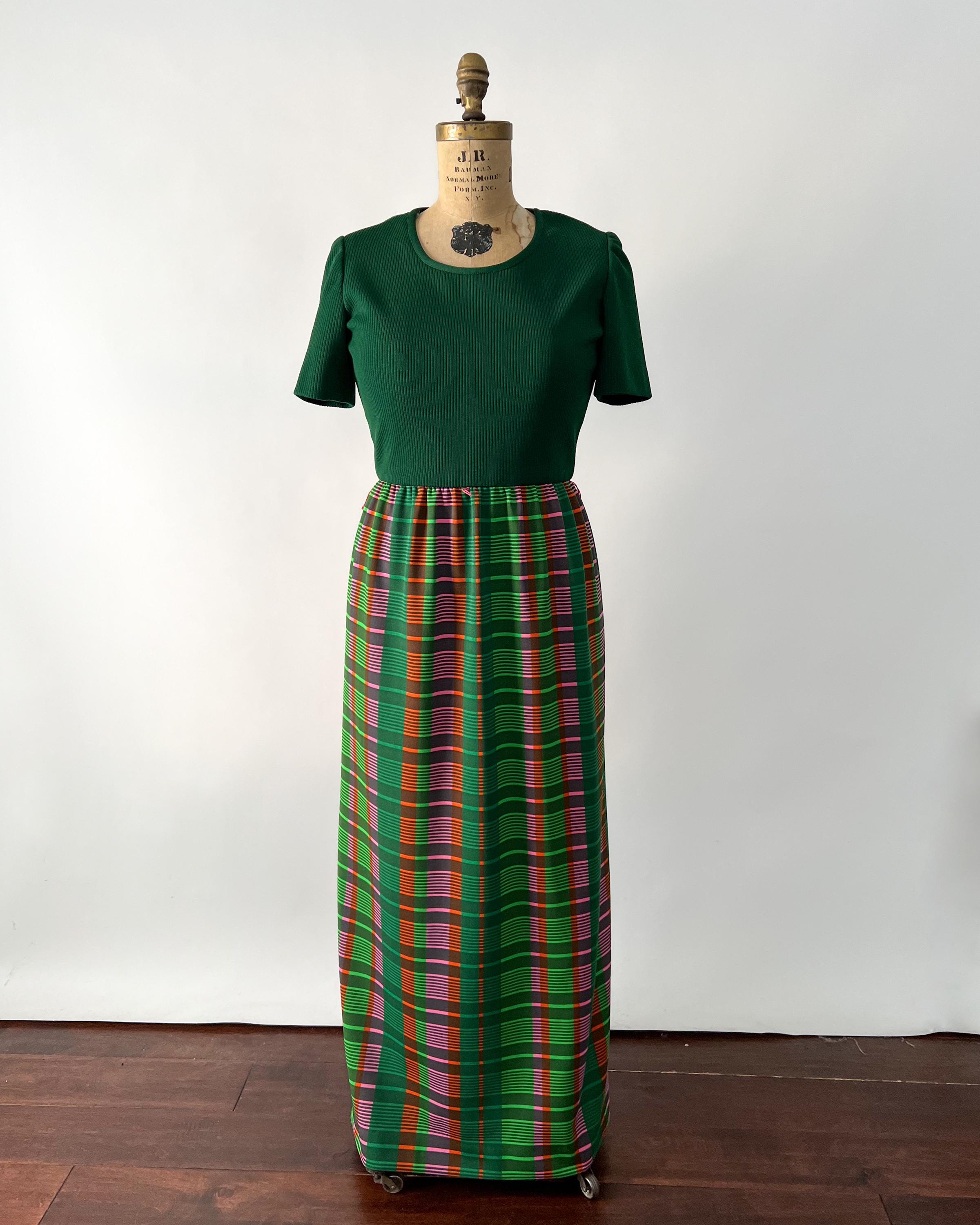 A cute, festive maxi dress from the 1970s! Made from dark green ribbed knit polyester, the short sleeved dress has a flattering scoop neckline, a nipped waist, and a maxi length skirt in a contrasting pink, orange, and light green plaid. Back zipper closure.