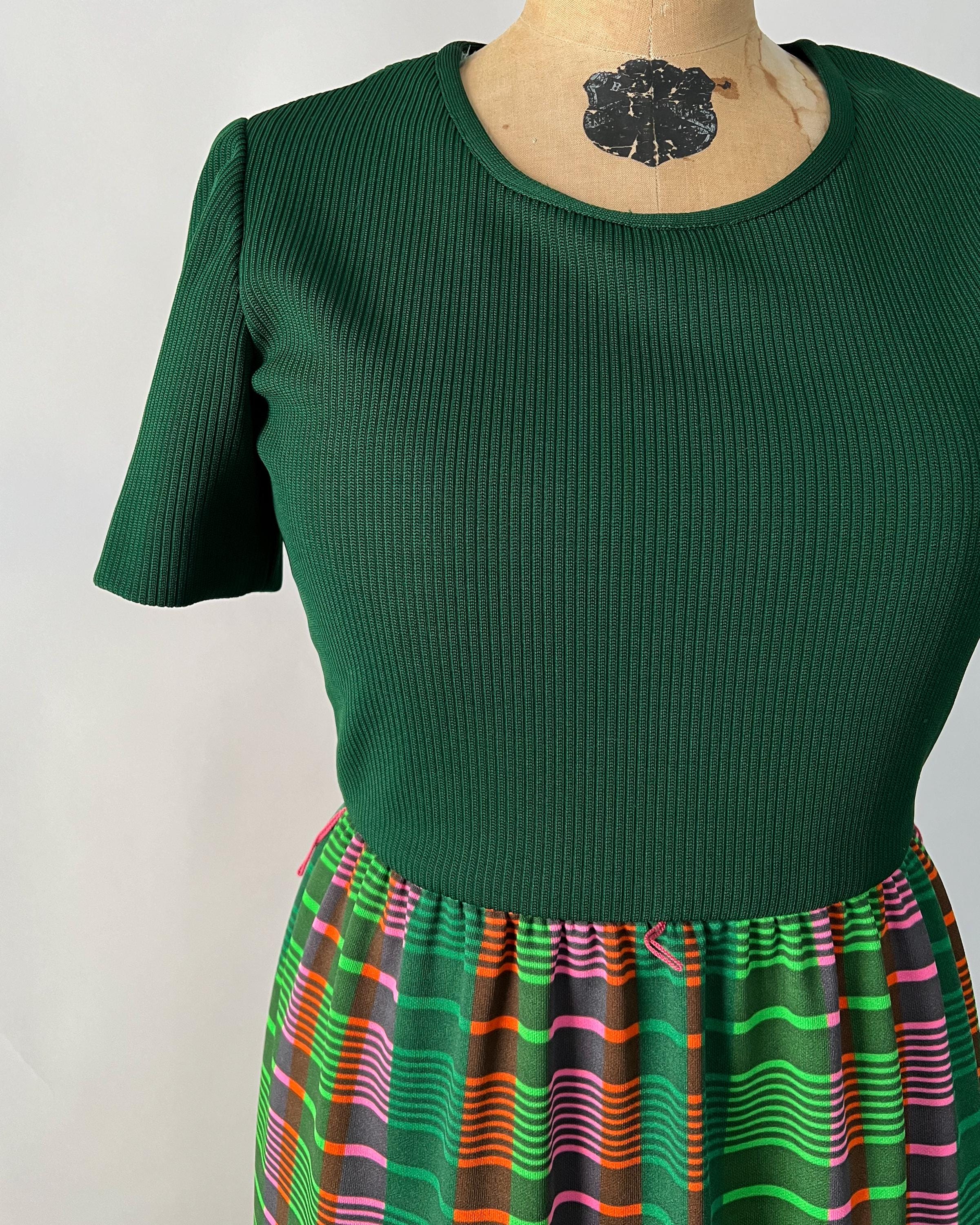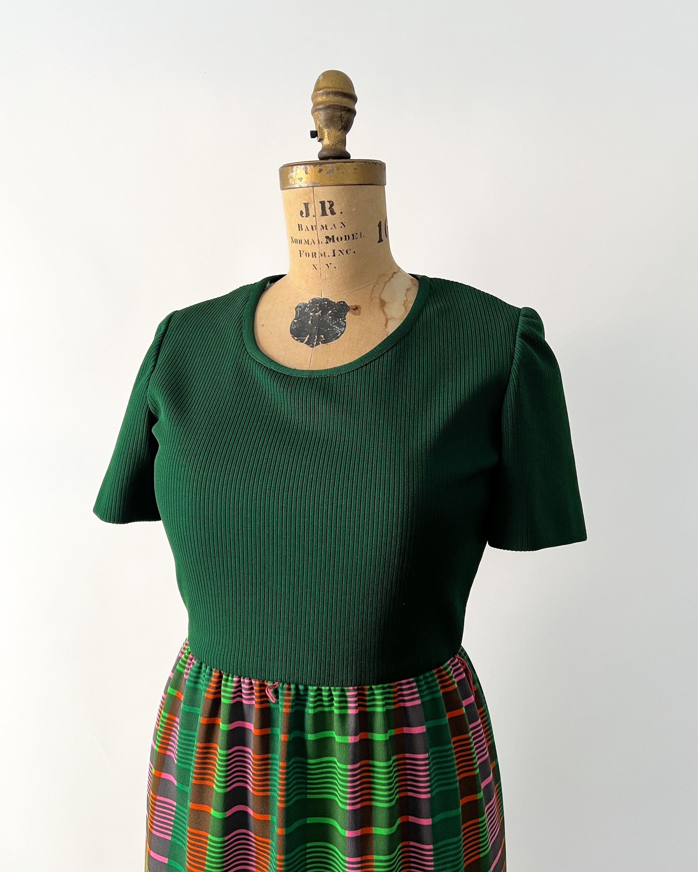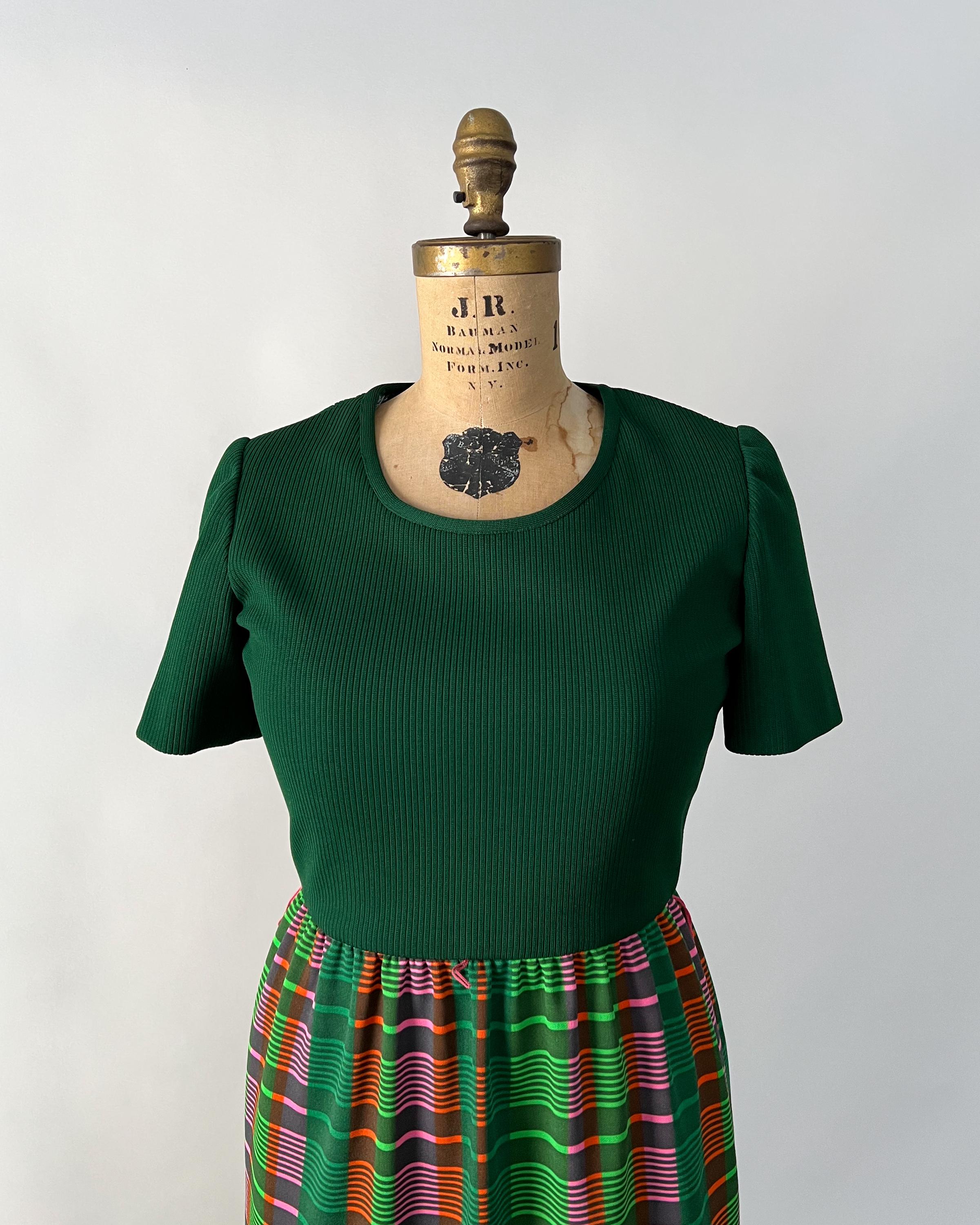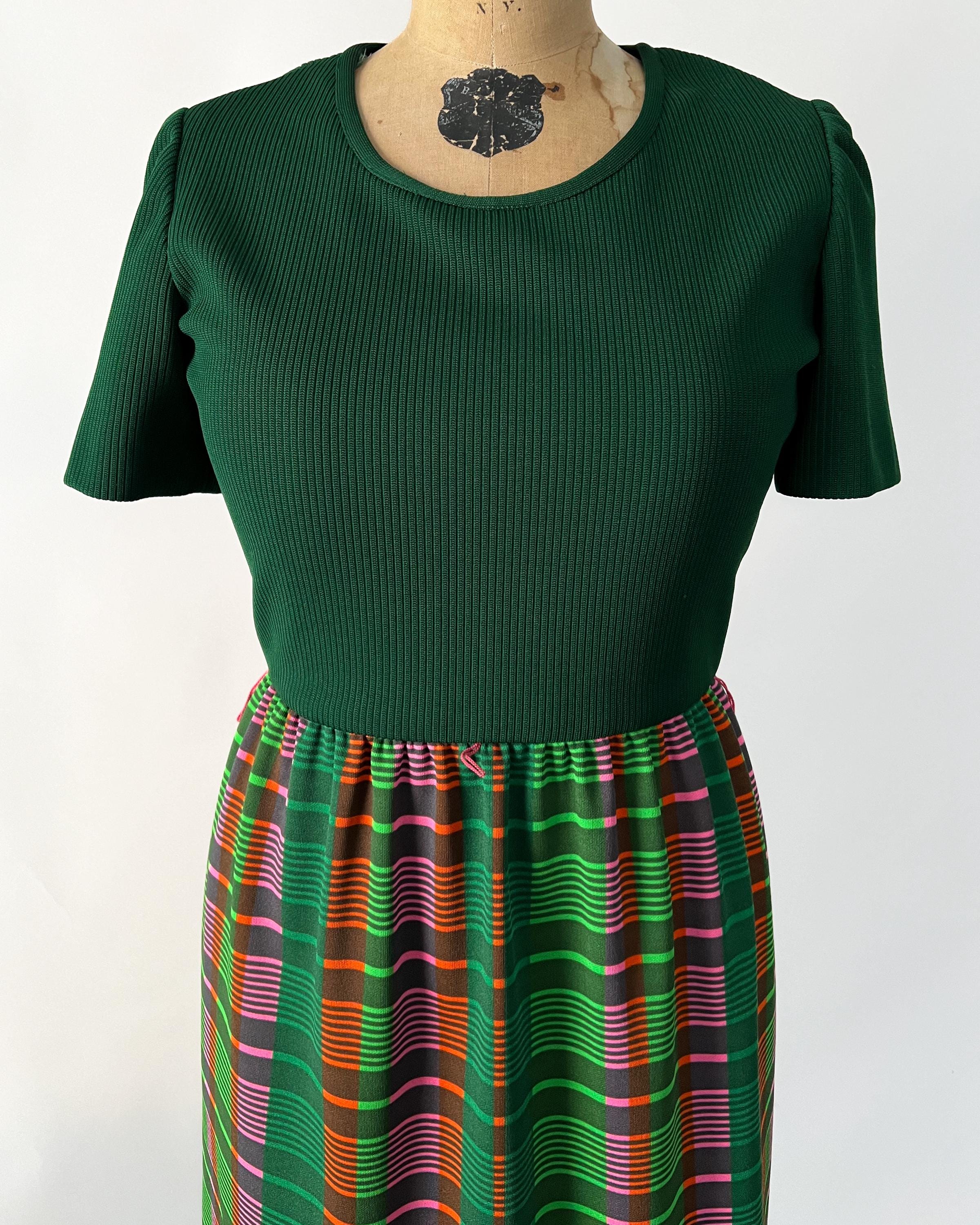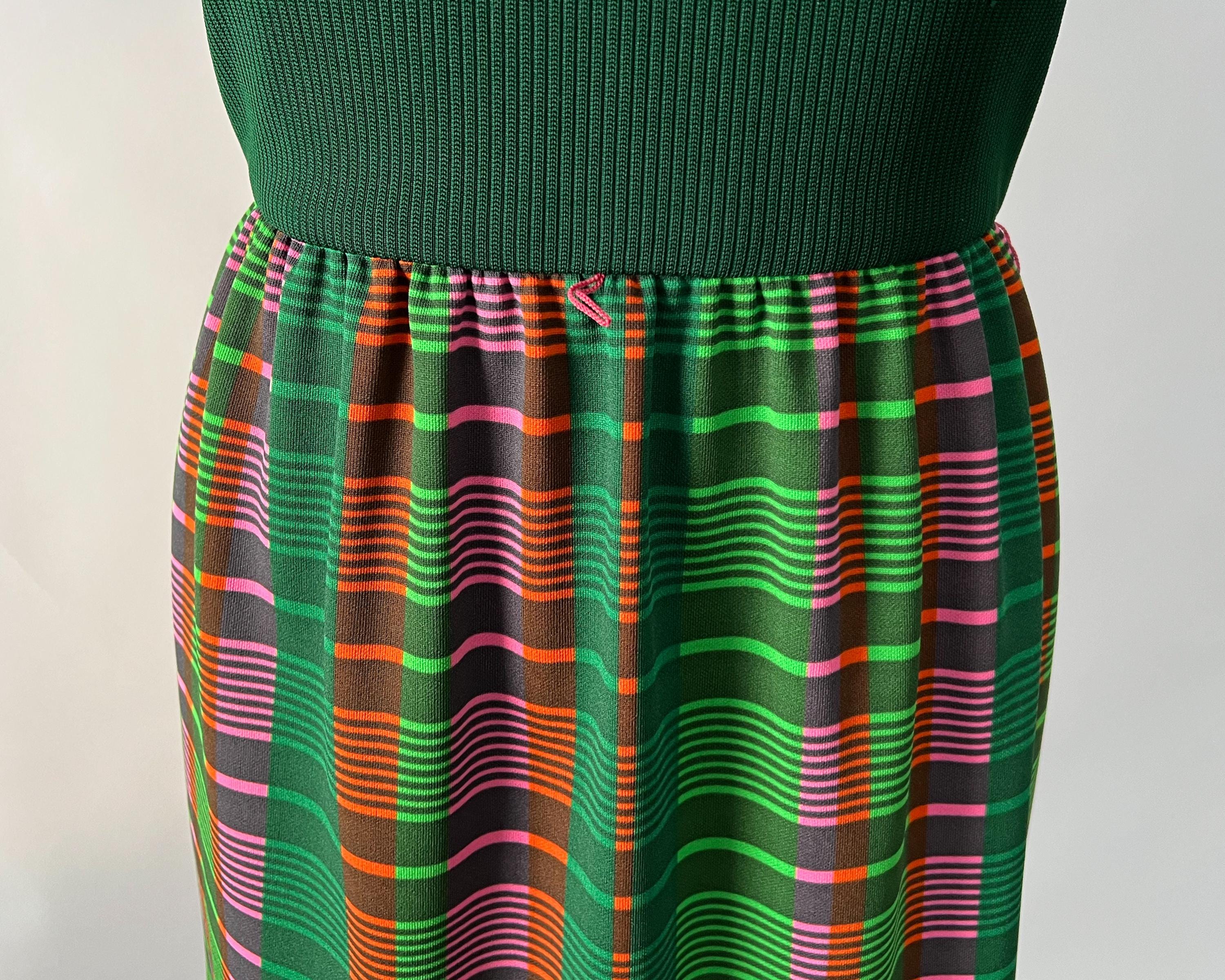 A cute, festive maxi dress from the 1970s! Made from dark green ribbed knit polyester, the short sleeved dress has a flattering scoop neckline, a nipped waist, and a maxi length skirt in a contrasting pink, orange, and light green plaid. Back zipper closure.