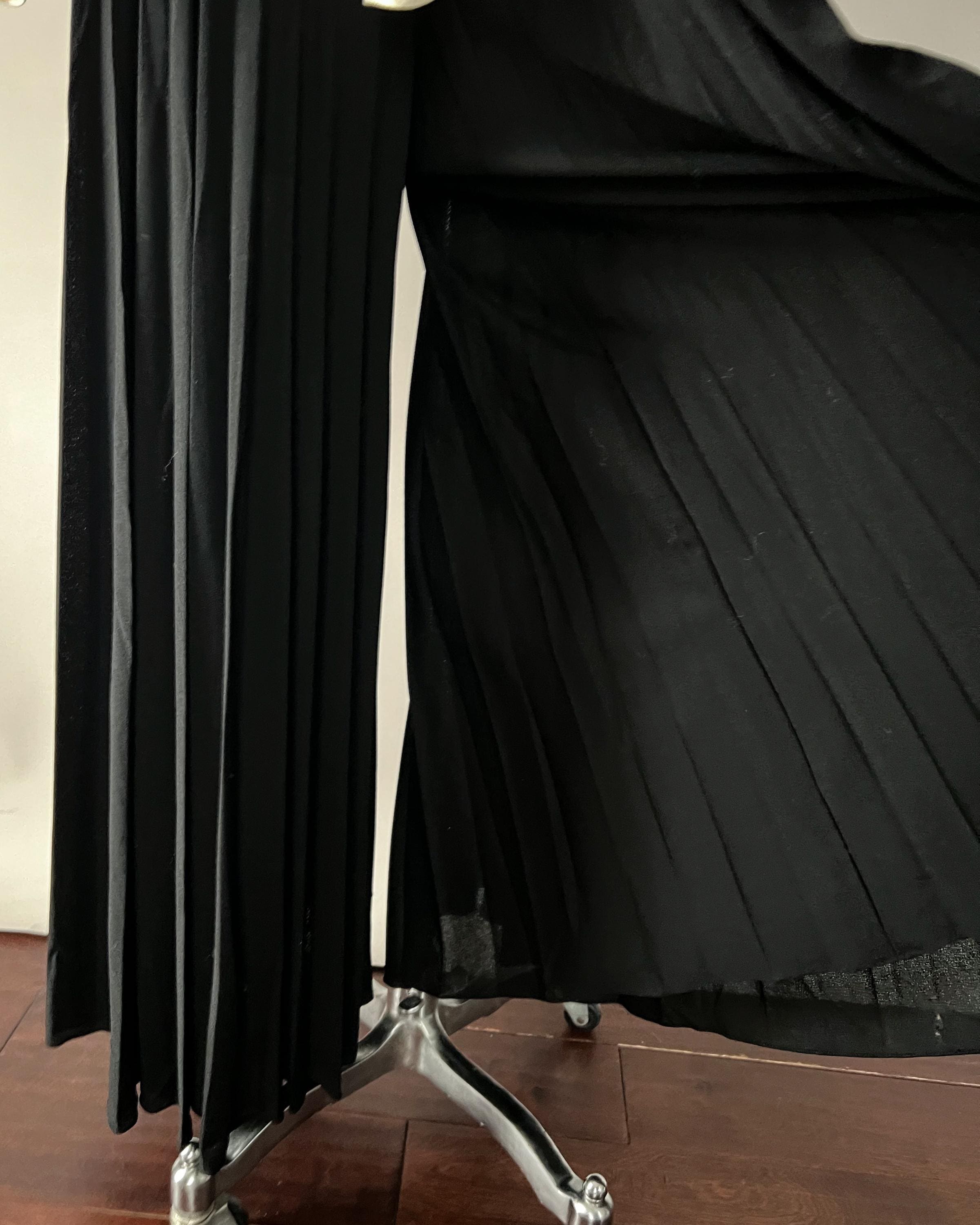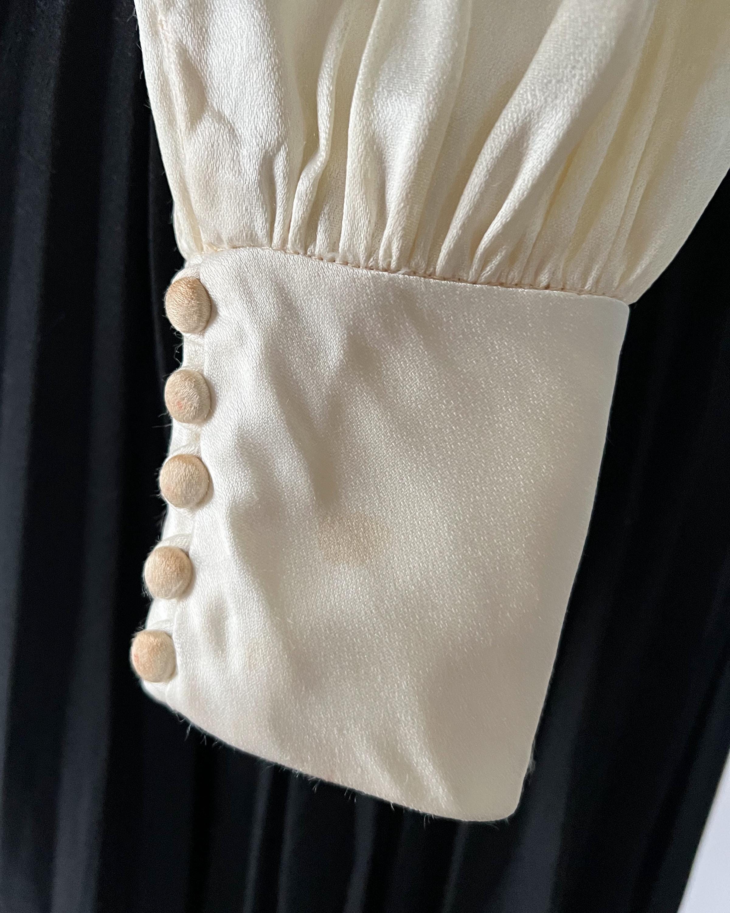 Glamorous vintage 1970s formal jumpsuit! This elegant jumpsuit features an off white satin bodice with a high / mock neck collar, long, puffy bishop sleeves with fitted cuffs, a front pleat, and front decorative covered buttons down the front. The waist can be cinched with a matching tie belt. It has attached black polyester accordian pleated palazzo pants with super wide, voluminous legs that looks like a long maxi skirt! Back zipper closure.